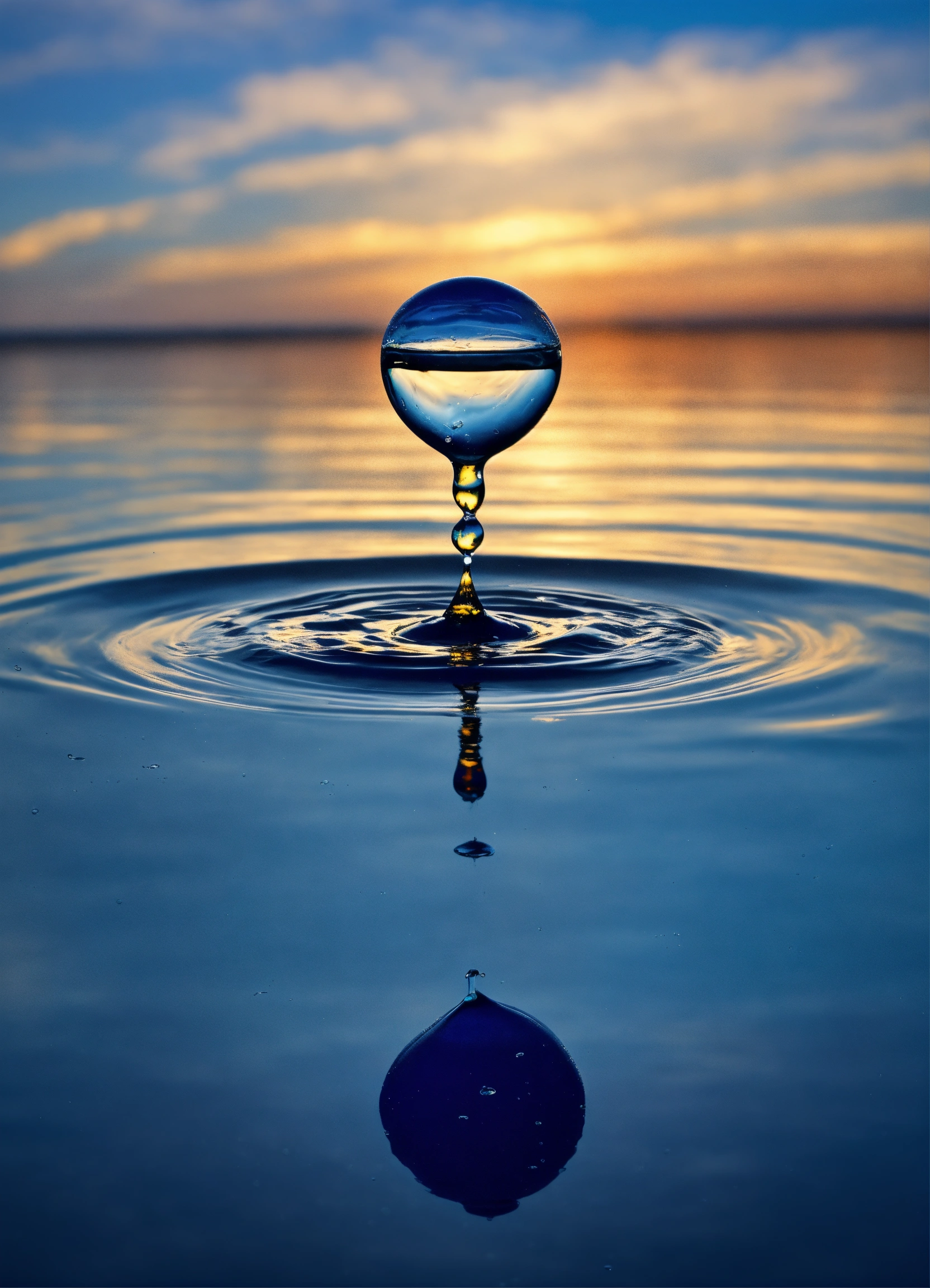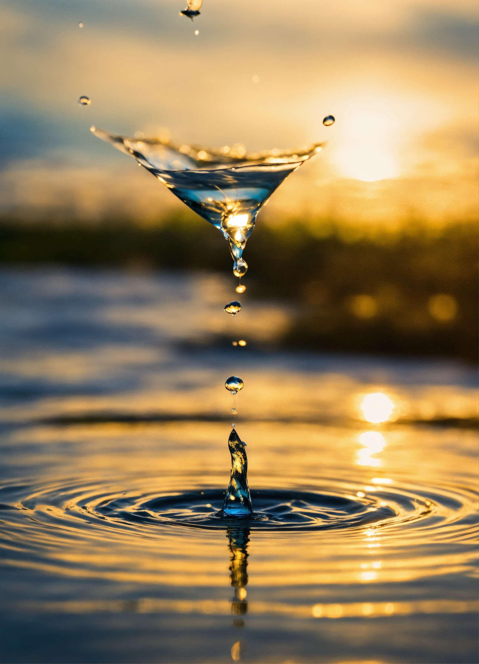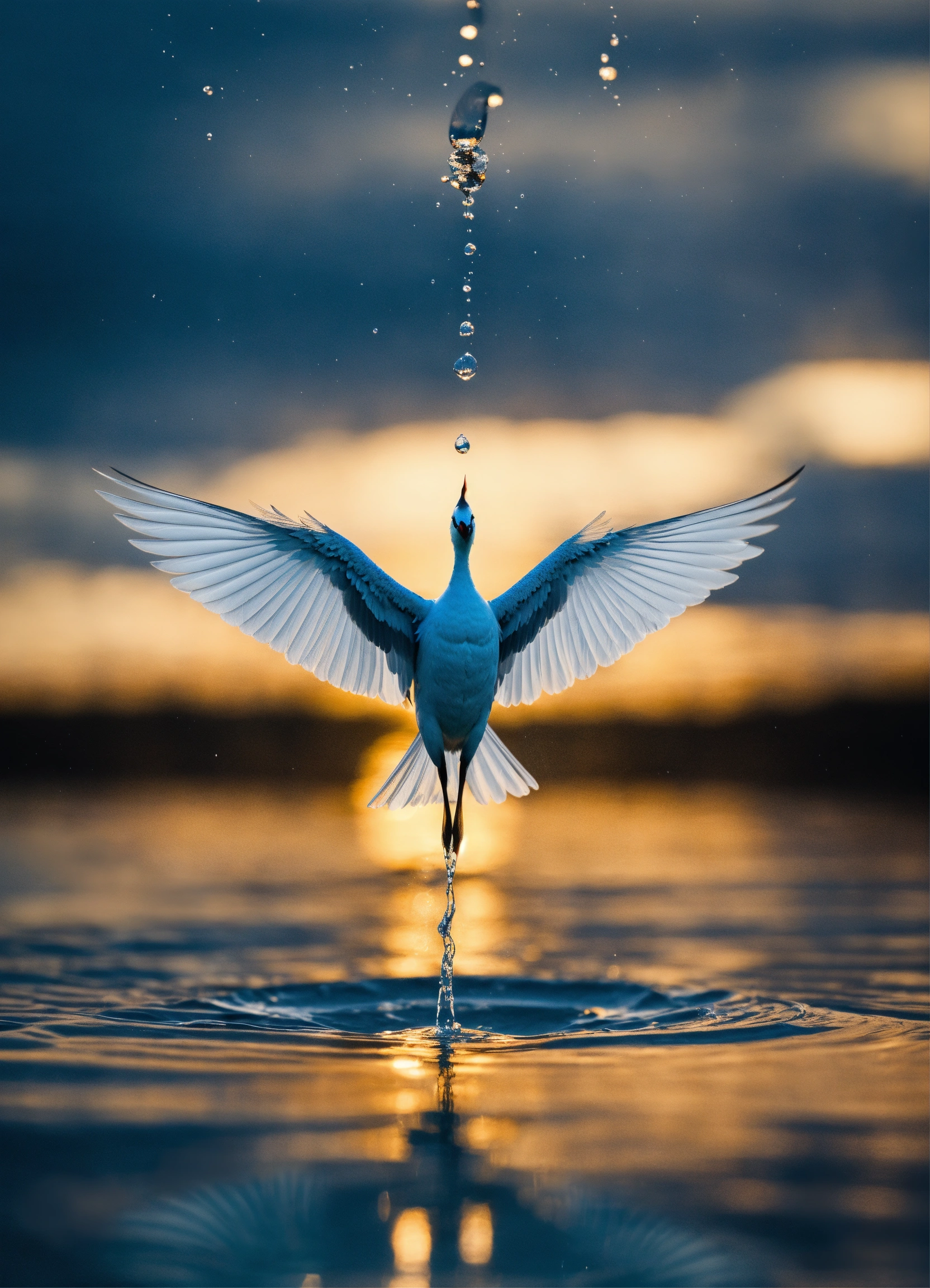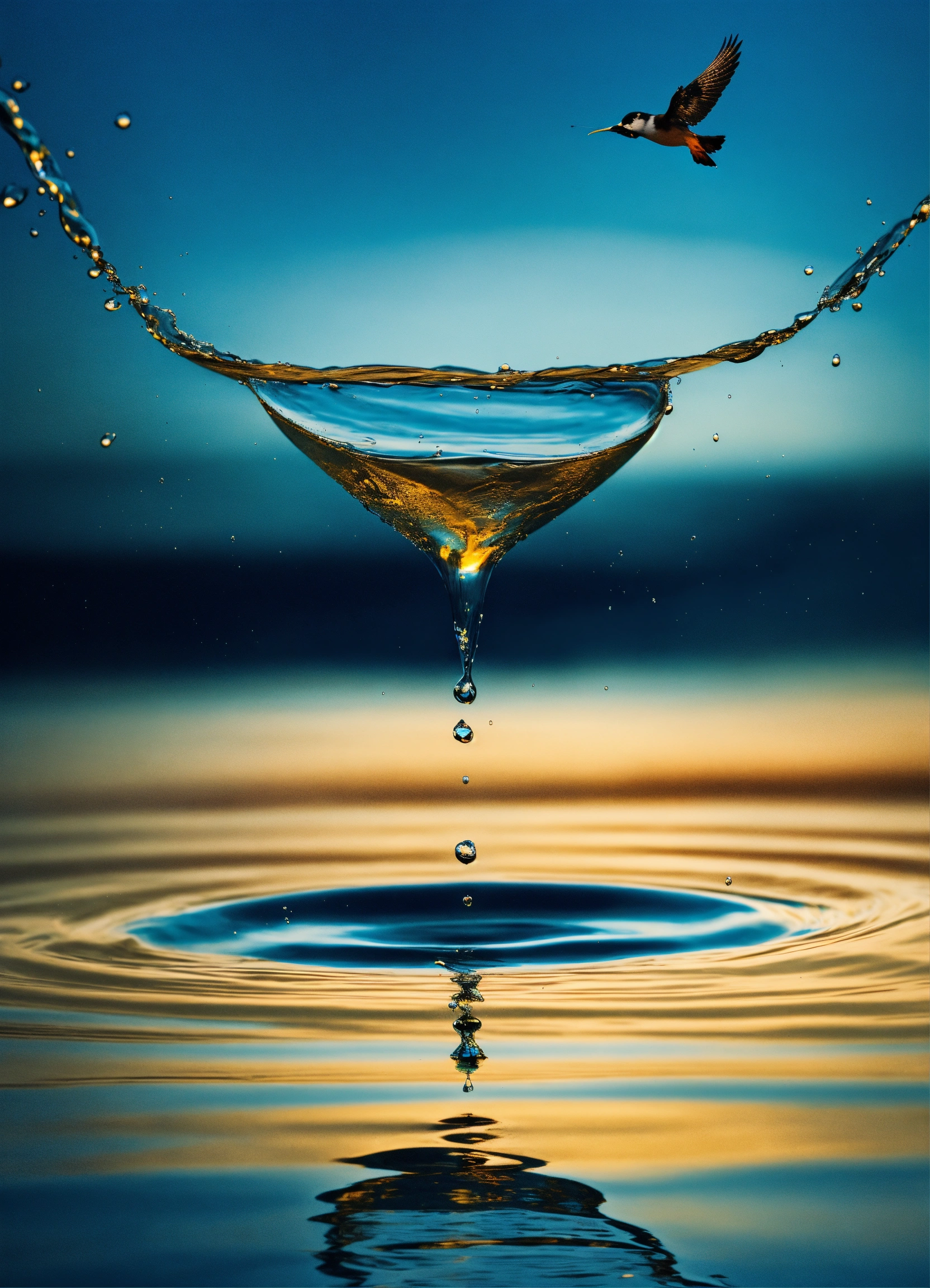 Drop of water bounces above the water surface, transforming into a liquid bird opening its wings soaring gracefully above the water.