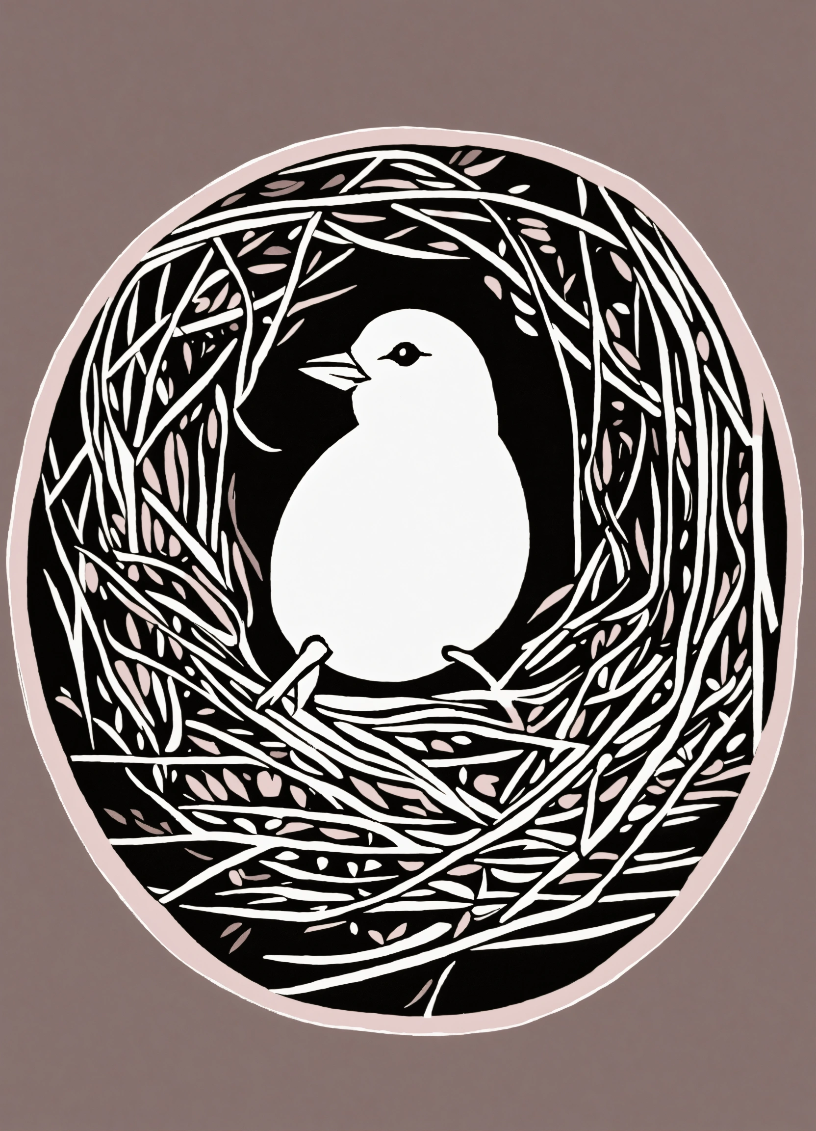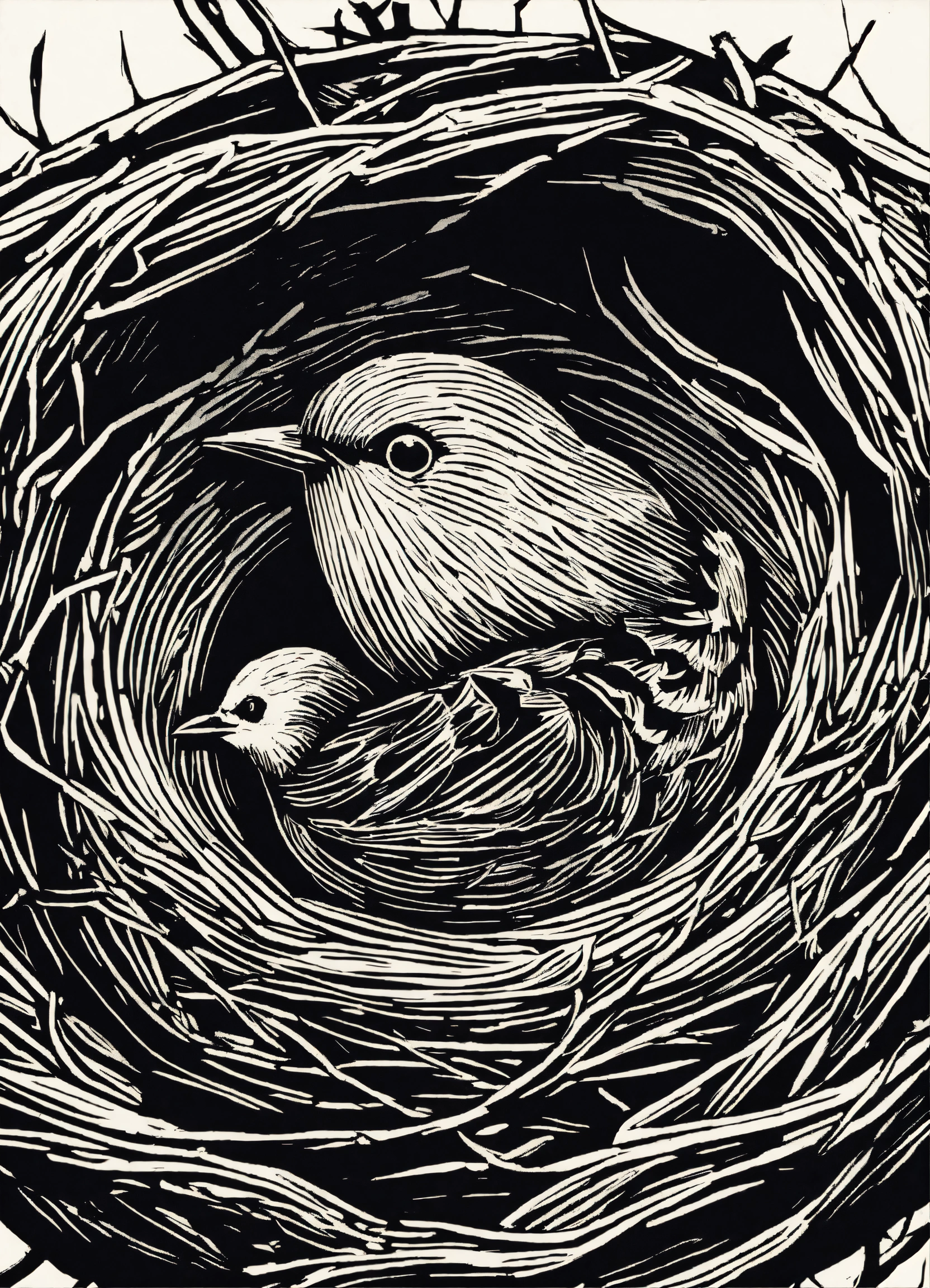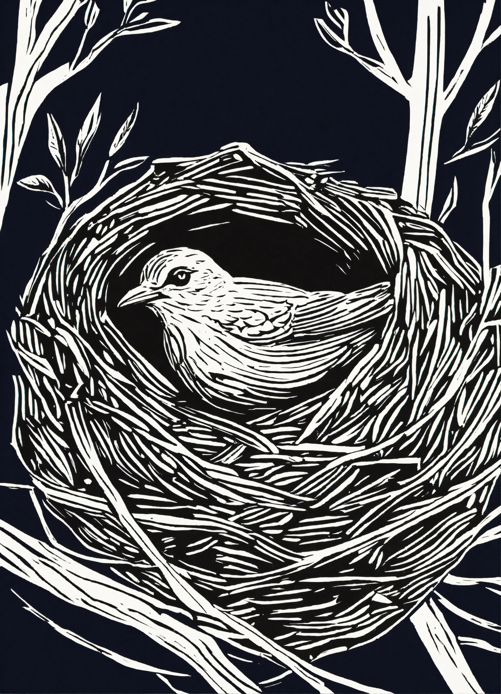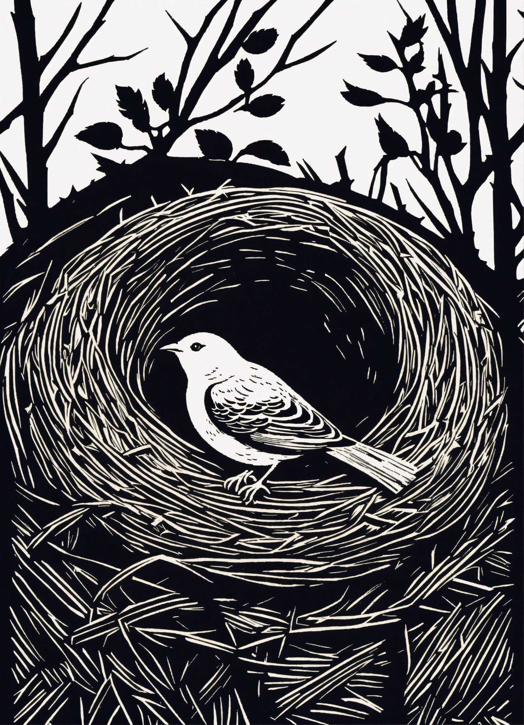 Linocut illustration of bird in a nest