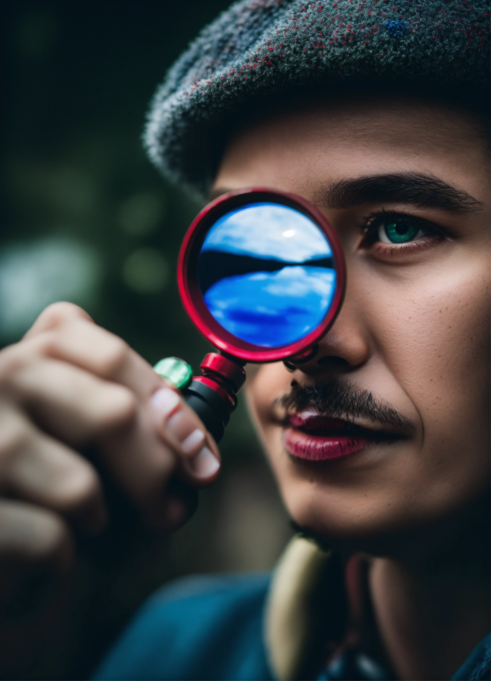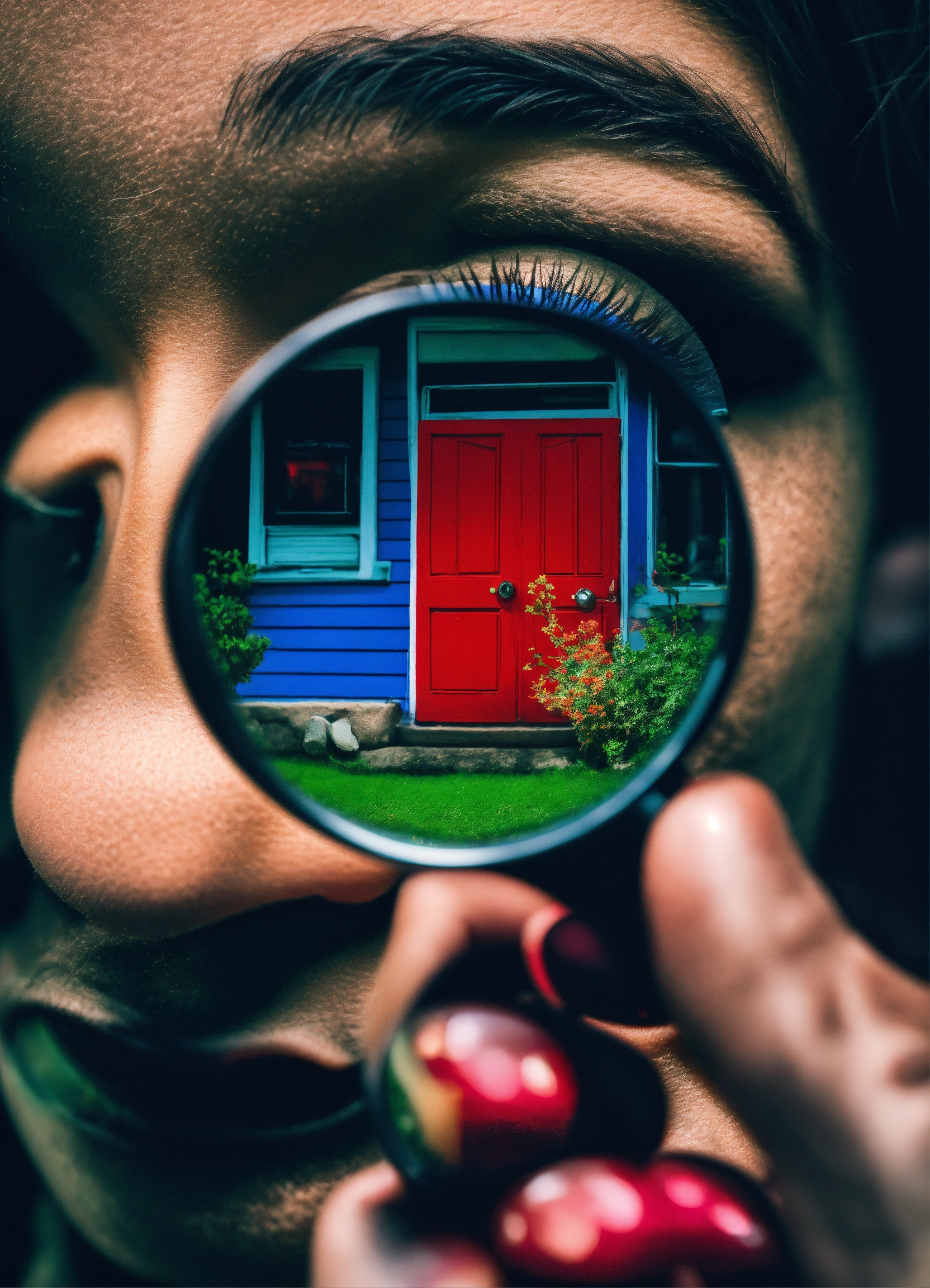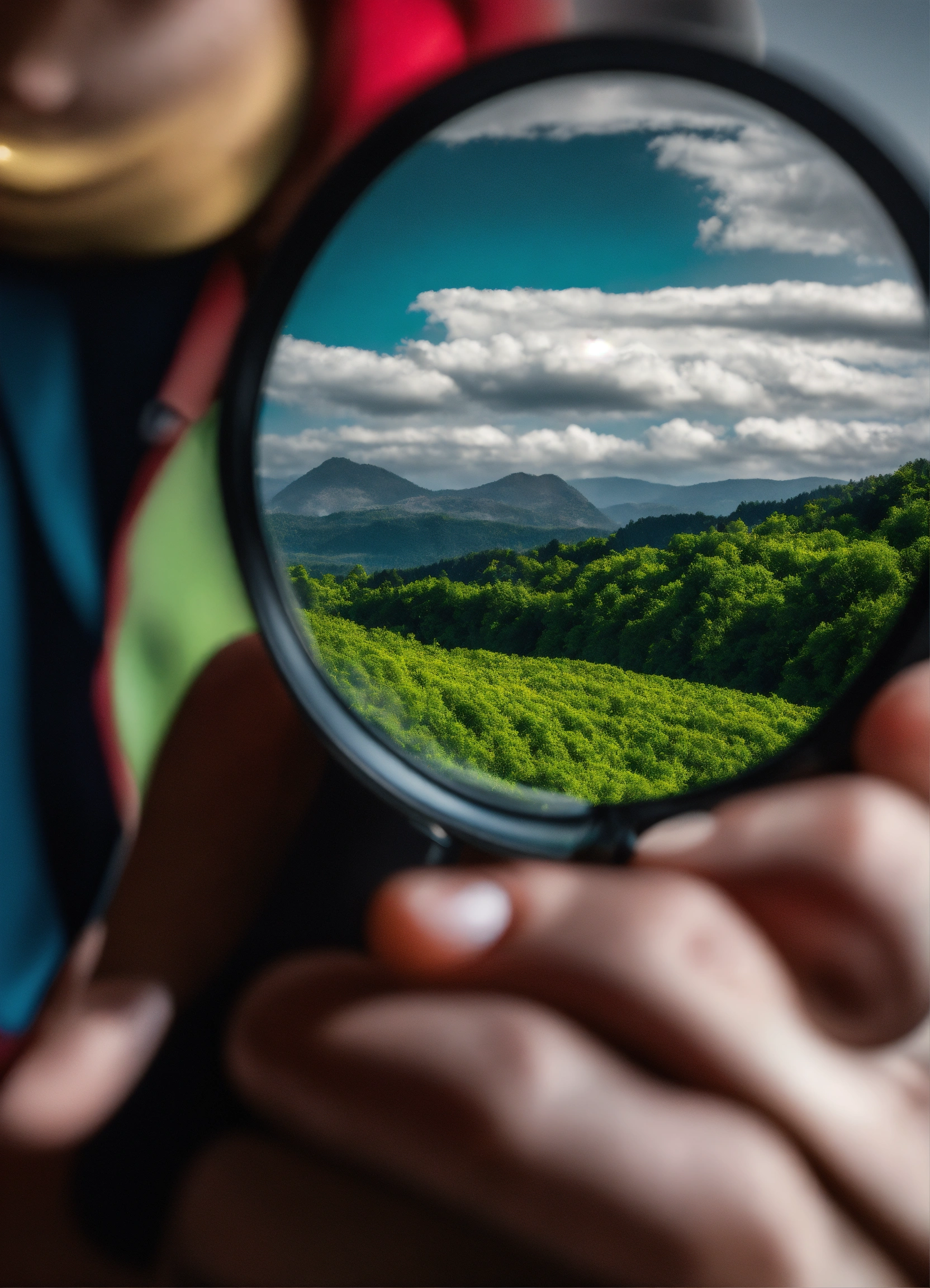"vivid perception", person holding magnifying glass, rich blues, greens, and reds within lens, grayscale world outside, nikon d850, contrasting hues, photorealistic style.