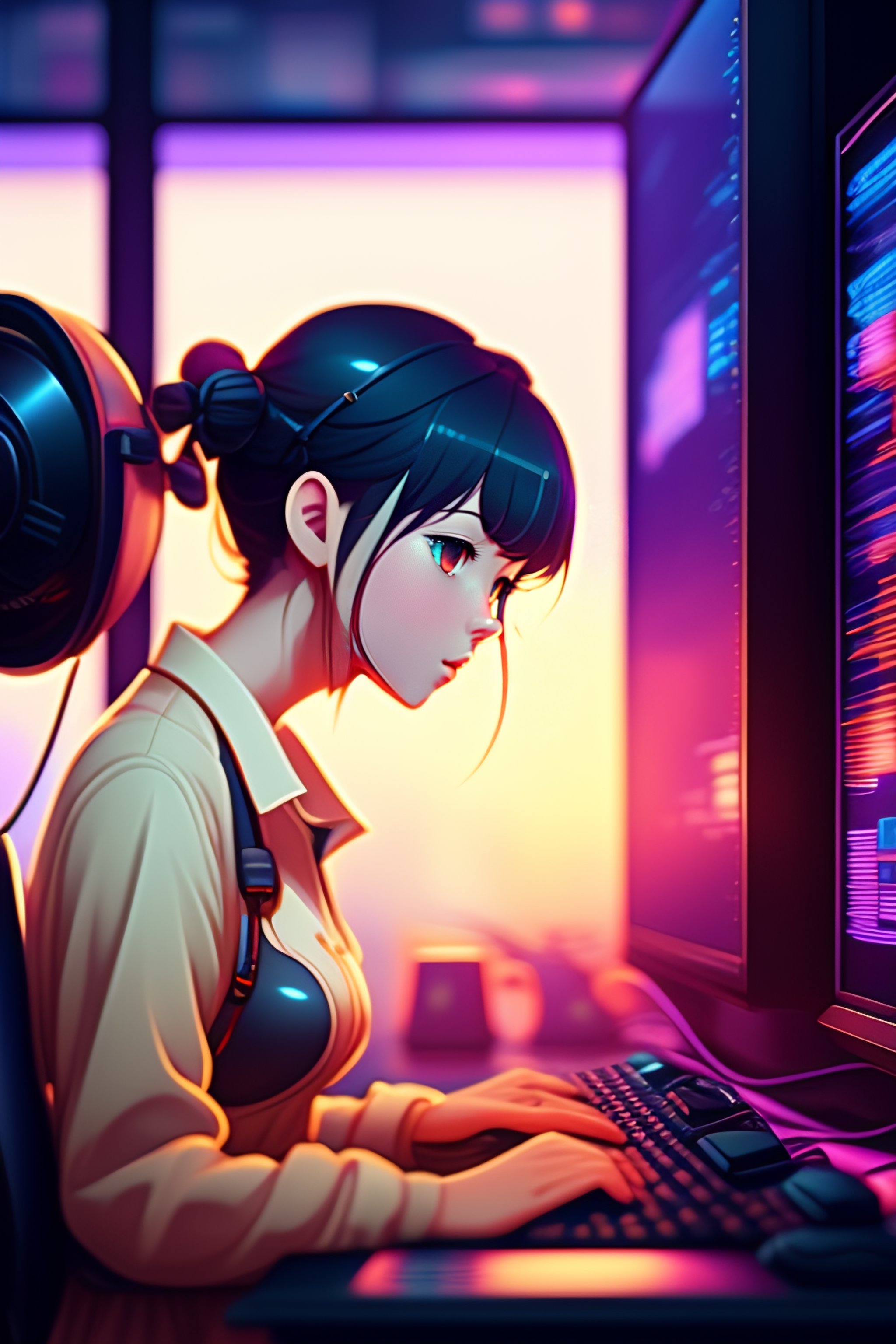 Create a high resolution artwork of lofi, anime girl is programming at a computer in a room full of gadgets, snown, web developer, by makoto shinkai and ghibli studio, outlined silhouettes, dramatic lighting, highly detailed, incredible quality, trending on artstation, masterpiece, 8k