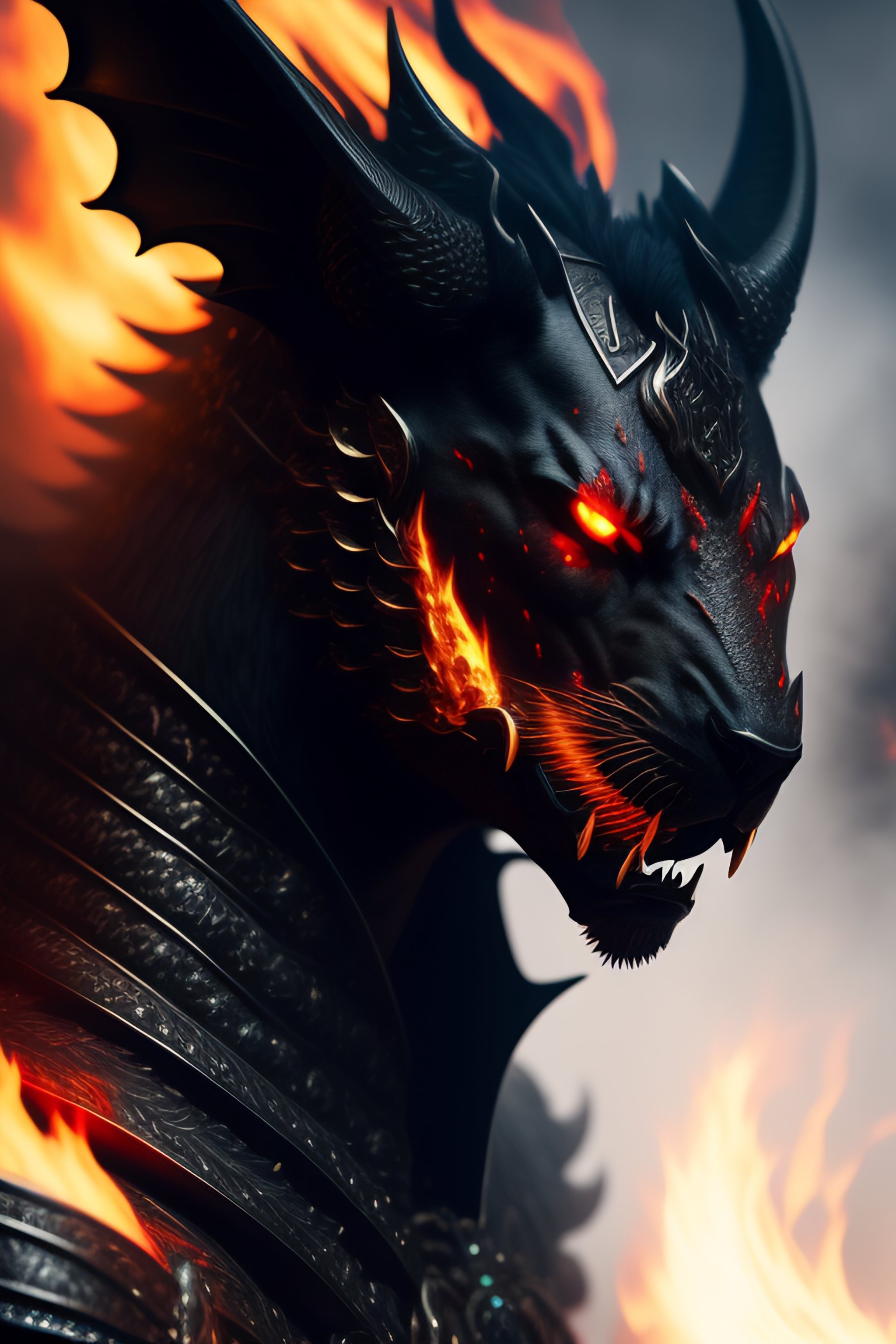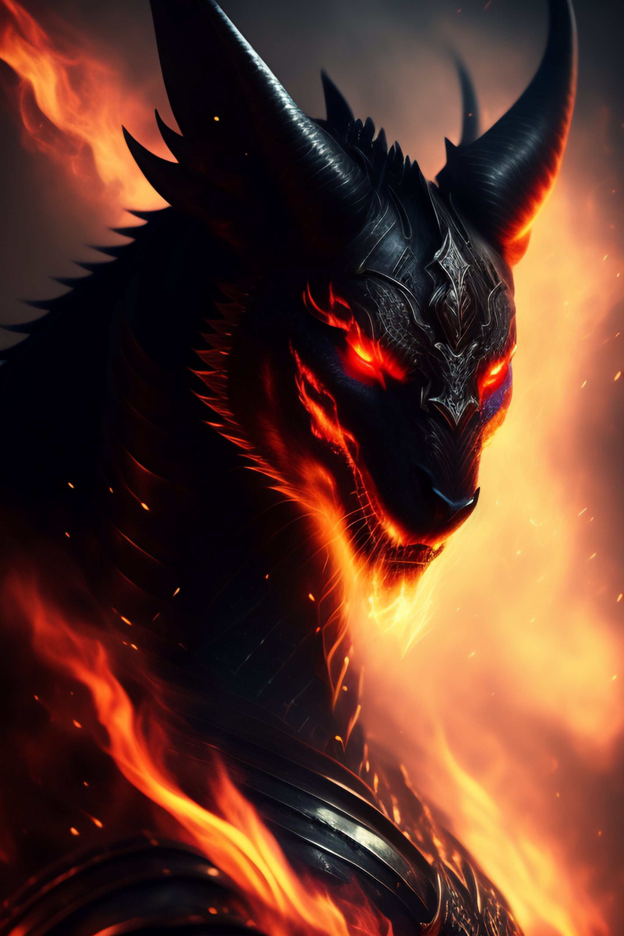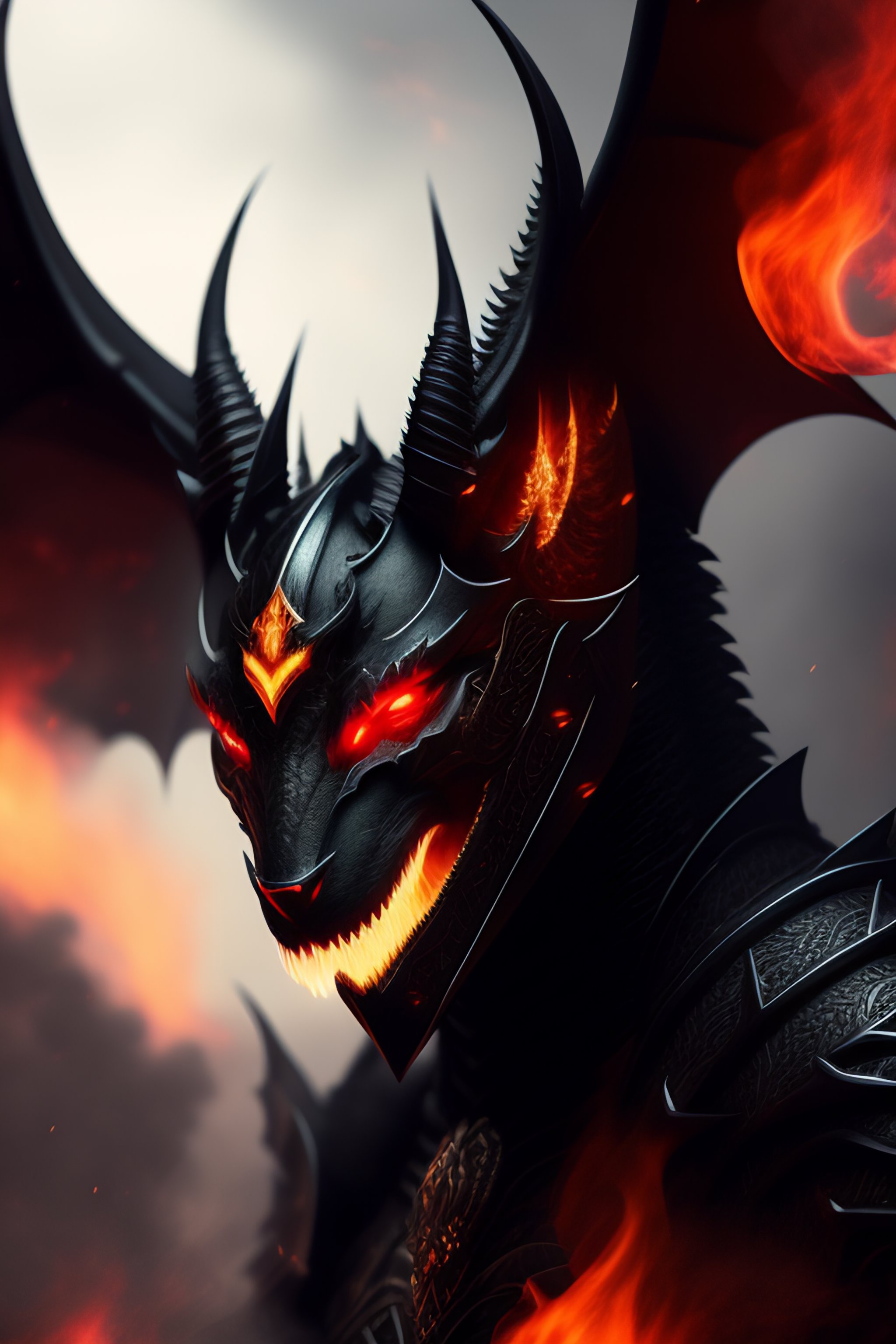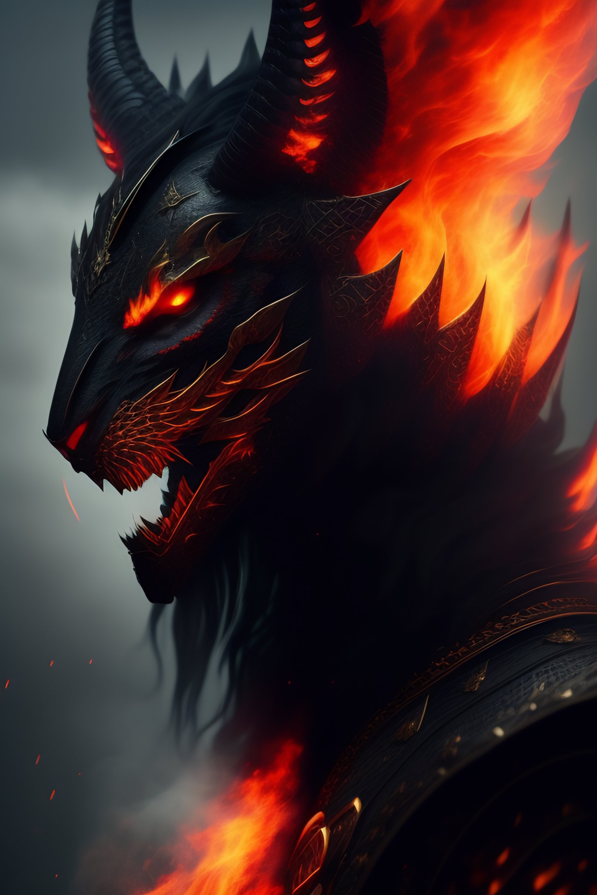 A demon made of black smoke, dragon eyes, sparks of fire and smoke from his mouth, angry face, powerful, armor drawing