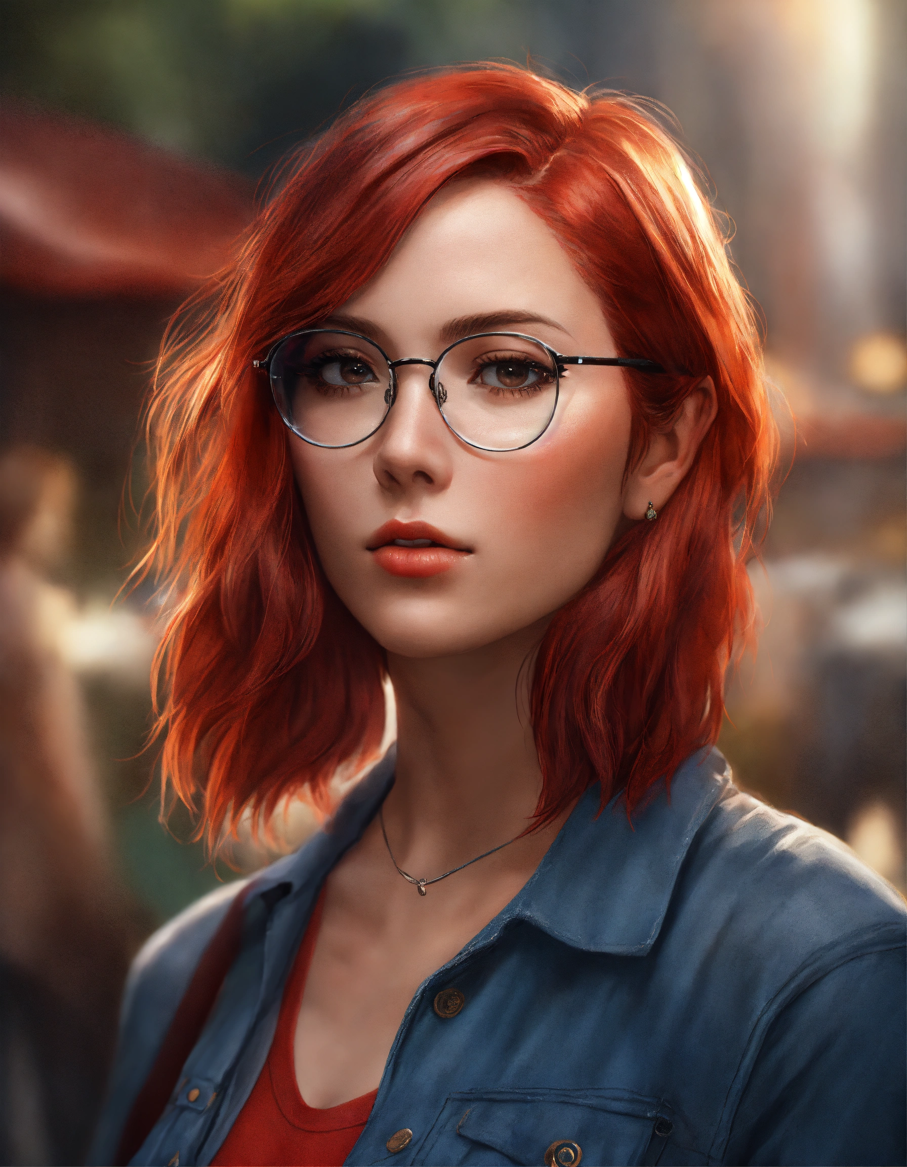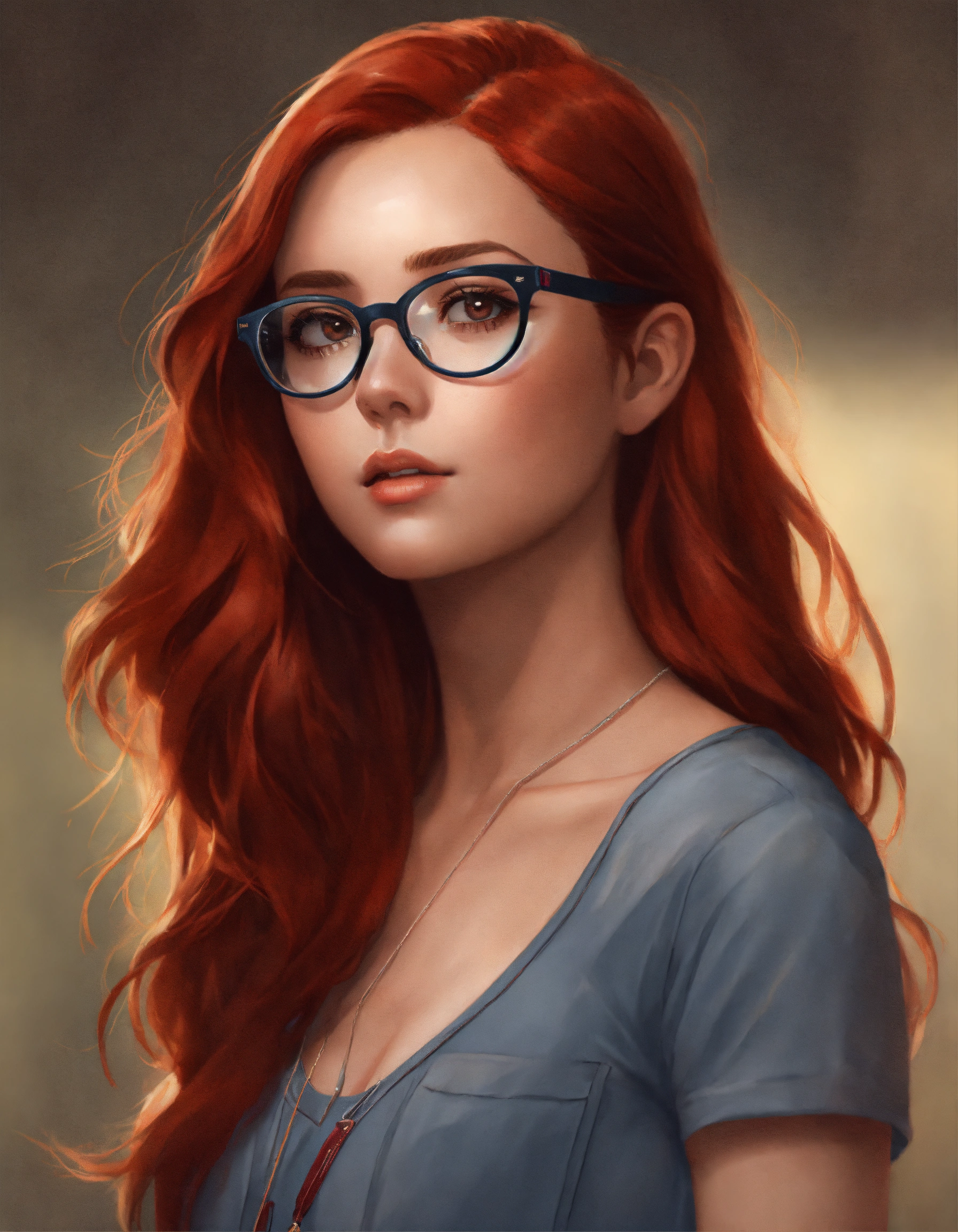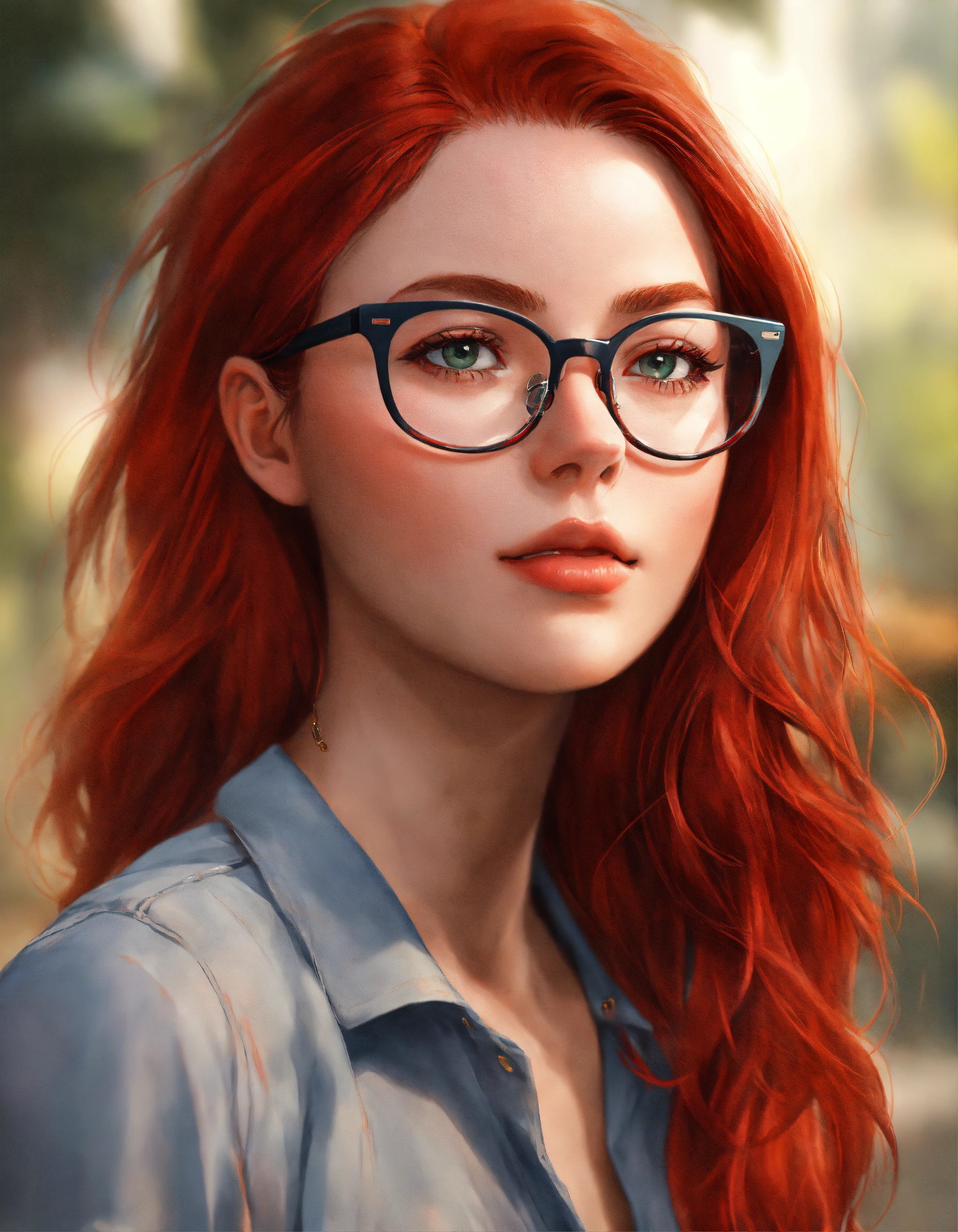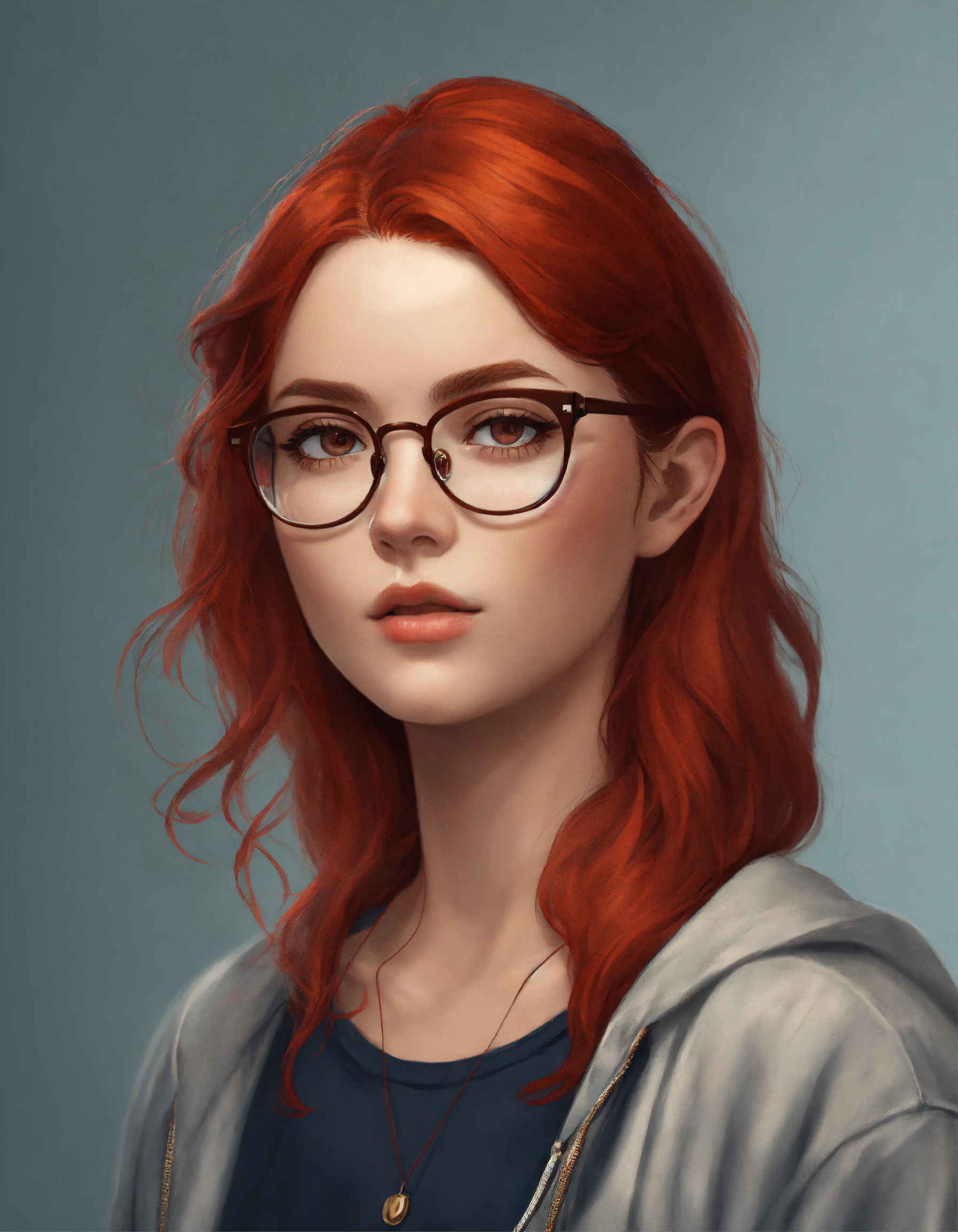 Female half body portrait avatar, with red hair wearing modern reading glasses, casual clothes, age 28, in semi photo realistic modern style