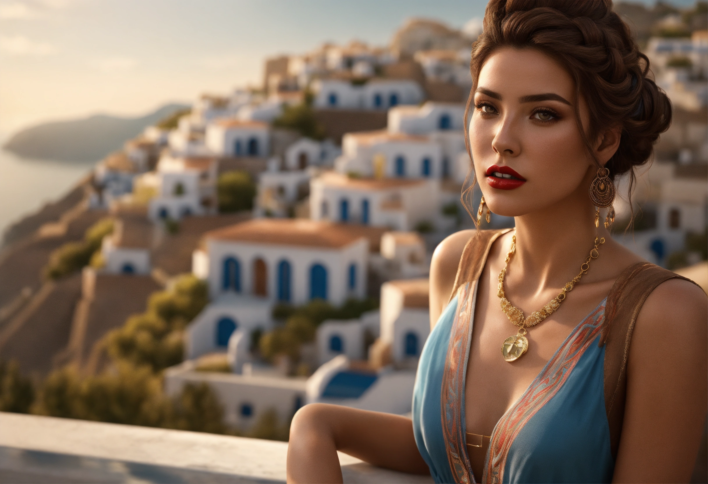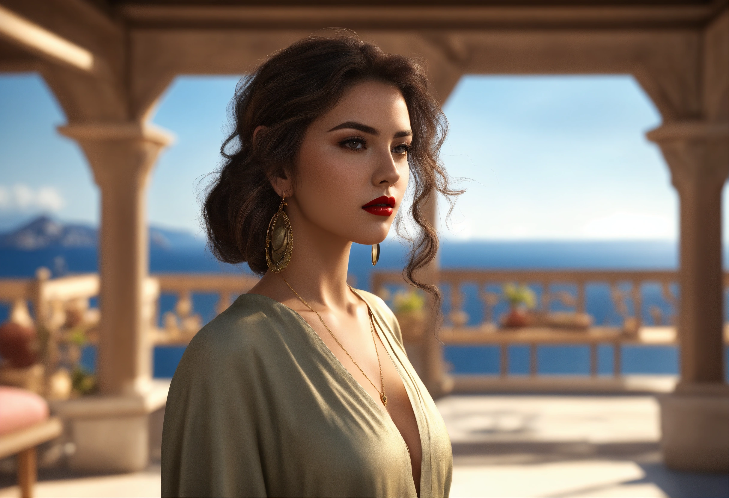 Create a detailed, realistic image of a beautiful greek woman, wearing a casual dress, hairstyle, hair color, face expression, . the woman should be shown on a terrace, overlooking a panoramic location, with her gaze directed forward. her look and accessories should be in harmony with the environment, including her lipstick and makeup. enhance the image with shadows and reflections, ensuring a high level of detail and vibrancy. render the character in a cinematic style, aiming for hyper-realism and utilizing a high-quality model. use hdr, 3d technology, and an 8k resolution to achieve an ultra-high-quality result. the overall effect should be mysterious and captivating, reflecting the essence of #alpacifista.