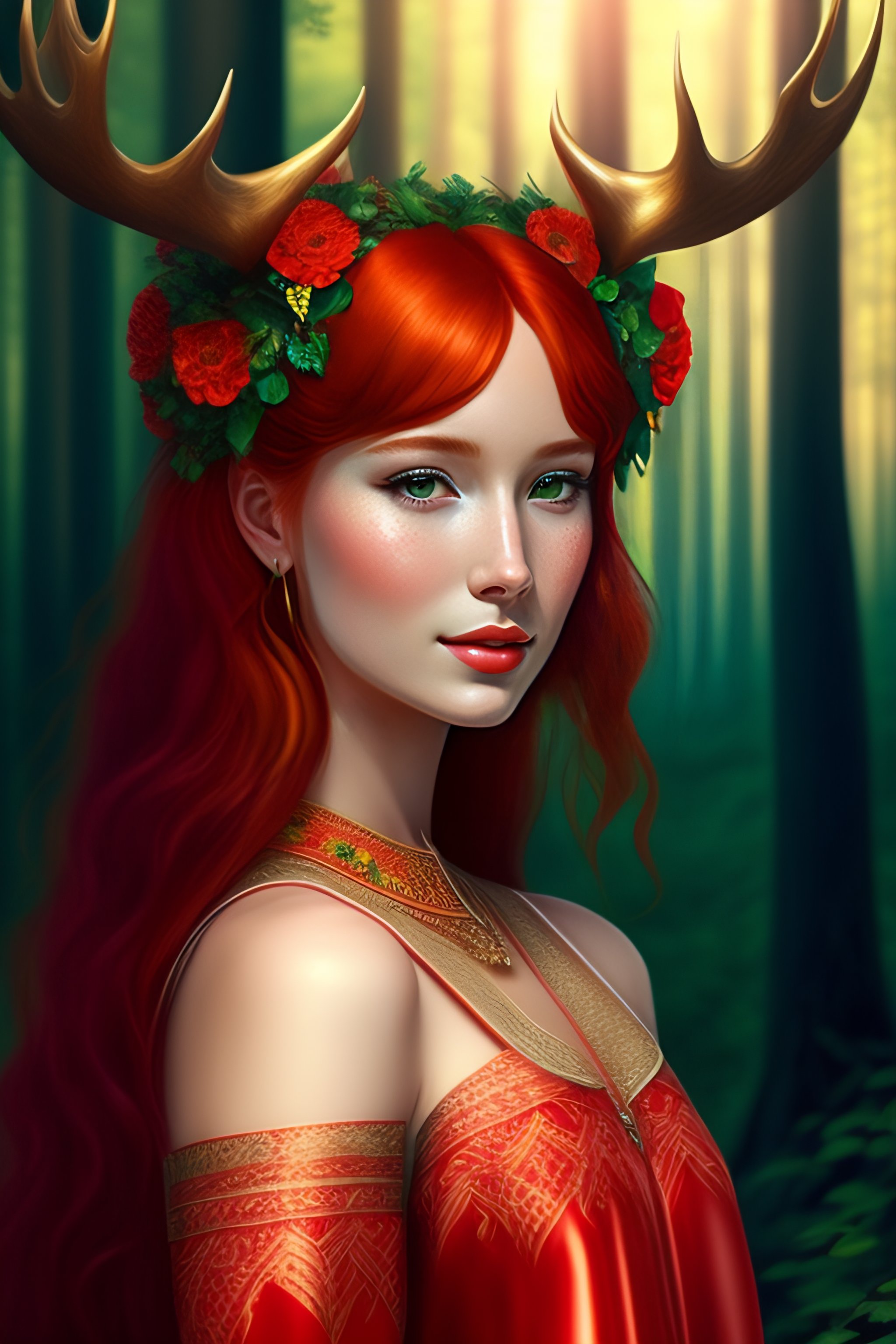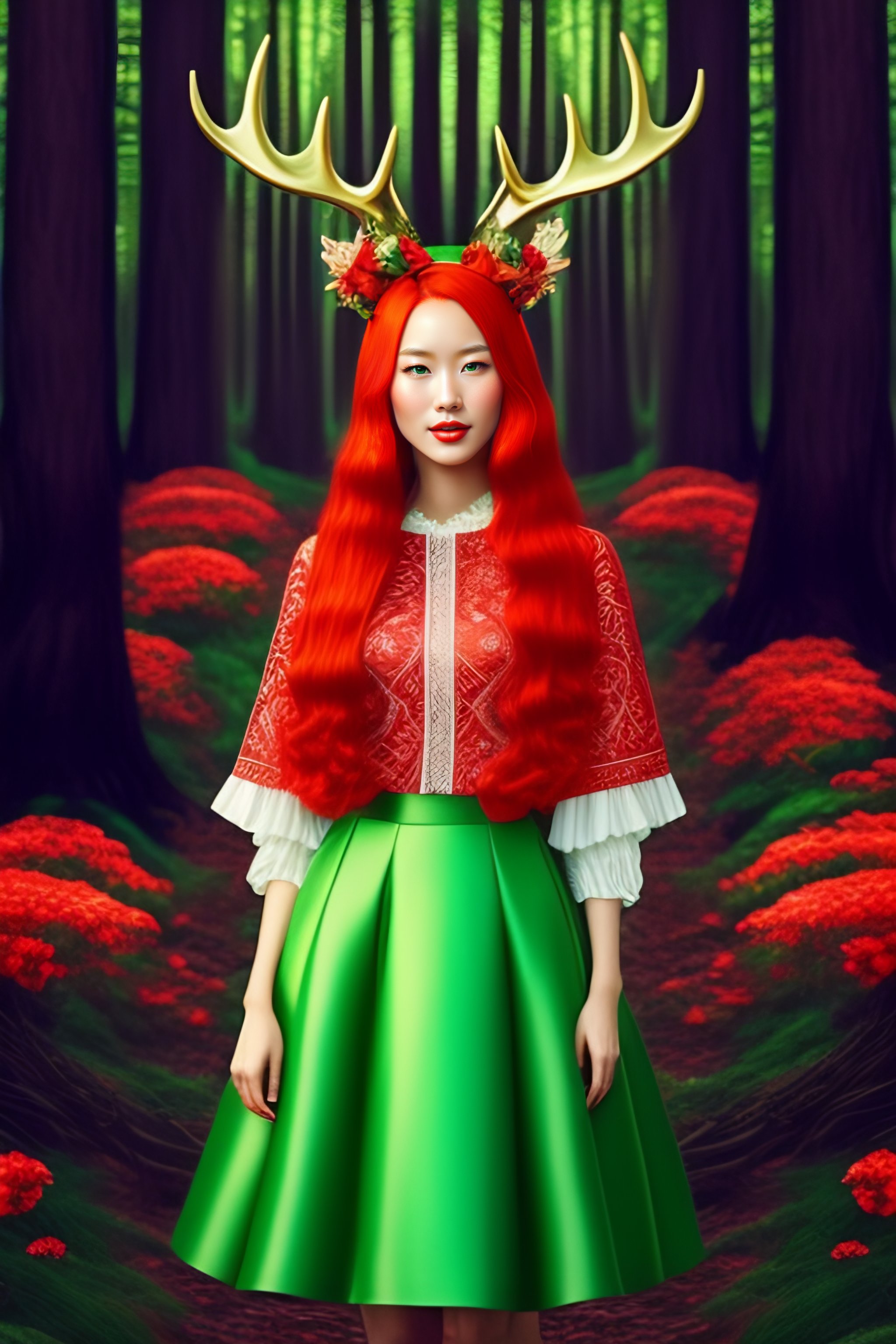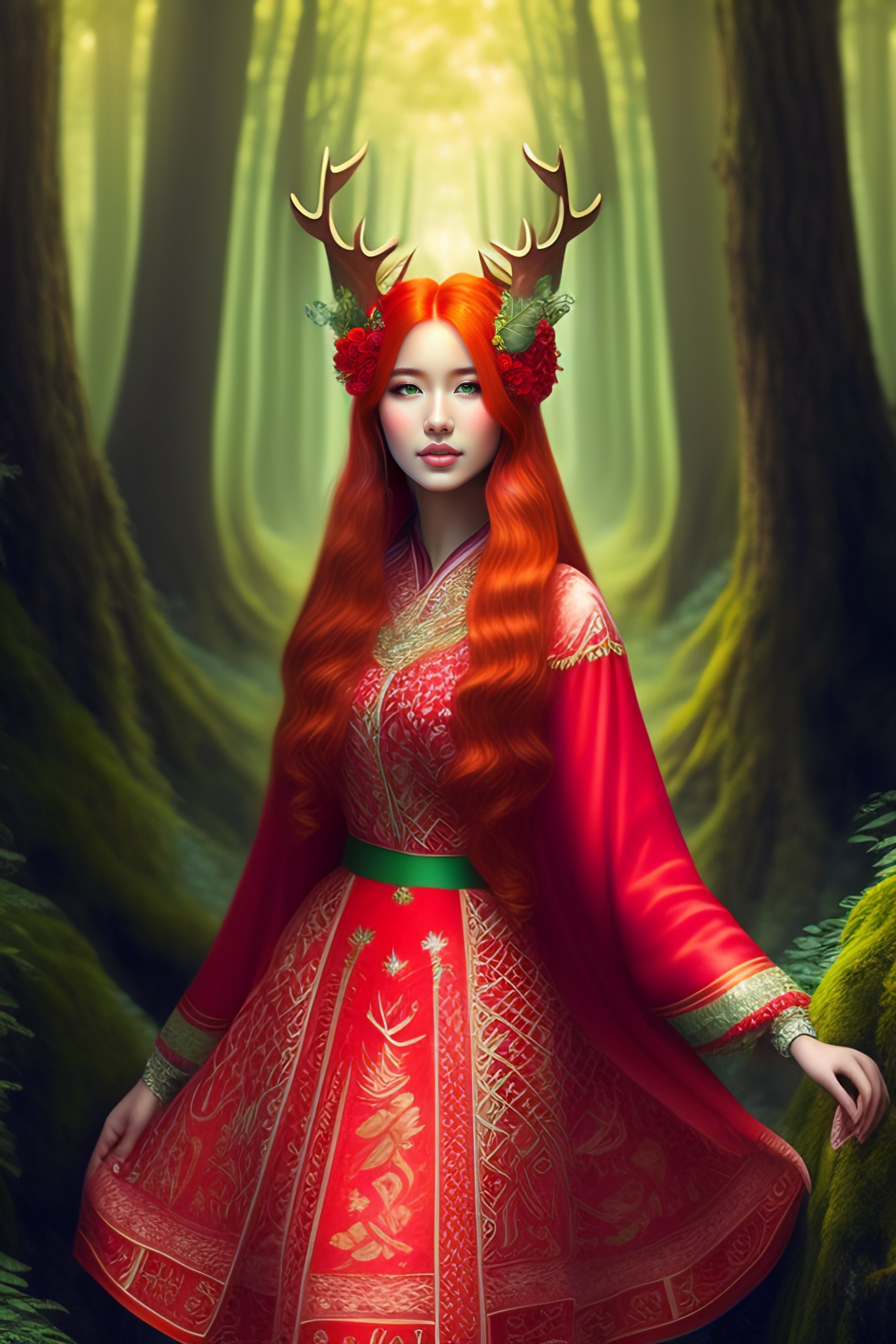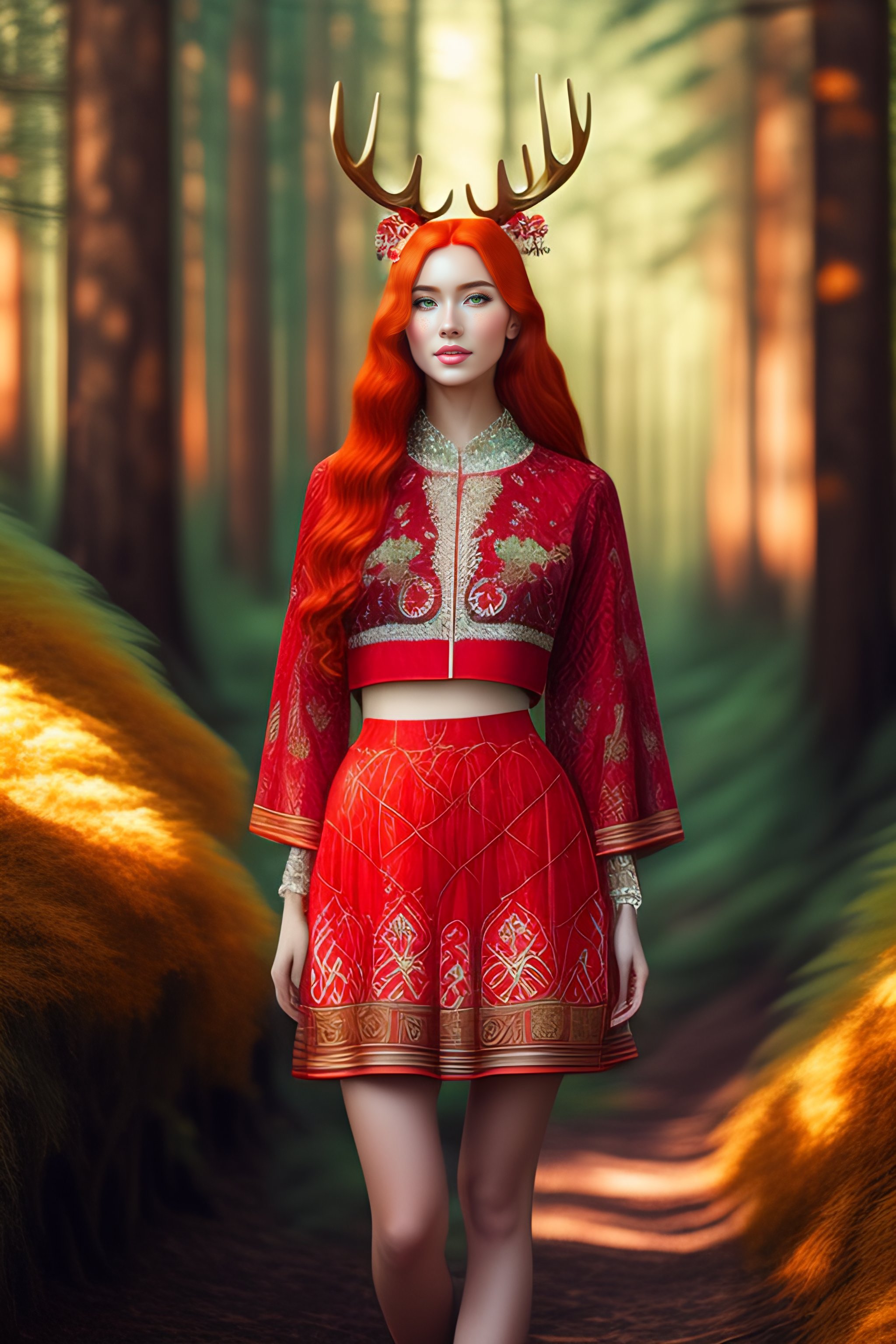 Barefoot red-haired princess in a patterned bolero, a patterned skirt and antlers on her head coming out of a green forest, anime