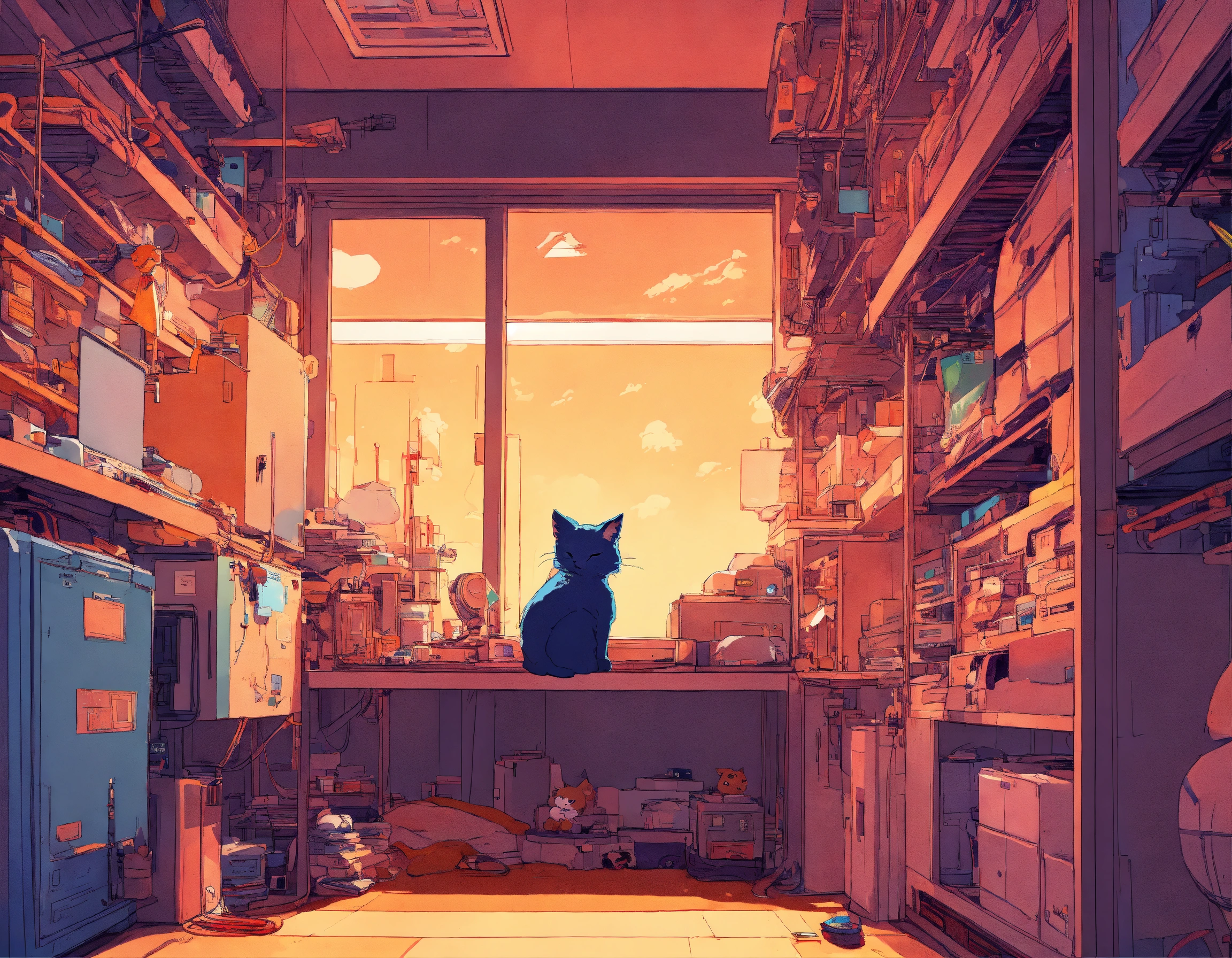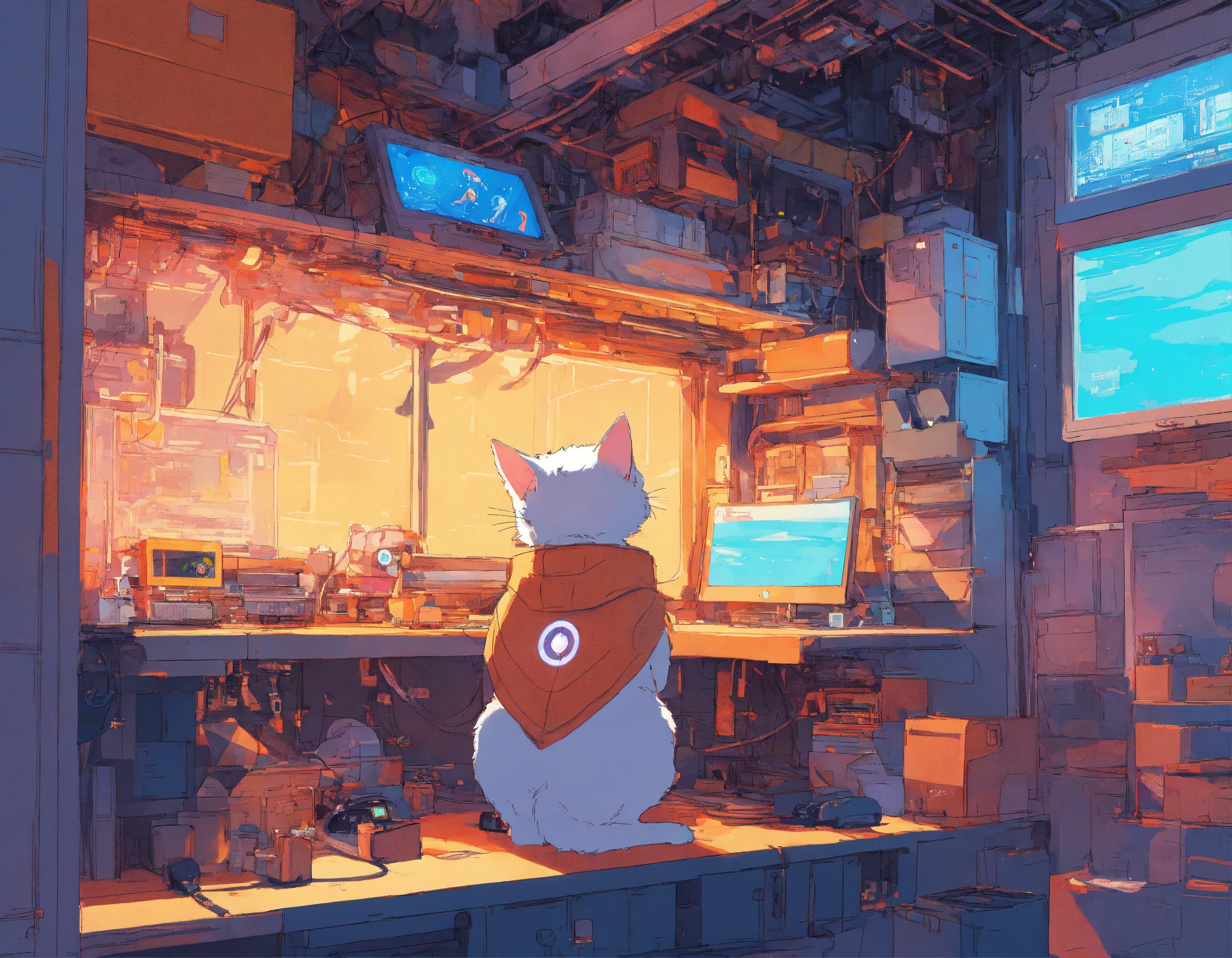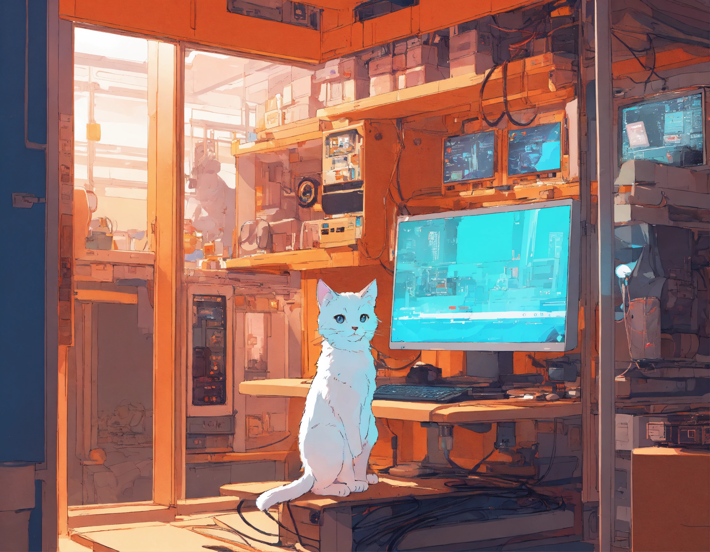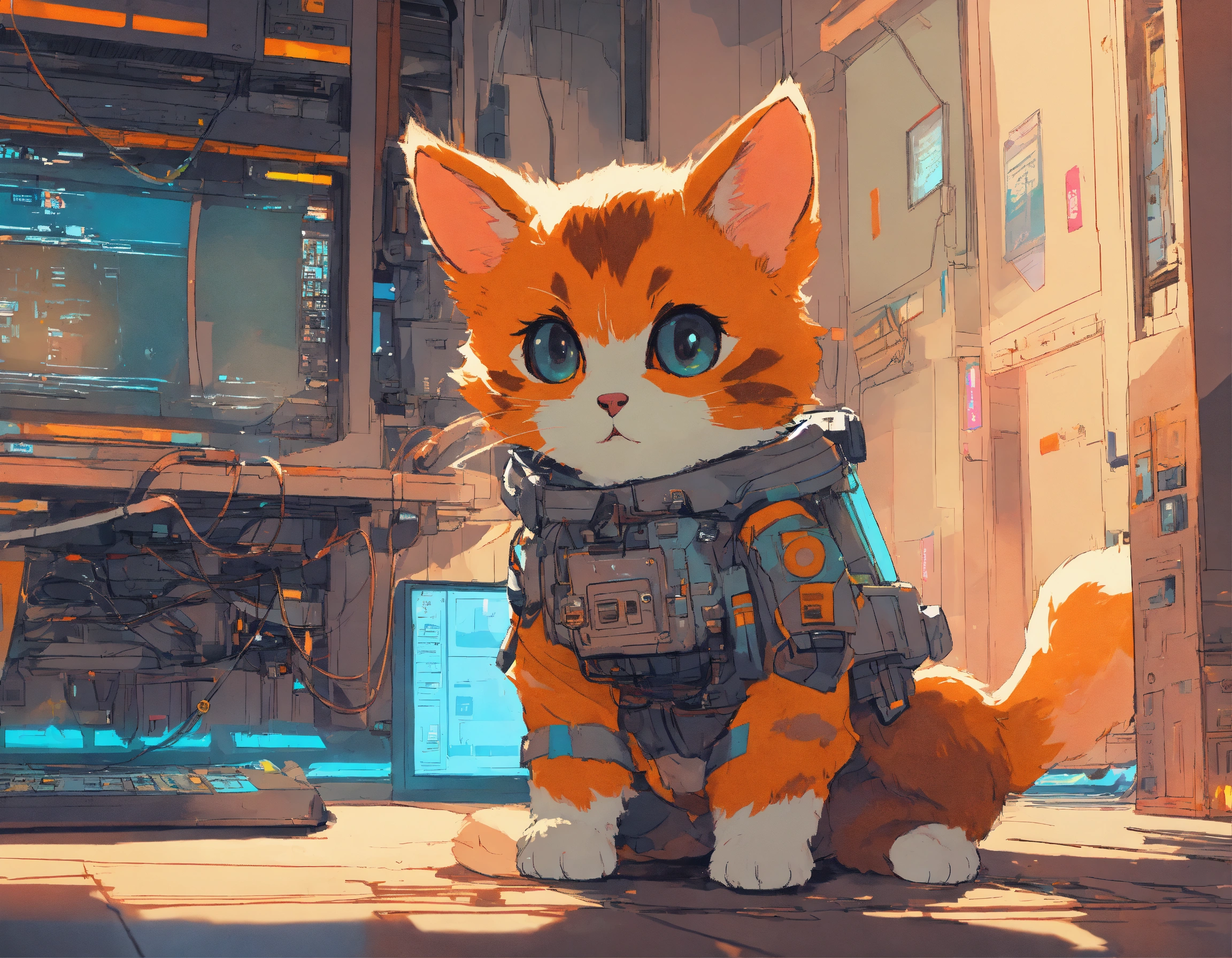 Digital art of a little cat, baby loveable eyes, moving into supercomputer room, in ation, in futuristic costume, cartoony, style of laurie greasley, studio ghibli, akira toriyama, james gilleard, genshin impact, trending pixiv fanbox, acrylic palette knife, 4k, vibrant colors, devinart, trending on artstation, low details