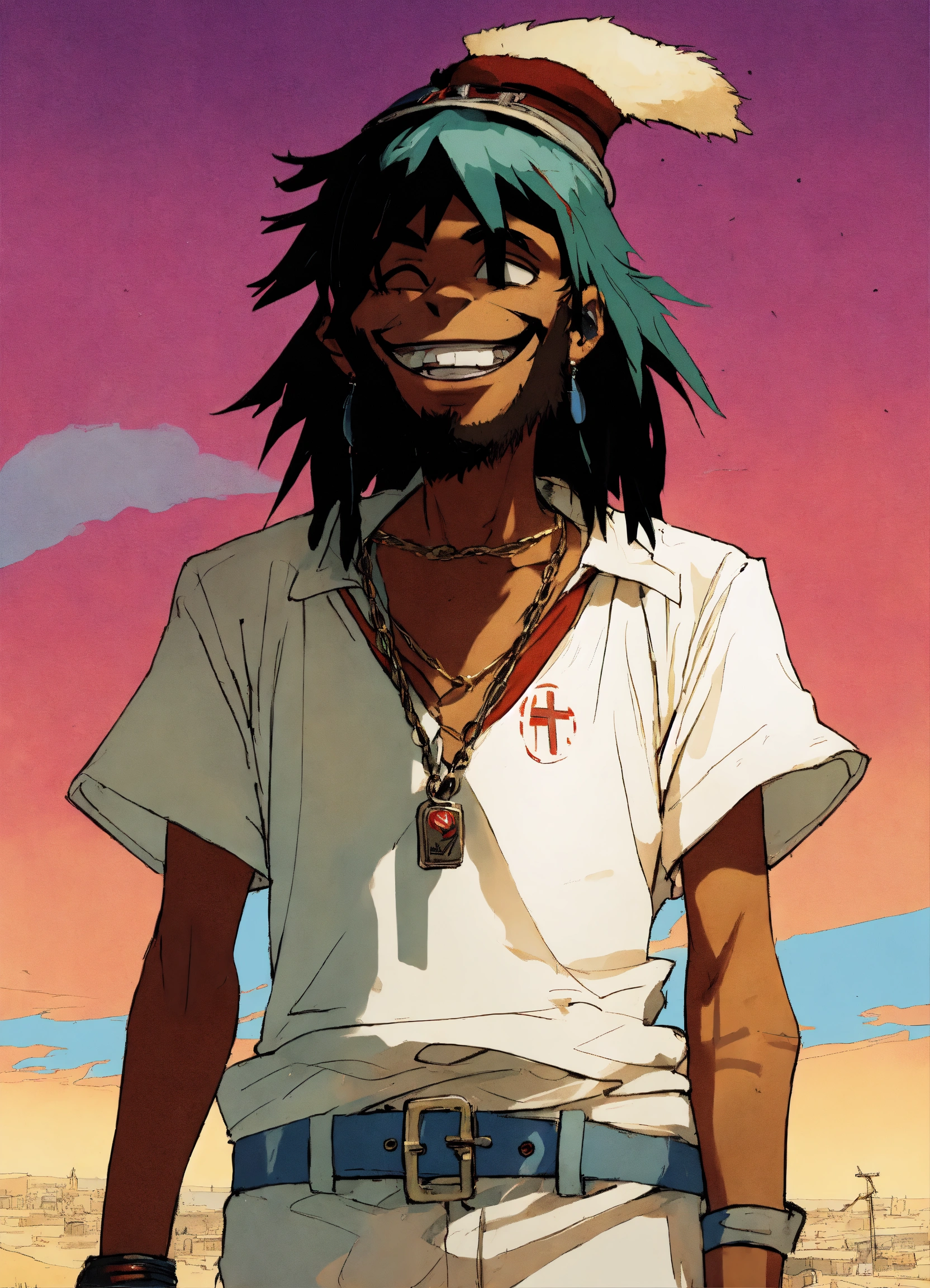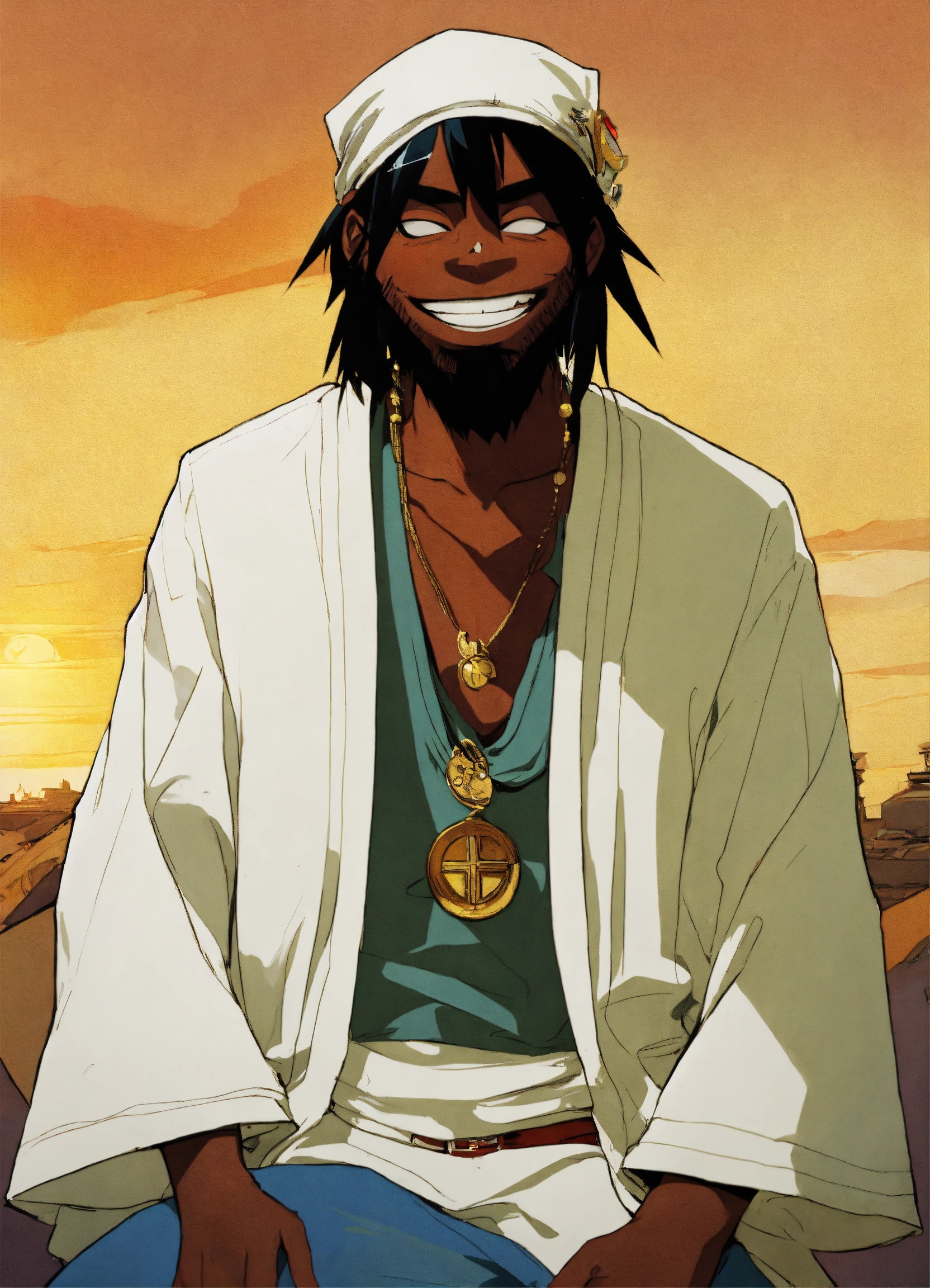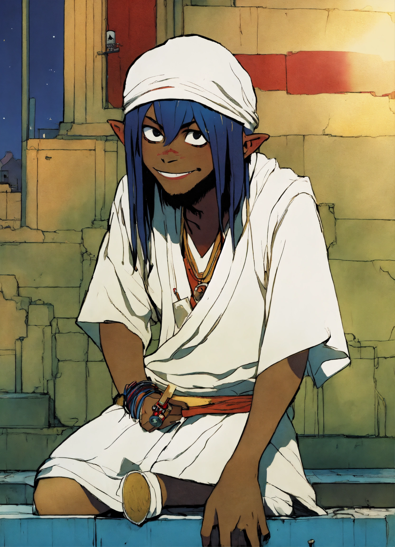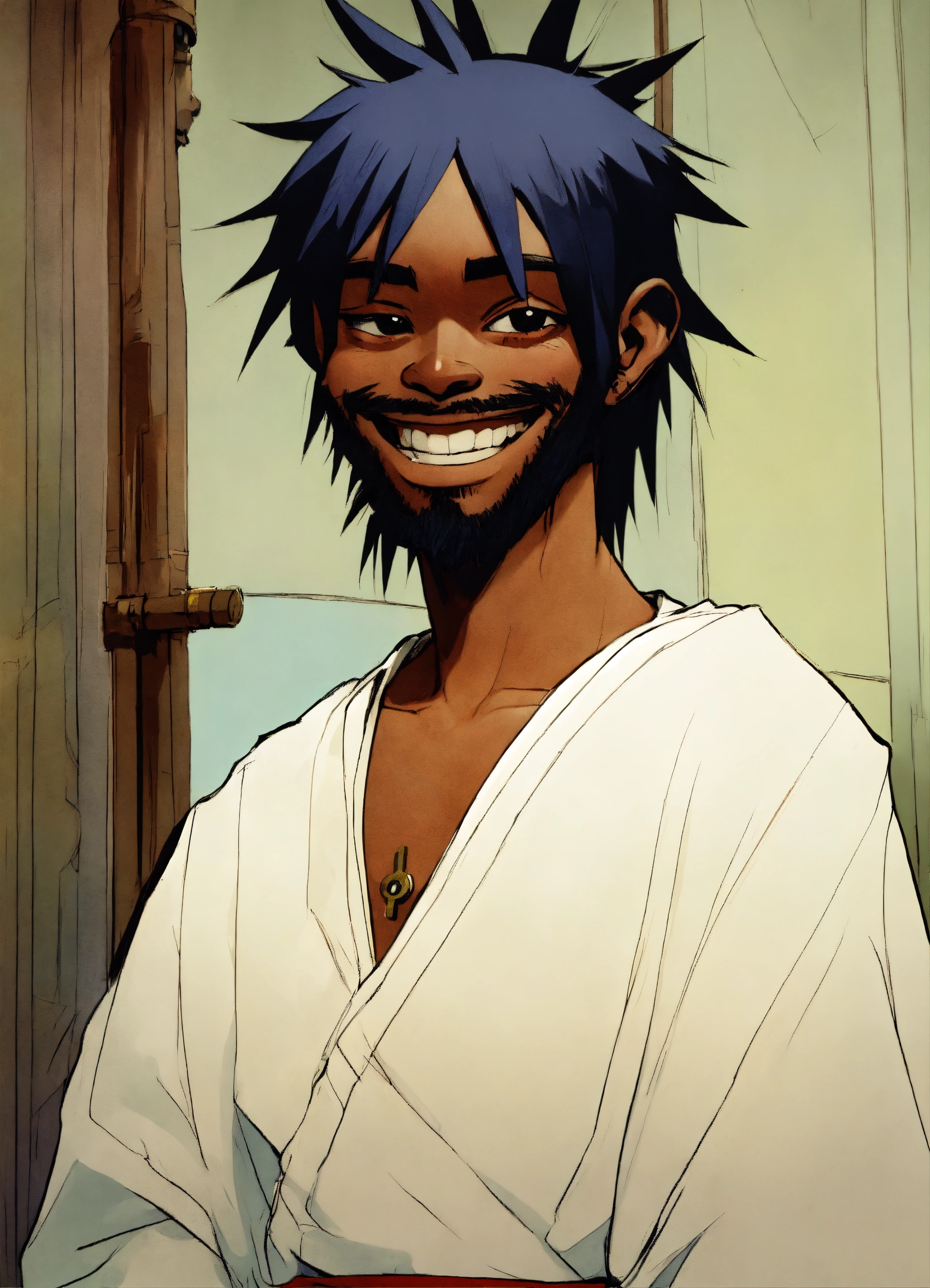 Gorillaz jesus, white tunic, cute smile, by jamie hewlett, manga style, concept art by jamie hewlett, jamie hewl