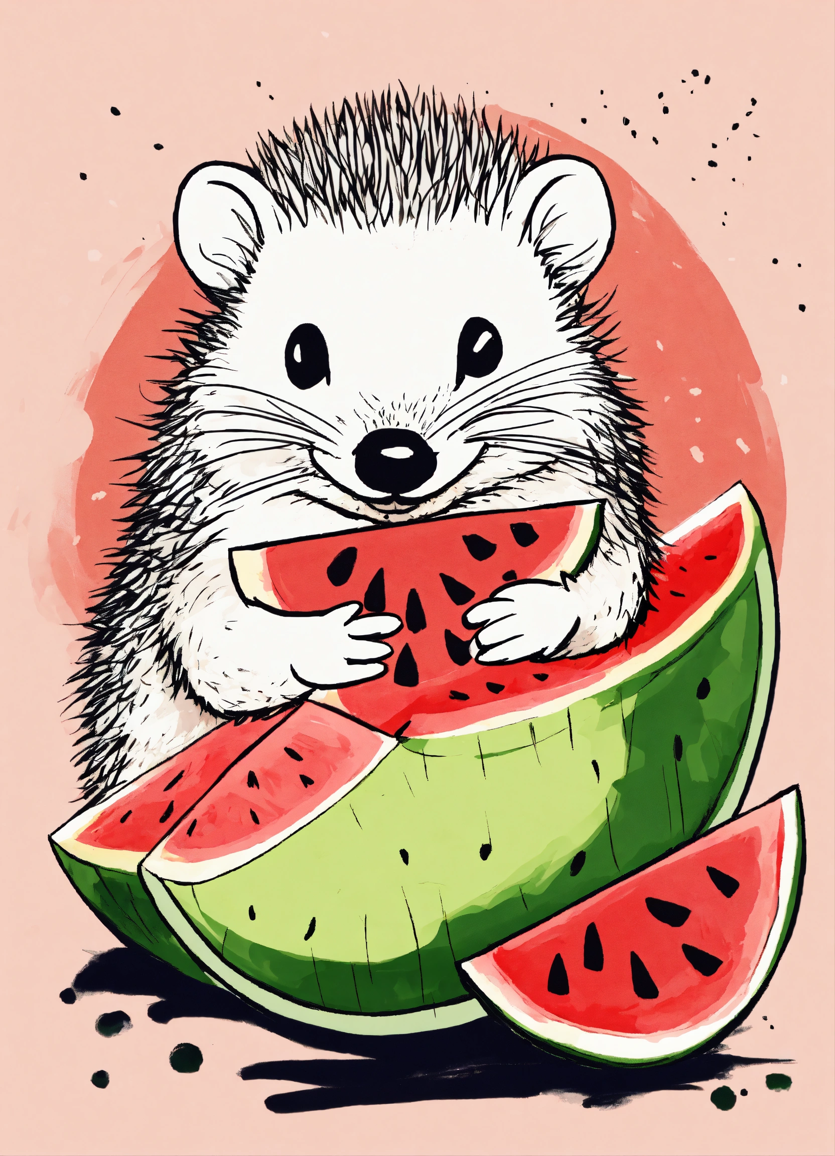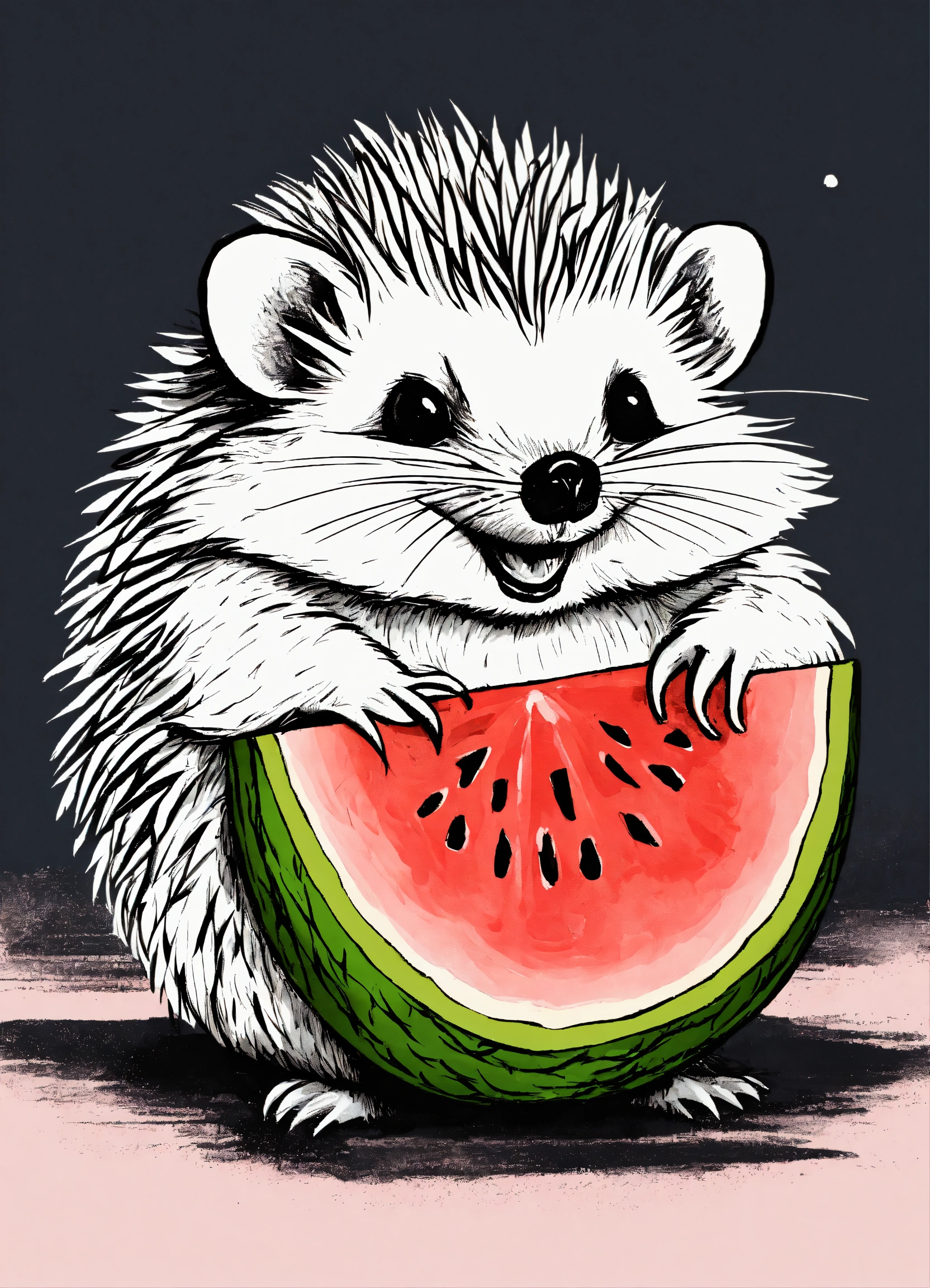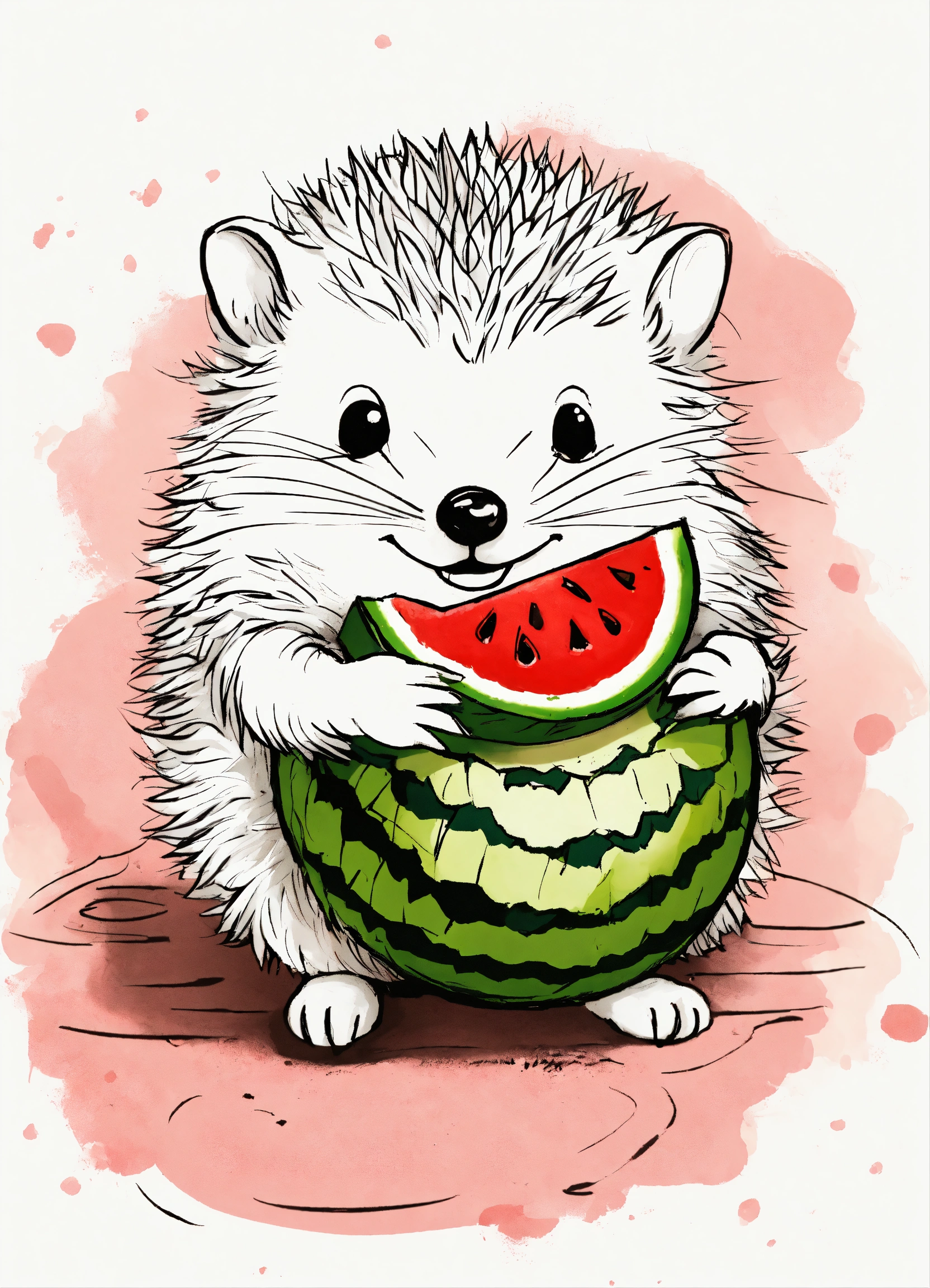 A small hedgehog holding a piece of watermelon with its tiny paws, taking little bites, eyes closed in delight, cute ink sketch style illustration