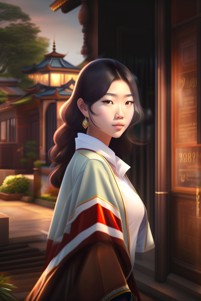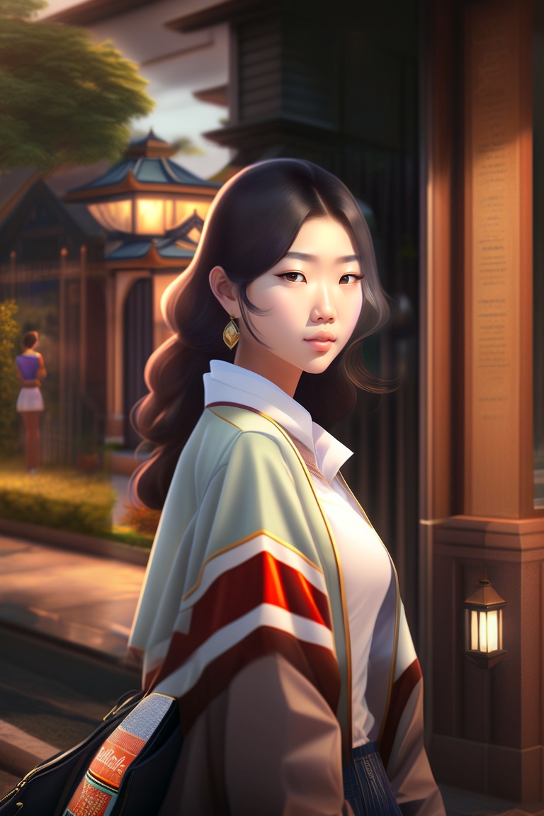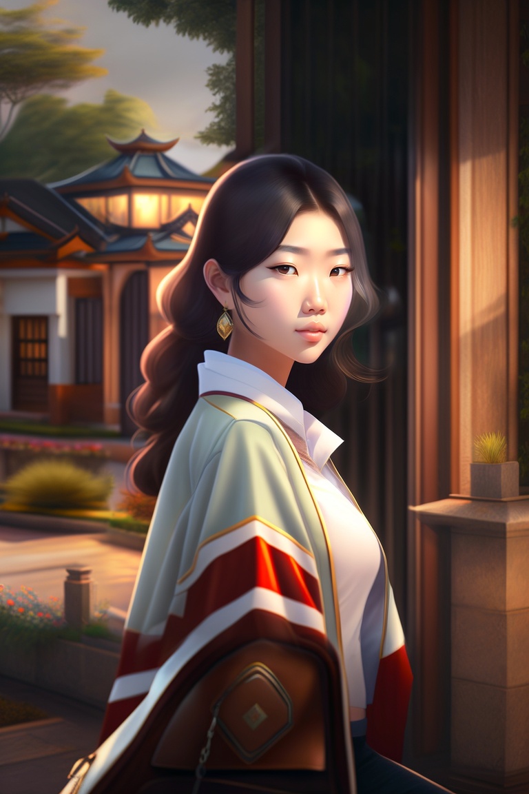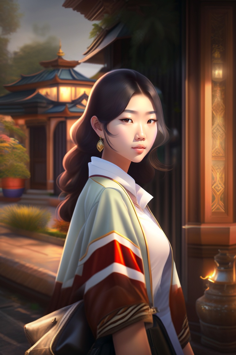 Light angle indonesian 18 year old woman in jakarta, house in background. vibrant, photorealistic, realistic, light, fill focus, manhwa art, highly detailed, 8k.