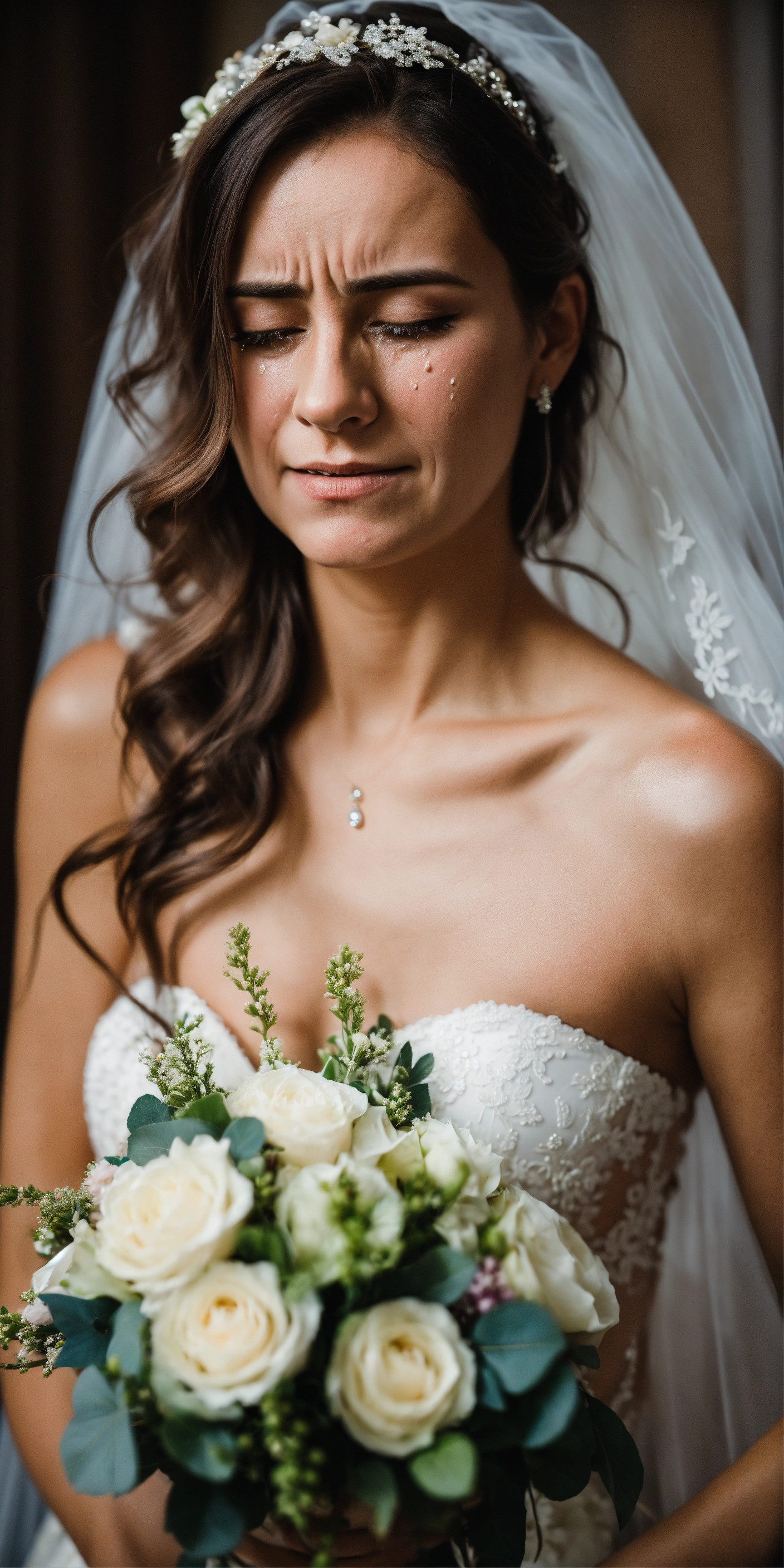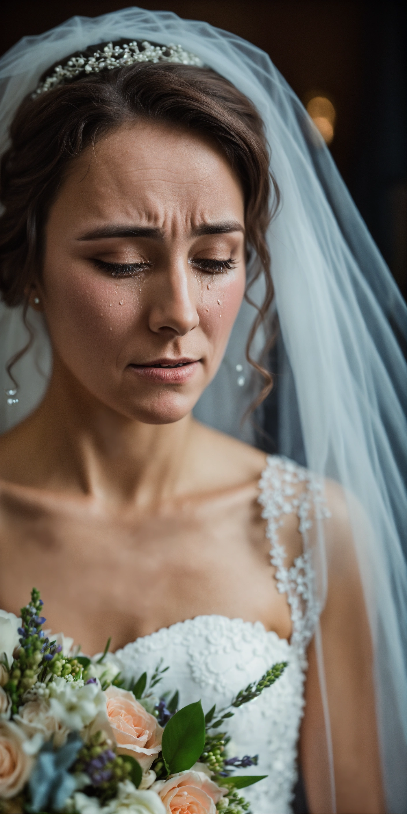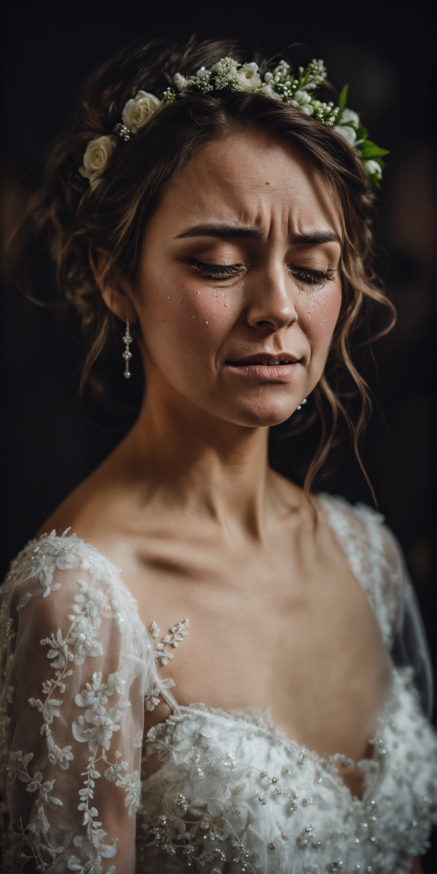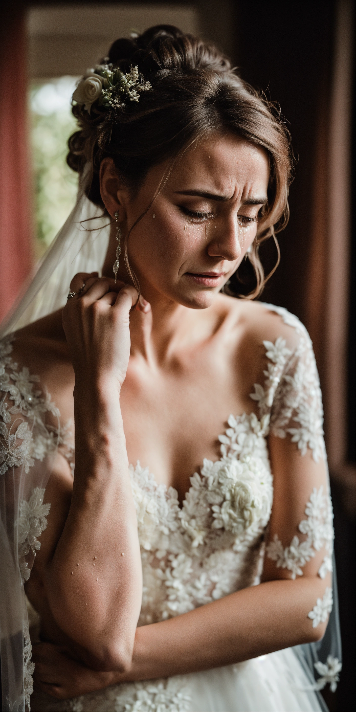 A crying dishevelled bride in her 30s