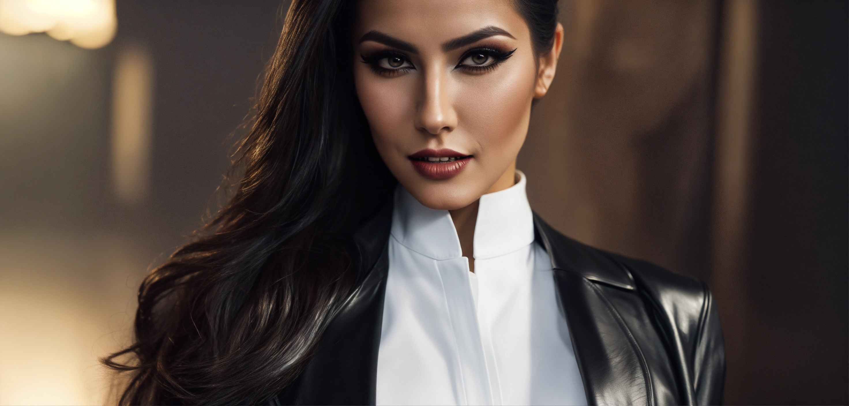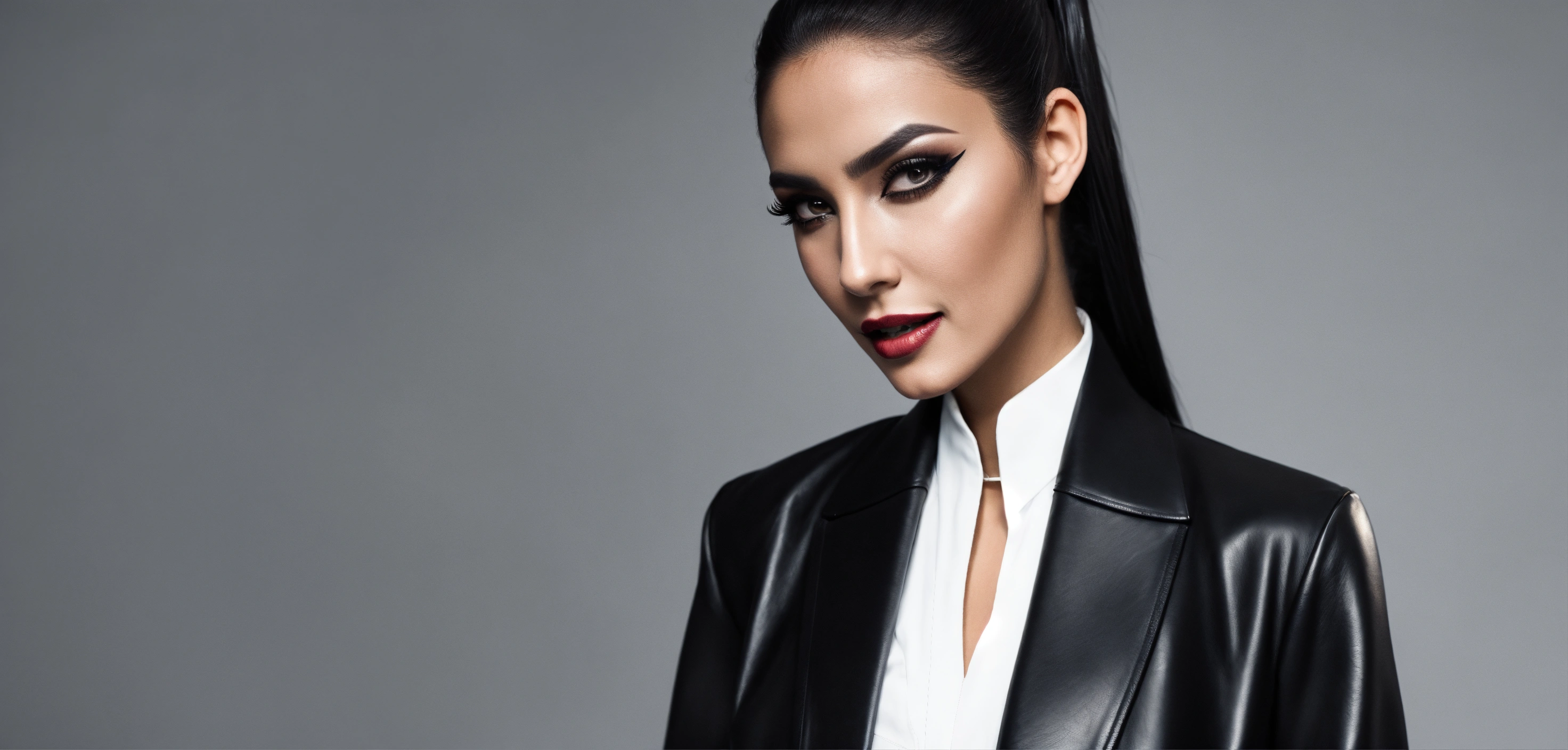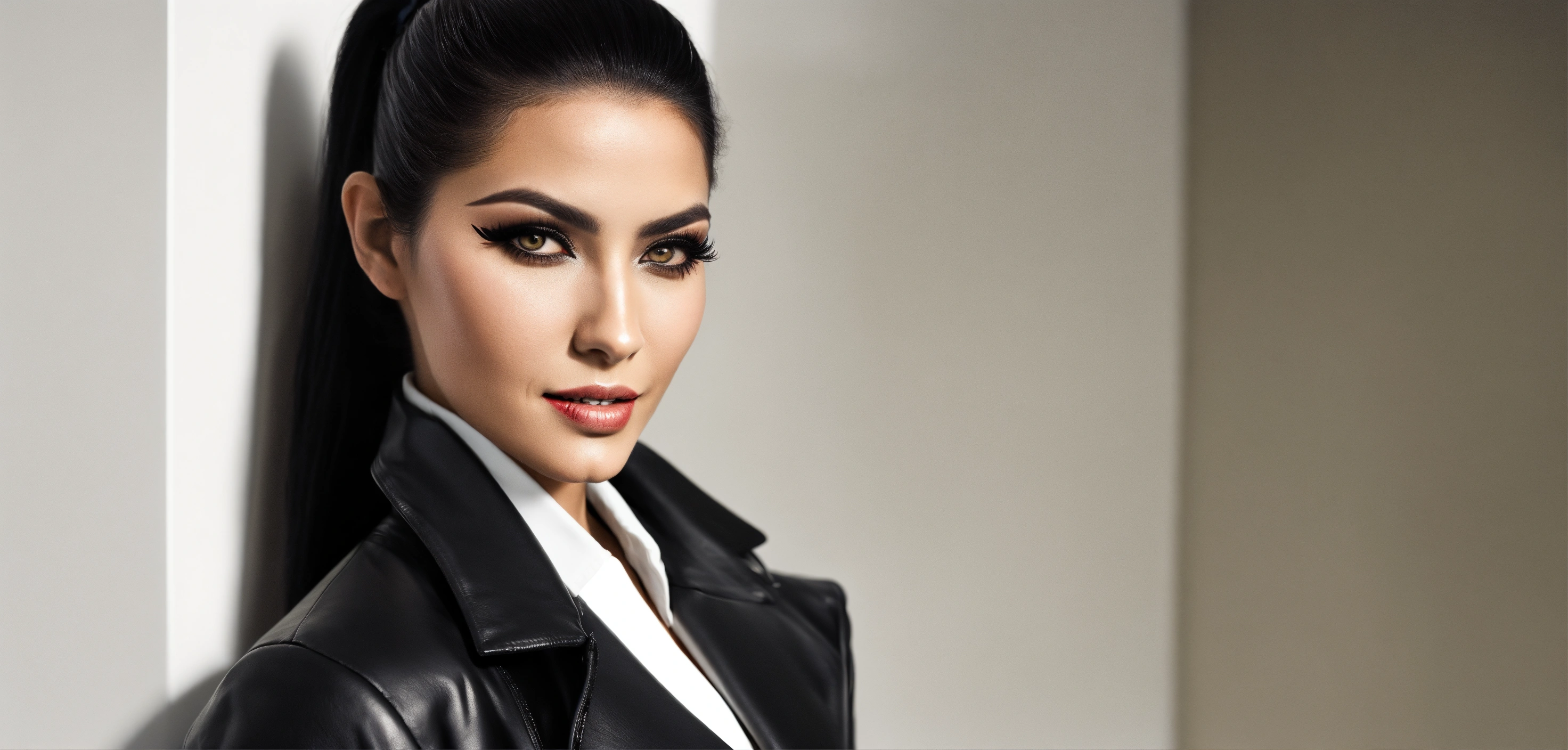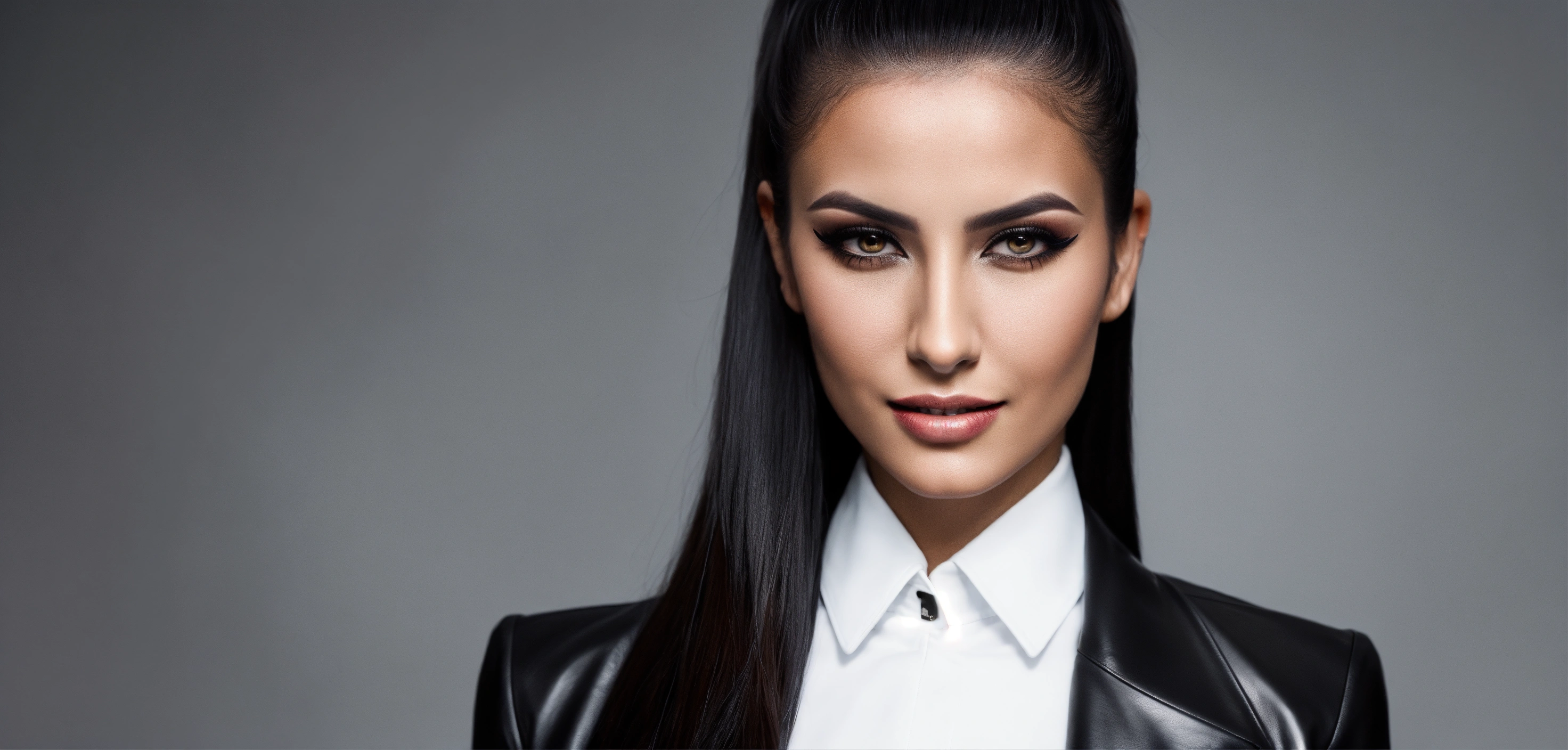 Cinematic look, stunning arab seductress woman fashion model, arrogant evil smile from above, black straight hair very high ponytail, black leather blazer jacket, white office shirt, eyeliner makeup, underworld vampire movie style, ultra-realistic; solid white background; no background
