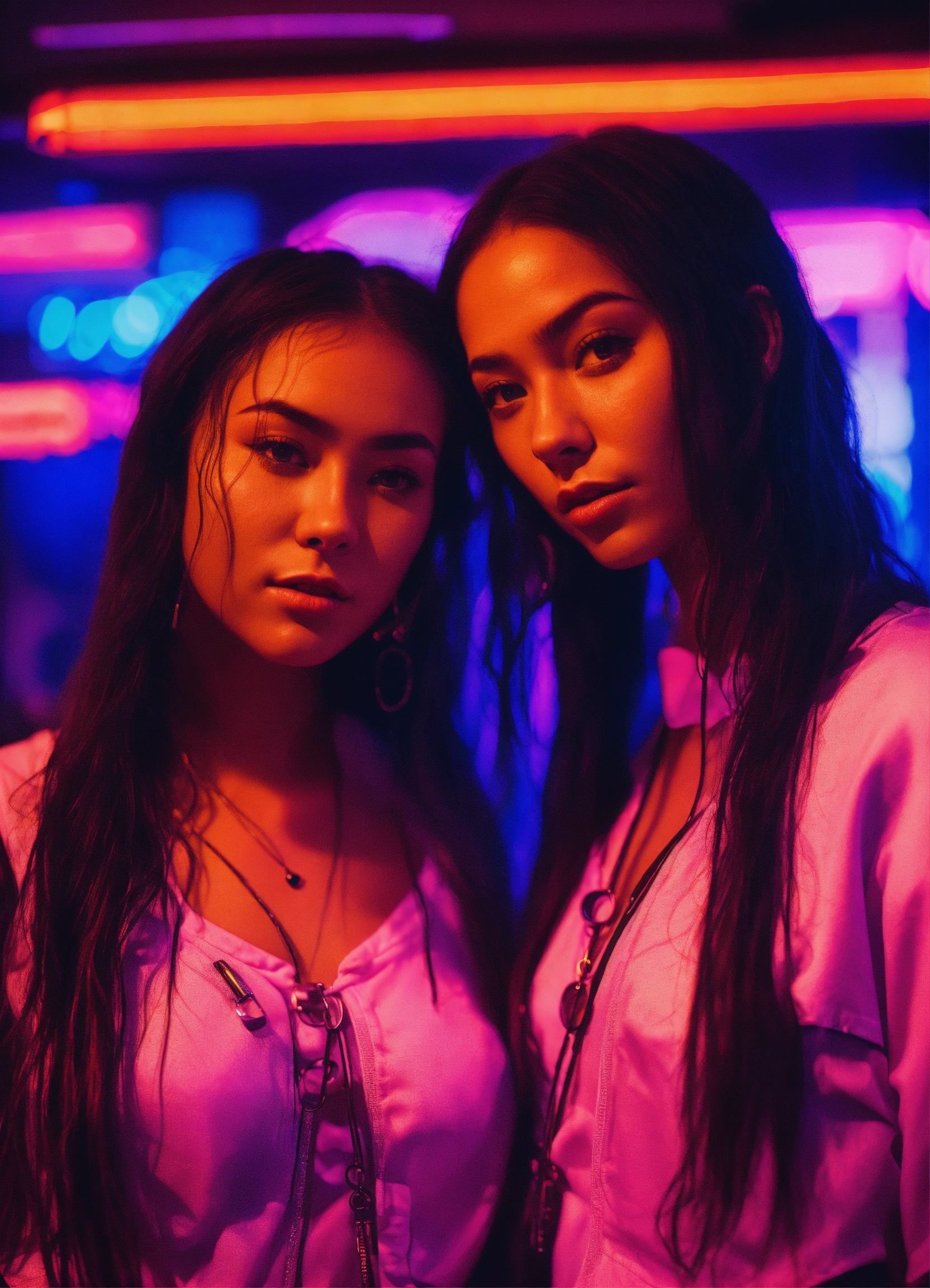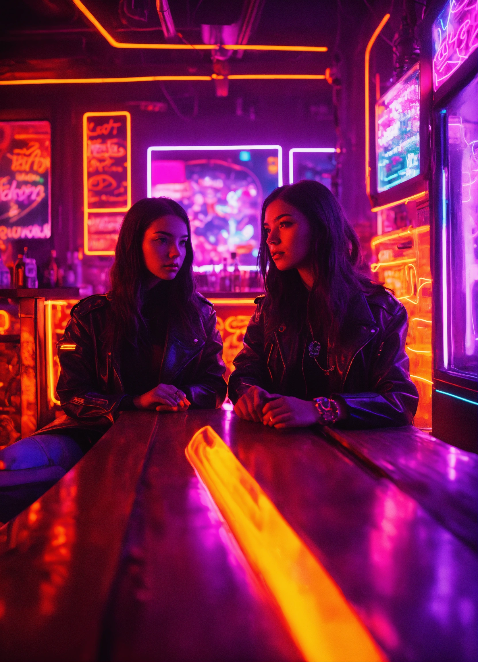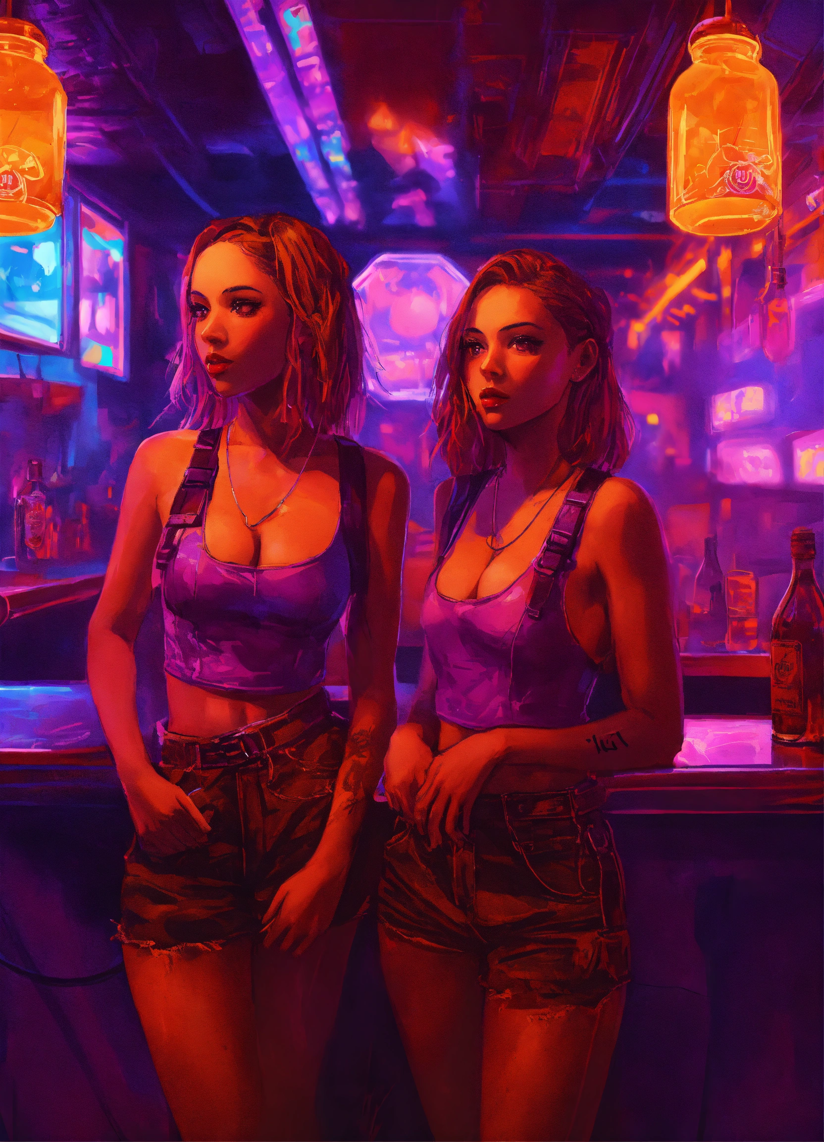 Digital portrait of twin sisters at a cyberpunk purple and orange neon bar