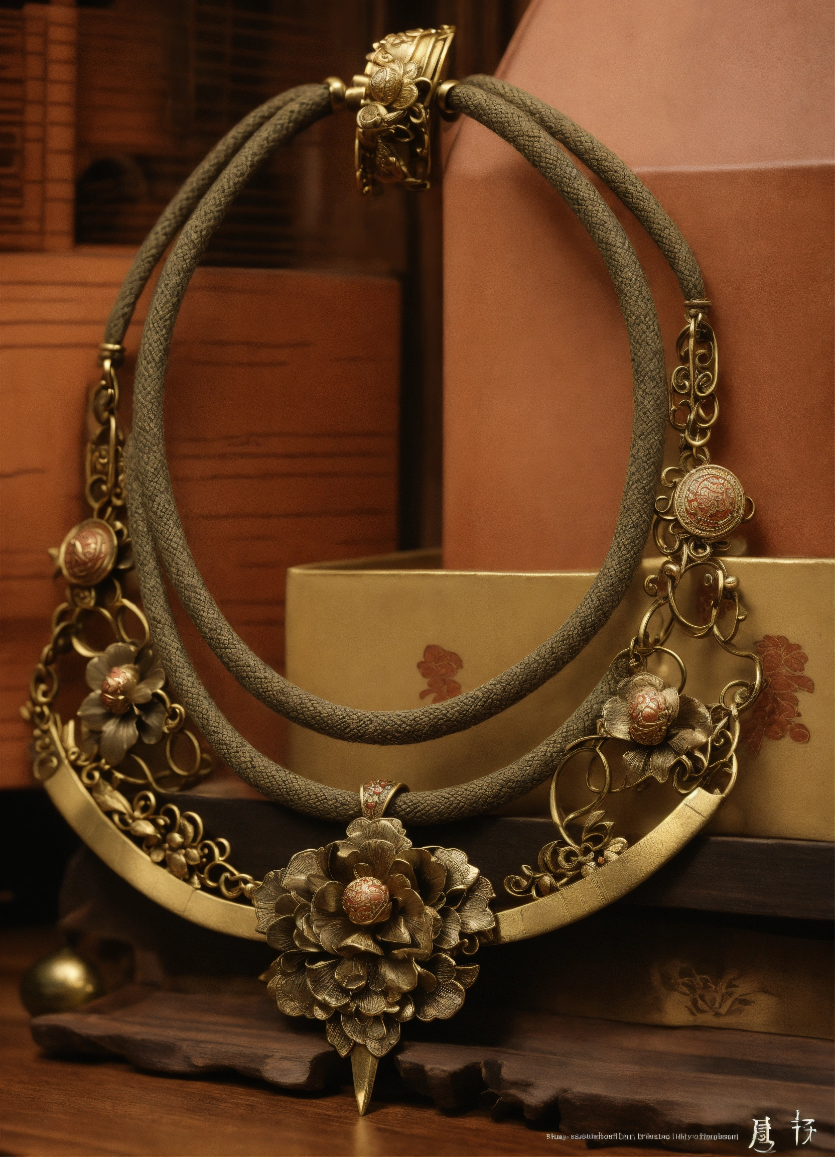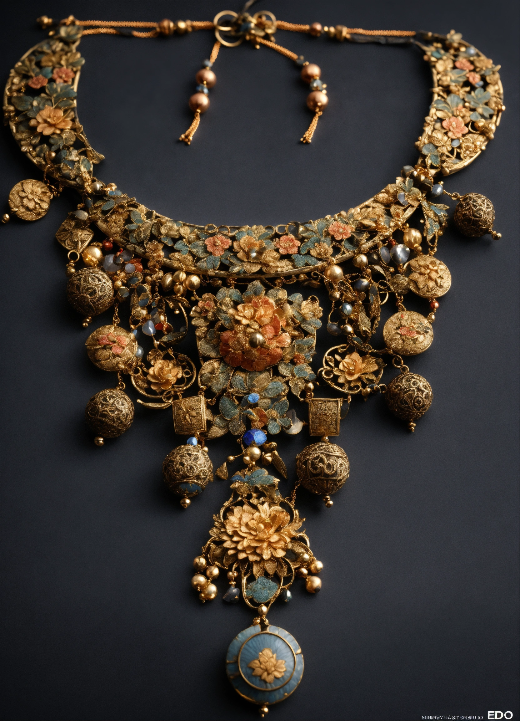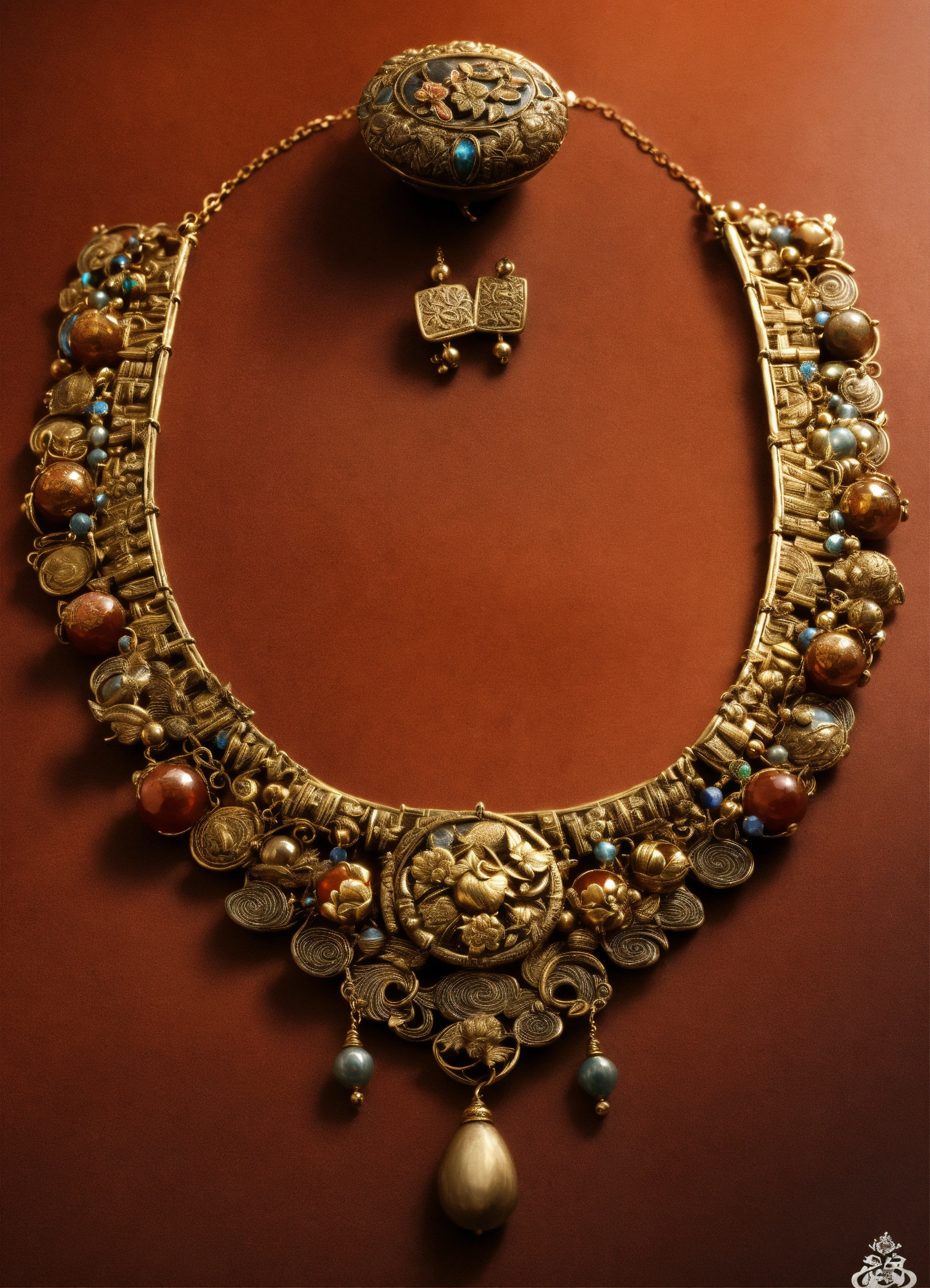 Edo period wrought necklace, ford hallam style, shibuichi, shakudō, sentoku, highly detailed, artstation, concept art, sharp focus