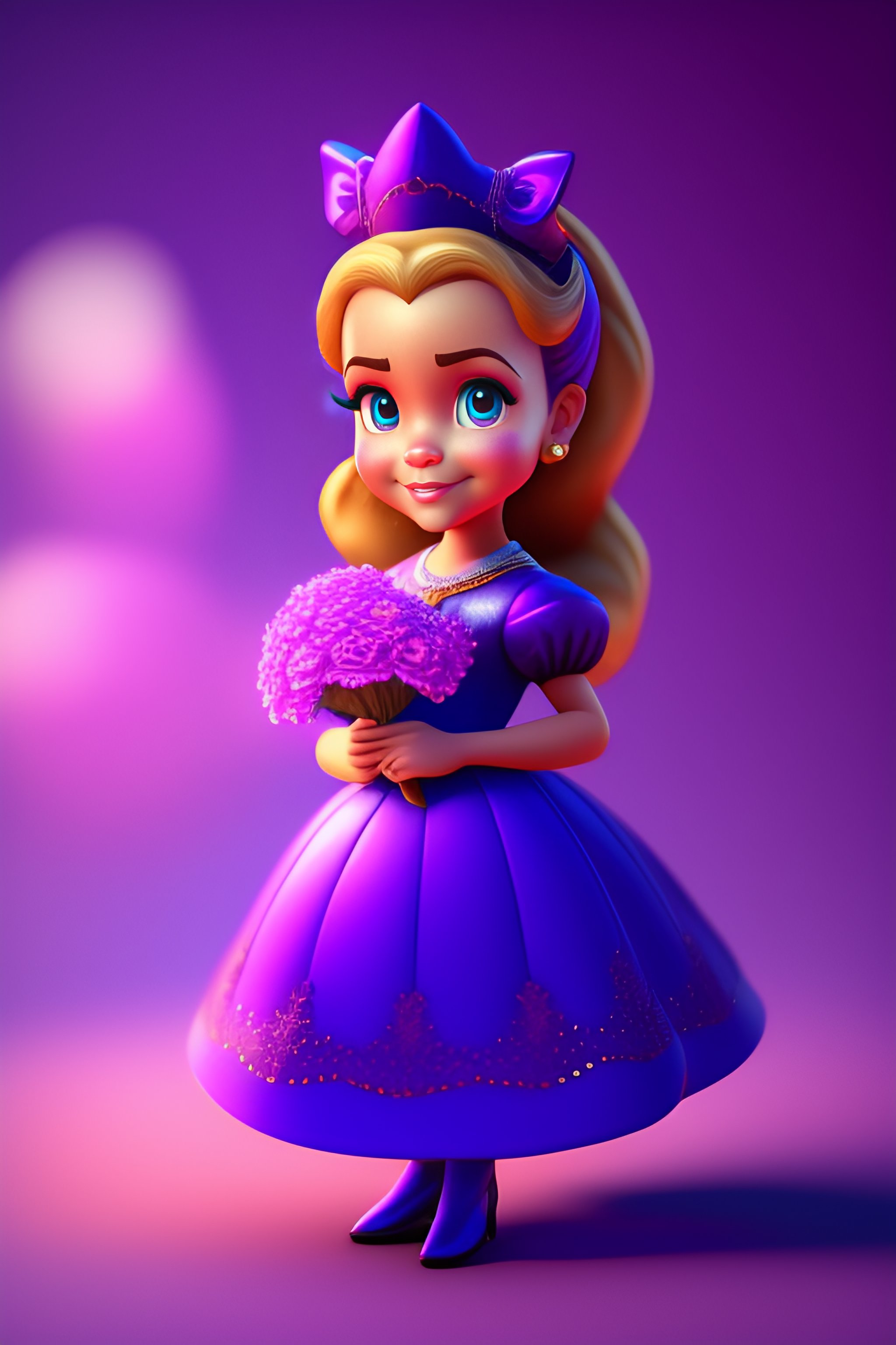 Disney cute and beautiful princess wearing a purple dress and holding a flower, rendered, blender, unrealengine5, cartoon, disney character