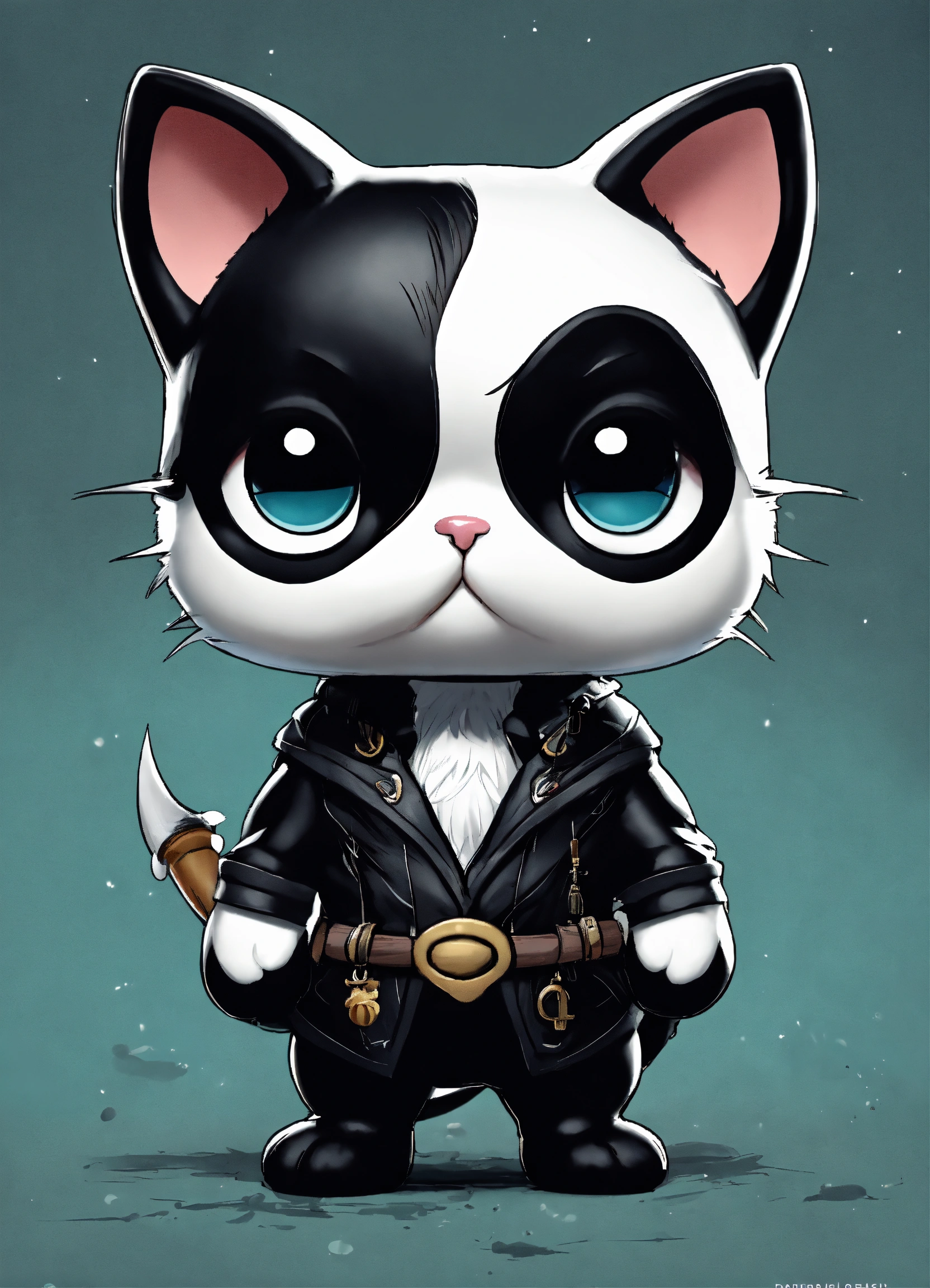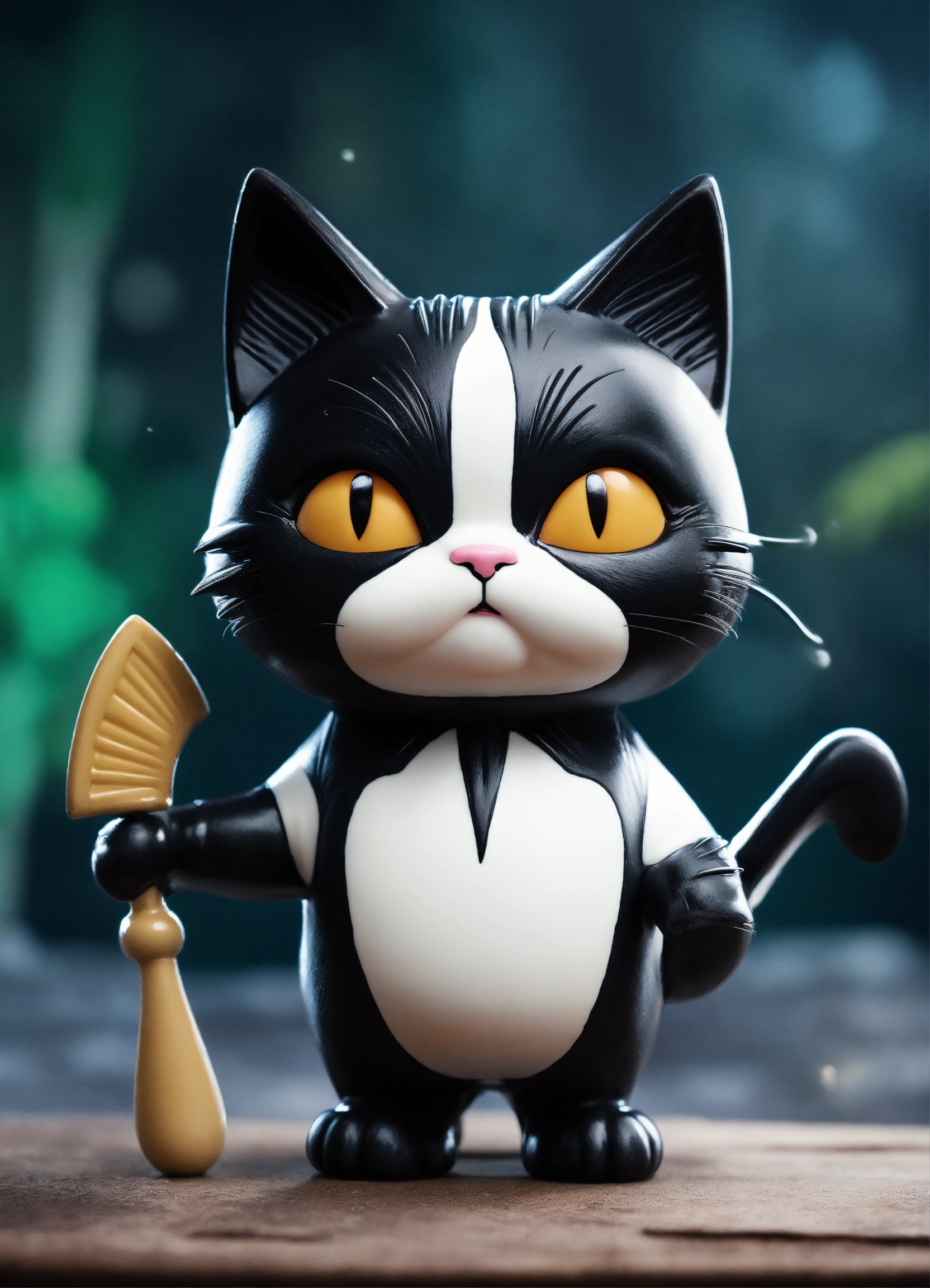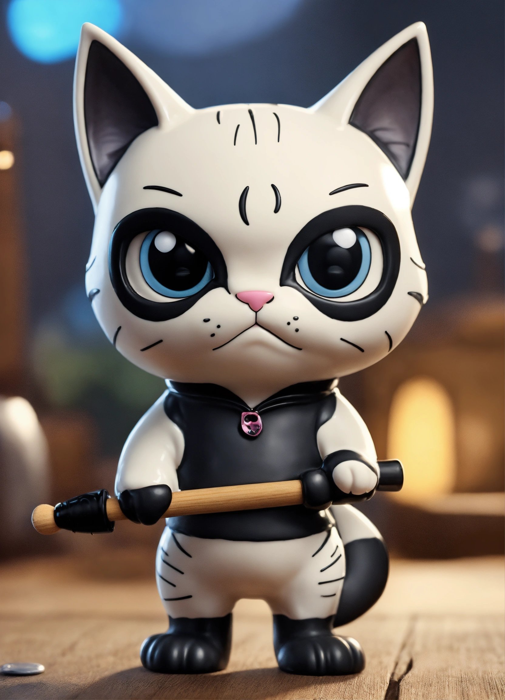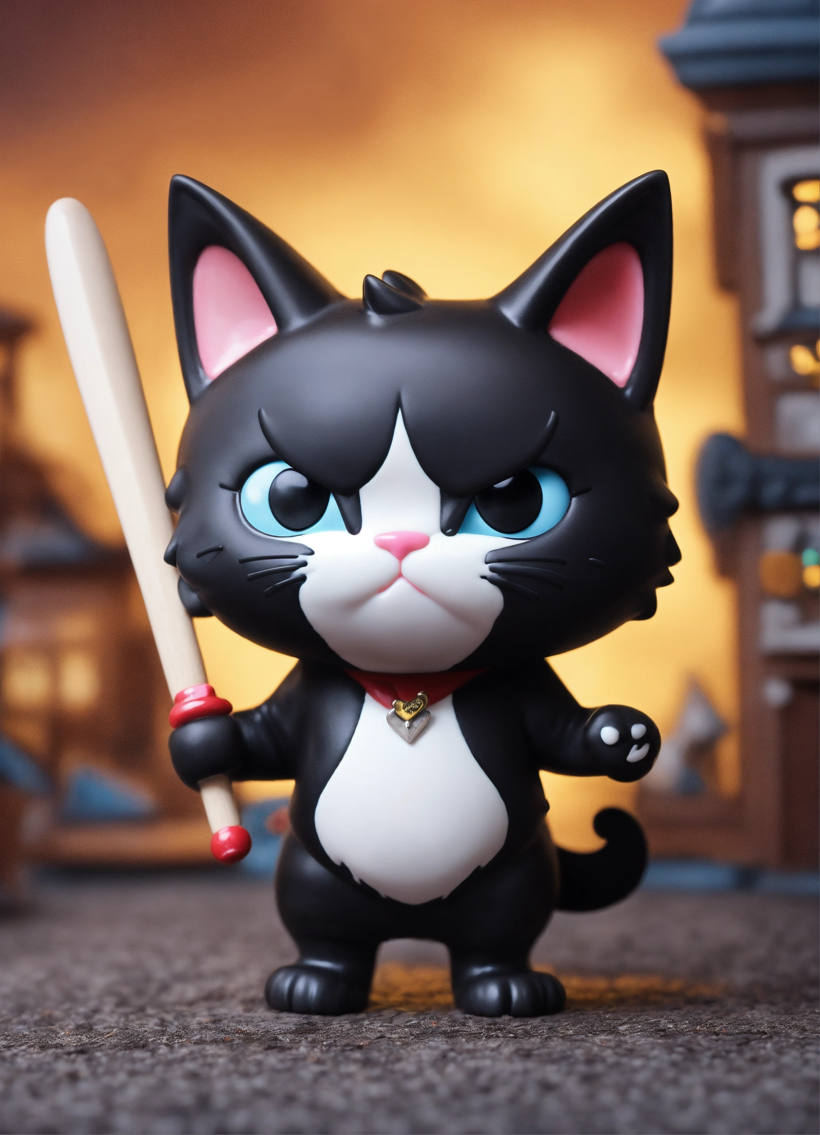Cute and adorable cartoon angry black and white cat, standing up, fantasy, dreamlike, surrealism, super cute, holding a bat, funko pop, casual