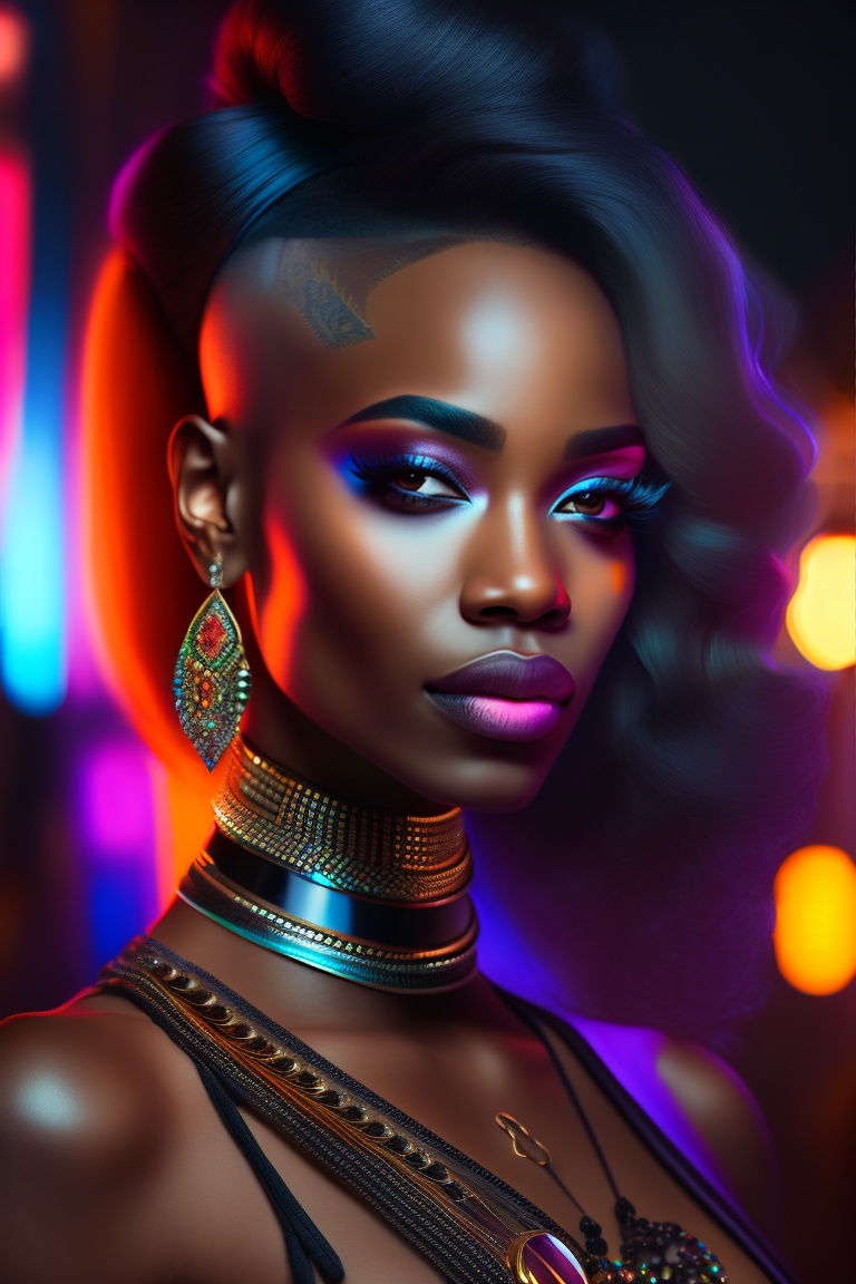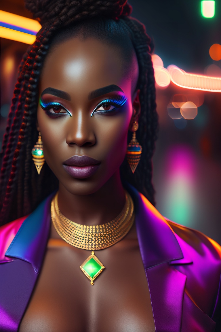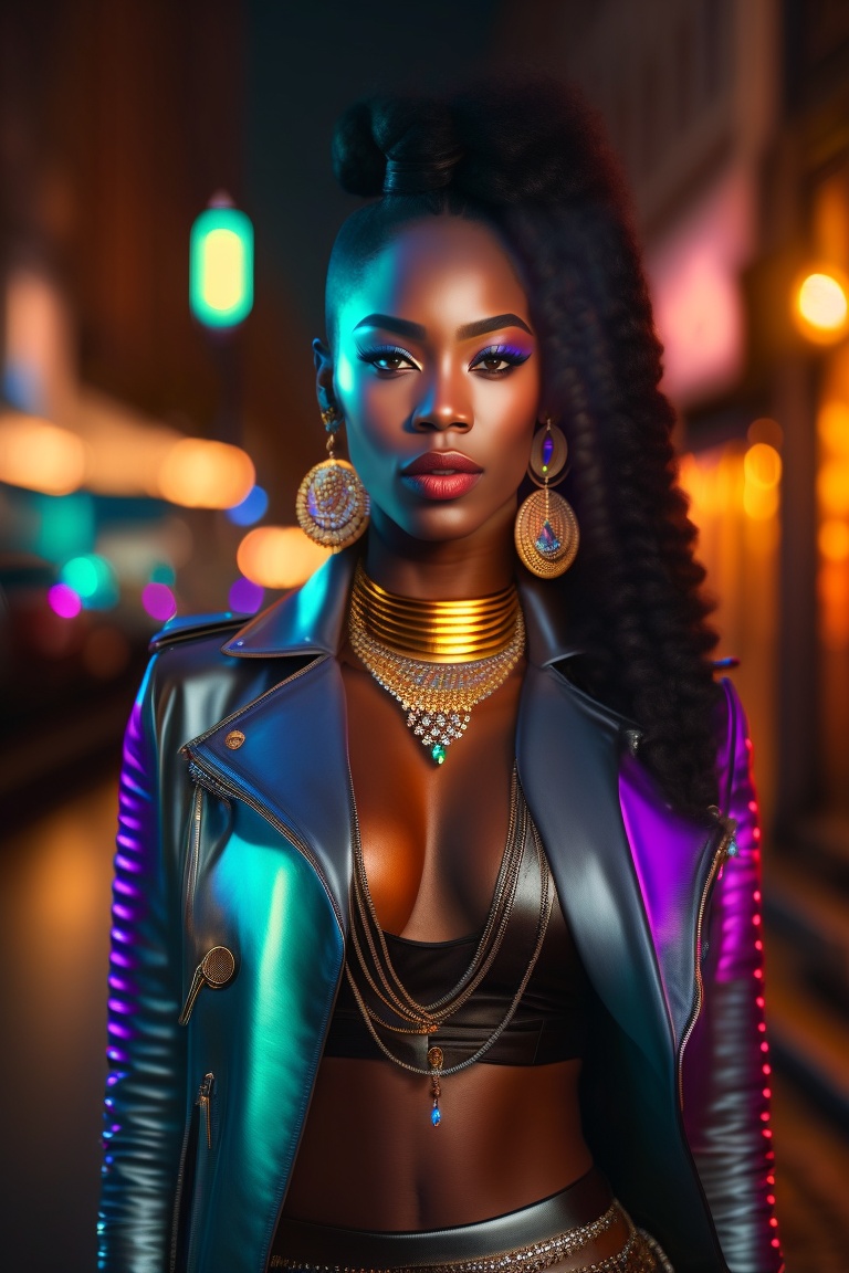 A transgender woman with men traces, wearing heavy makup and a lot of jewelry like a cigana, dark skin and a lot of tattoos. night background with led neon lights street at night dark background, ultrarealistic, 4k, photography