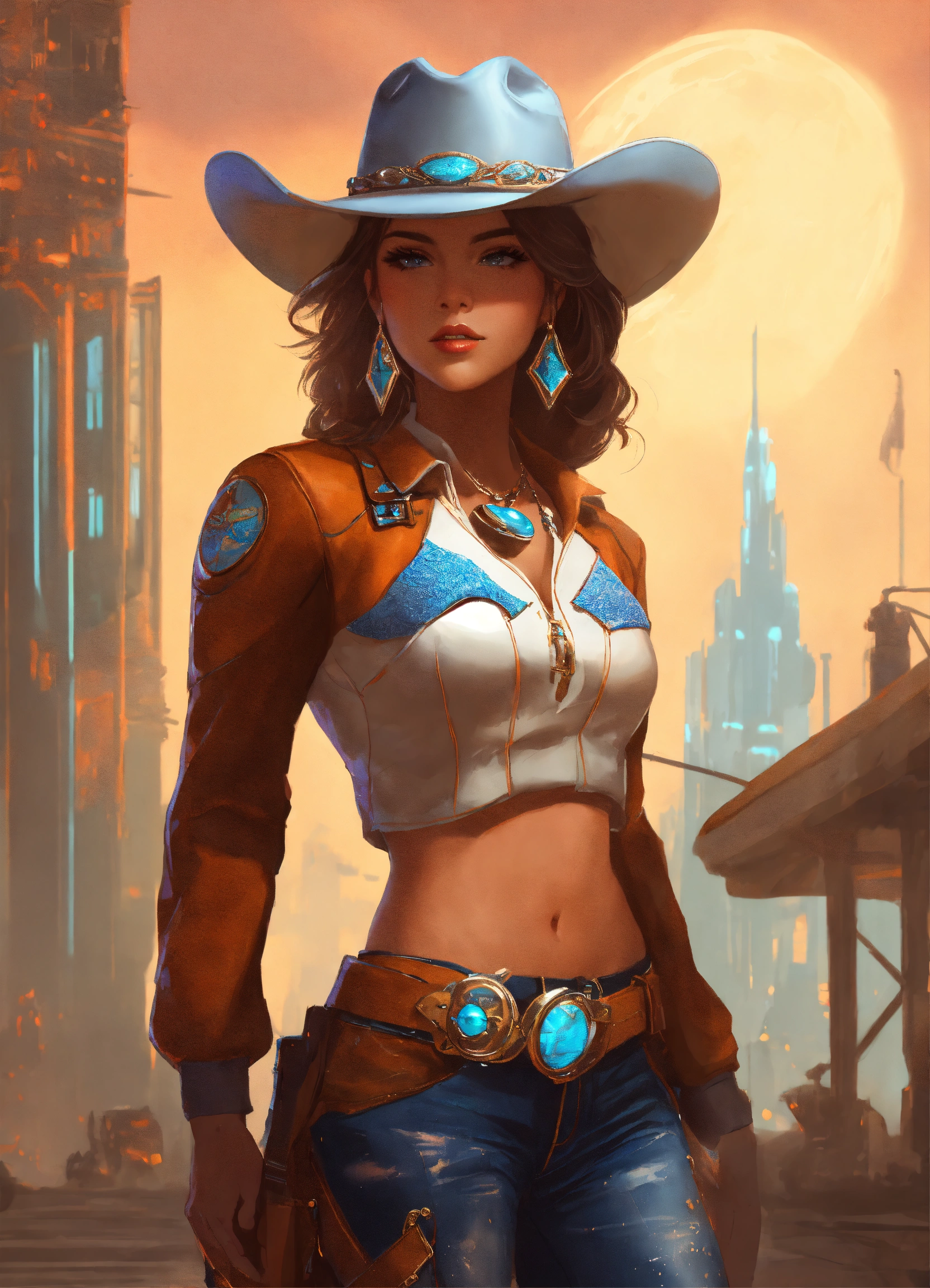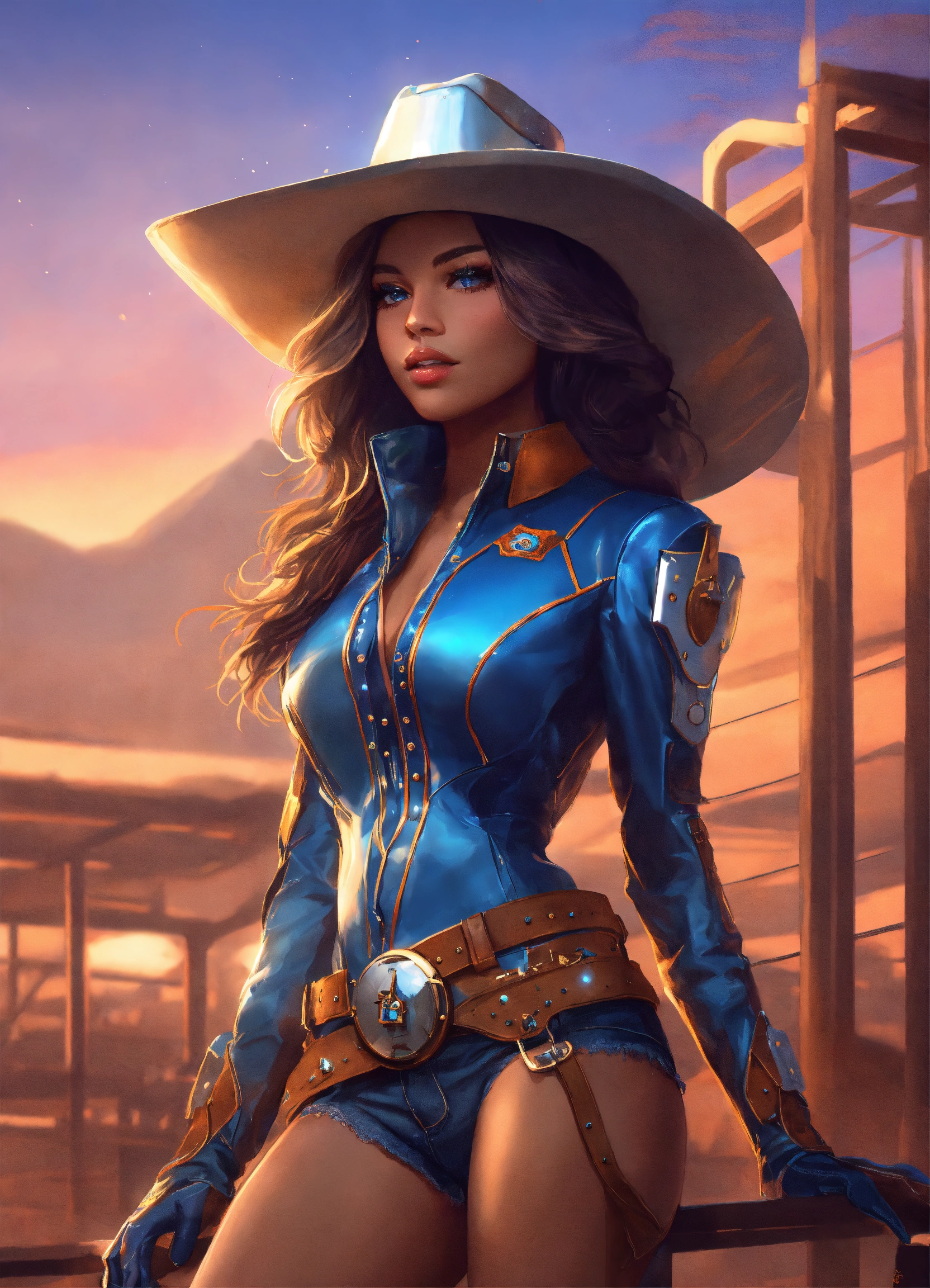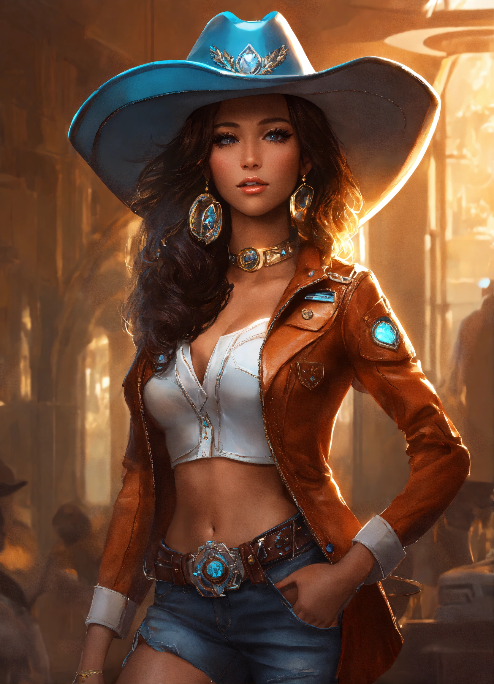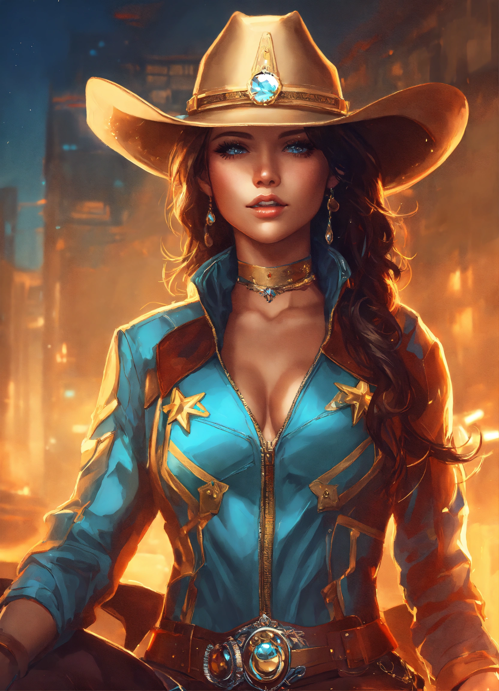A southern beauty queen wearing a futuristic cowgirl outfit and a cowboy hat, digital art, trending on artstation