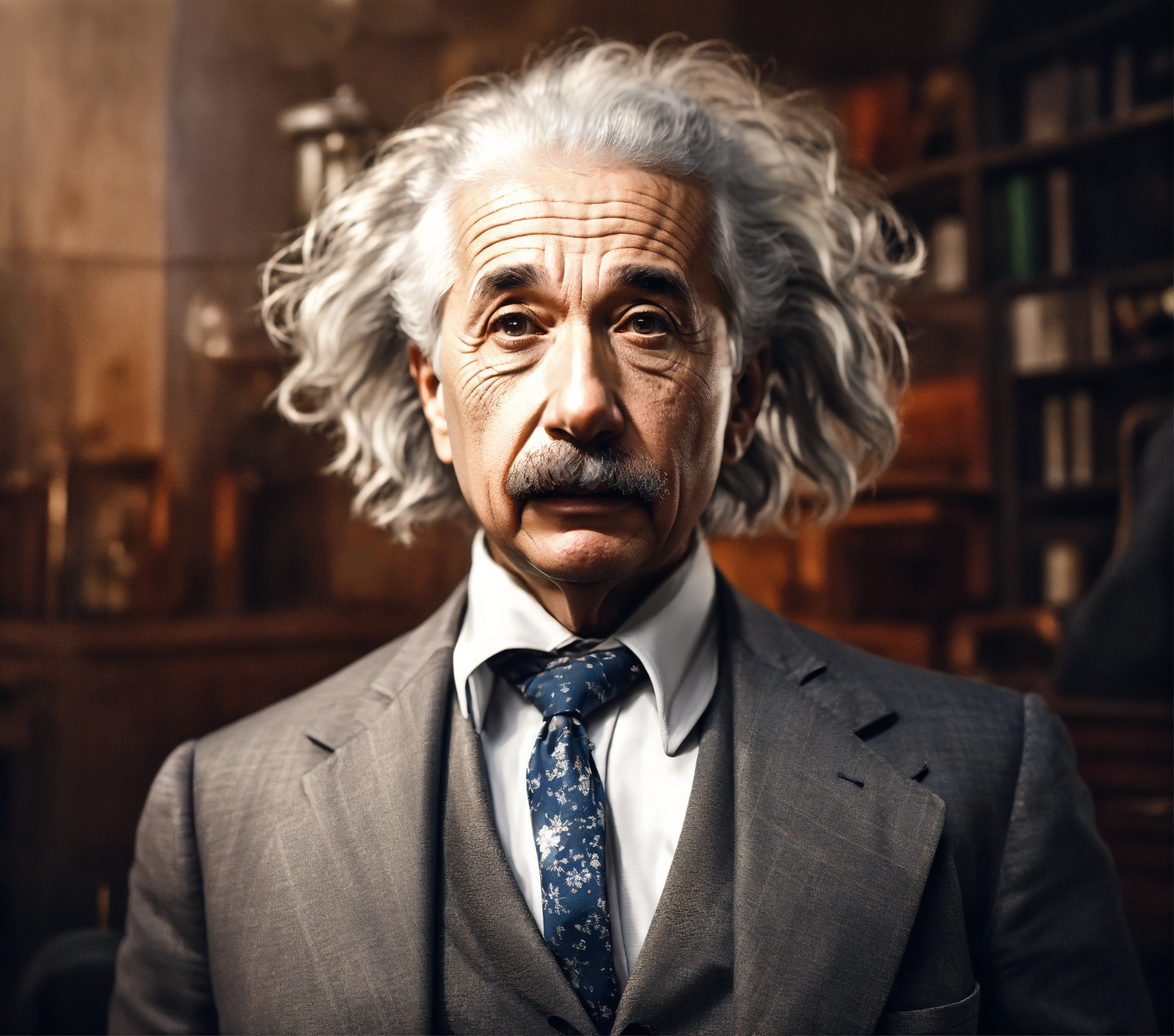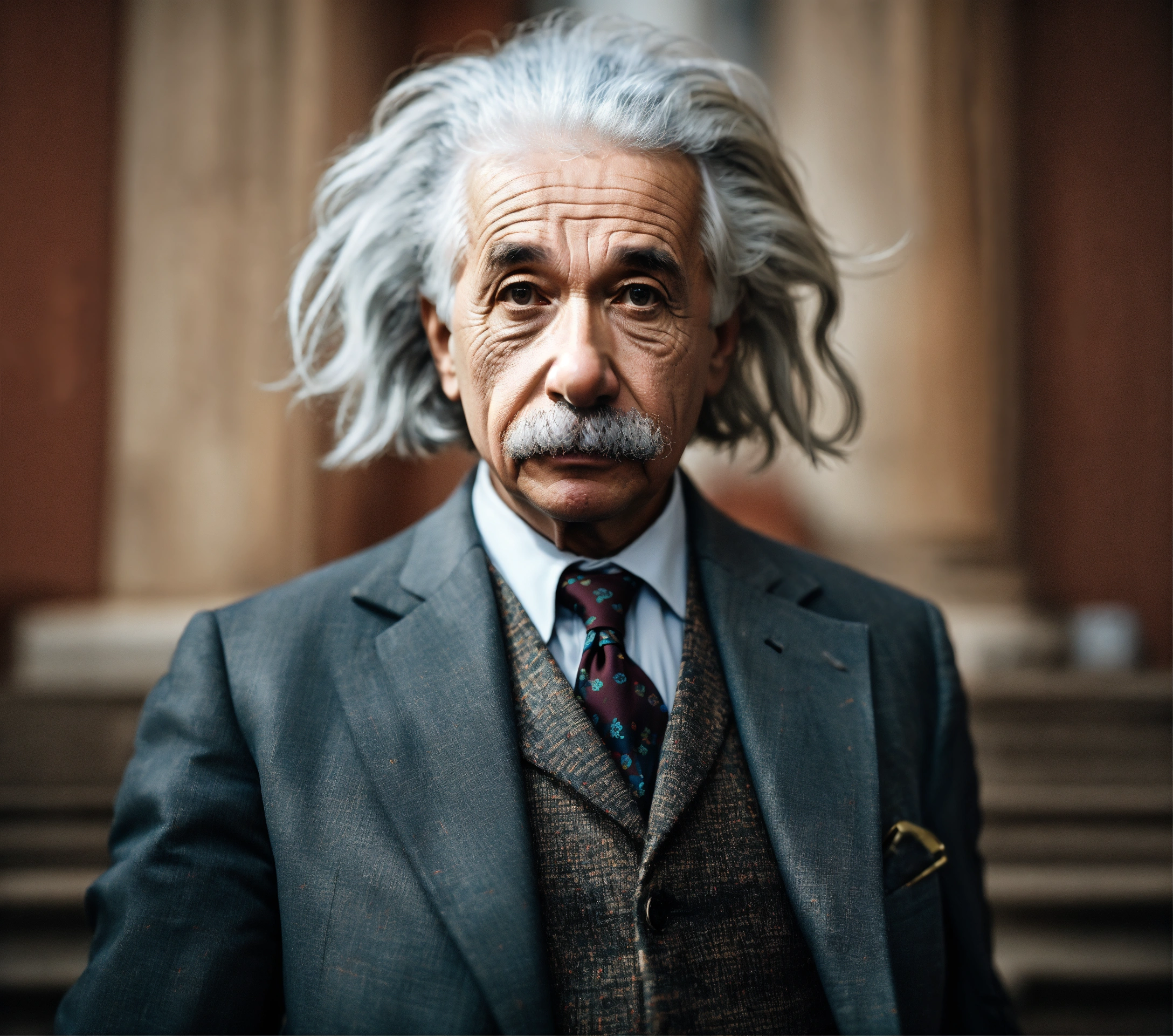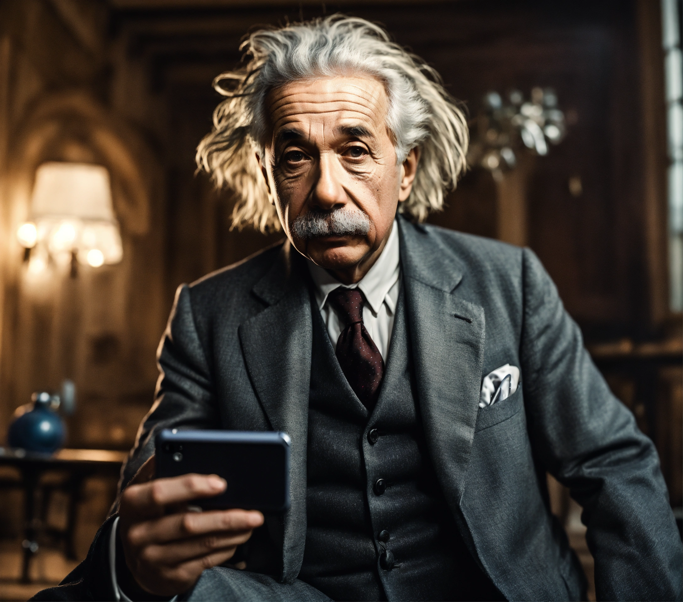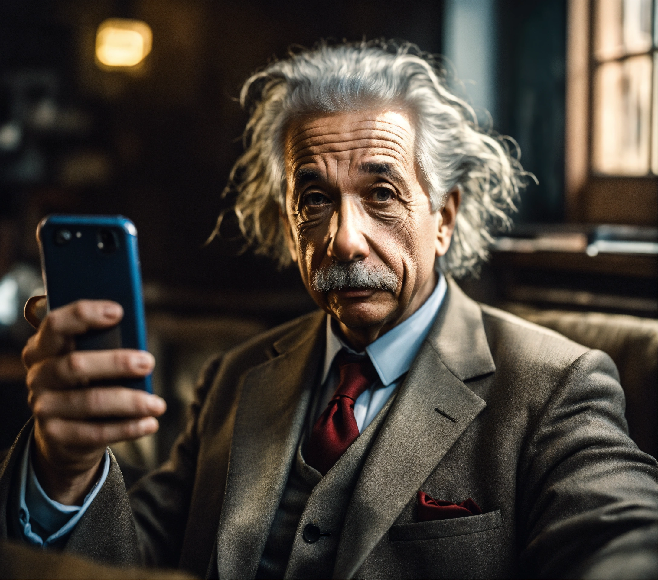 Albert einstein age early 20s wearing a modern suit taking selfie photo from low angle with angry scowl ultra realistic hyper detailed f2, 0 35mm