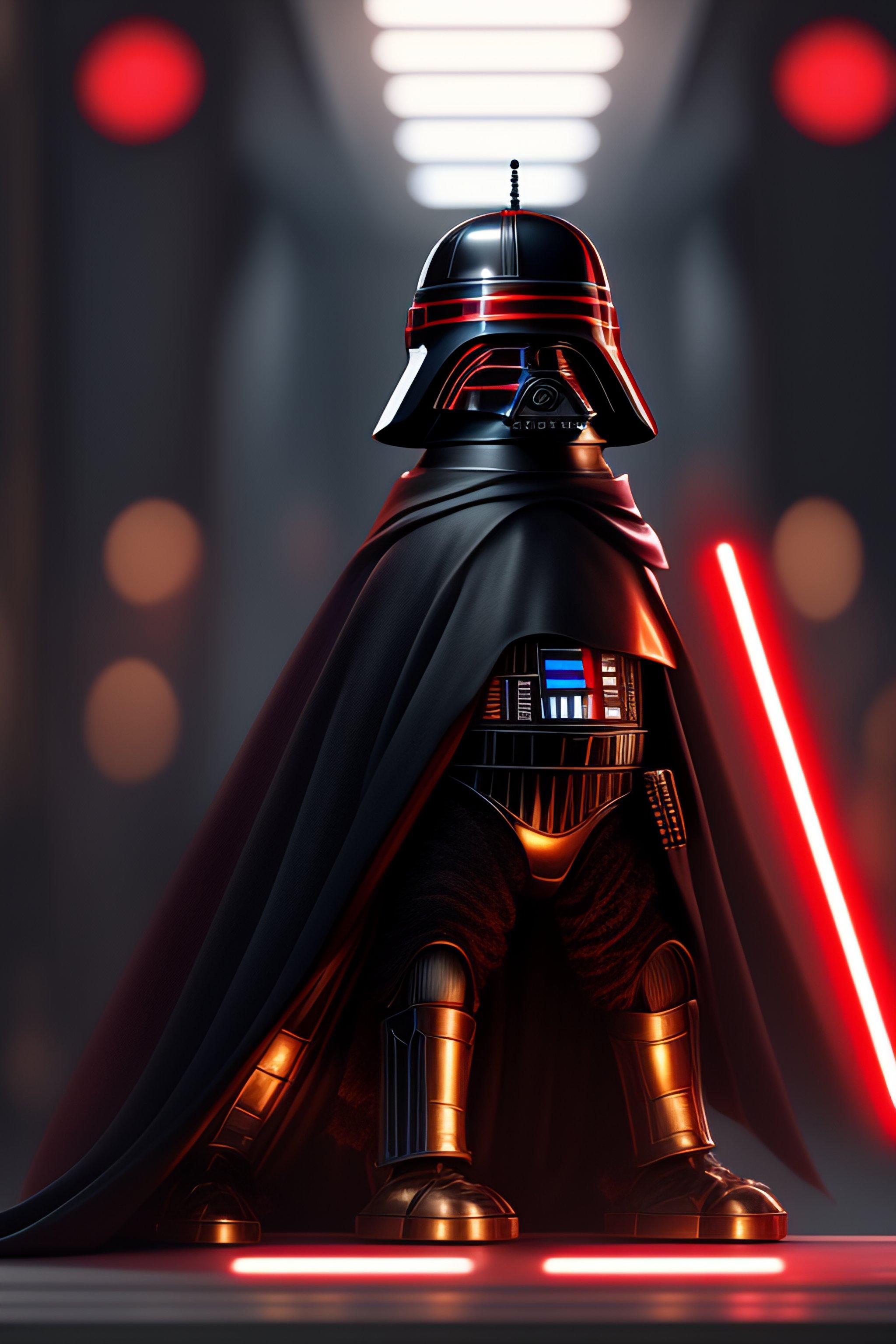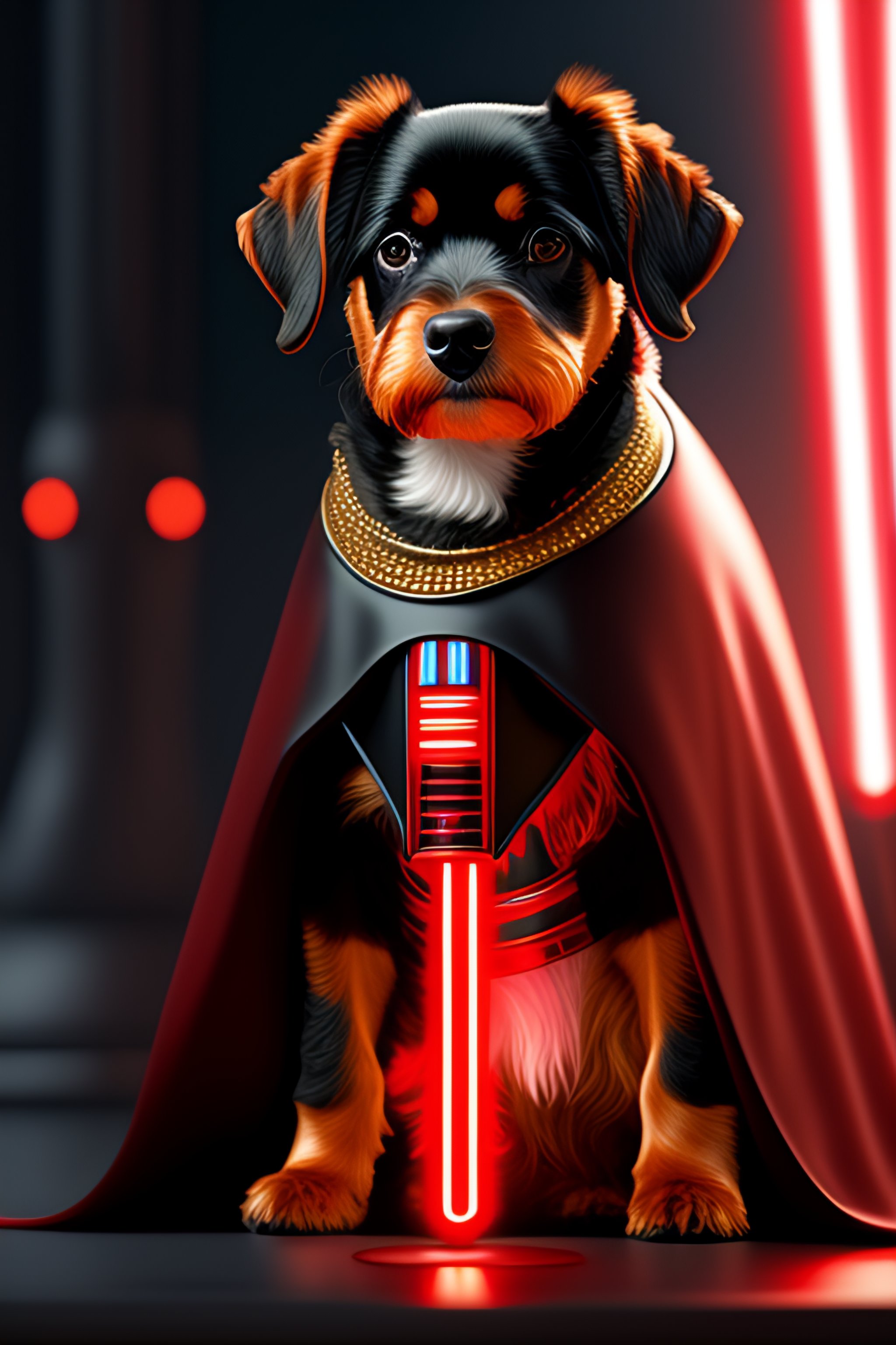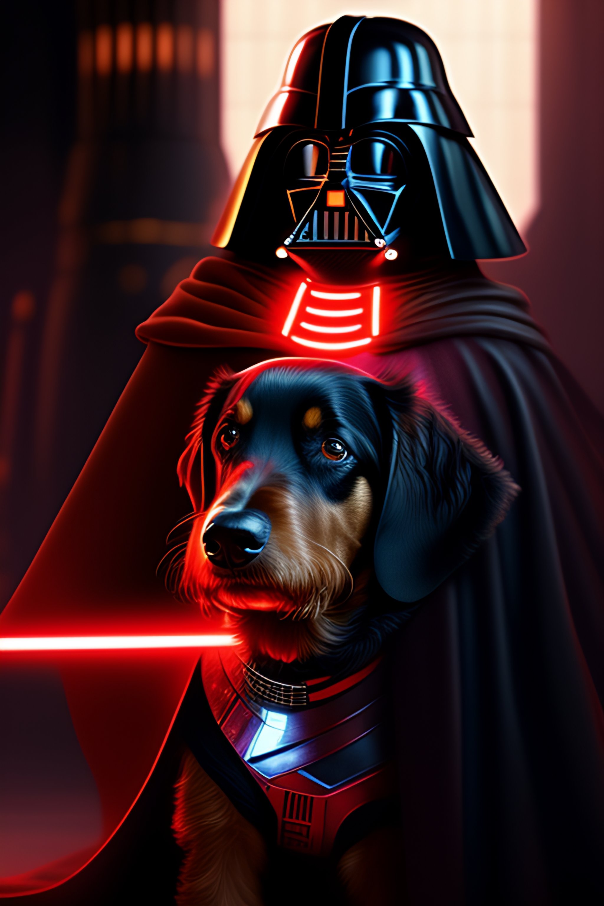 Star wars scene artificial intelligence a teckel dog wearing black sith knight cape holding a red lightsaber in it's paw, showing r2d2 and 3po in background, artstation trends, concept art, highly detailed, intricate, sharp focus, digital art, 8 k