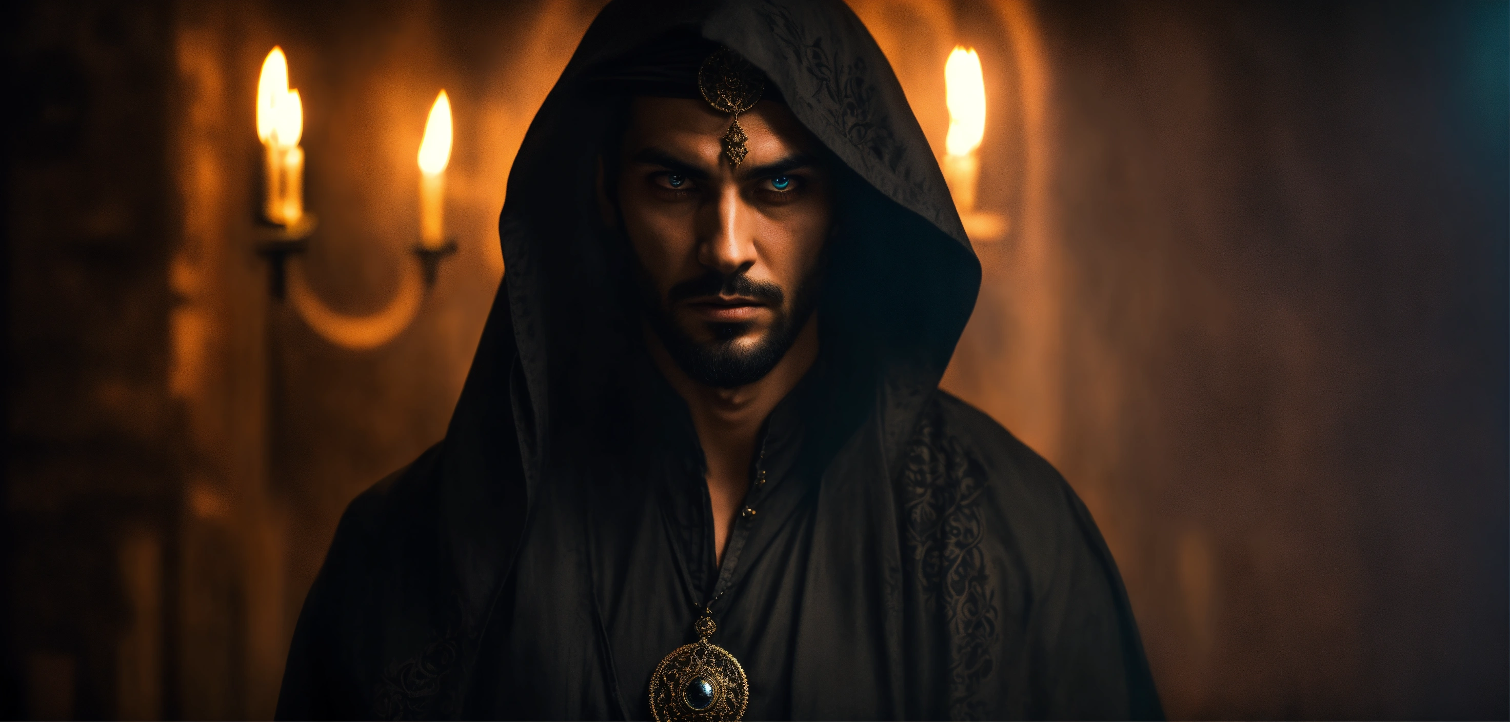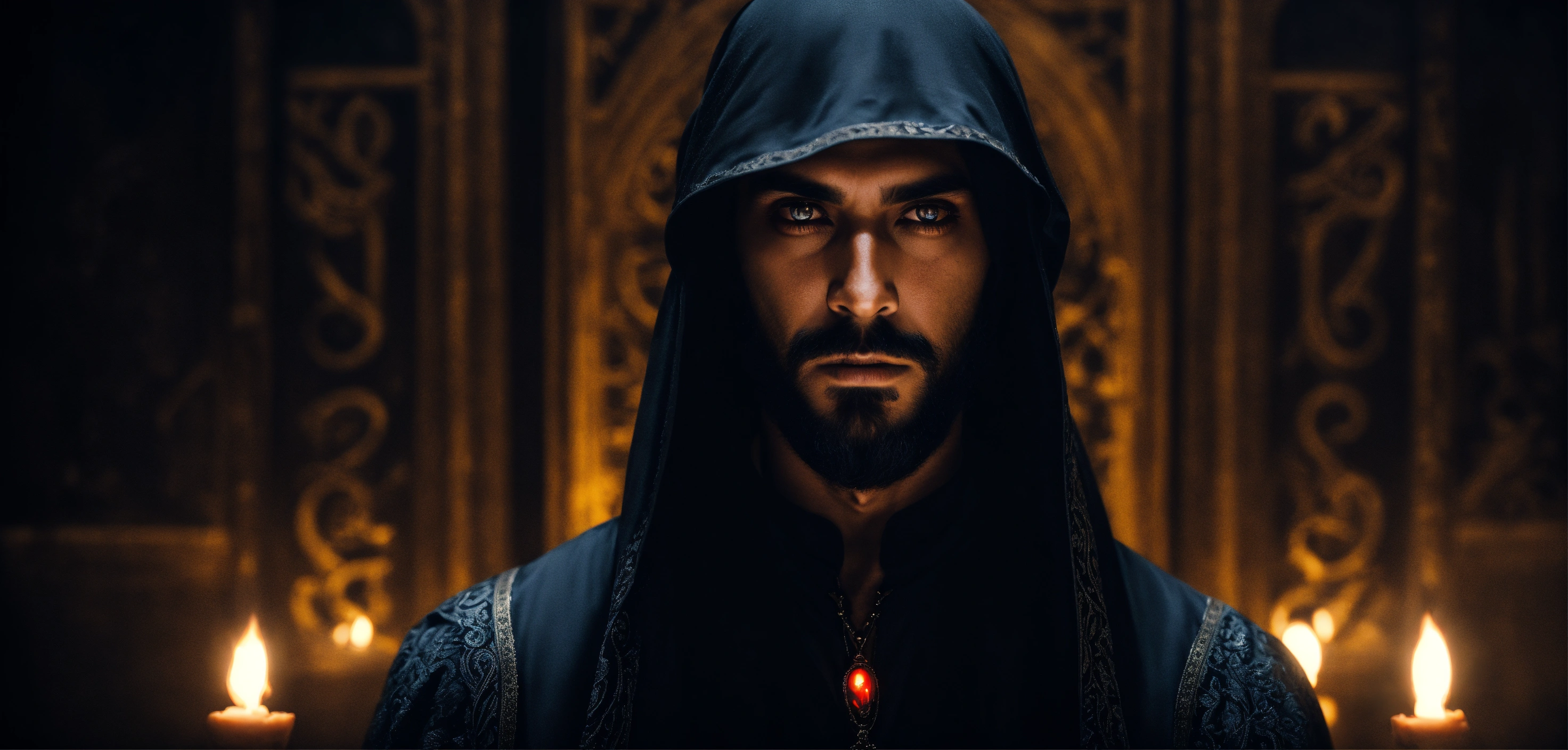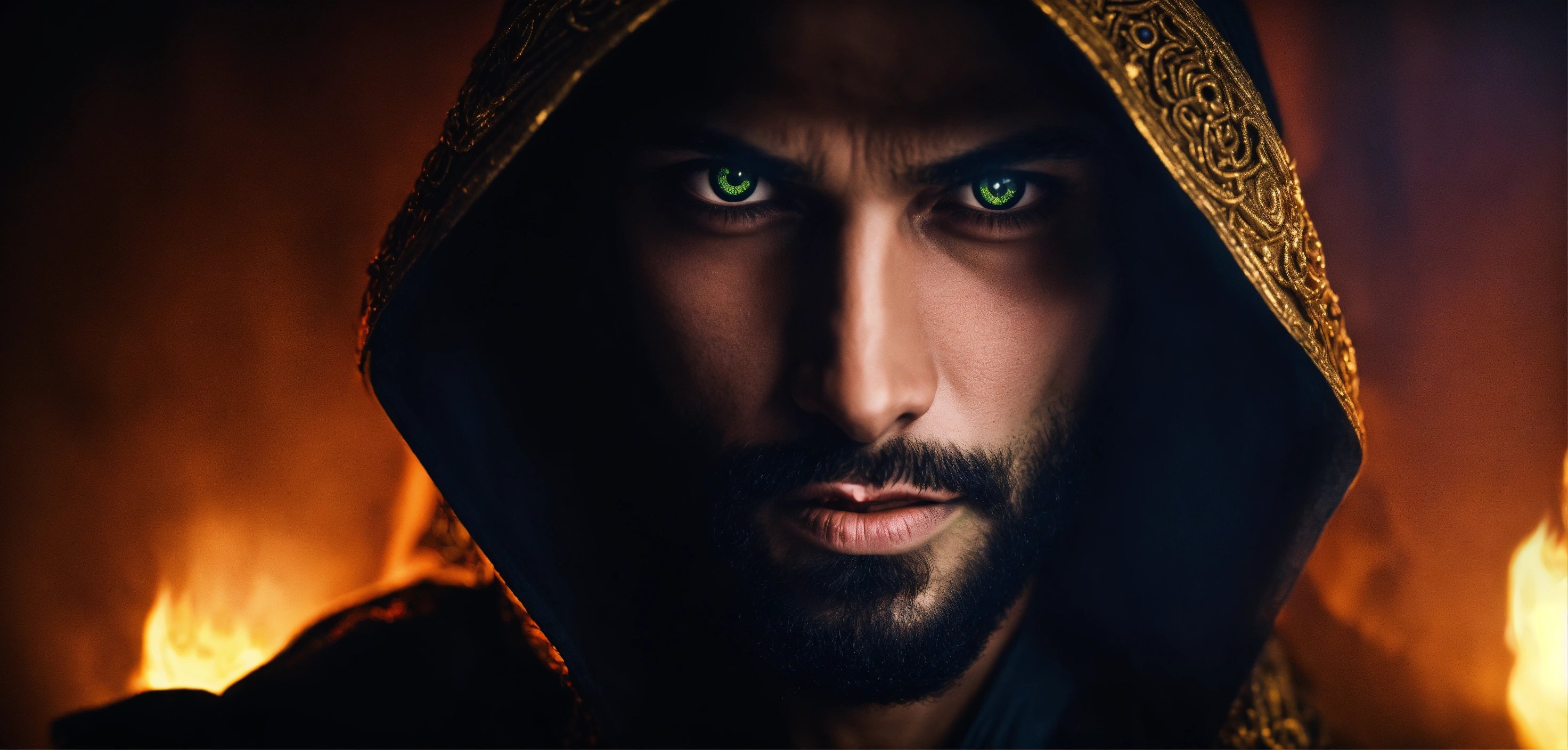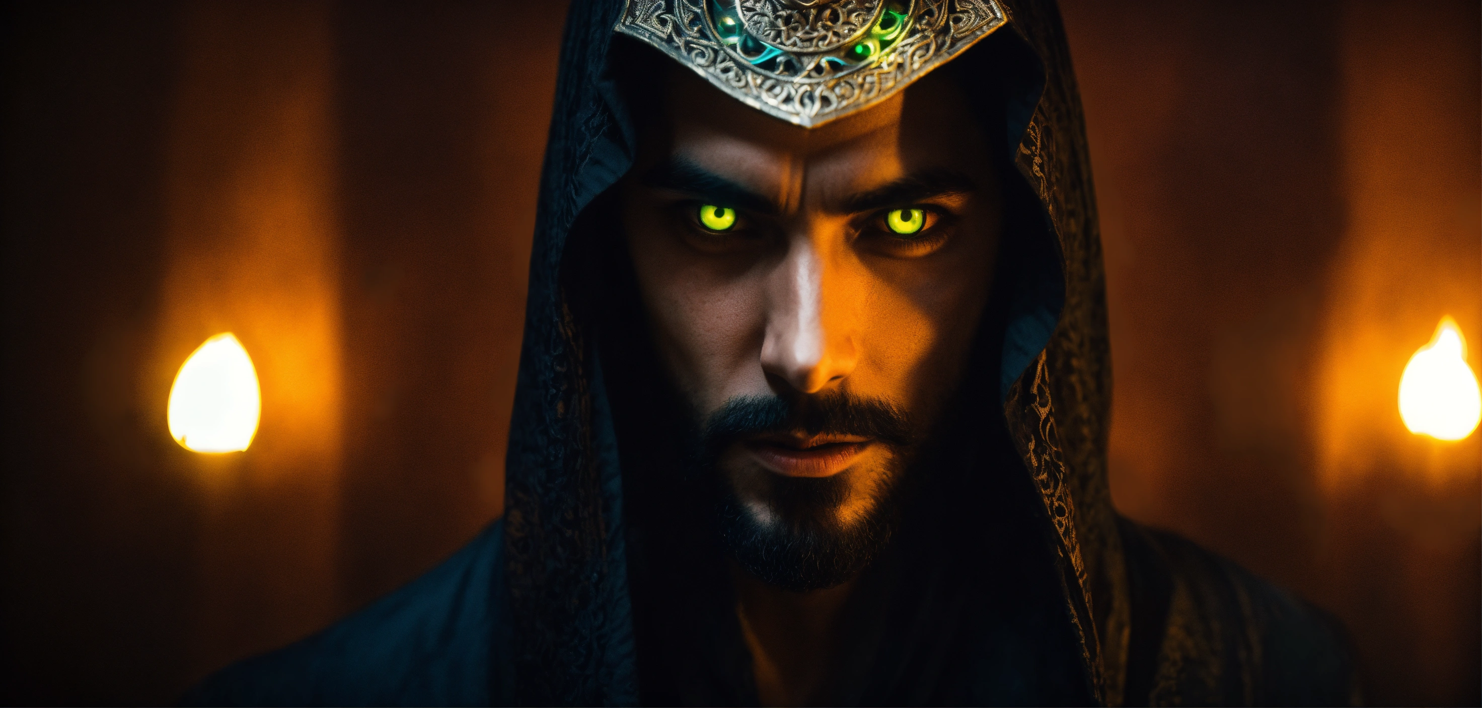 Dark, mysterious and dramatic headshot of a handsome arabic wicked sorcerer with glowing hypnotic eyes, dark magic, sinister aura.