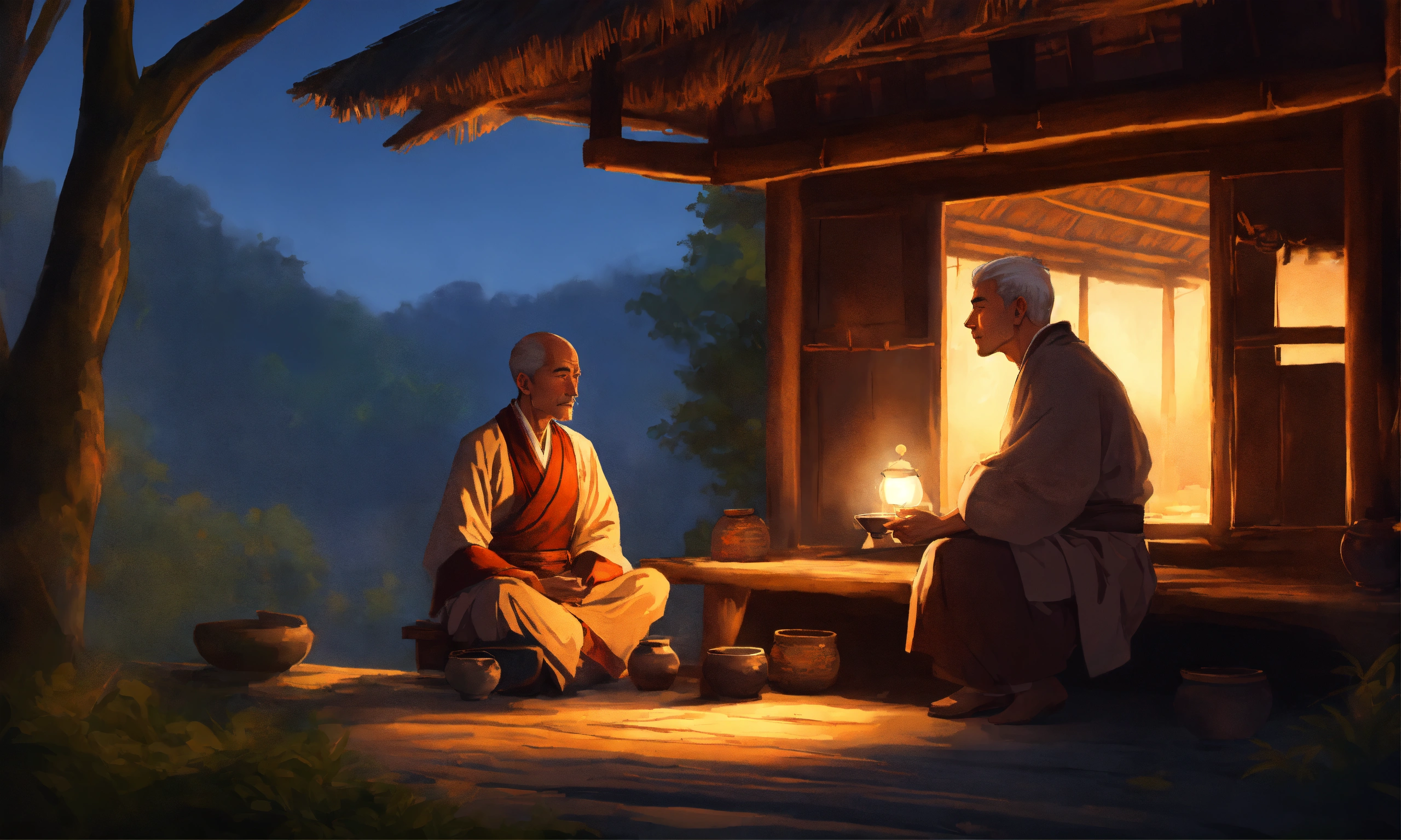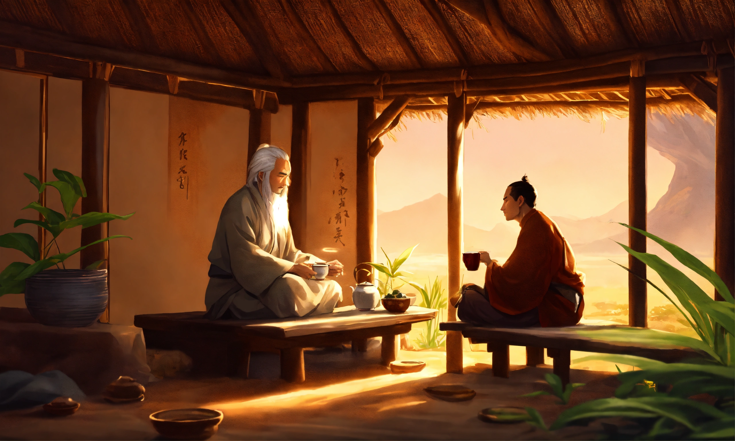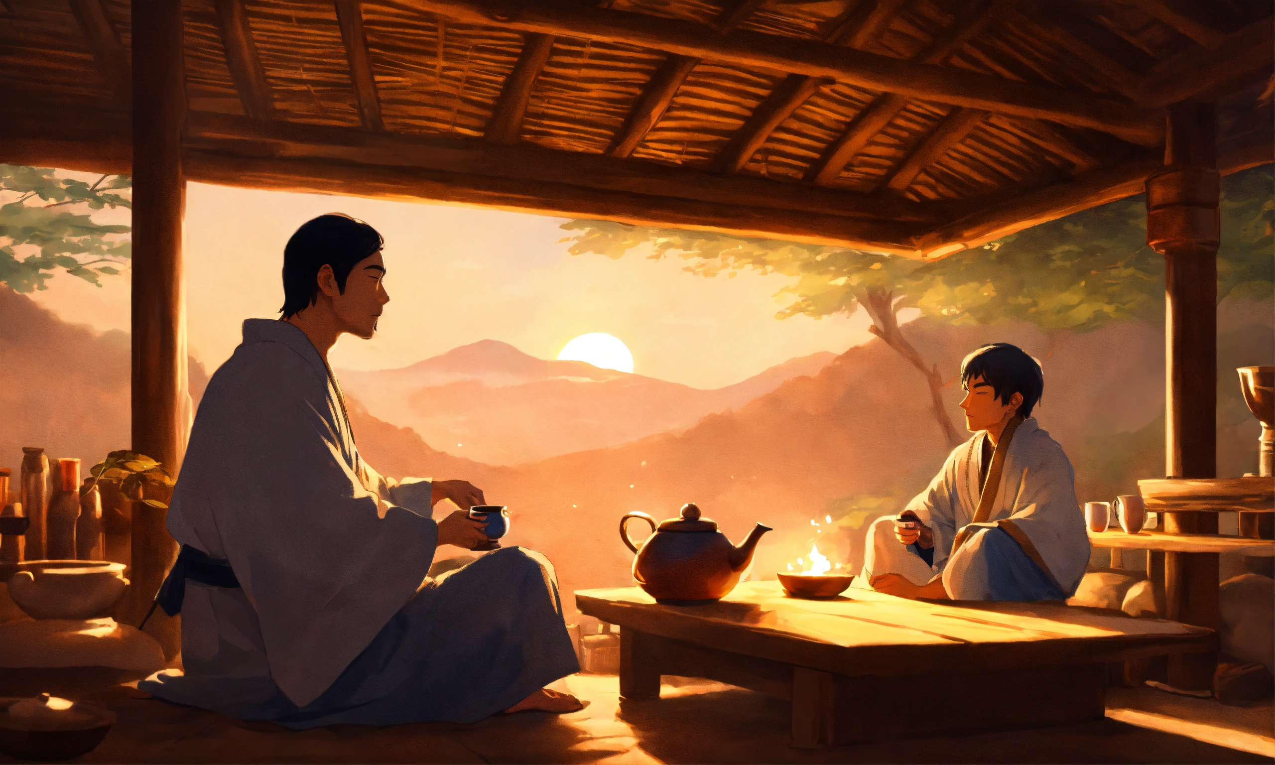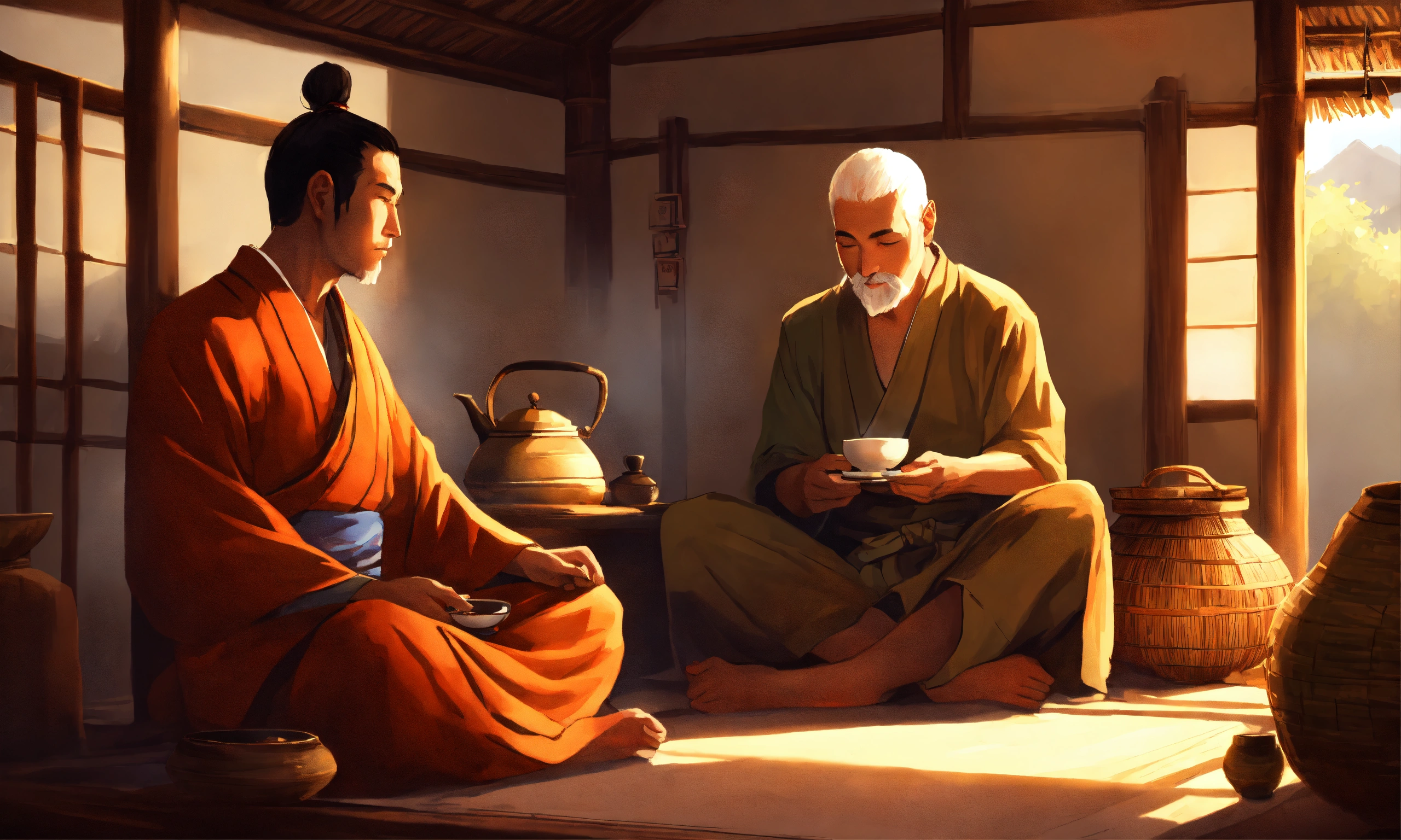 A zen master and a young man sitting in a hut drinking tea, in the style of illustrator donald zolan, 8k