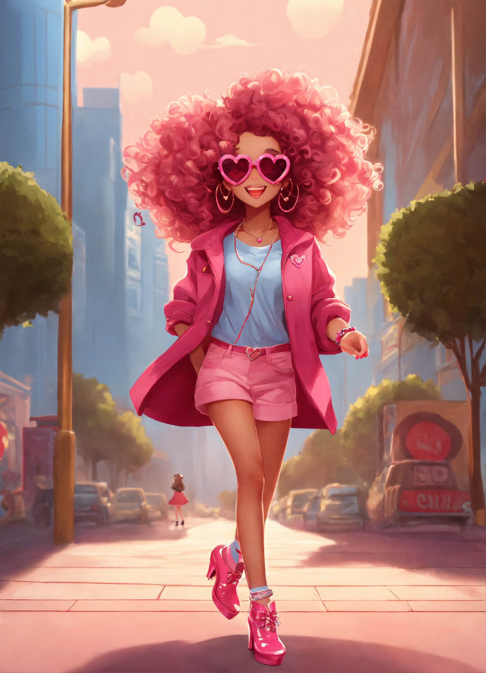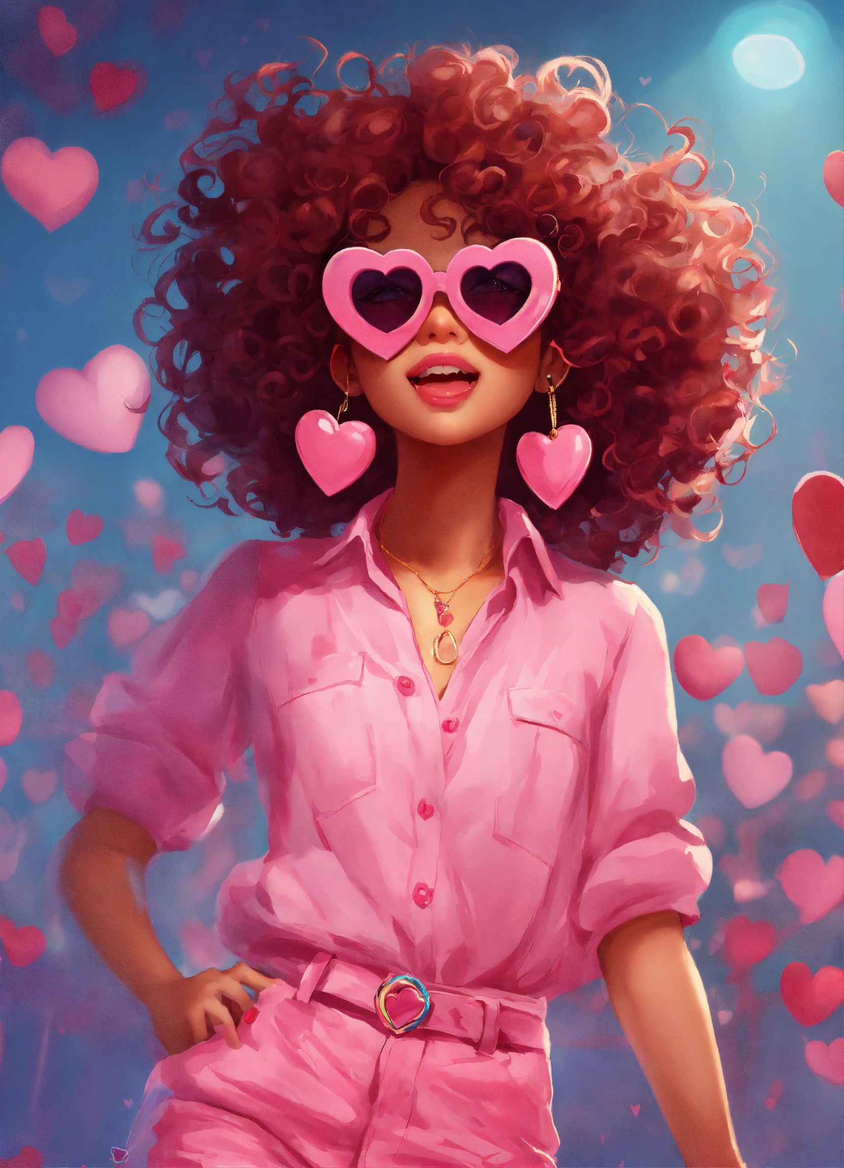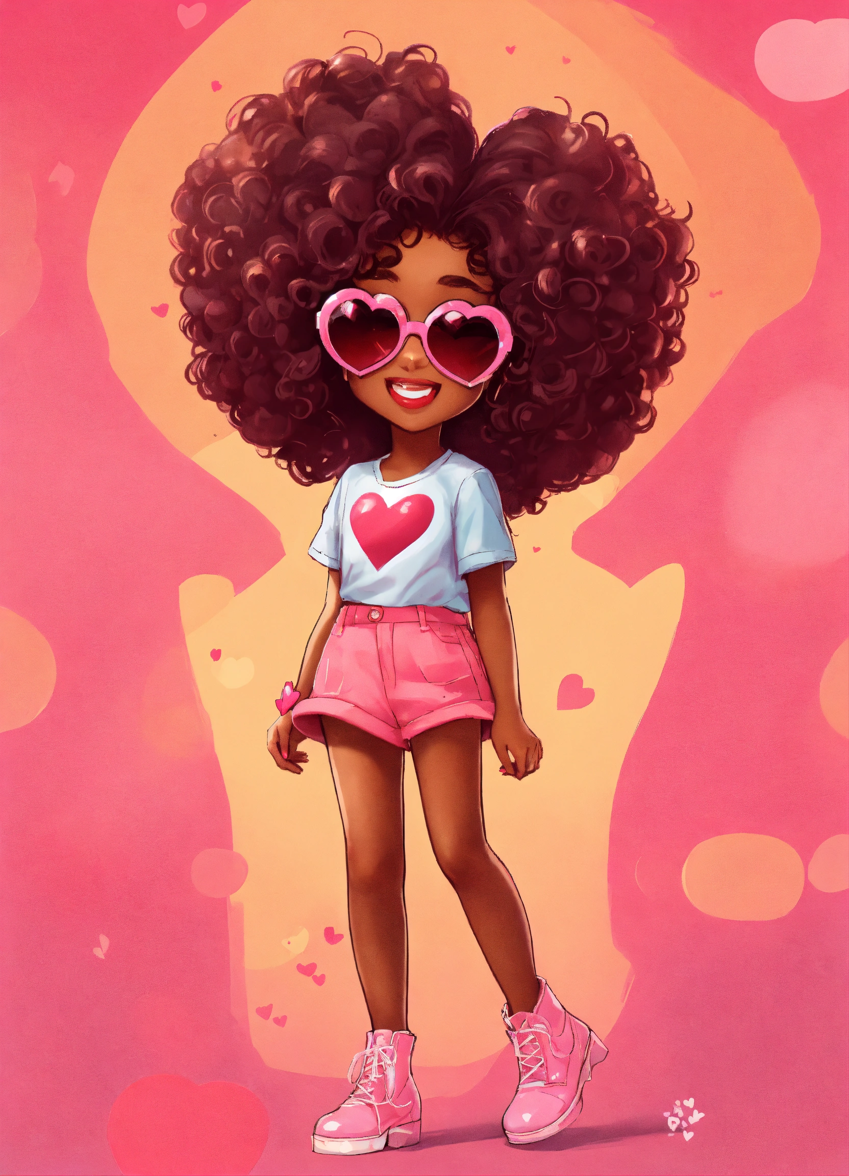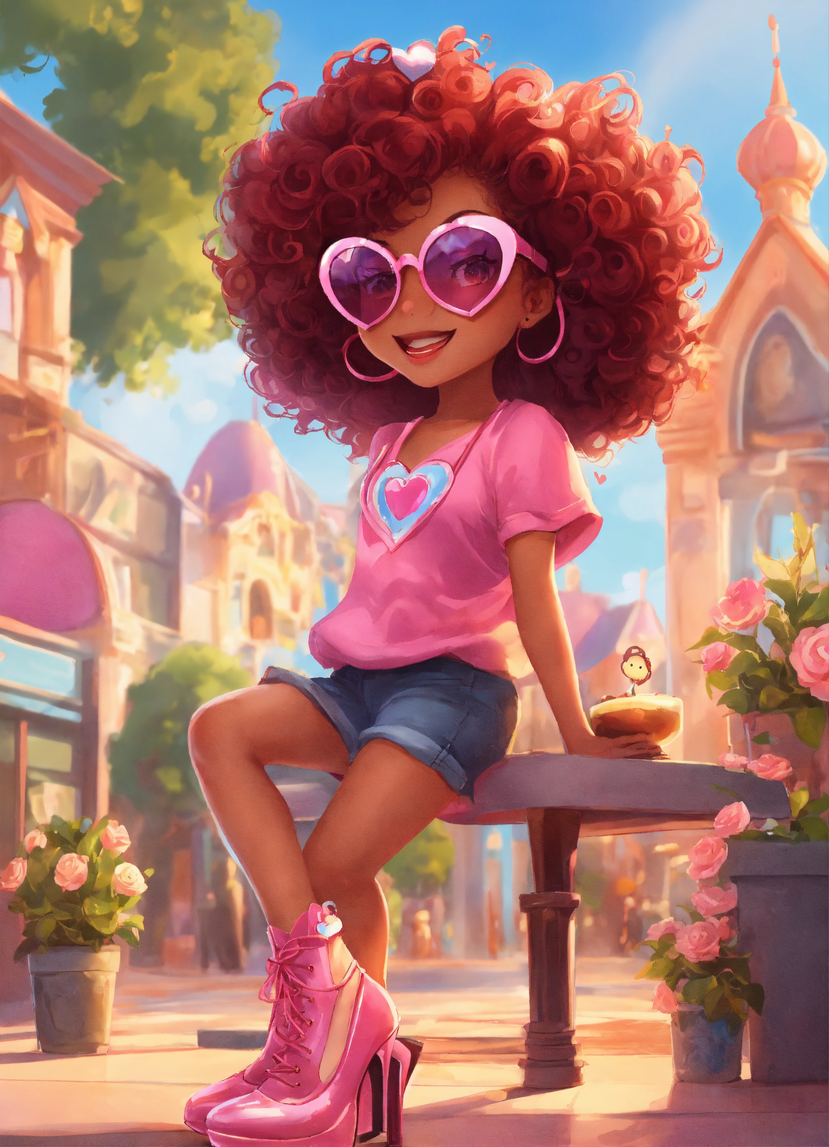 "imagine a cute cartoon character girl with curly hair, wearing heart-shaped sunglasses and pink heels, exuding a fun and confident vibe."