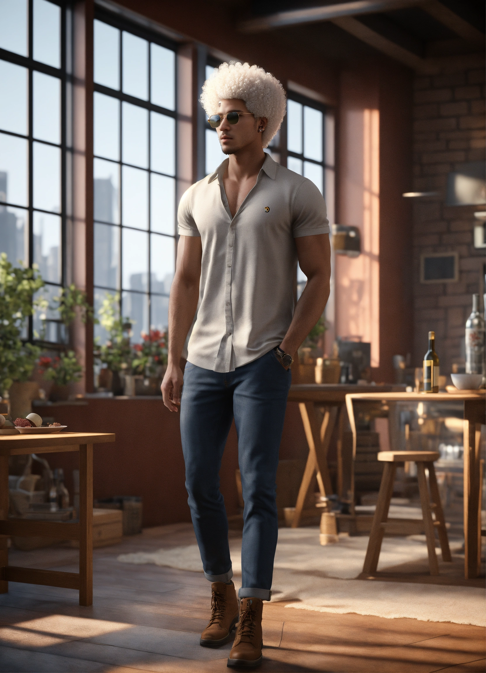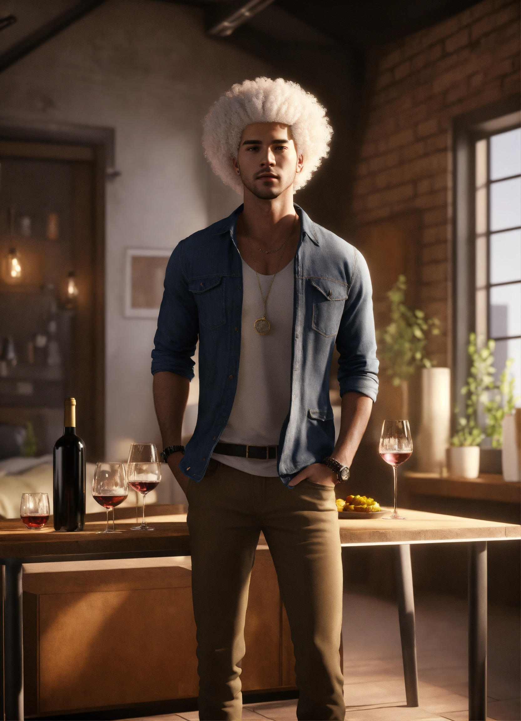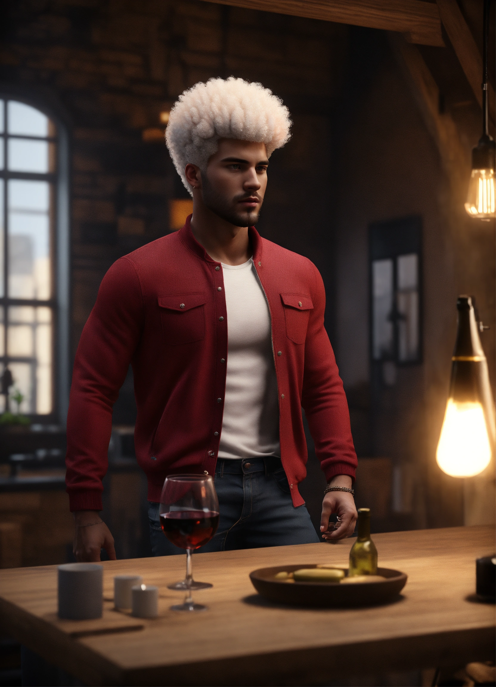 Handsome 27-year-old male. with a white afro. tall build, dressed in casual wear. 8k, unreal engine. standing in upscale in loft bedroom. wine on table, 8k, unreal engine. 8k, unreal engine.
