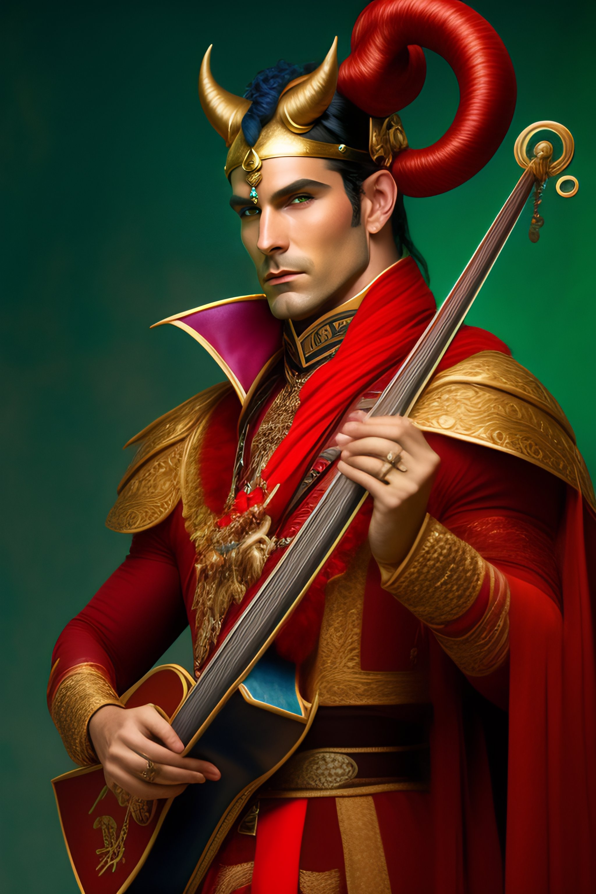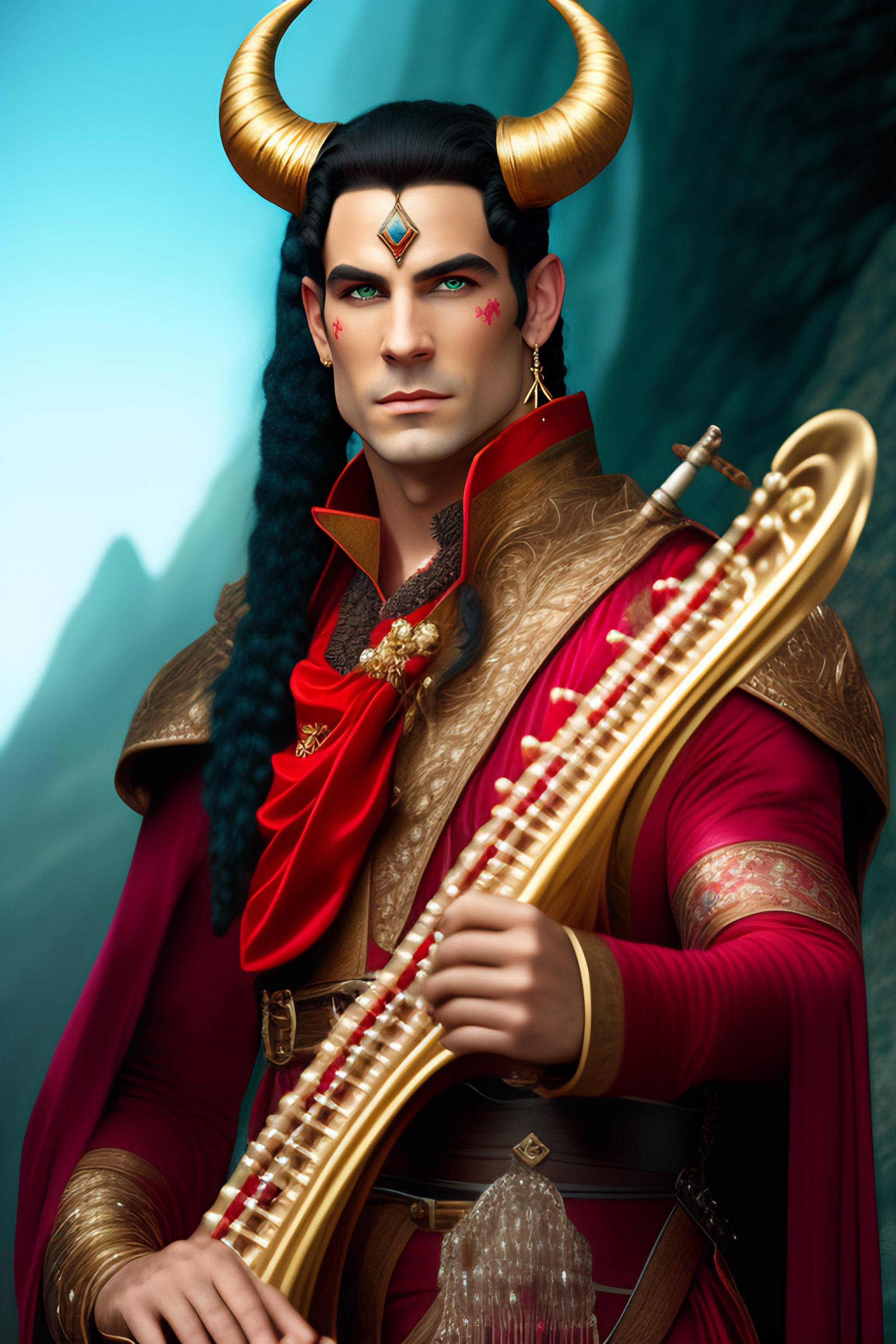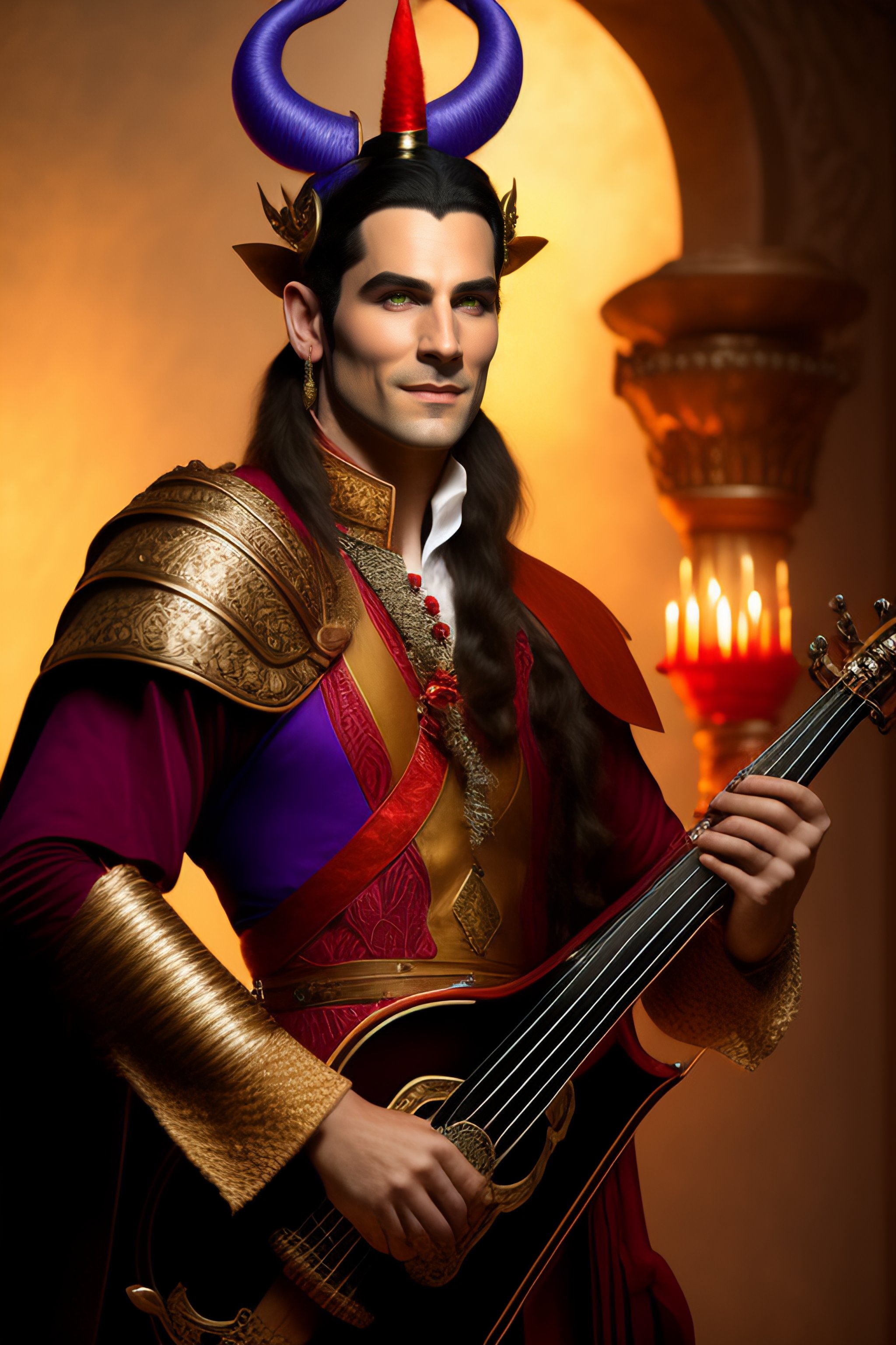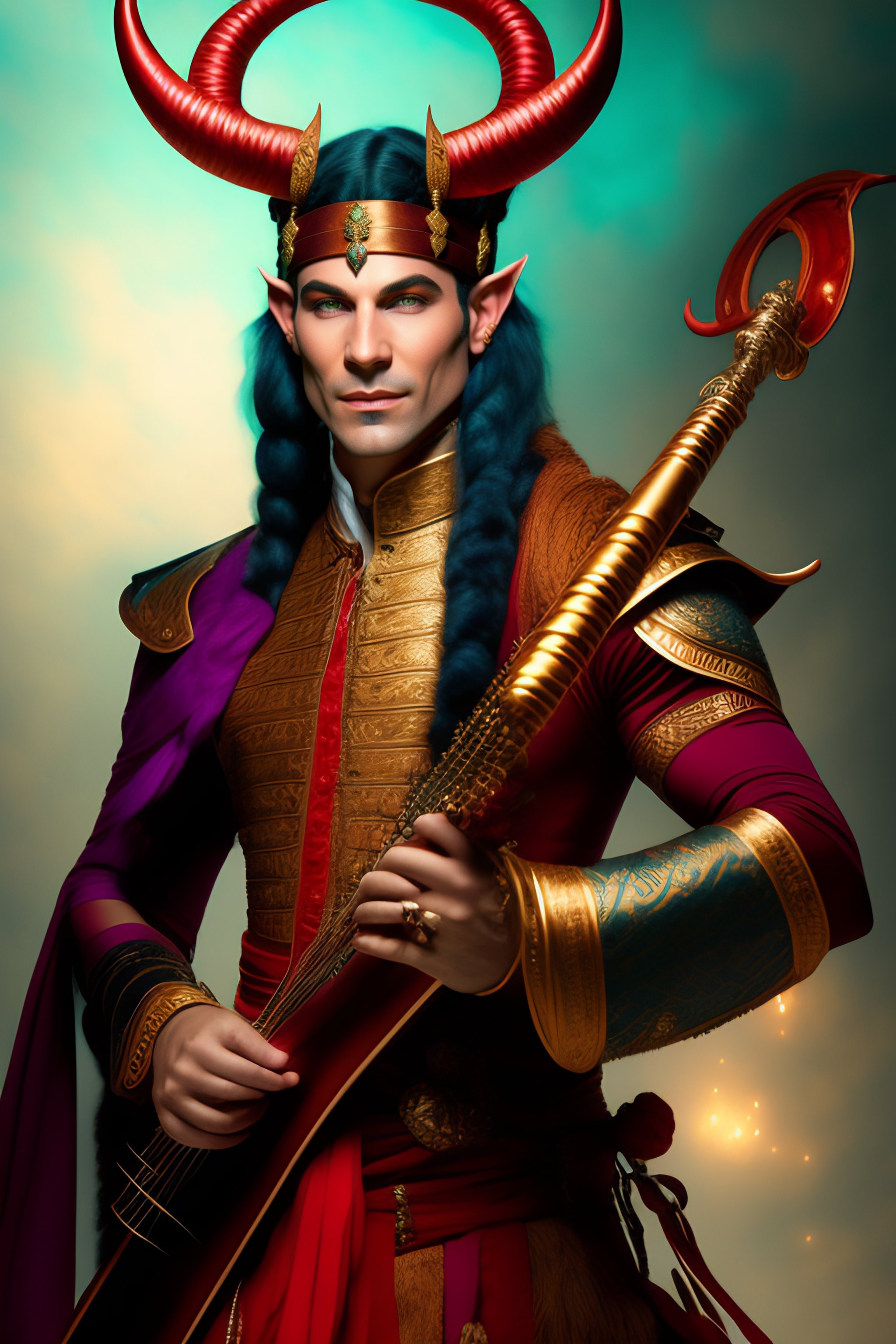 The male tiefling bard was a captivating presence on and off the stage. standing at just over 5 feet tall, he had the distinctive red skin and horns characteristic of his race. his eyes were a bright, almost otherworldly green and his long black hair was styled in elaborate braids adorned with sparkling jewels. he was skilled in a variety of musical instruments, including the lute, flute, and drums, and his enchanting voice could entrance listeners and bend them to his will. in addition to his talents as a performer, the tiefling bard was also a skilled diplomat and negotiator, using his charm and wit to smooth over difficult situations. despite his love of luxury, he had a good heart and used his gifts to bring joy to those around him.