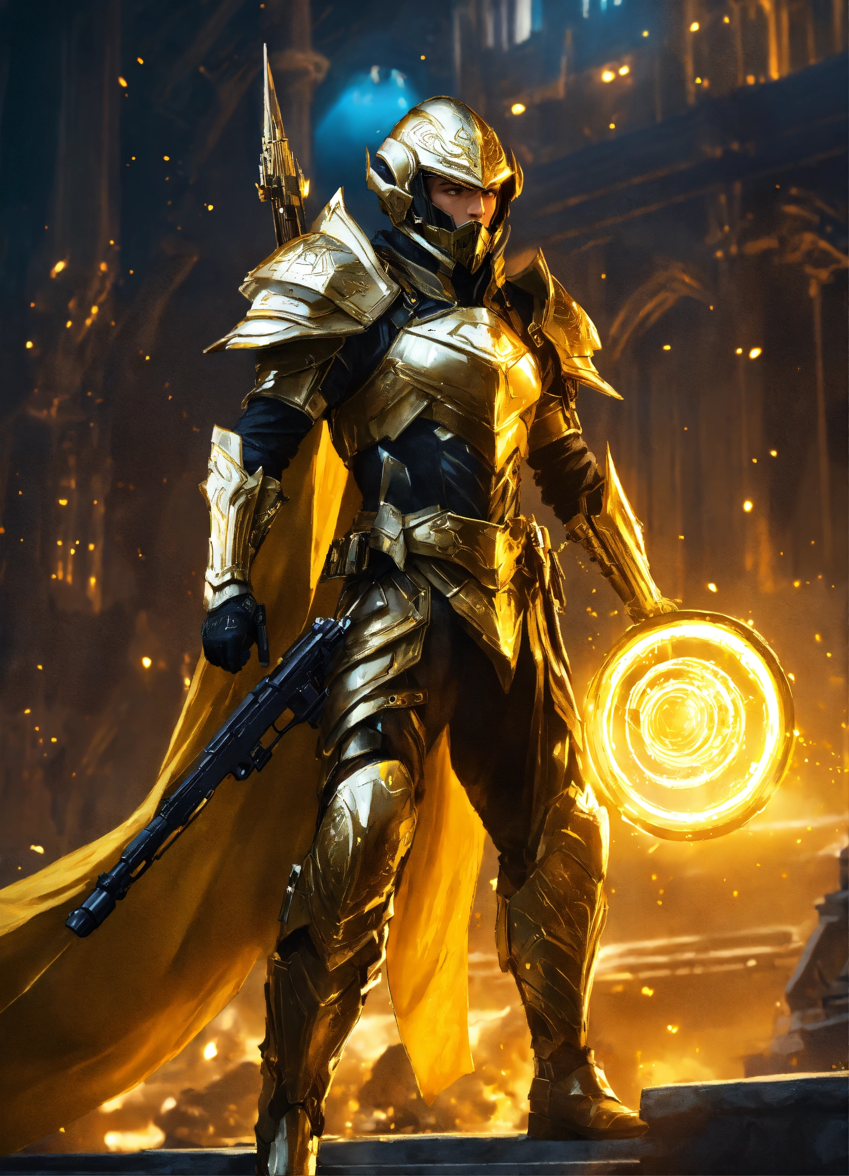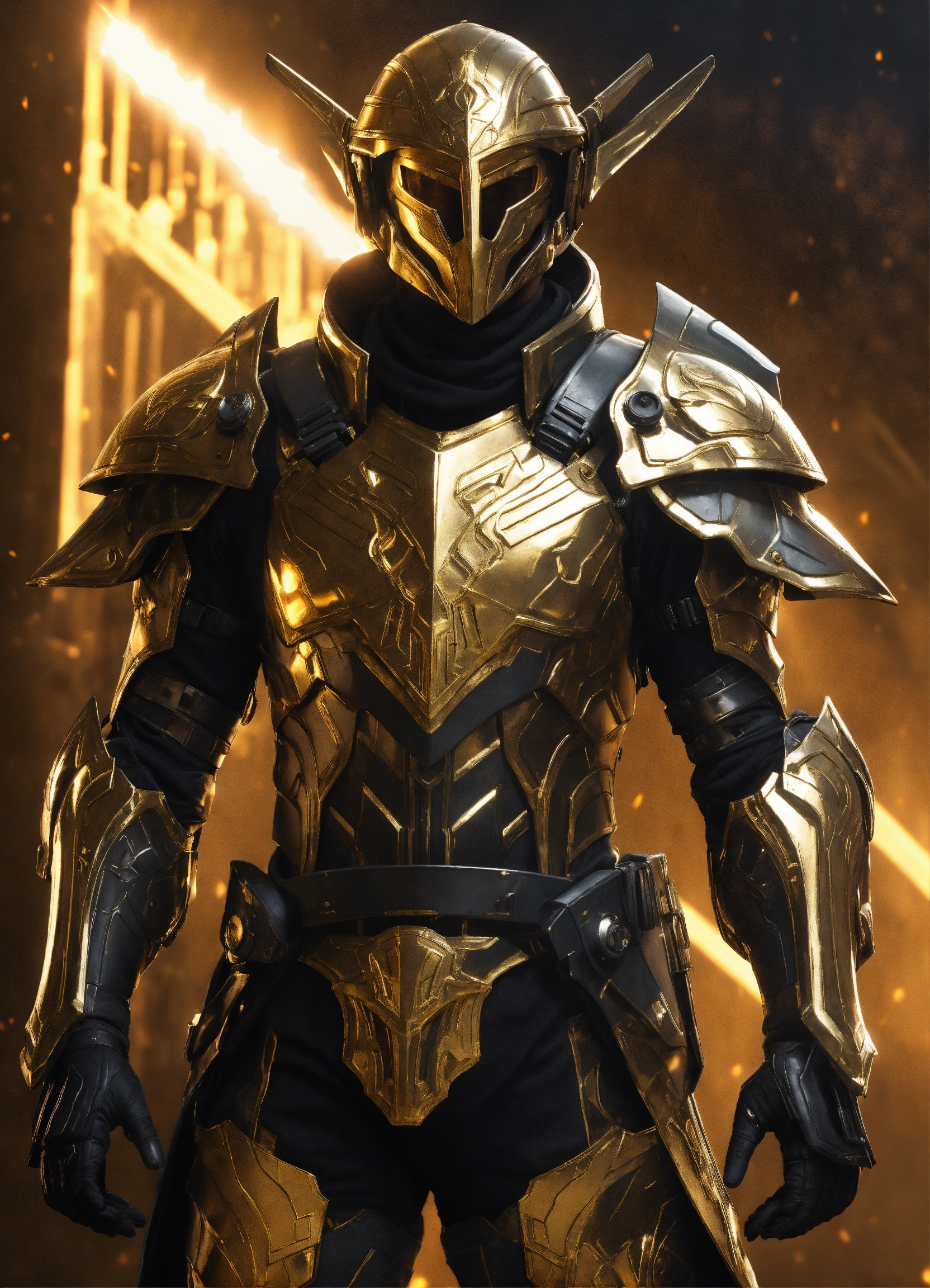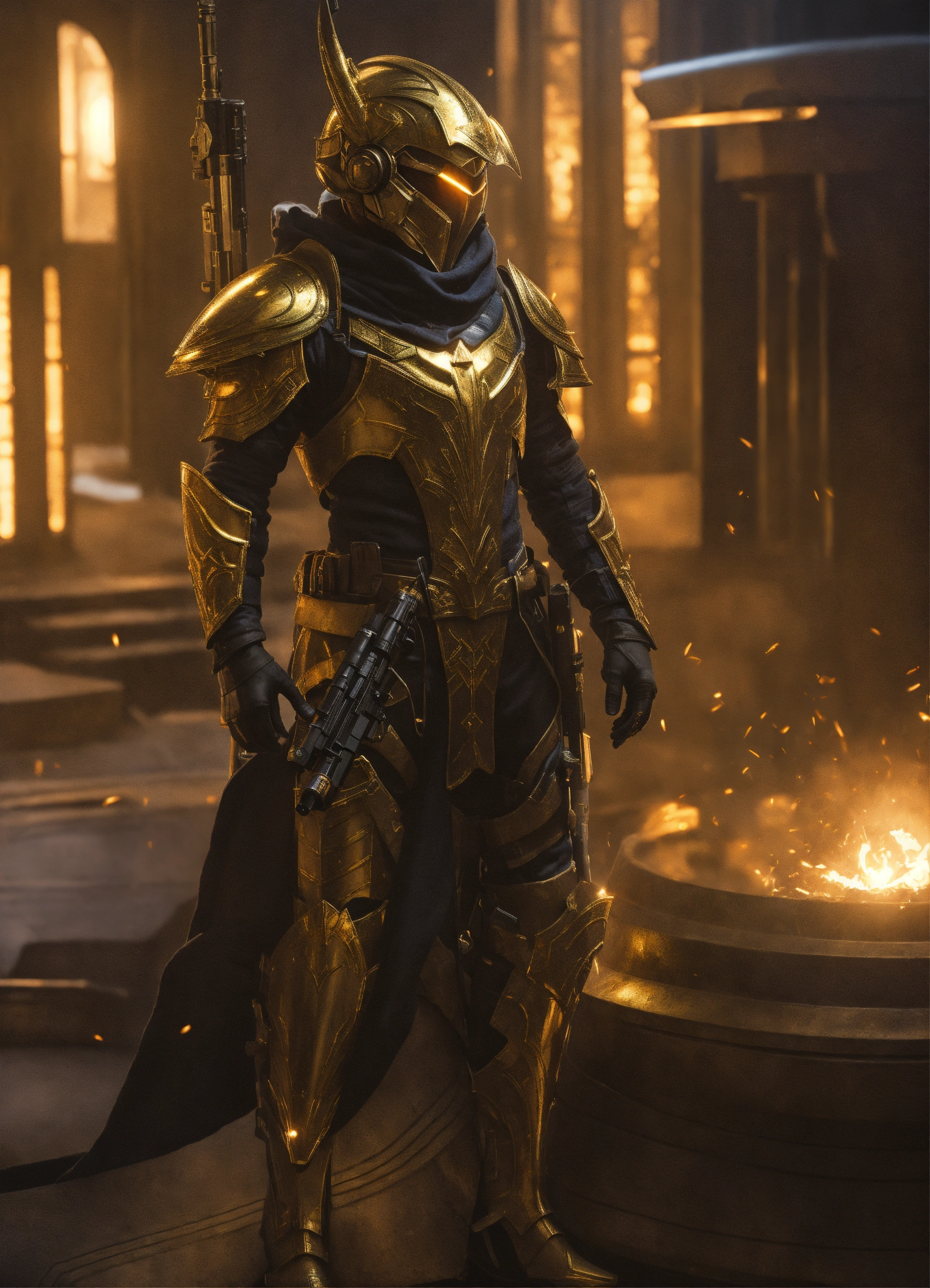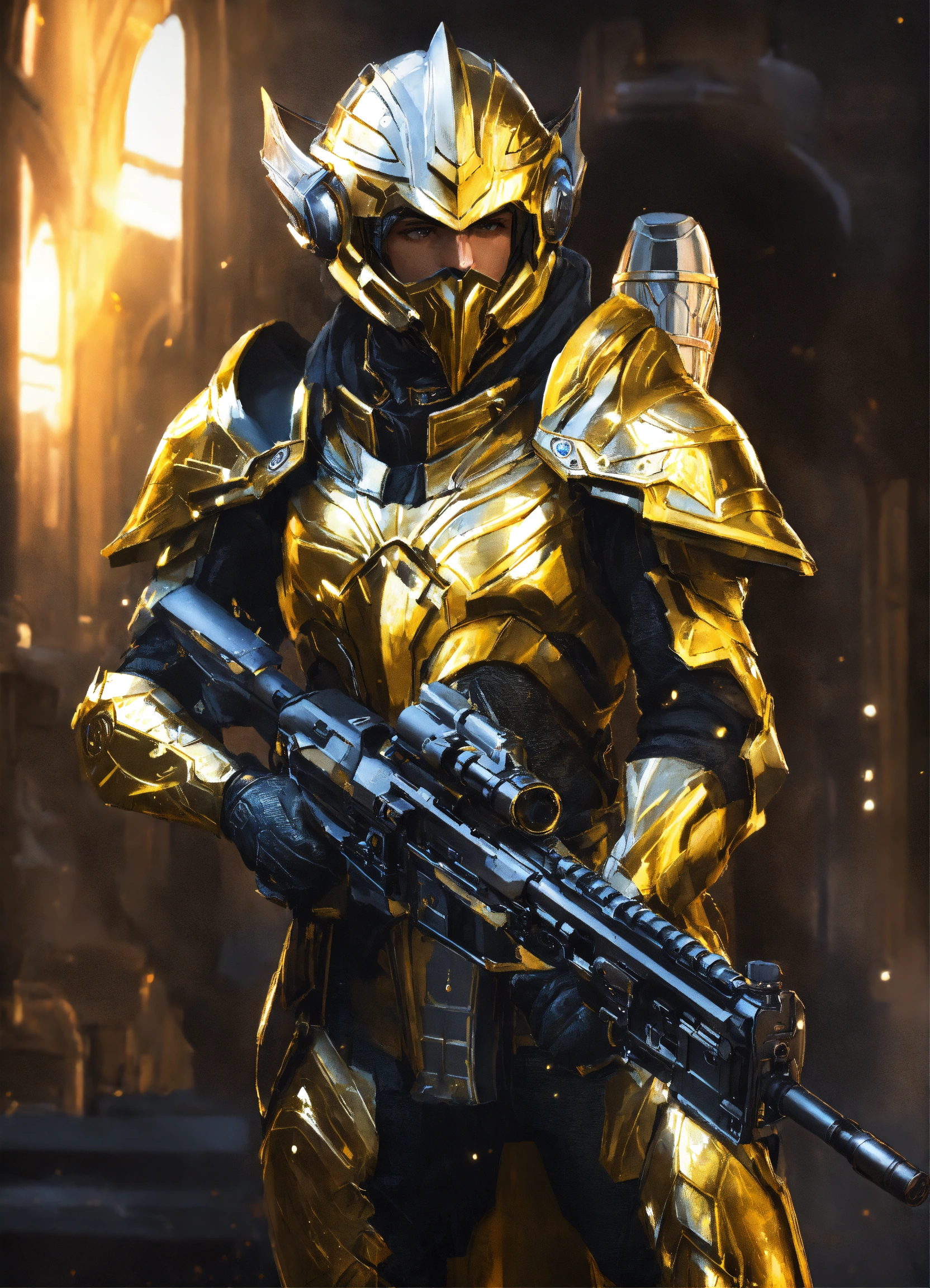 High elf sci fi soldier wearing heavy sci fi elven armor, black and gold armor and helmet, male, holding a light machine gun, full body, hd