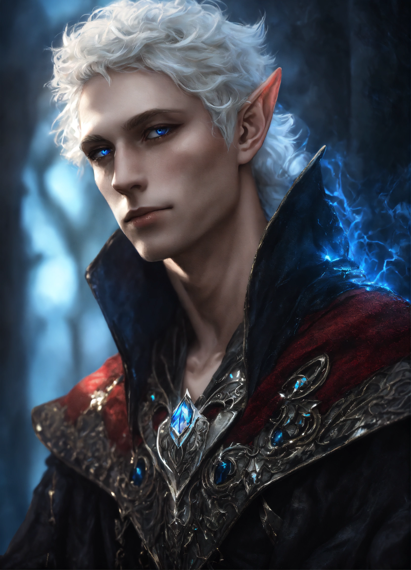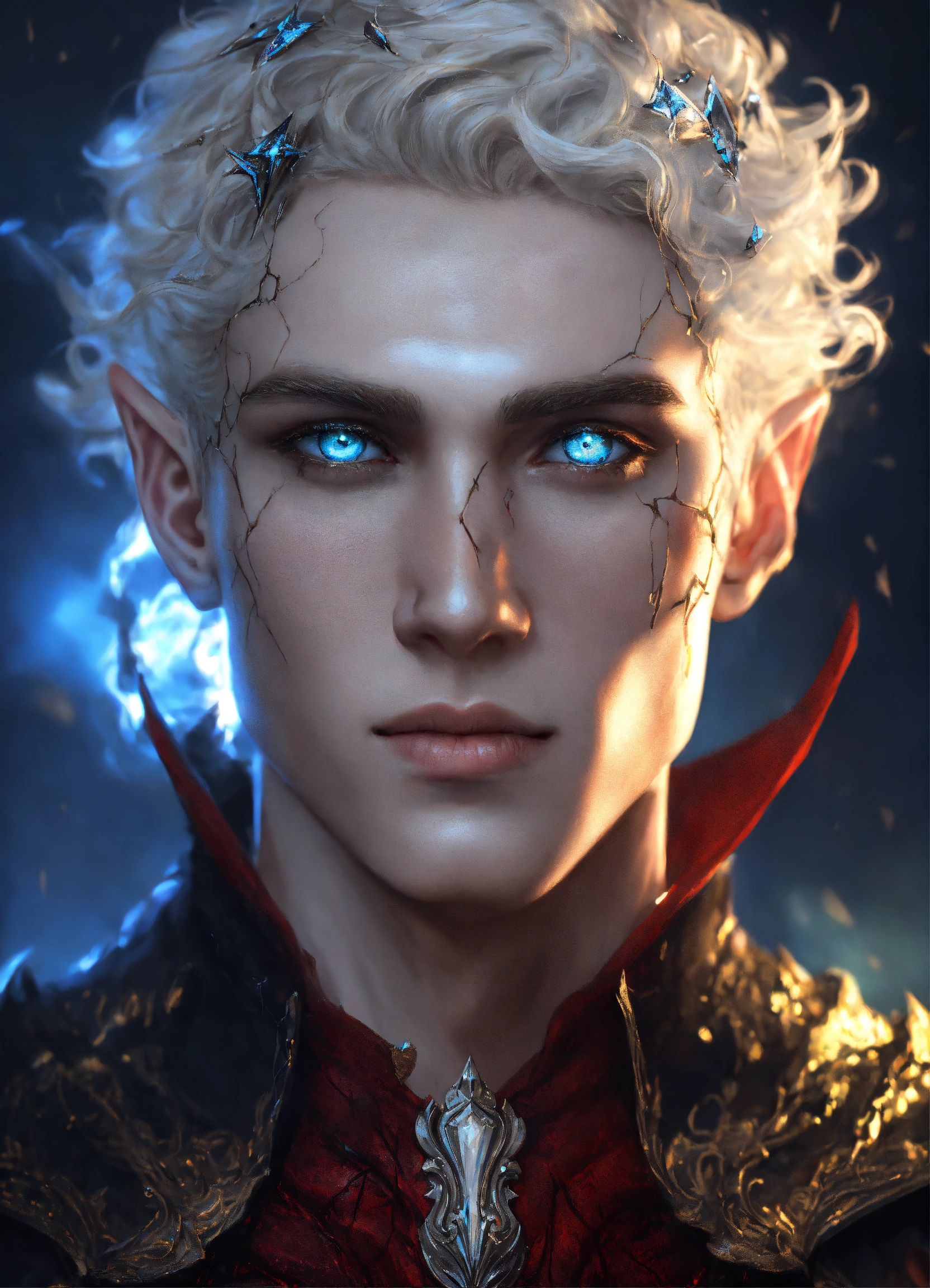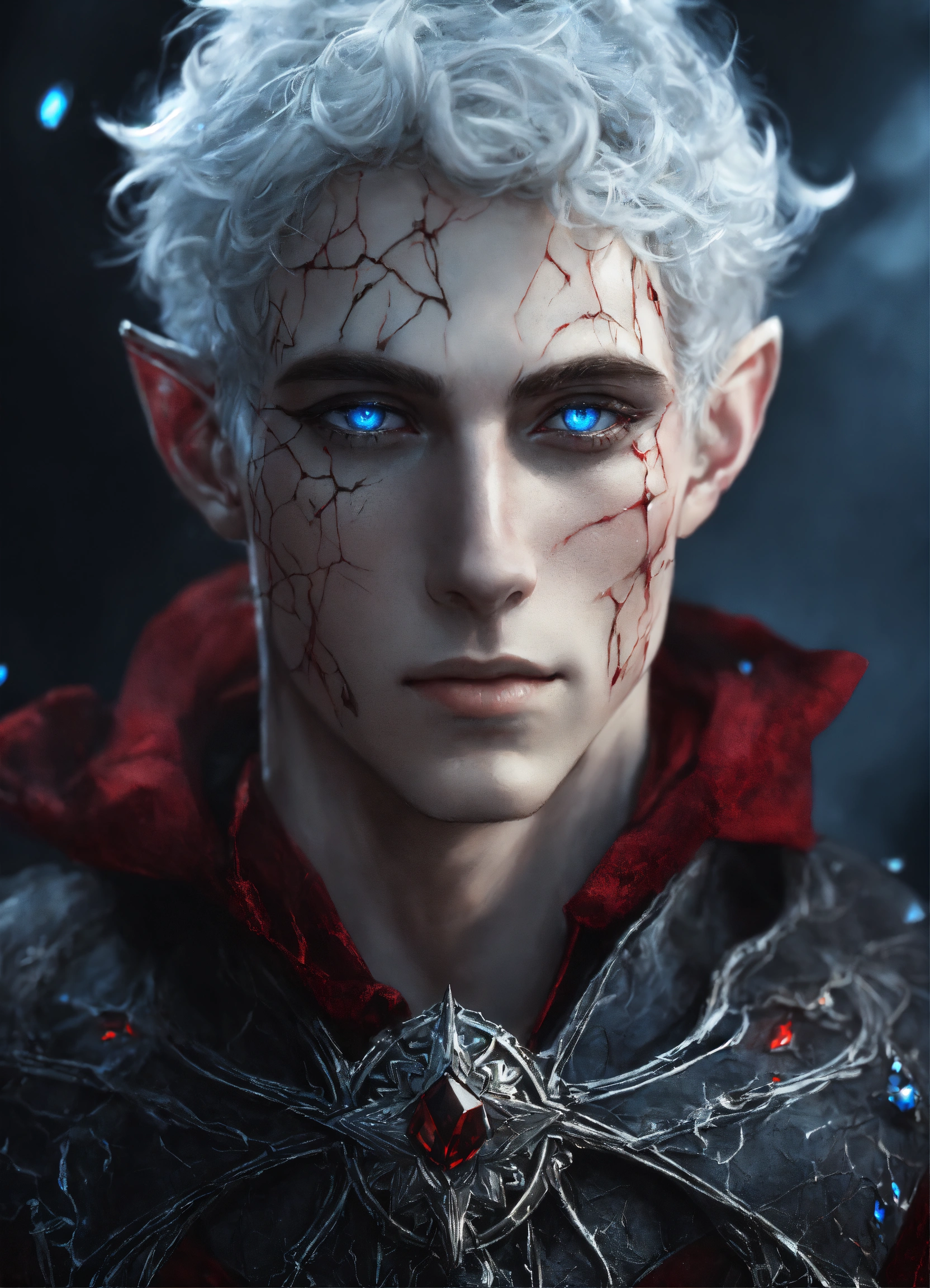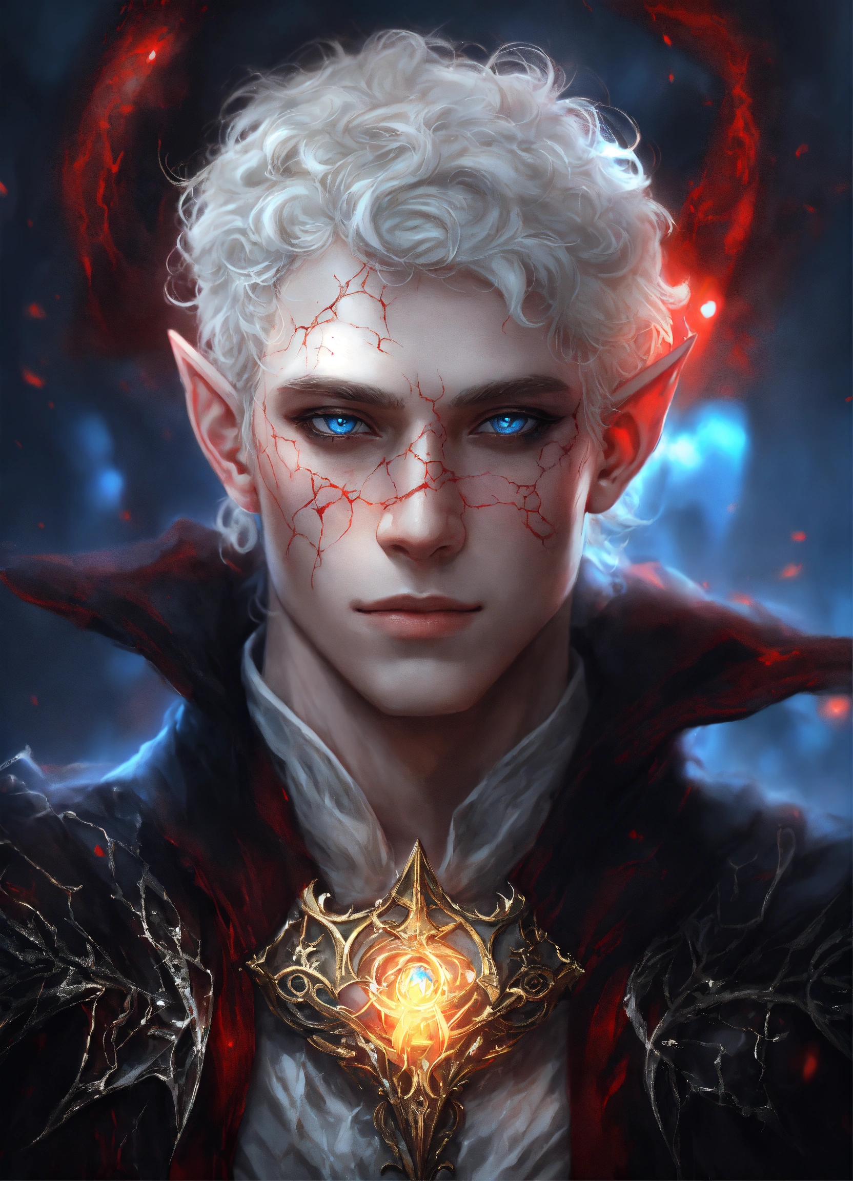 Fantasy portrait of a sickly pale-skinned male elf sorcerer, black shattered and cracked skin, gentle blue eyes, soft smile, glowing white curly hair, black and red magic, ultra detailed