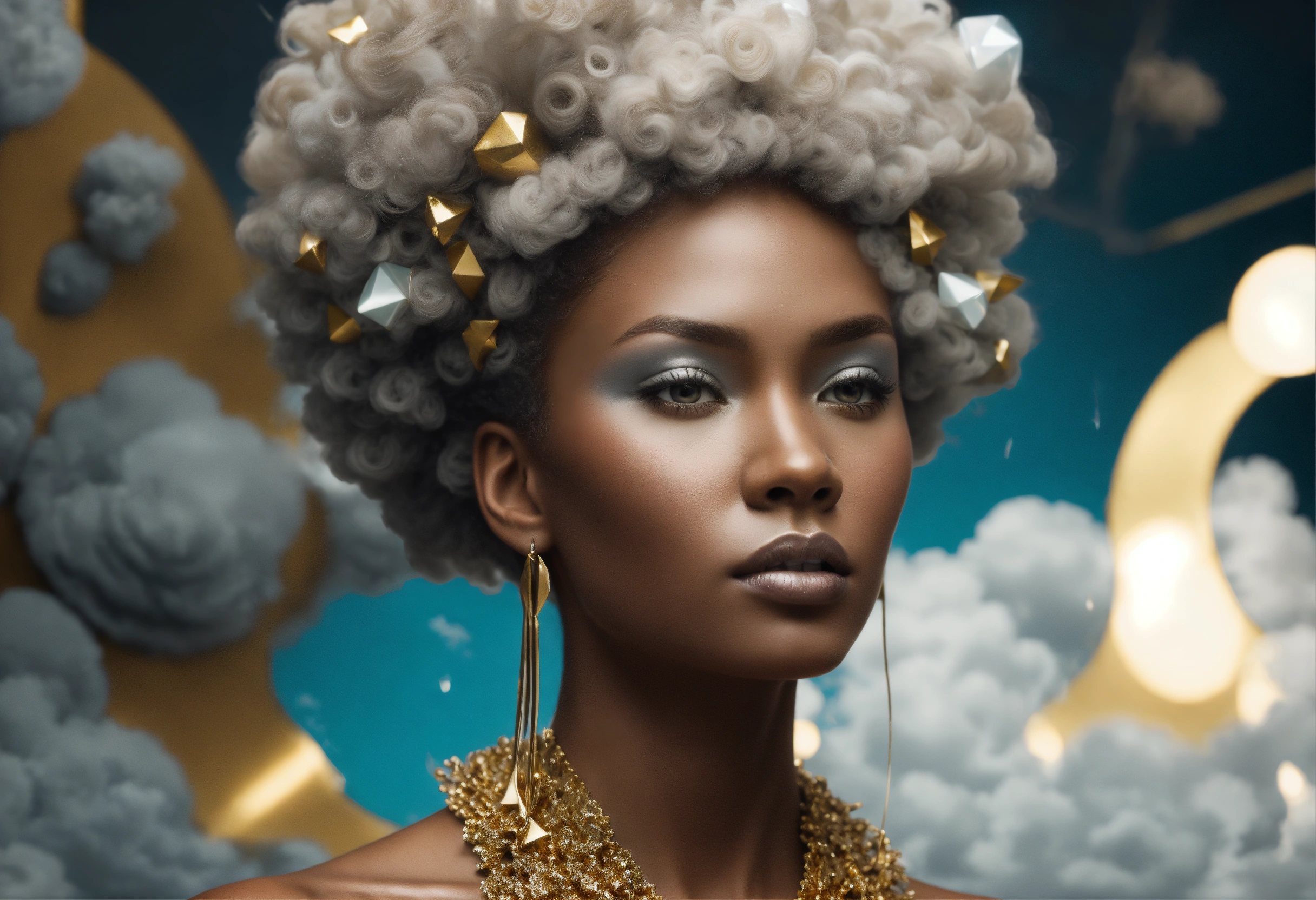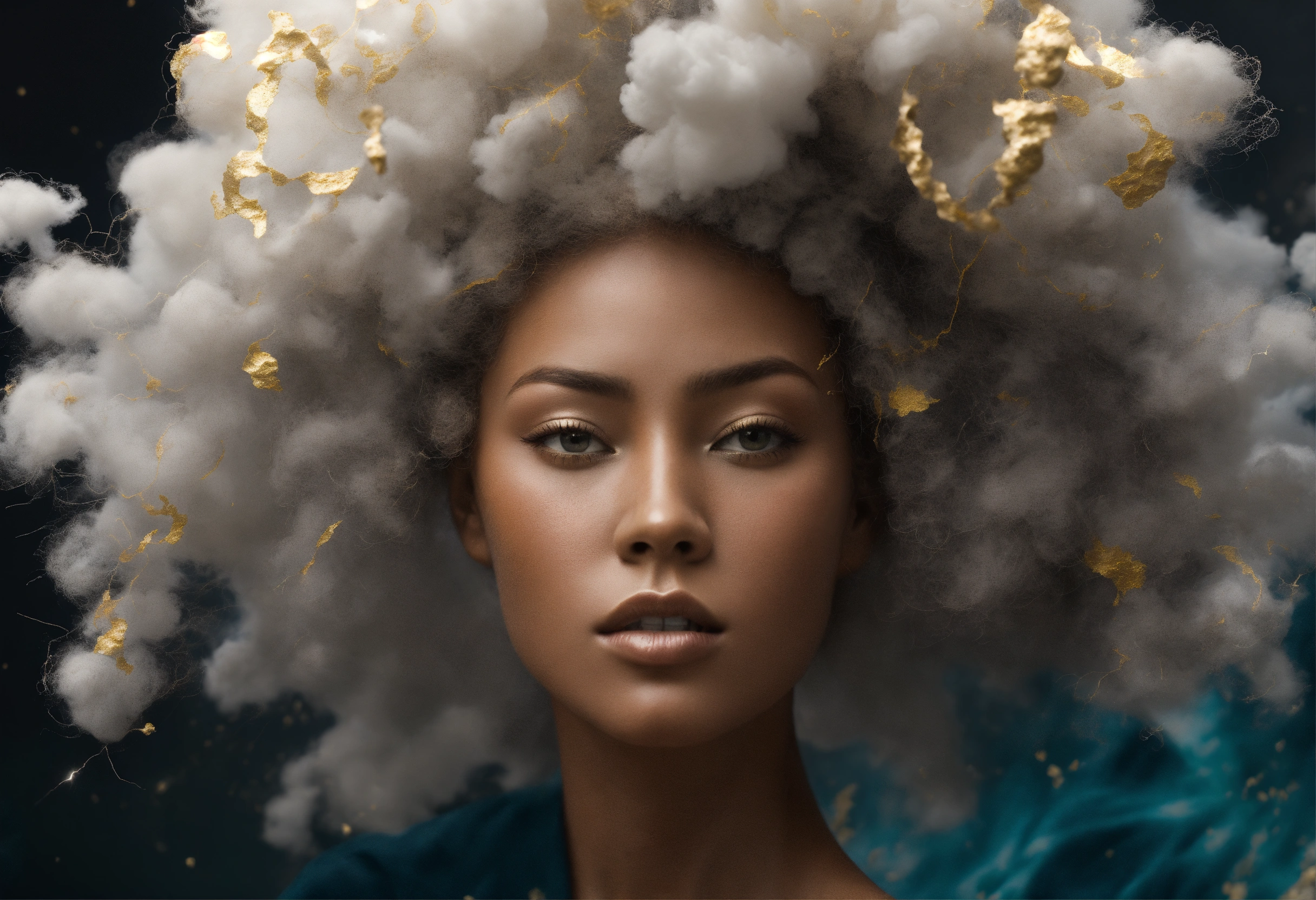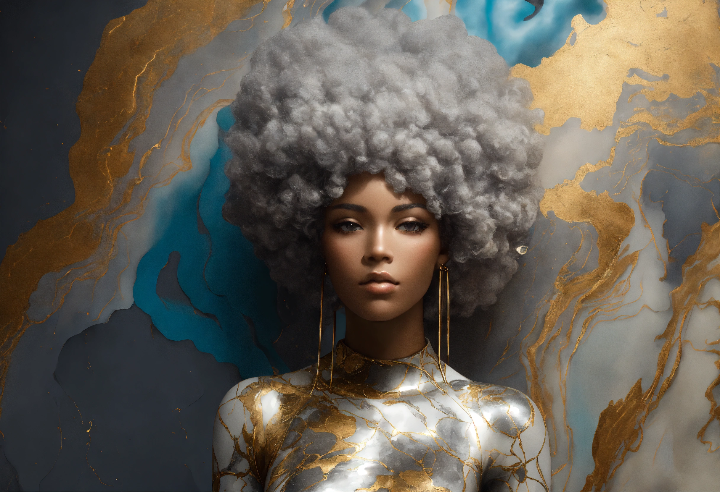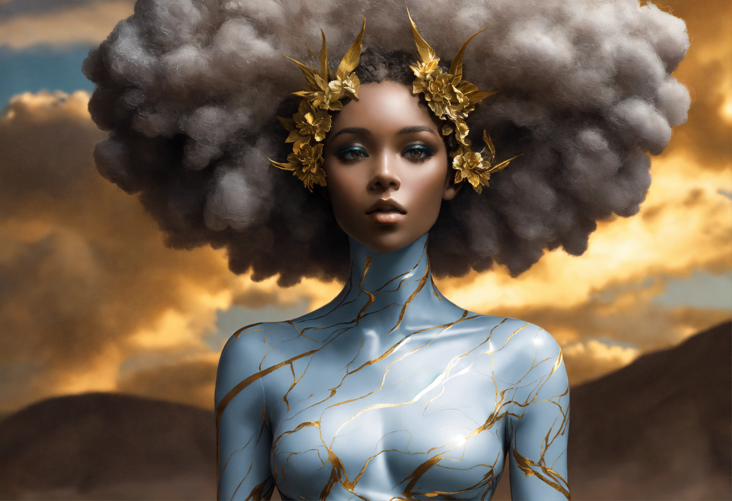 A hd woman sculpted of white taupe grey with gold veined marble, afro hair is made of grey and turquiose cumulus clouds streaked with silver lightning strikes throughout, rule of thirds