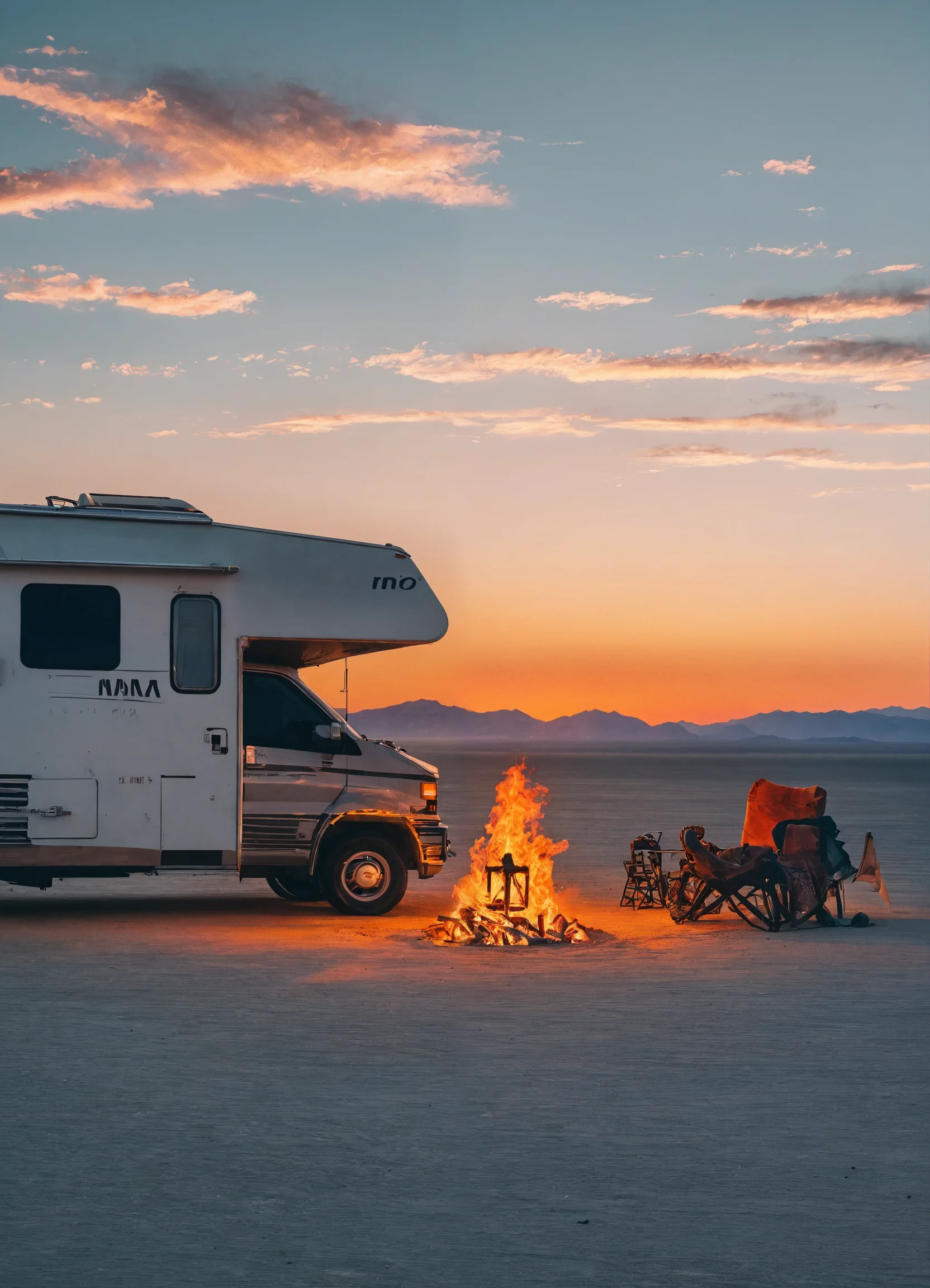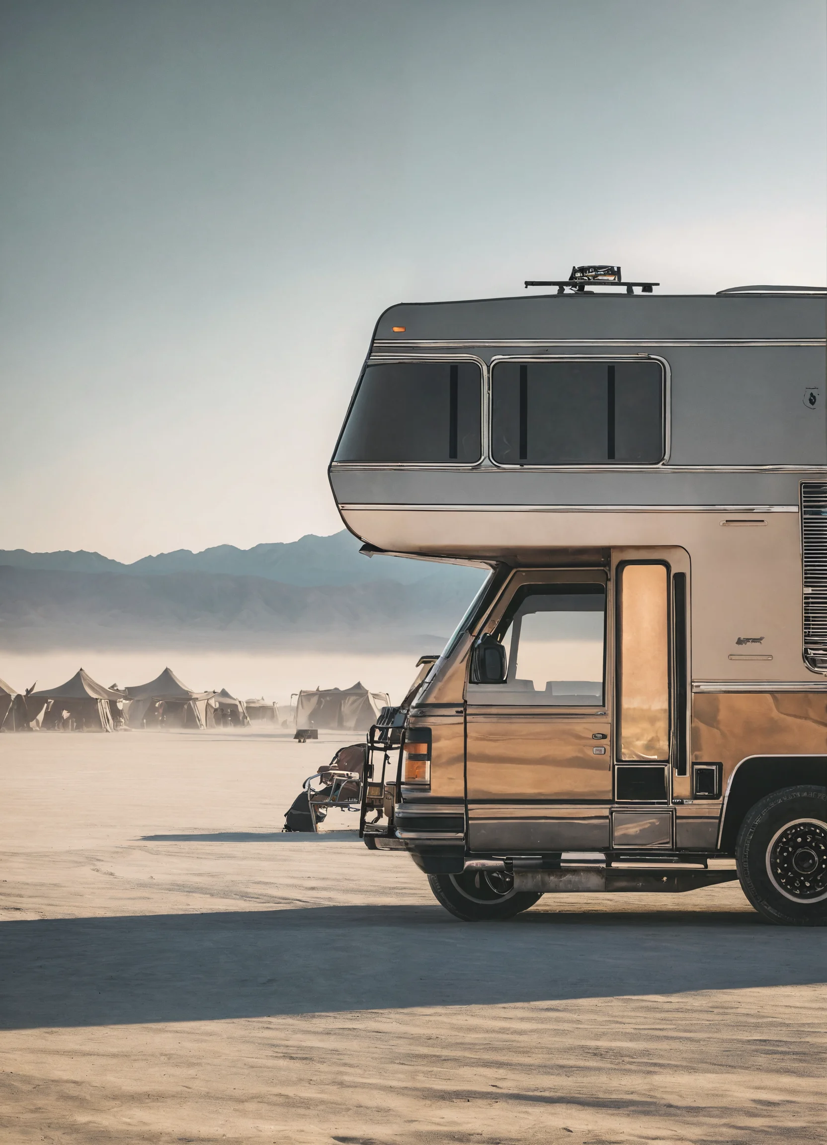 **task:** create an instagram post for burning man 2024 with a focus on grey tones and the presence of class a rvs. showcase the iconic burning man symbol against a subdued desert landscape. incorporate shades of grey, highlighting the rugged beauty. feature rvs dispersed across the scene, emphasizing the nomadic spirit. use the hashtags #nomadicvibes and #greydesert. text: "burning man 2024: grey hues, nomadic dreams. experience the allure of the desert with rvs as your home on wheels. #burningman #nomadicvibes #greydesert" opt for a square format (1080x1080 pixels), integrate the official logo, and maintain instagram's aesthetic appeal, focusing on the nomadic essence of the festival.