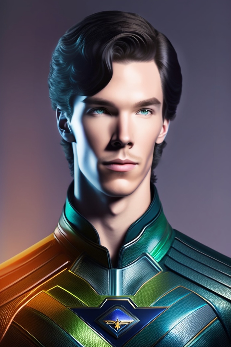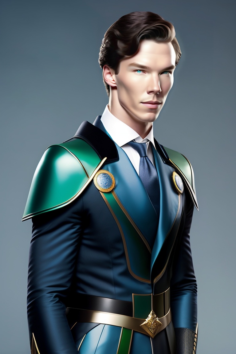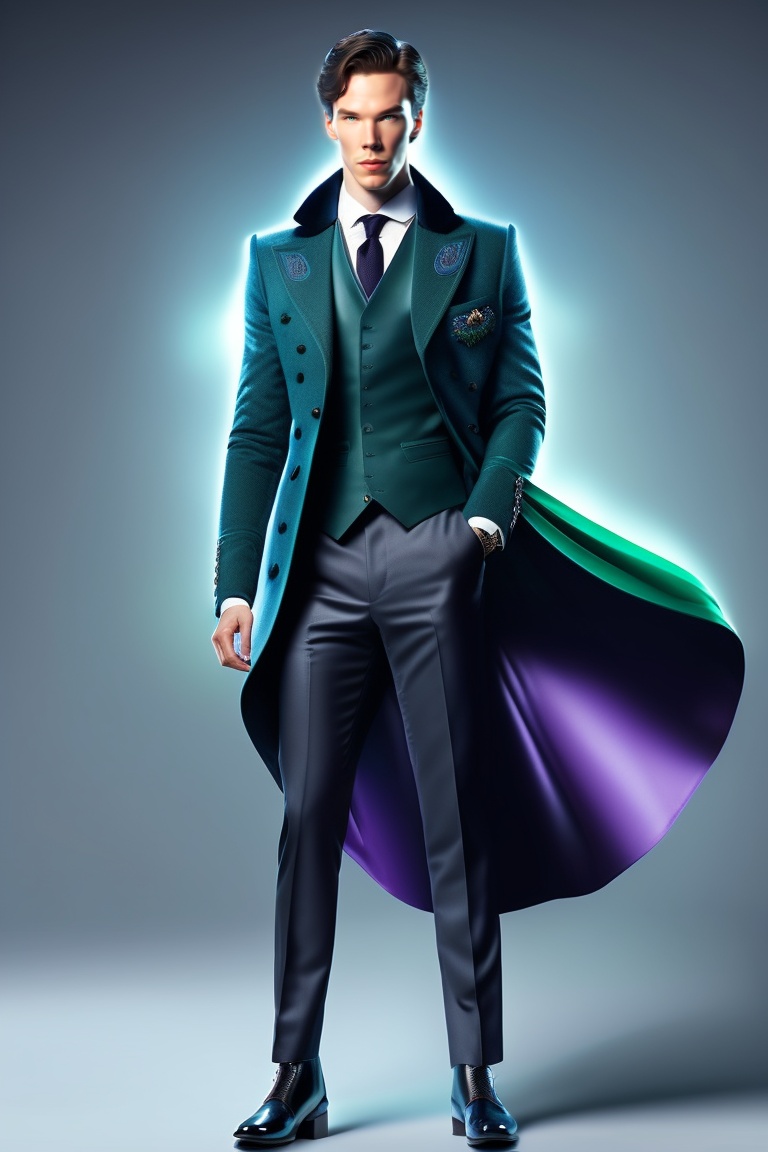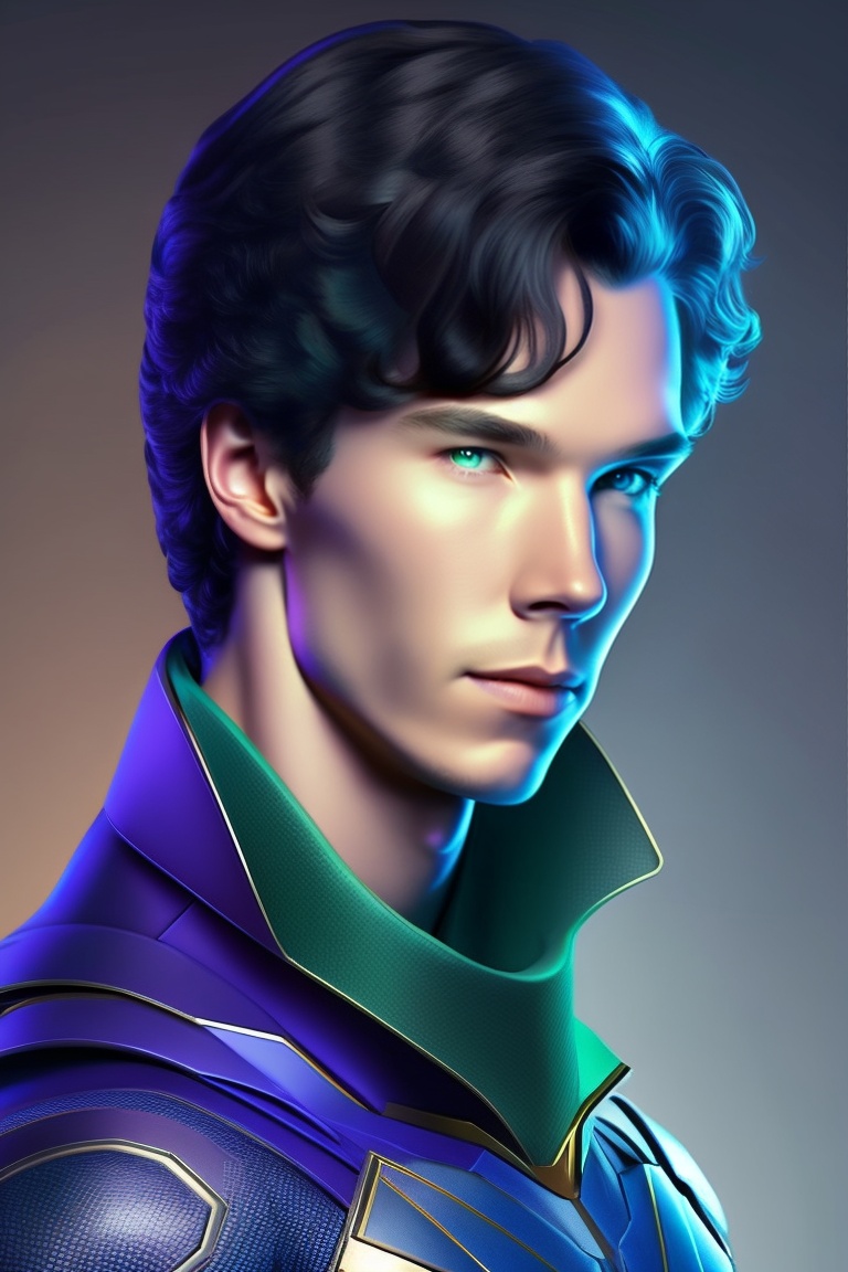15 years old, 5'5", benedict cumberbatch, black hair, blue-green eyes, superhero mystic, standing action pose