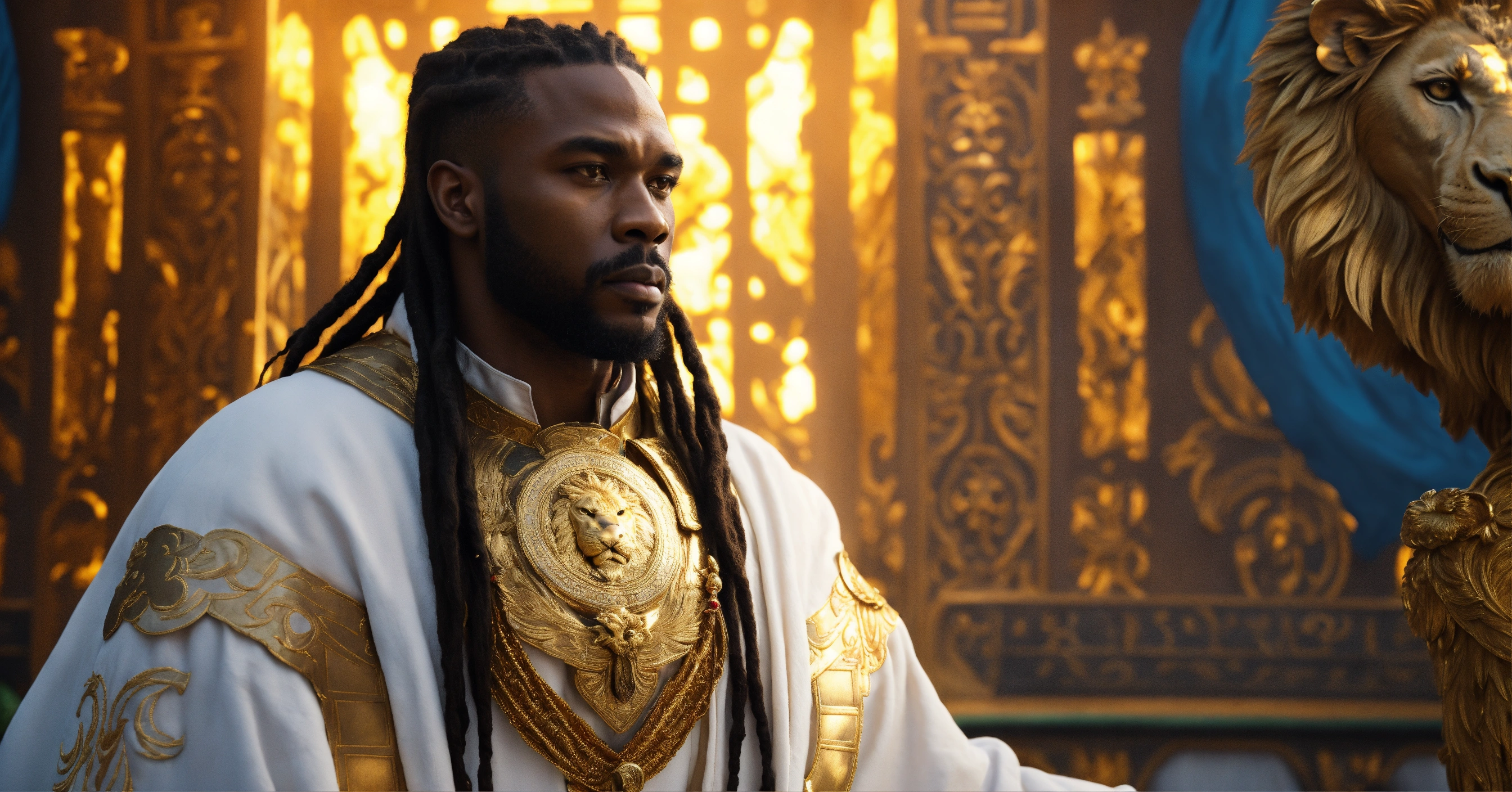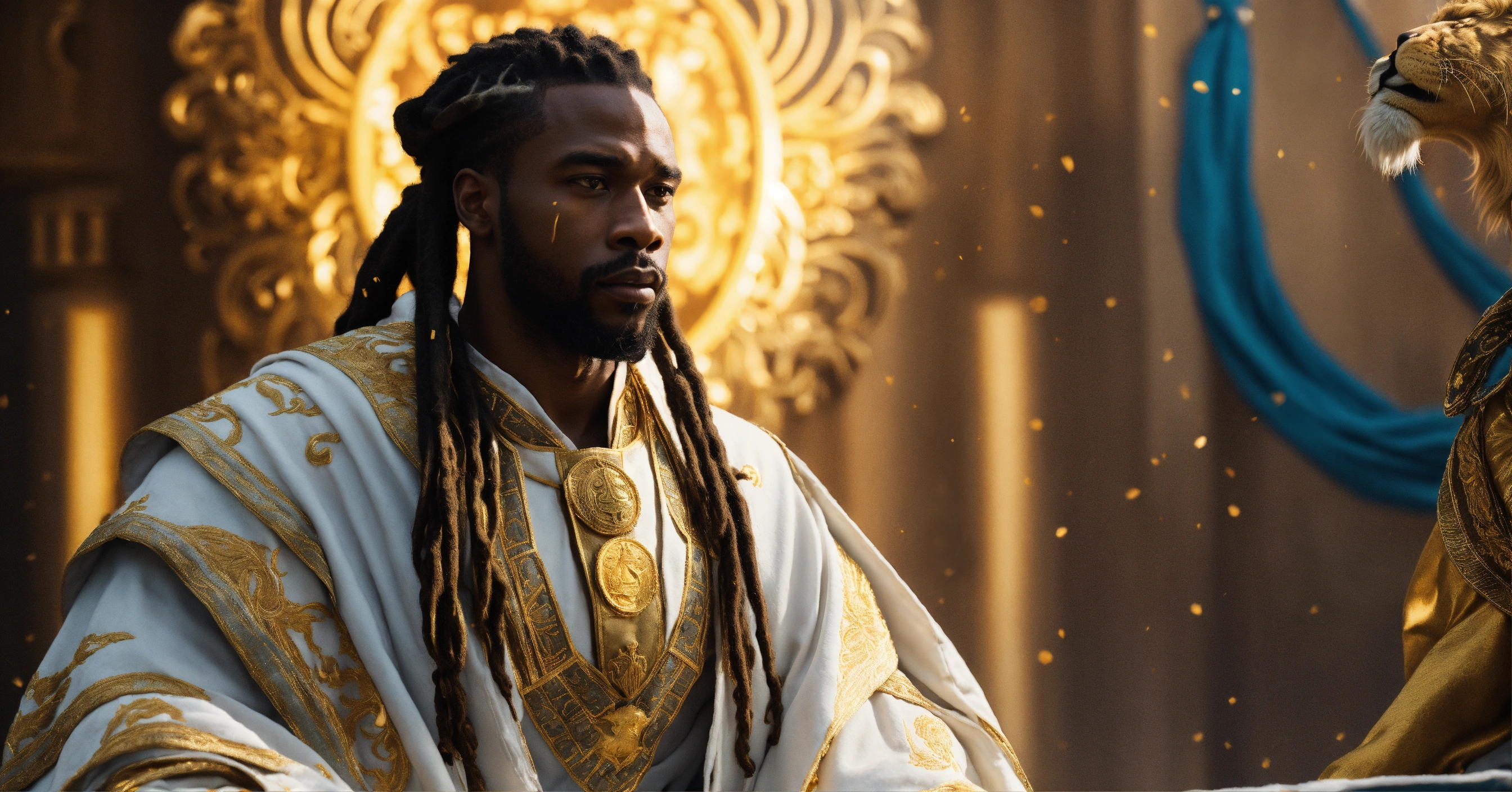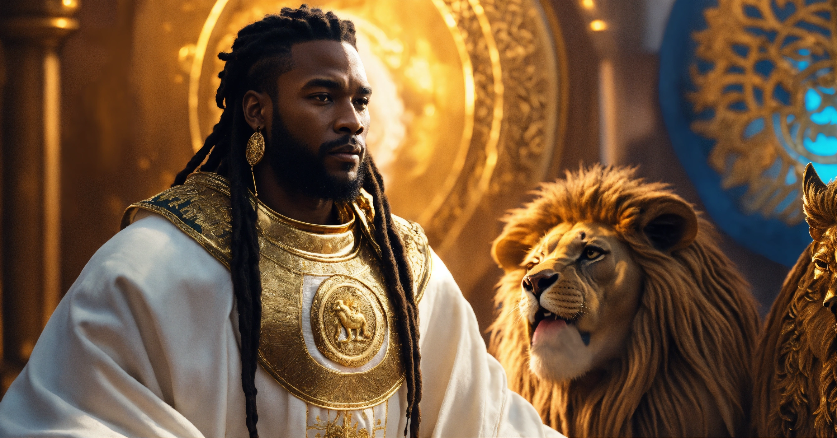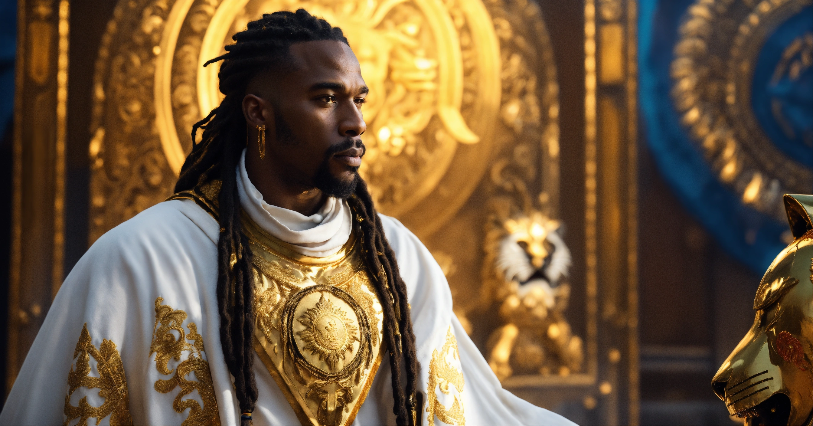 Illustrate a view of a fierce, handsome, strong, broad-shouldered black man with dreadlocks. he is wearing a long glorious white robe with gold embroidery. he is wearing a golden breastplate with the symbol of a lion on it. fantasy. photorealistic 8k