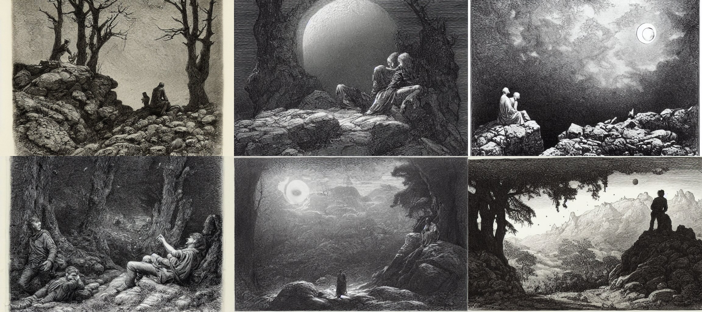 An engraving of two men contemplating the moon on a rock in the forest by gustave dore, caspar david friedrich, ian miller, highly detailed, strong shadows, depth, lithograph engraving