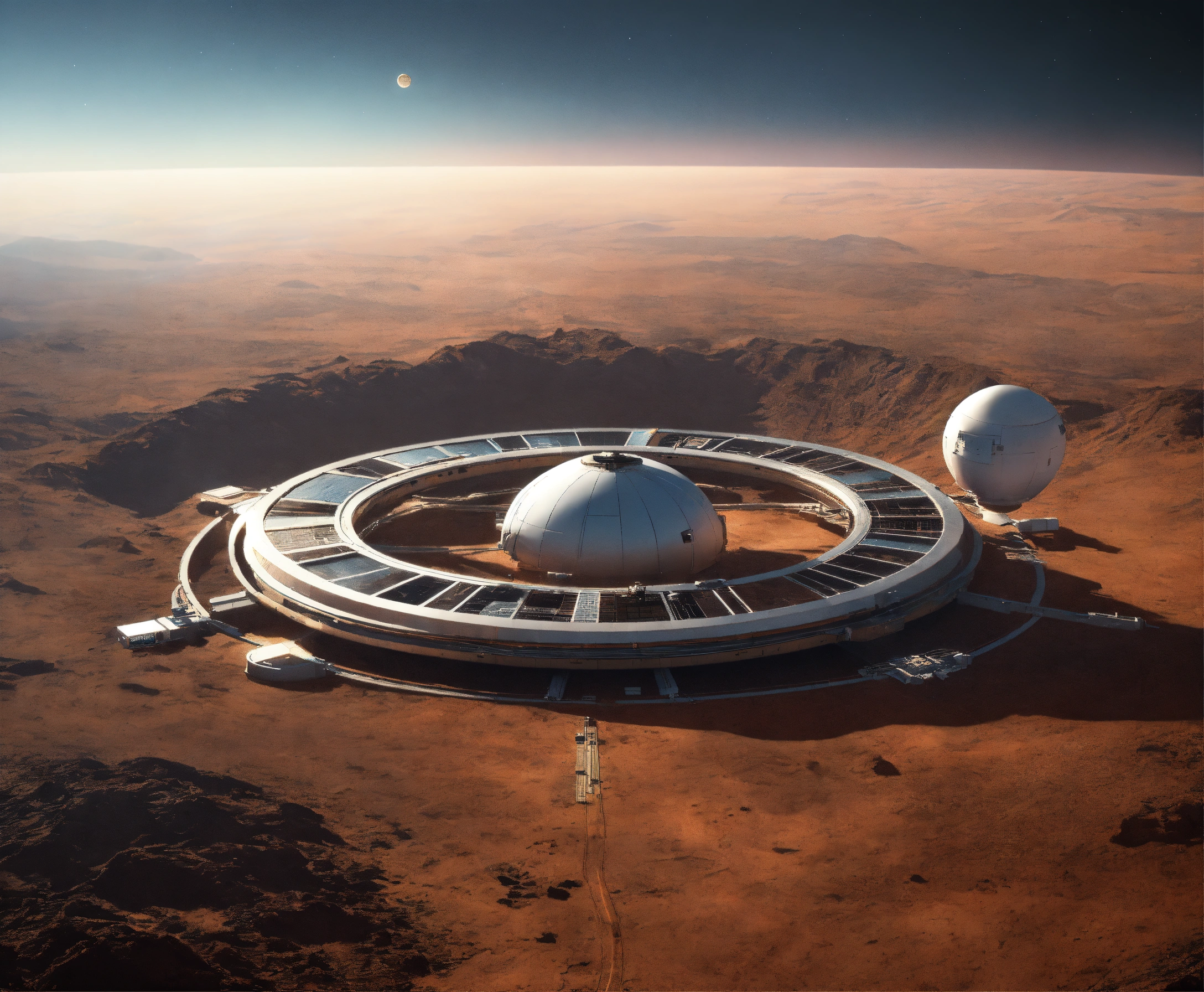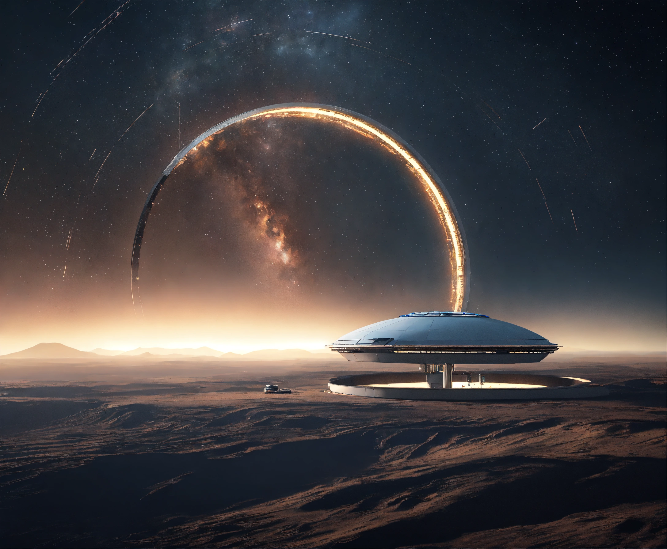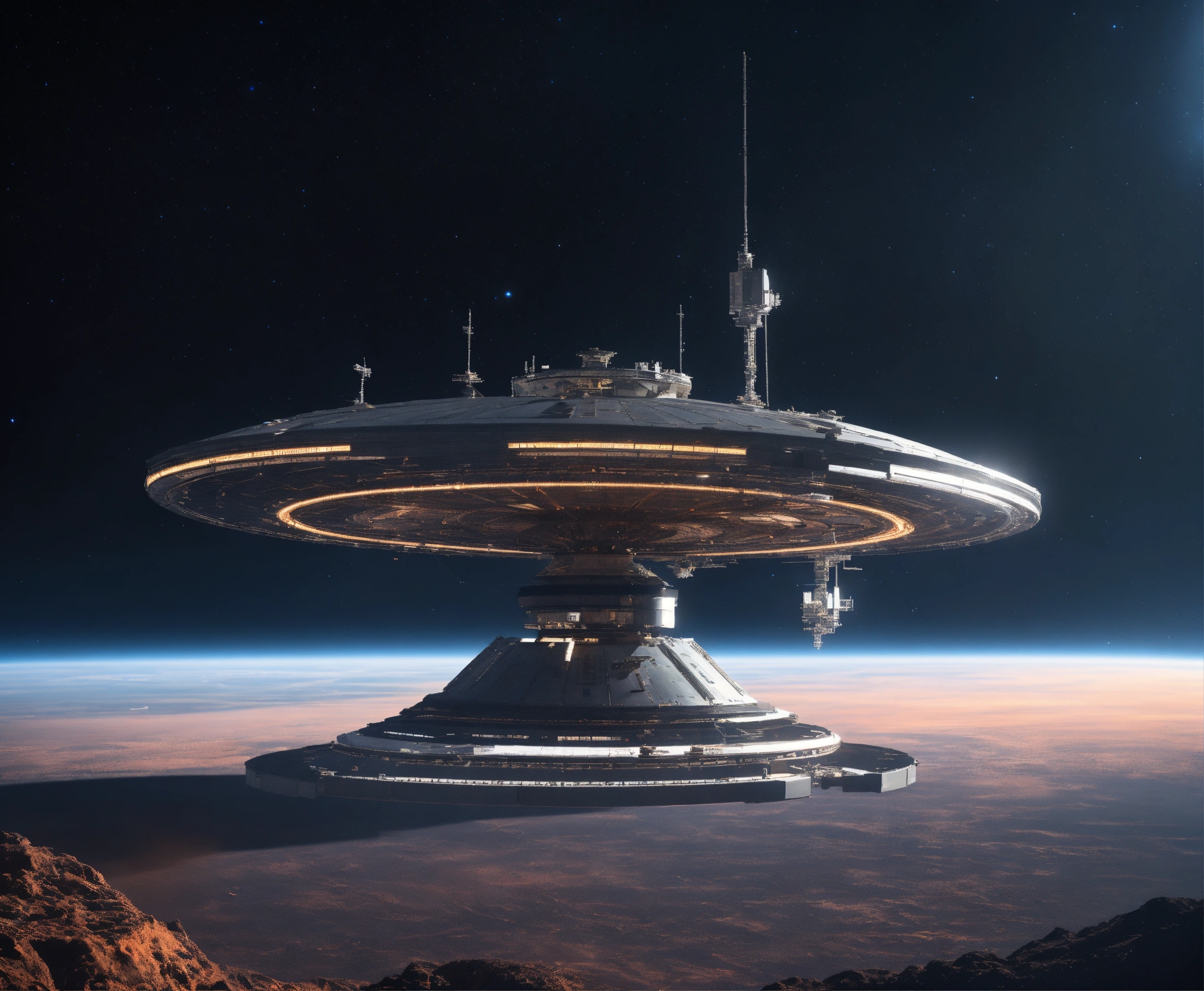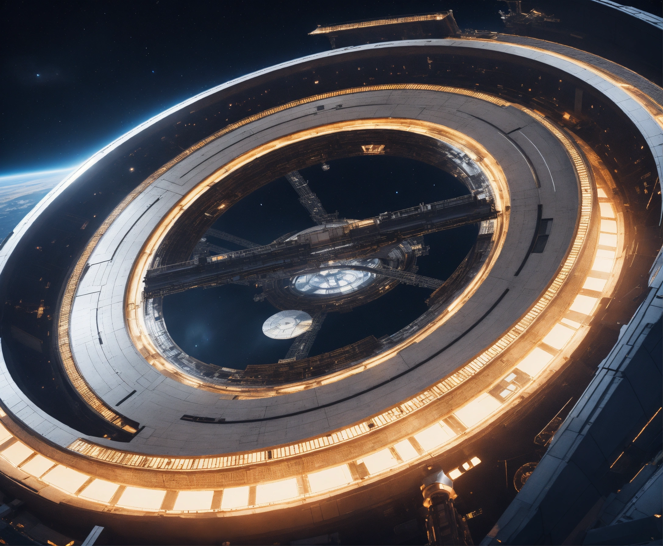A highly realistic photo from a distance of a futuristic a thin wheel-shaped space station, with a thin perimeter and radial tunnels, forming a wheel-shape, in the middle of space simple, elegant, minimalist, 8k