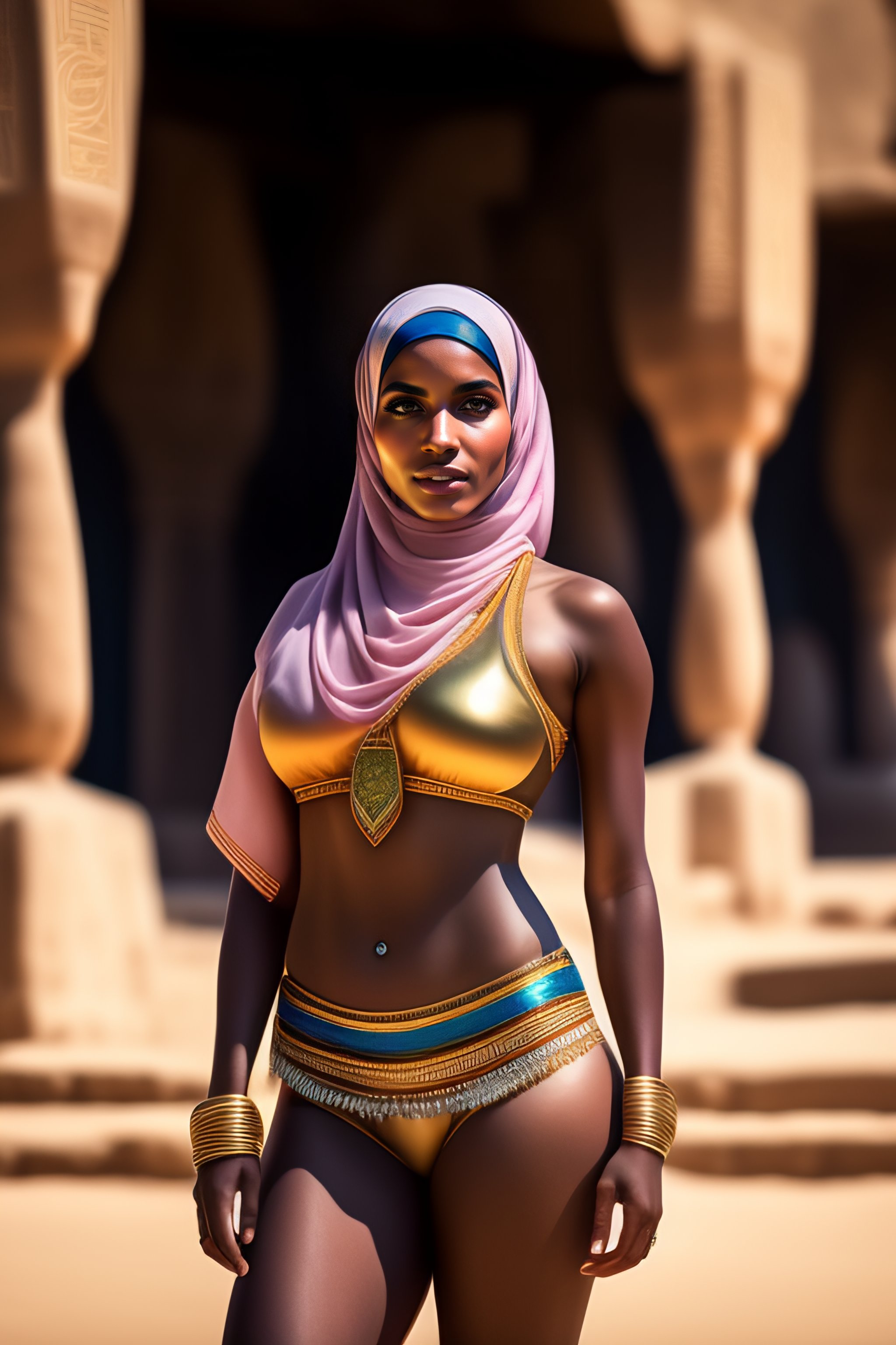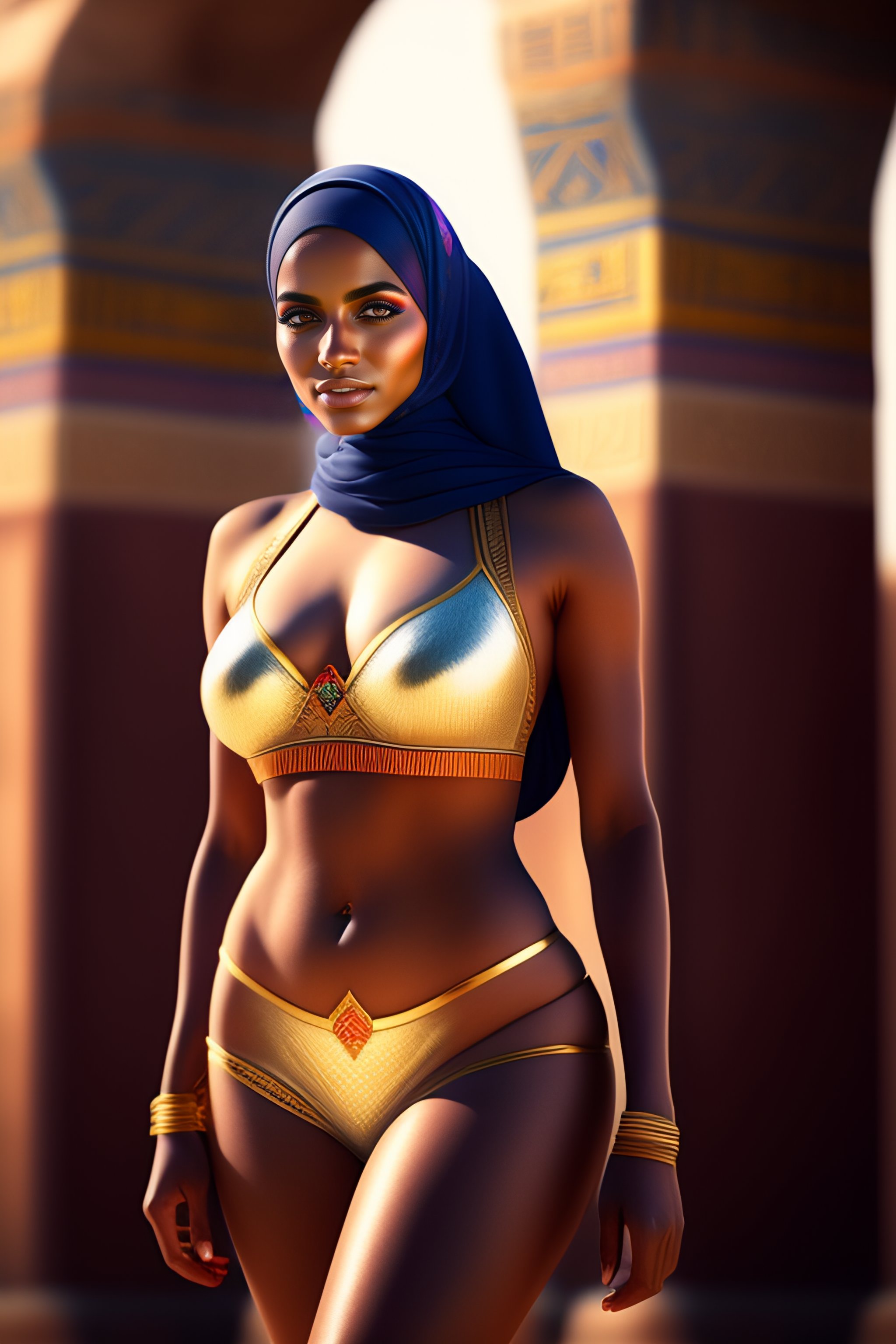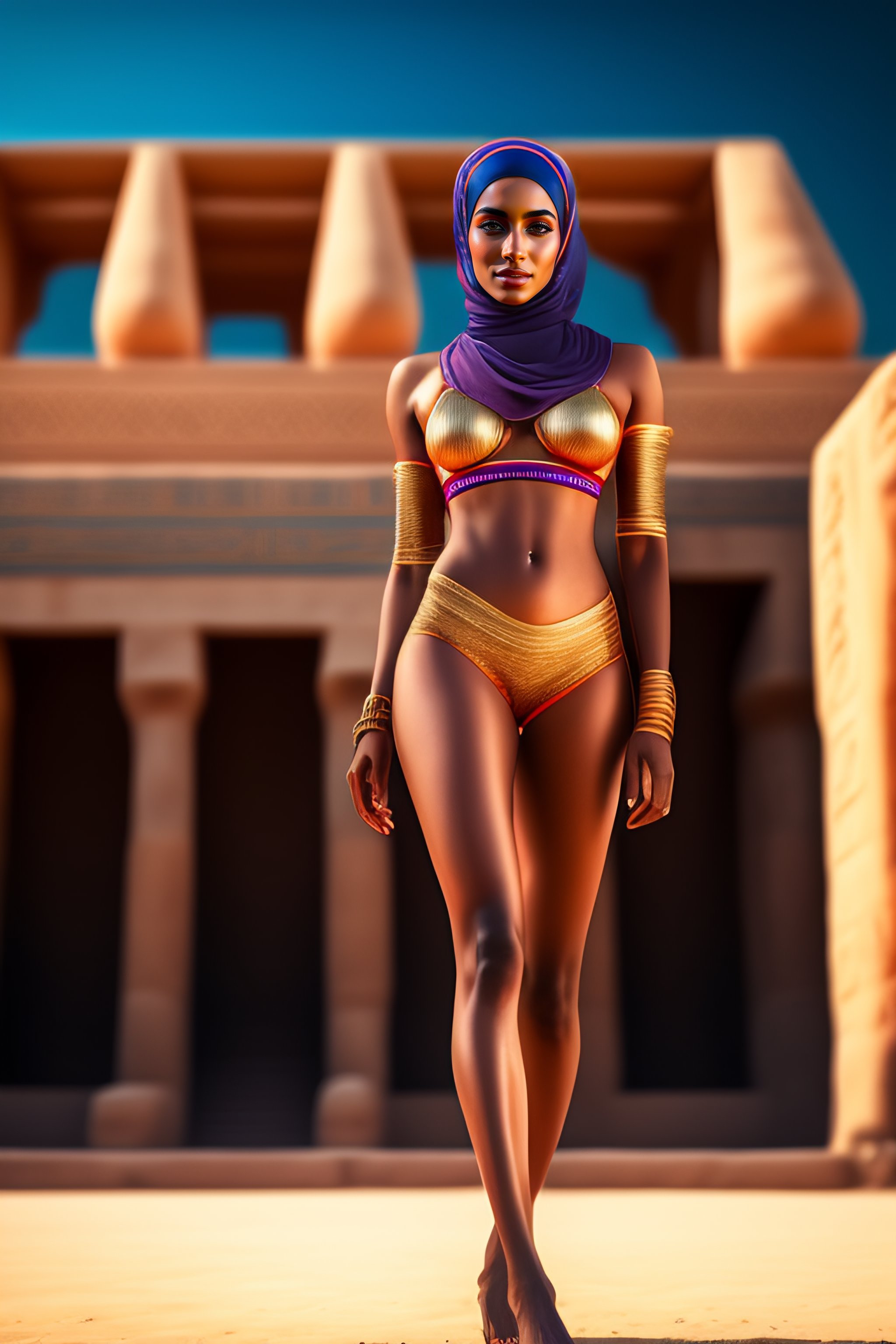 Realistic full body portrait of 18 year old muslim women wearing hijab in bikini at ancient egyptian city, realistic face, full legs, soft light, strong shadows, magic hour, detailed skin, beautiful, feminine, 8k, unreal engine