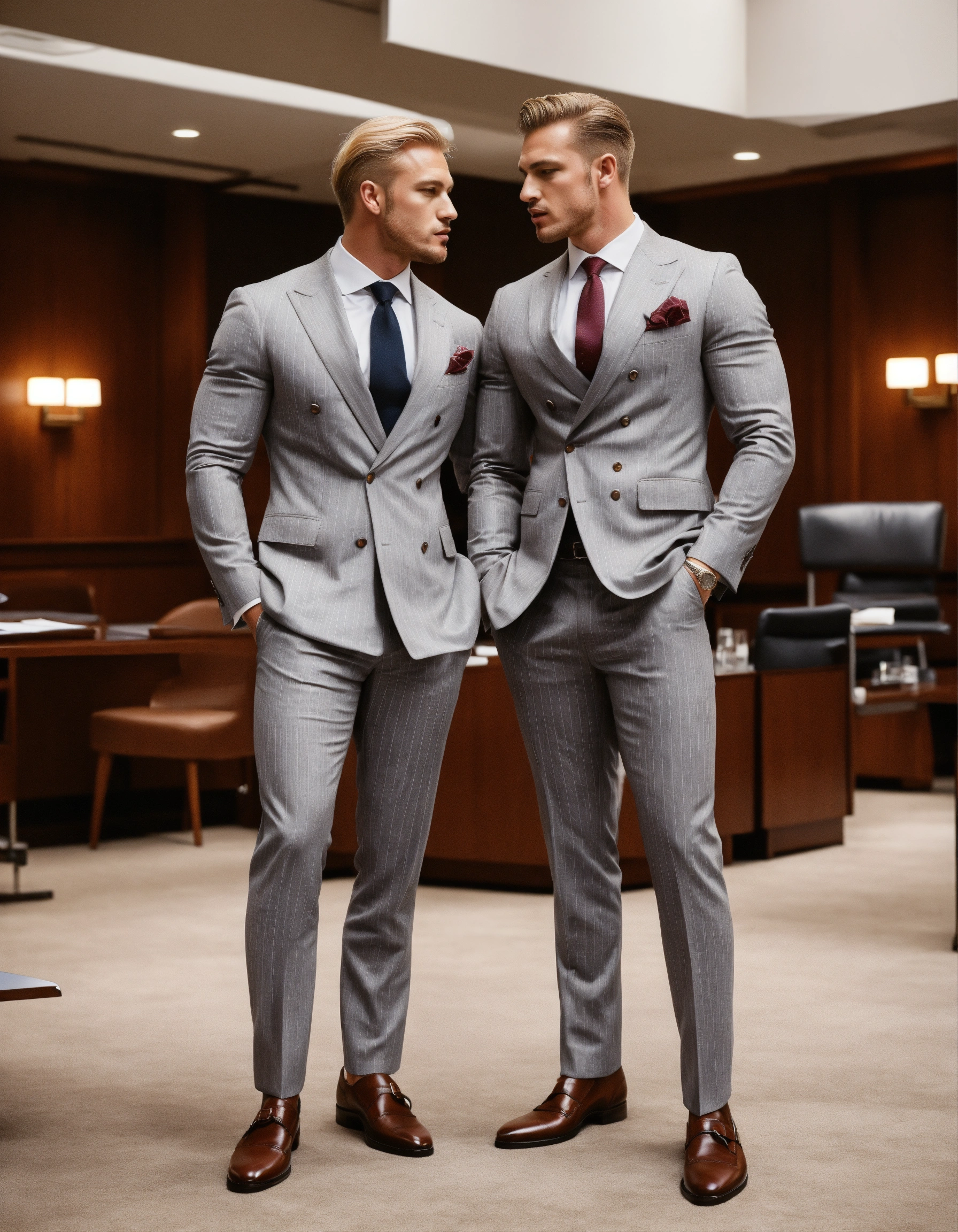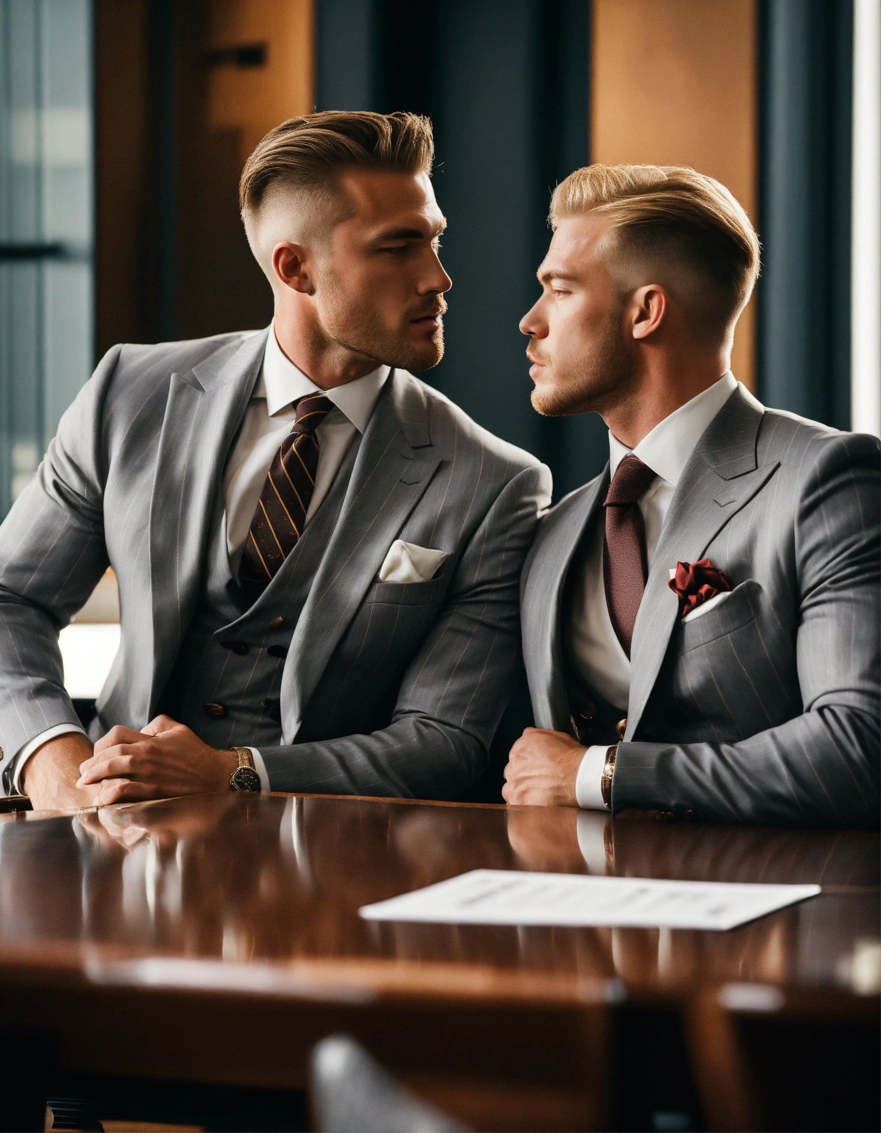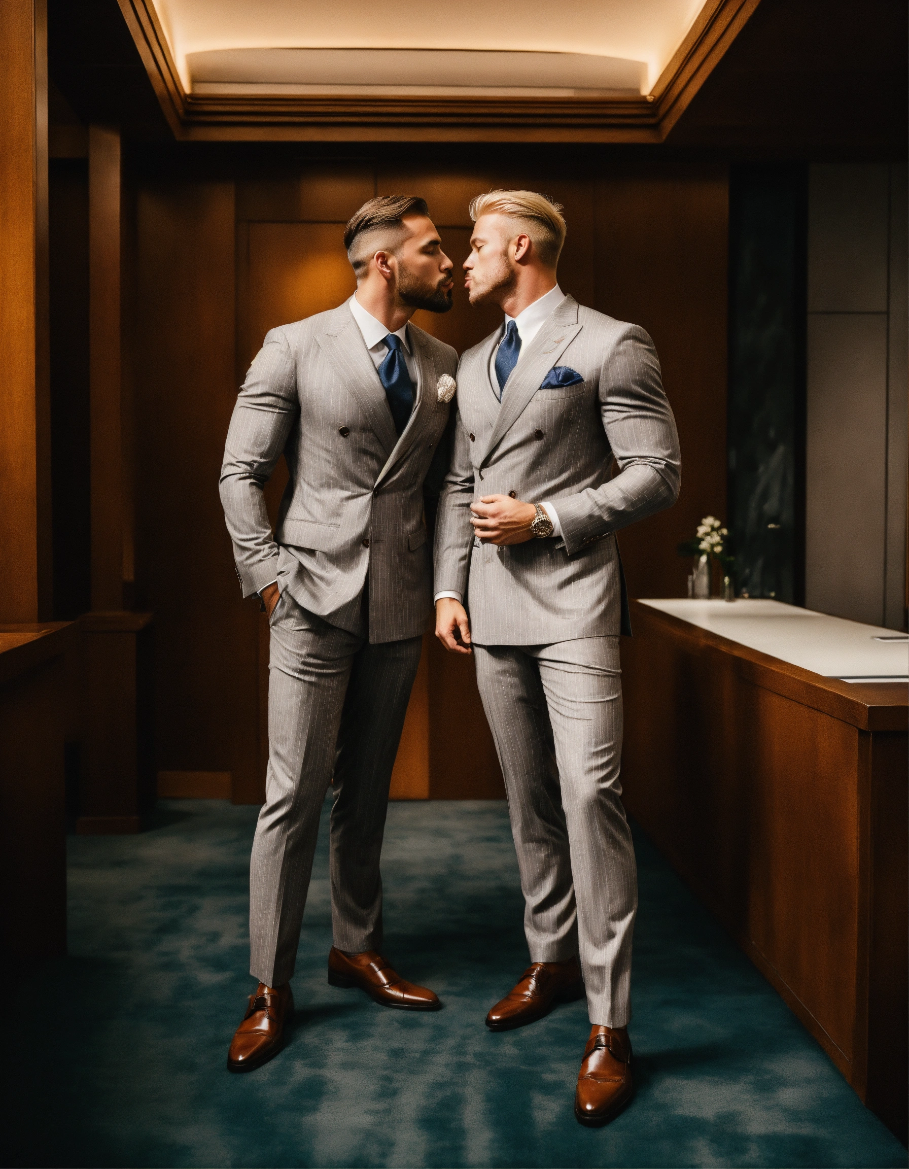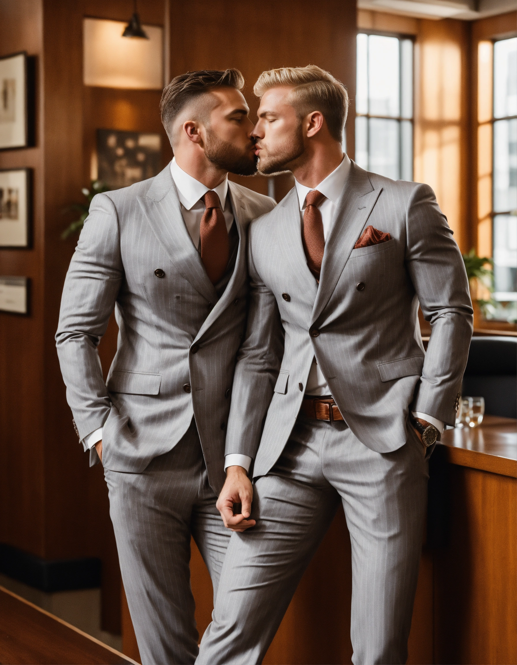 Two muscled blonde gentlemen, in light grey pinstripe double breasted suit, club tie, brown monkstrap shoes, kissing in the boardroom