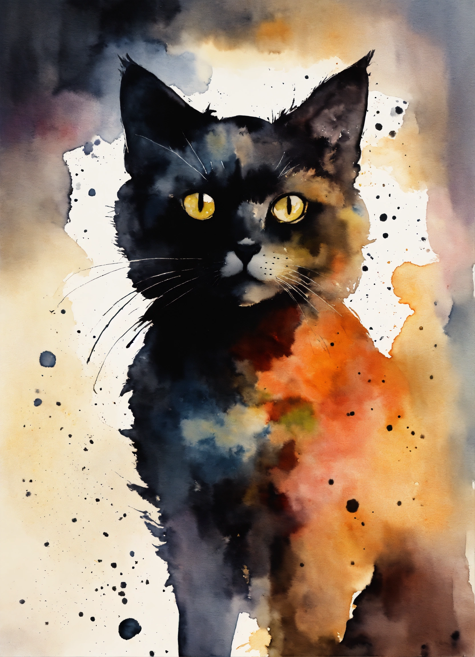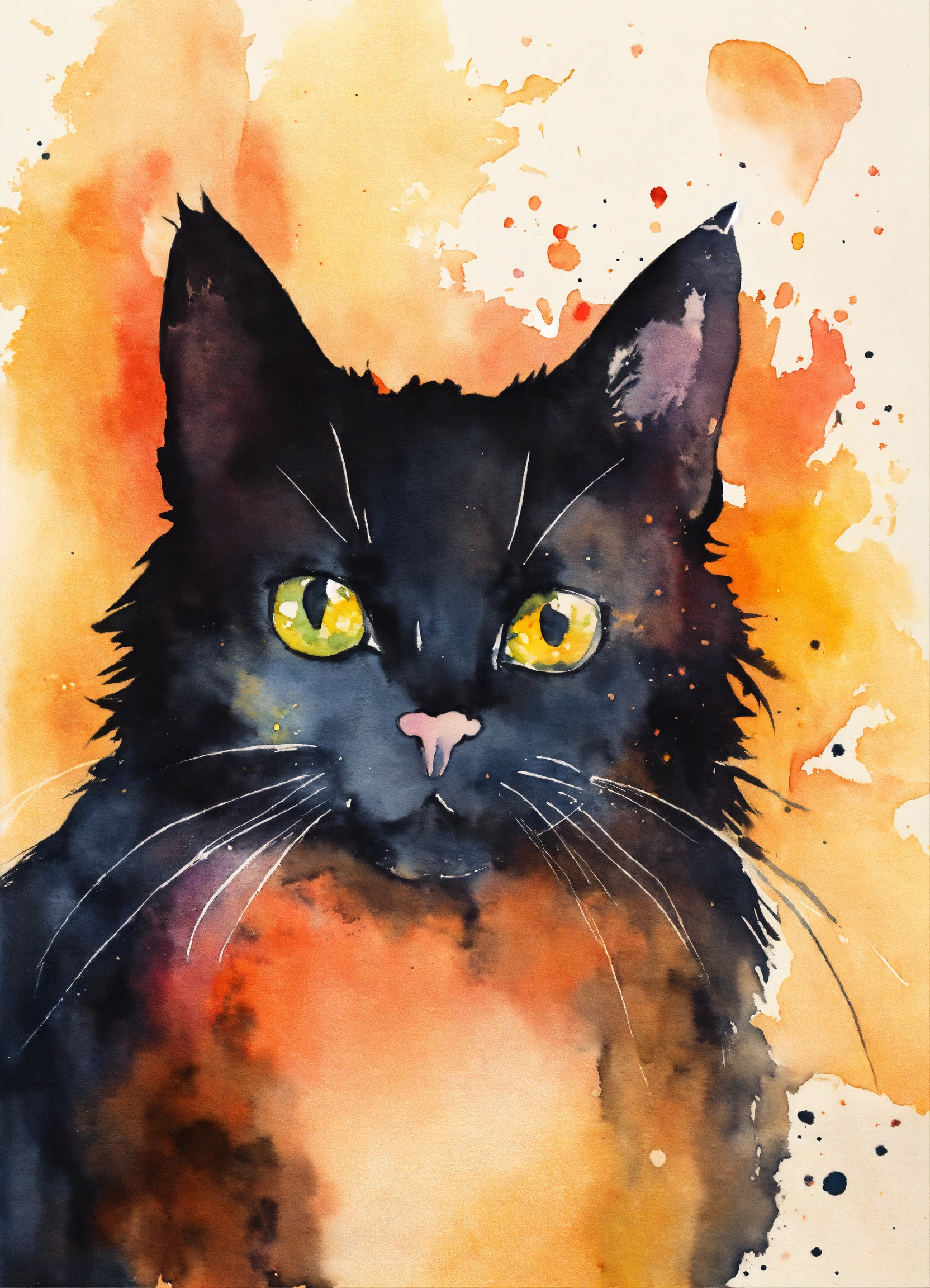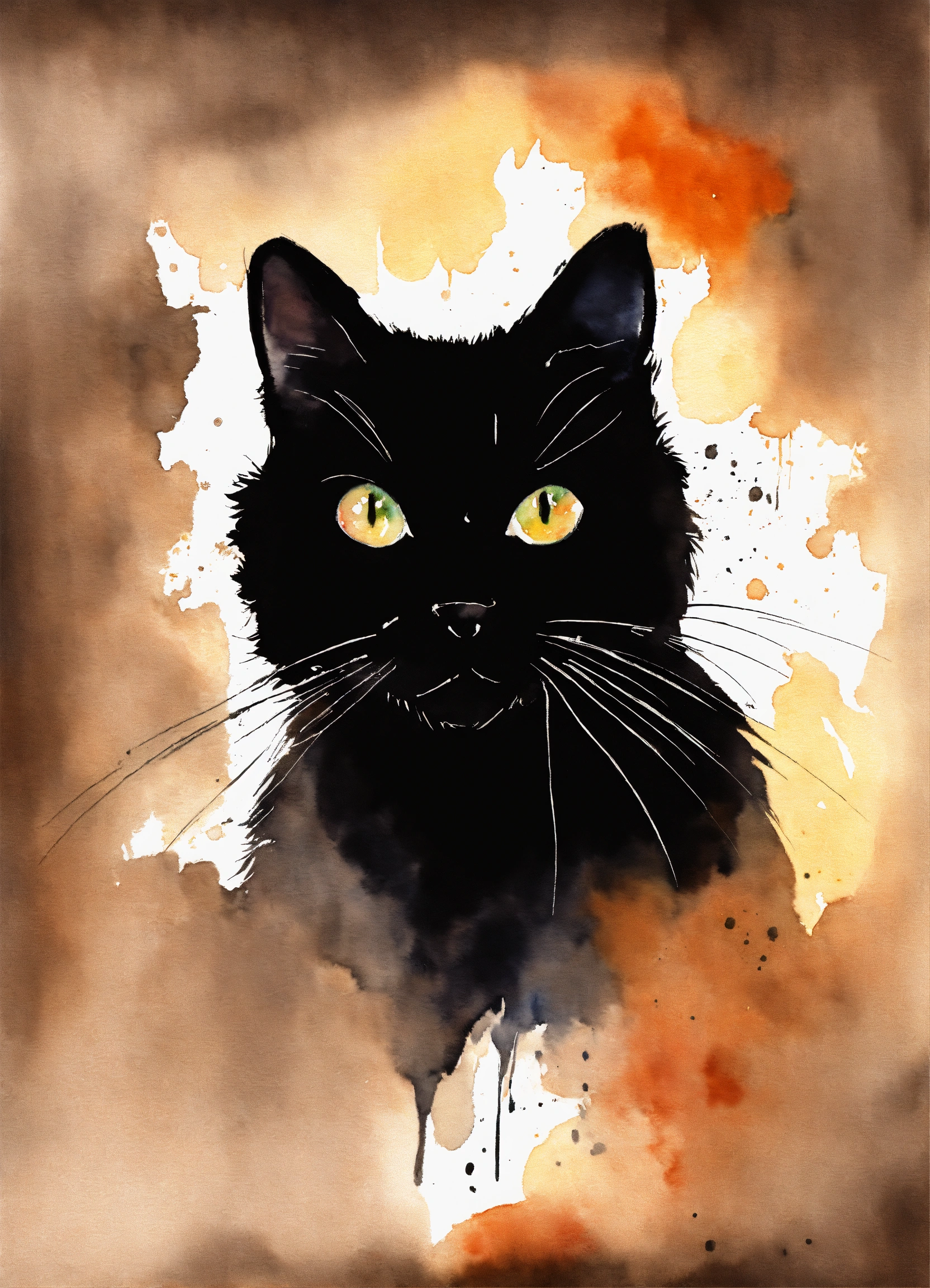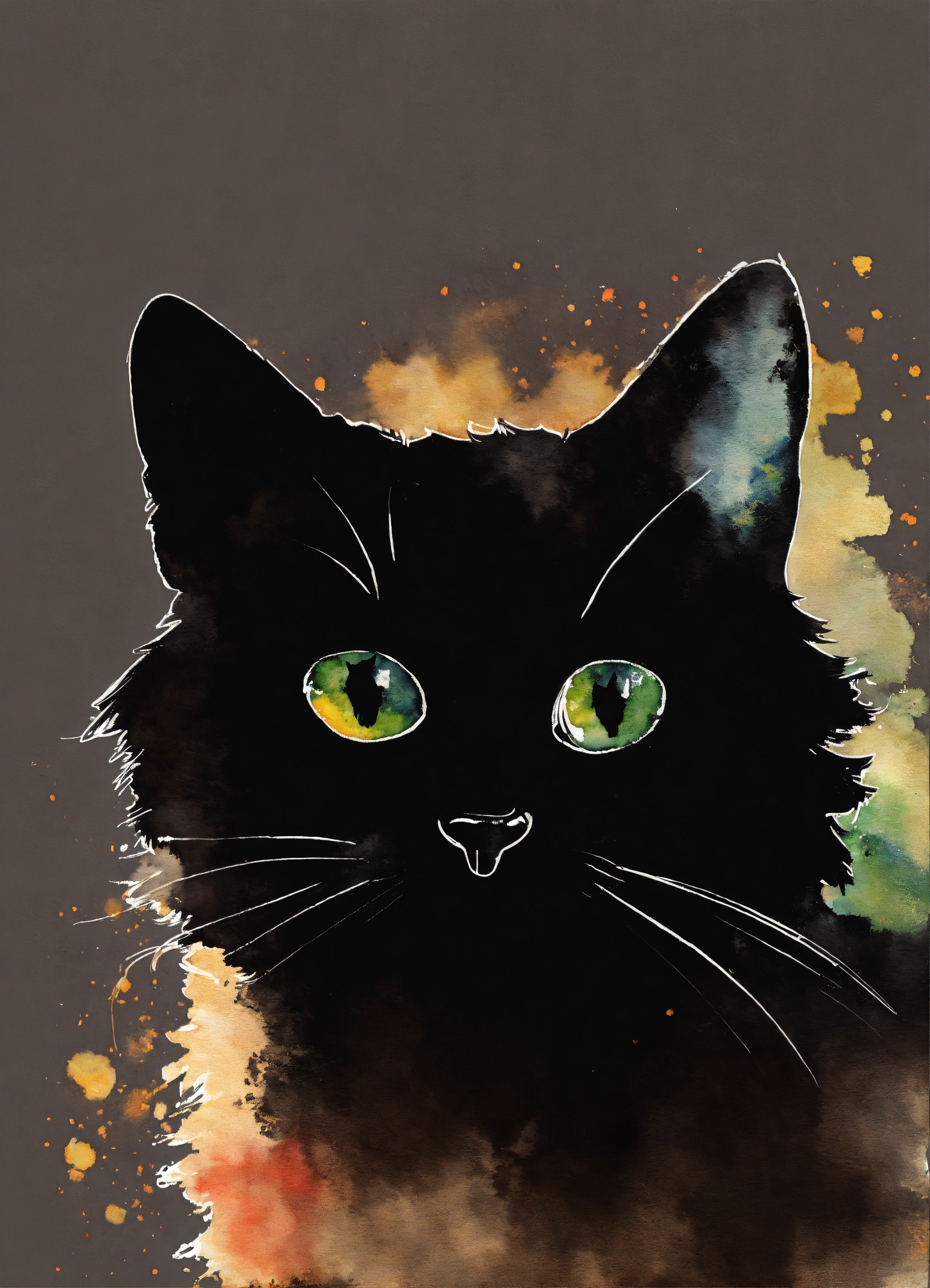 A watercolor black silhouette funny face cat