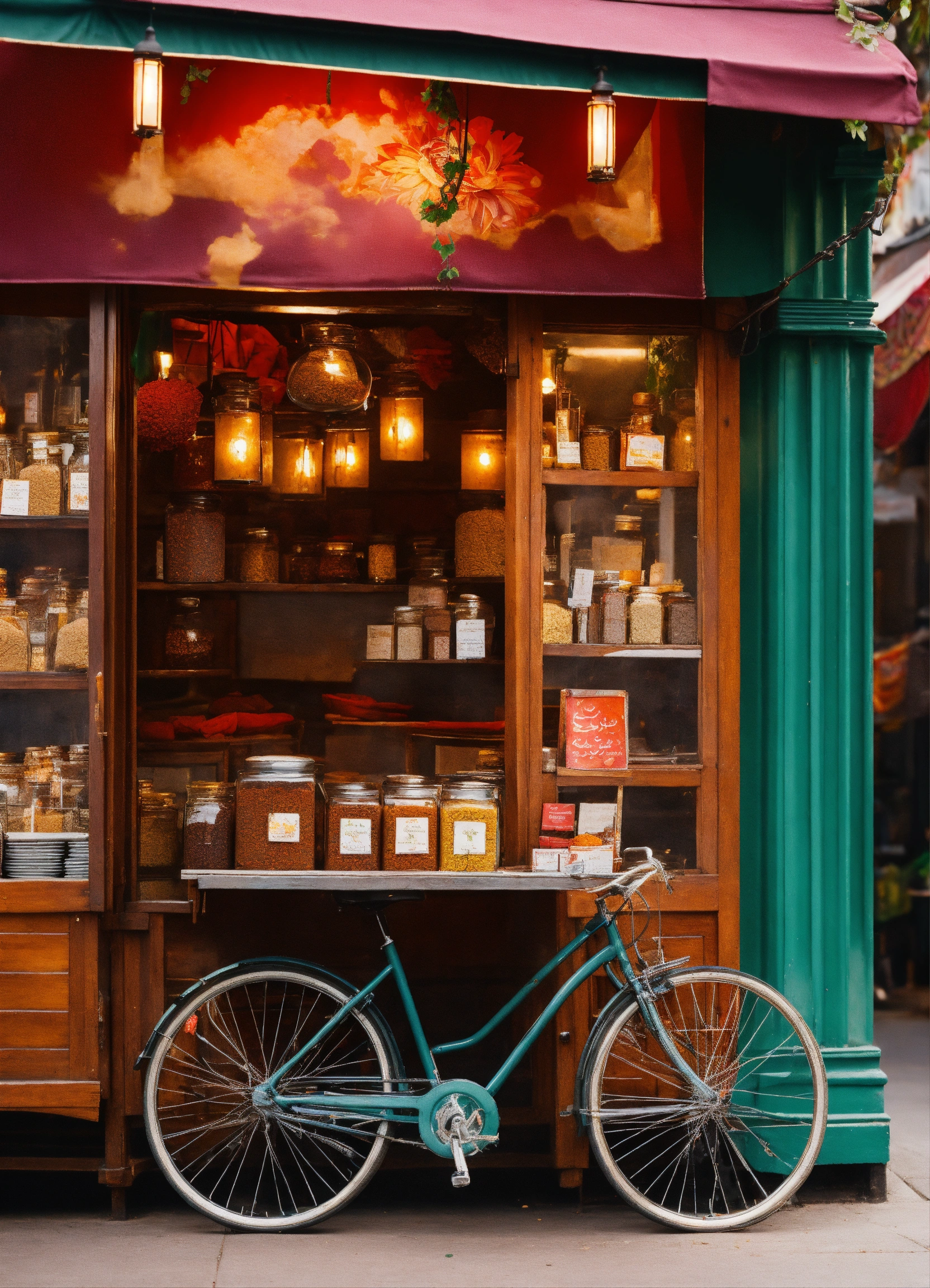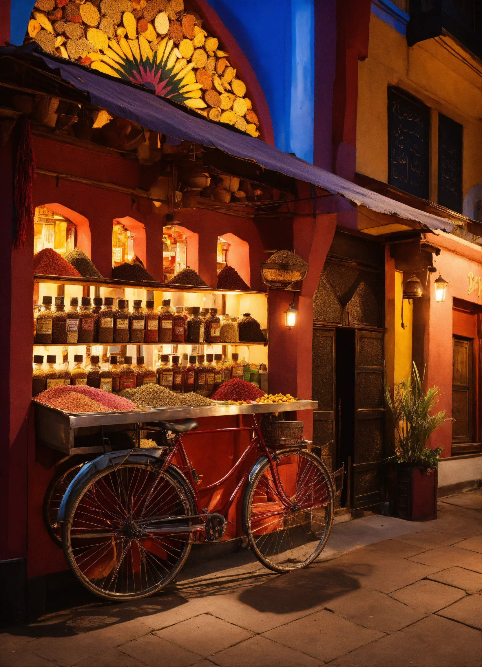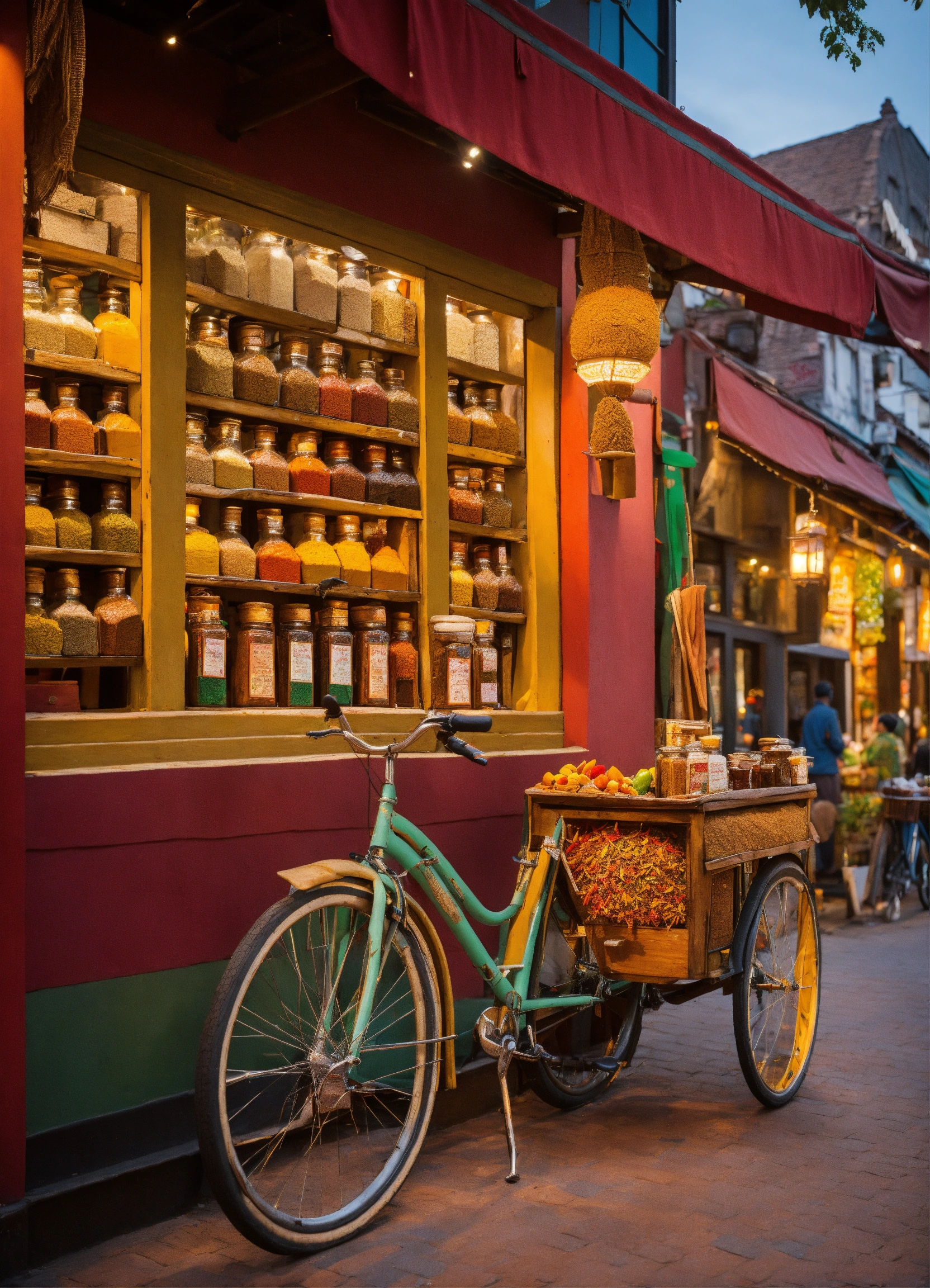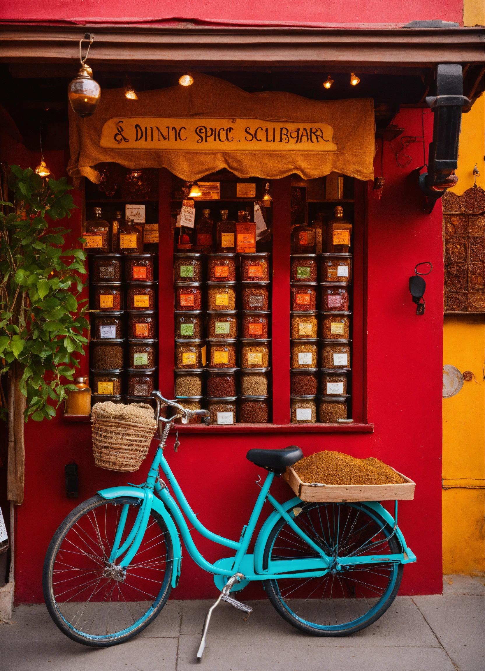 Indian restaurant exterior, a vibrant spice bazaar theme, a bicycle with small cart where diners can purchase exotic spice blends and spiced oils, and even personalized spice consultations