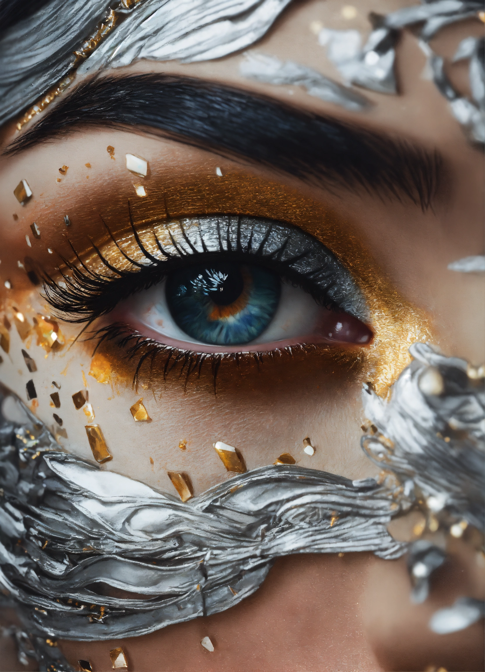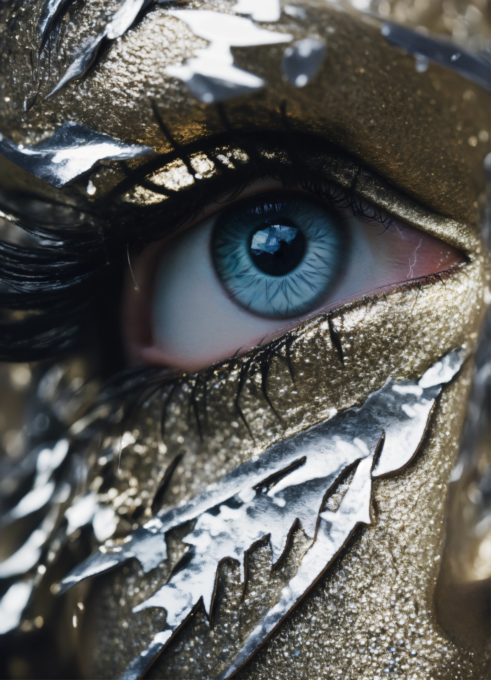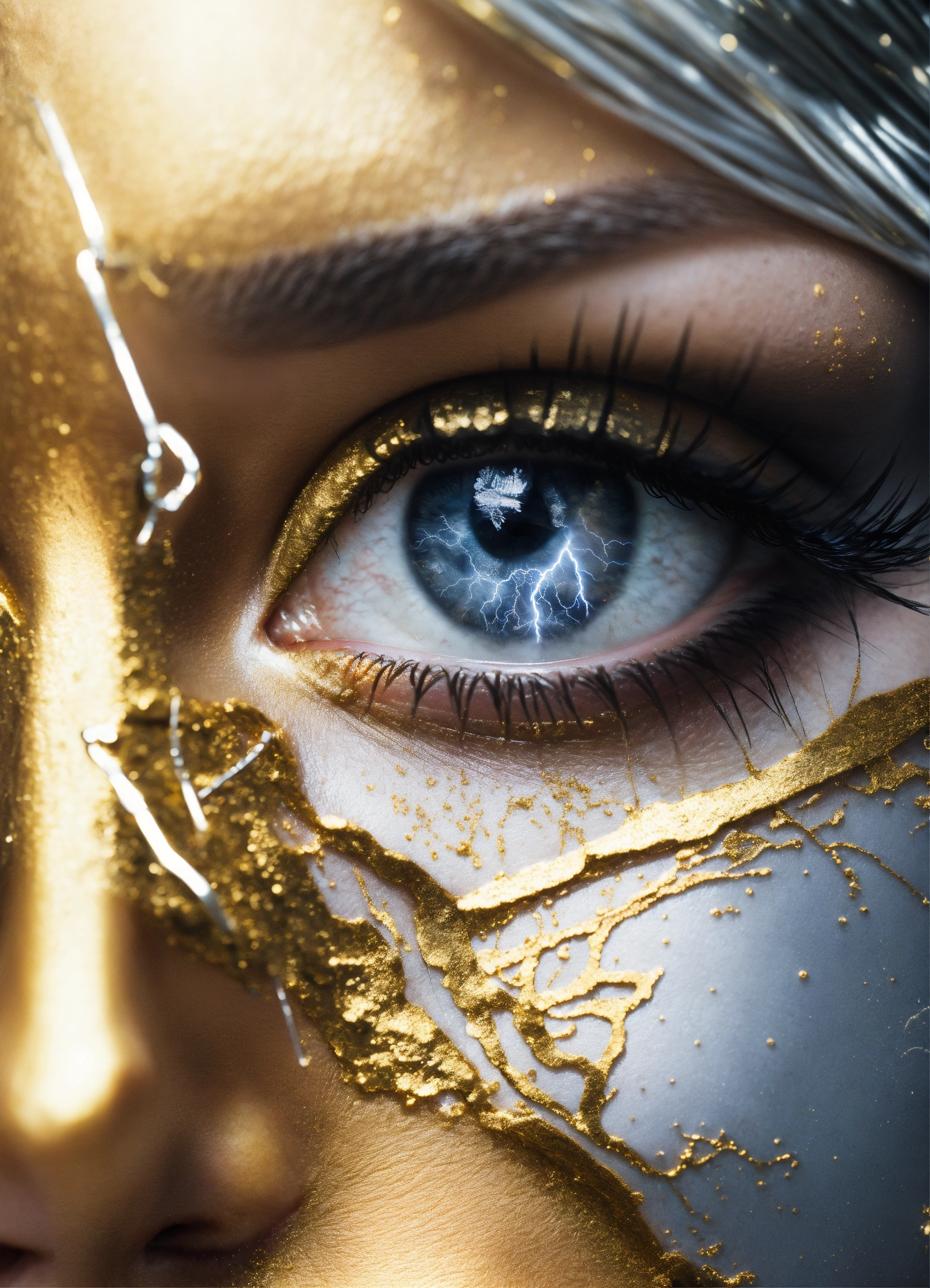A detailed woman's eye on de front, thunderstorm strikes with lightning, calligraphy, metallic silver