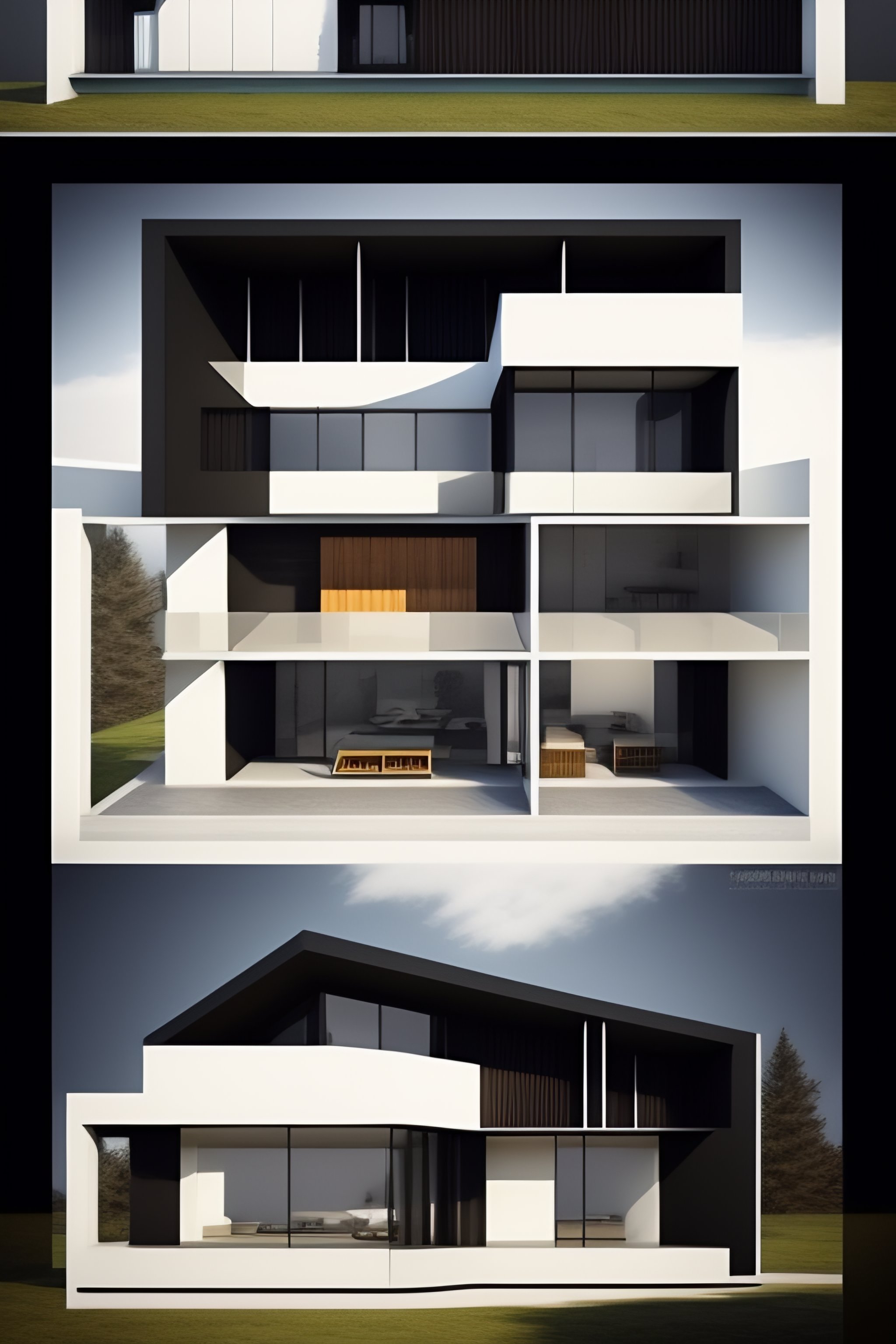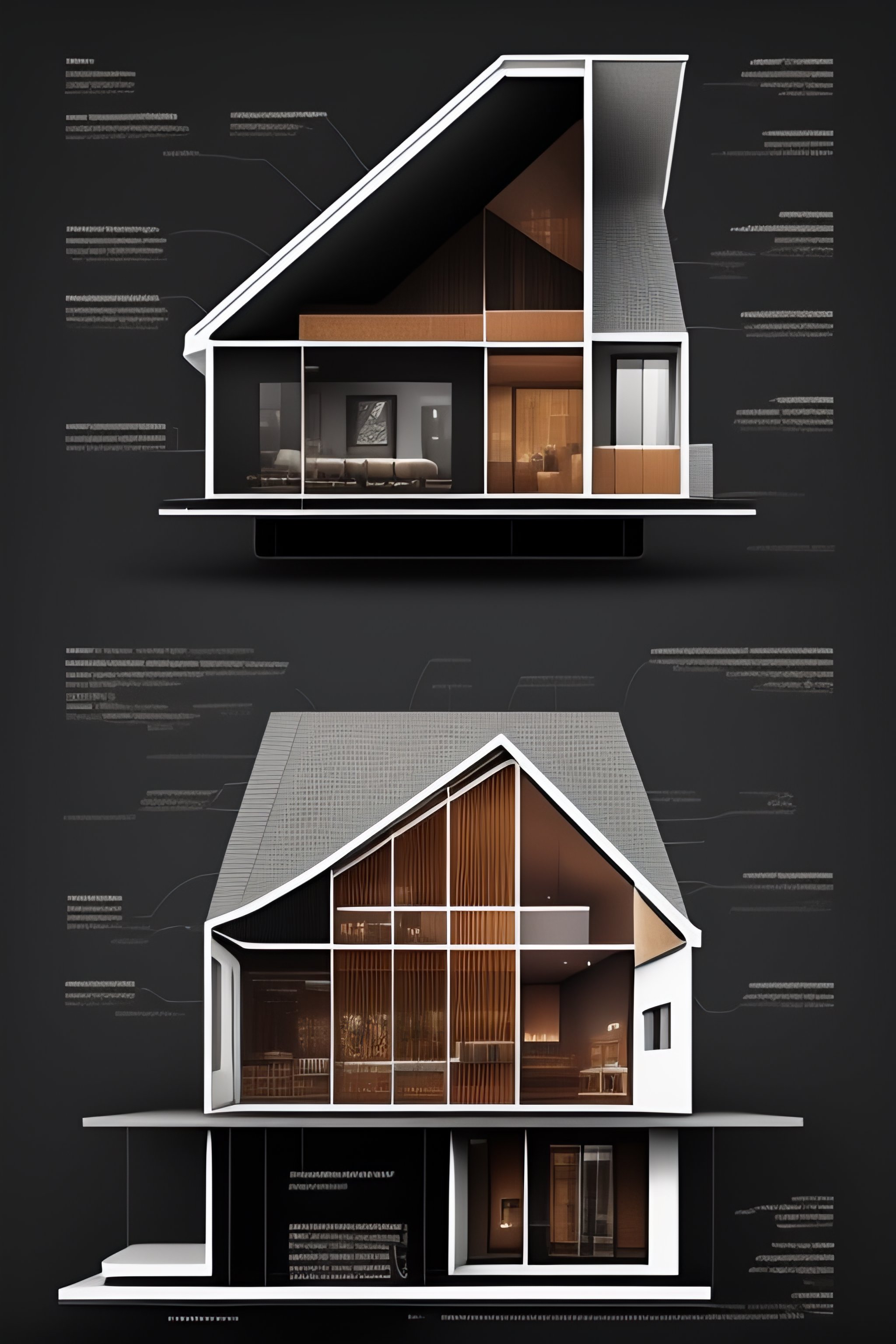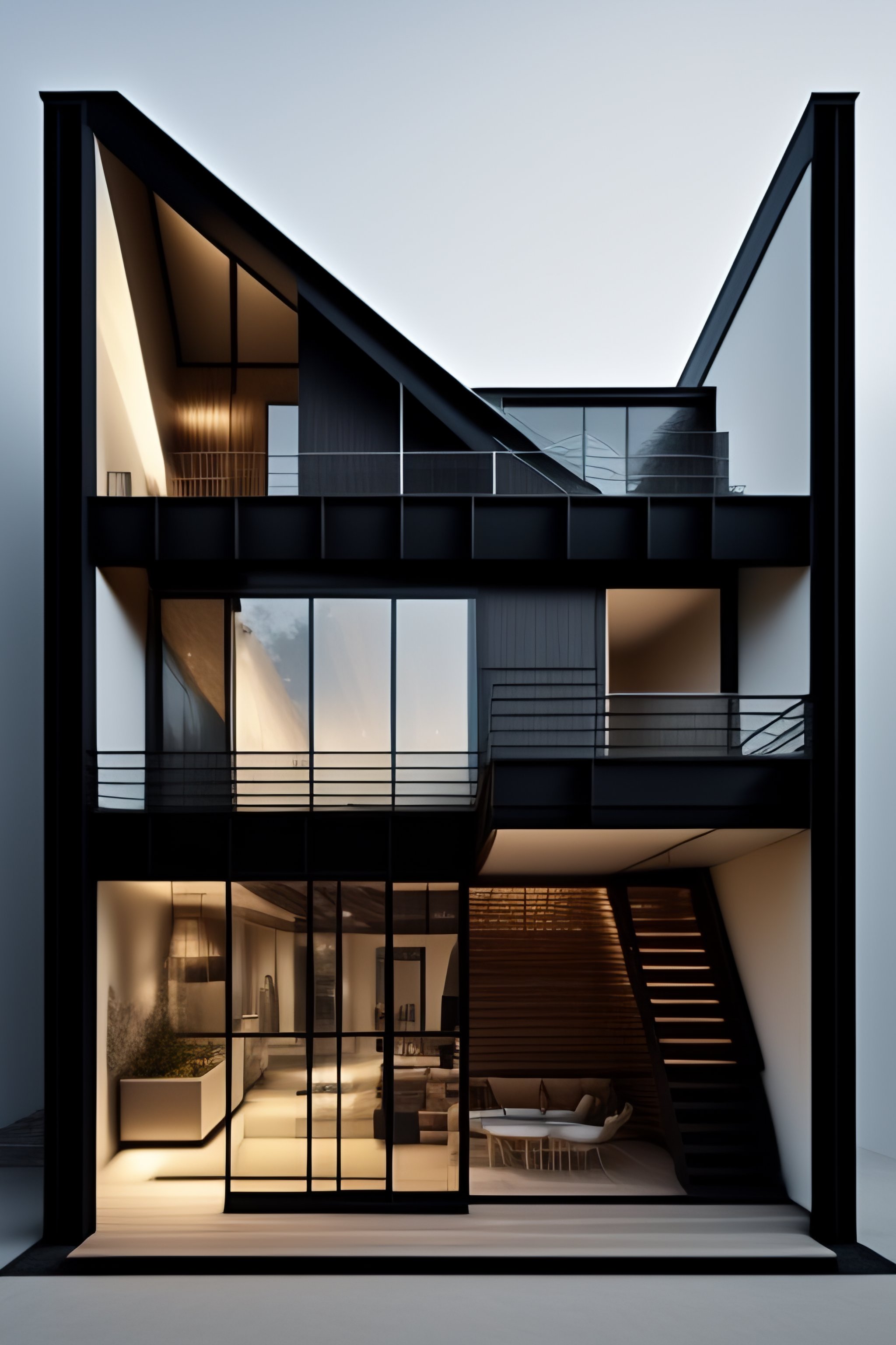 Architecture cross-section of a house made of black metal, diagram, technical drawing, stunning design