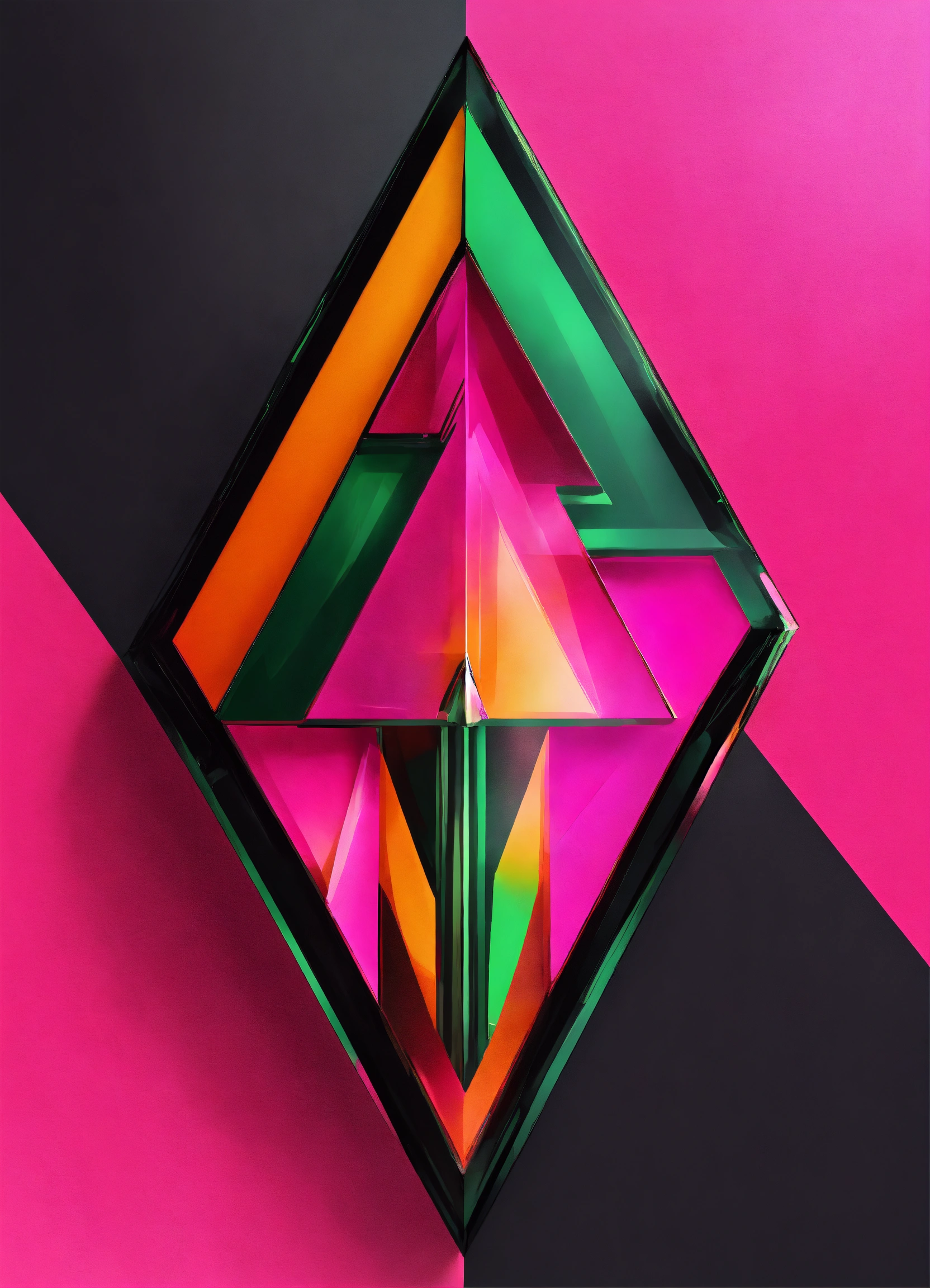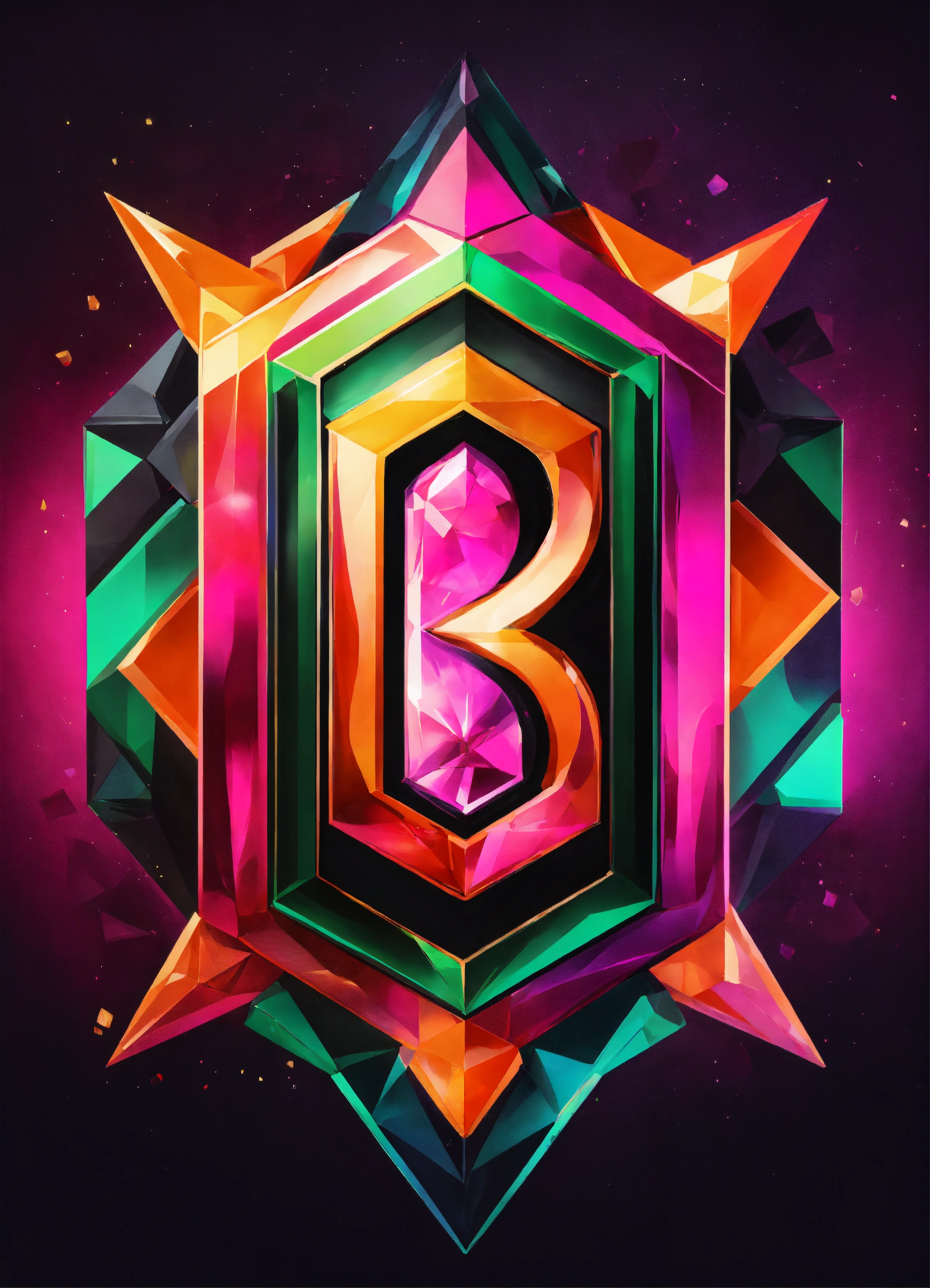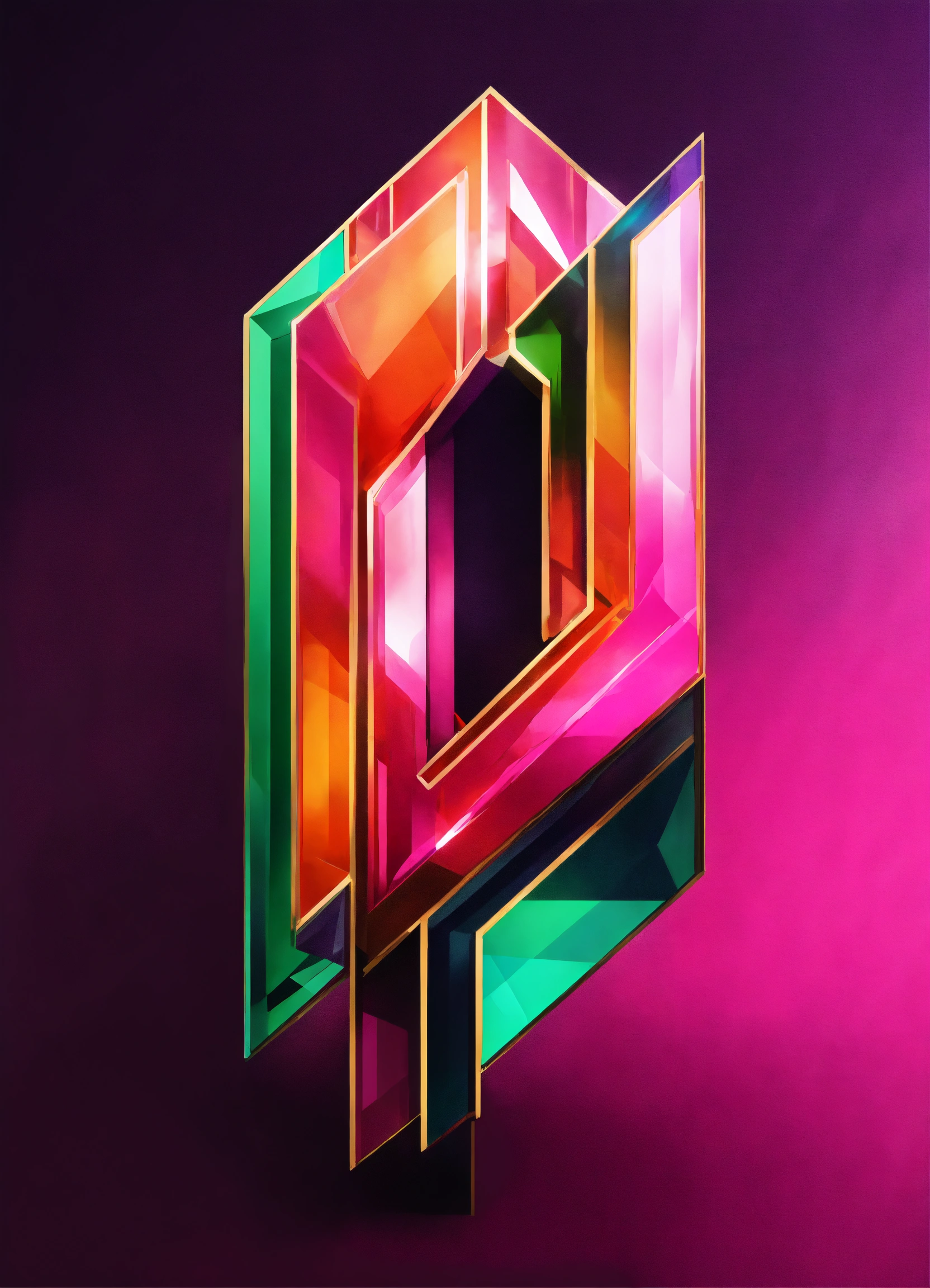 Emblem business logo with a vertical letters rectangle shaped iconic symbolism . crystallized, made with colors of fushia, bright orange, and electric green, black, classy, modern, feminine 8k, hd, intricate