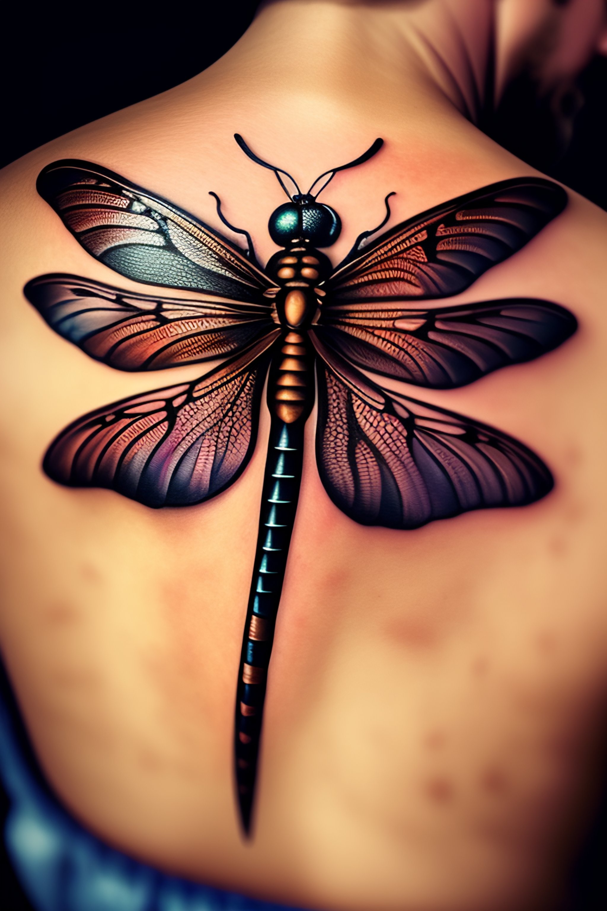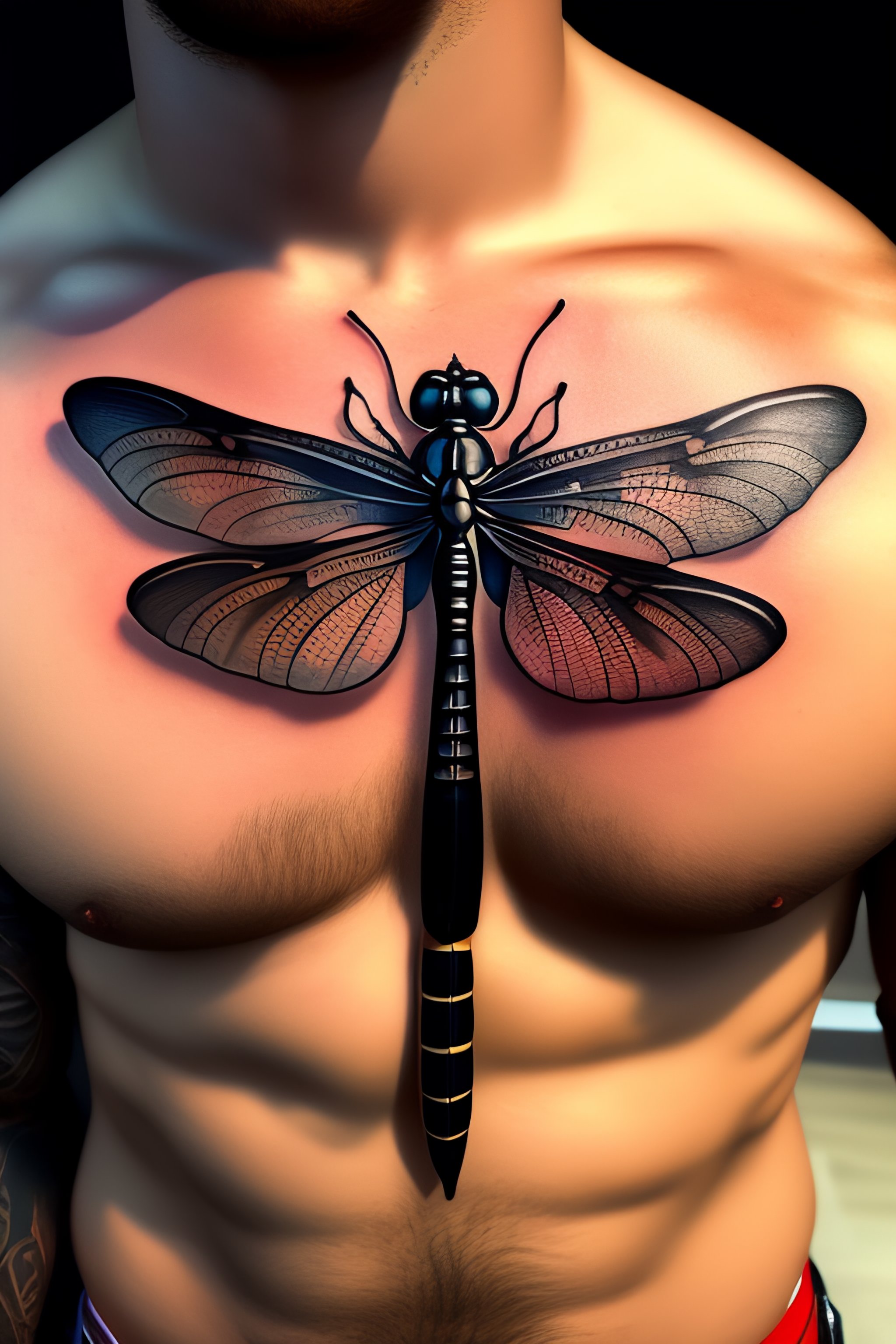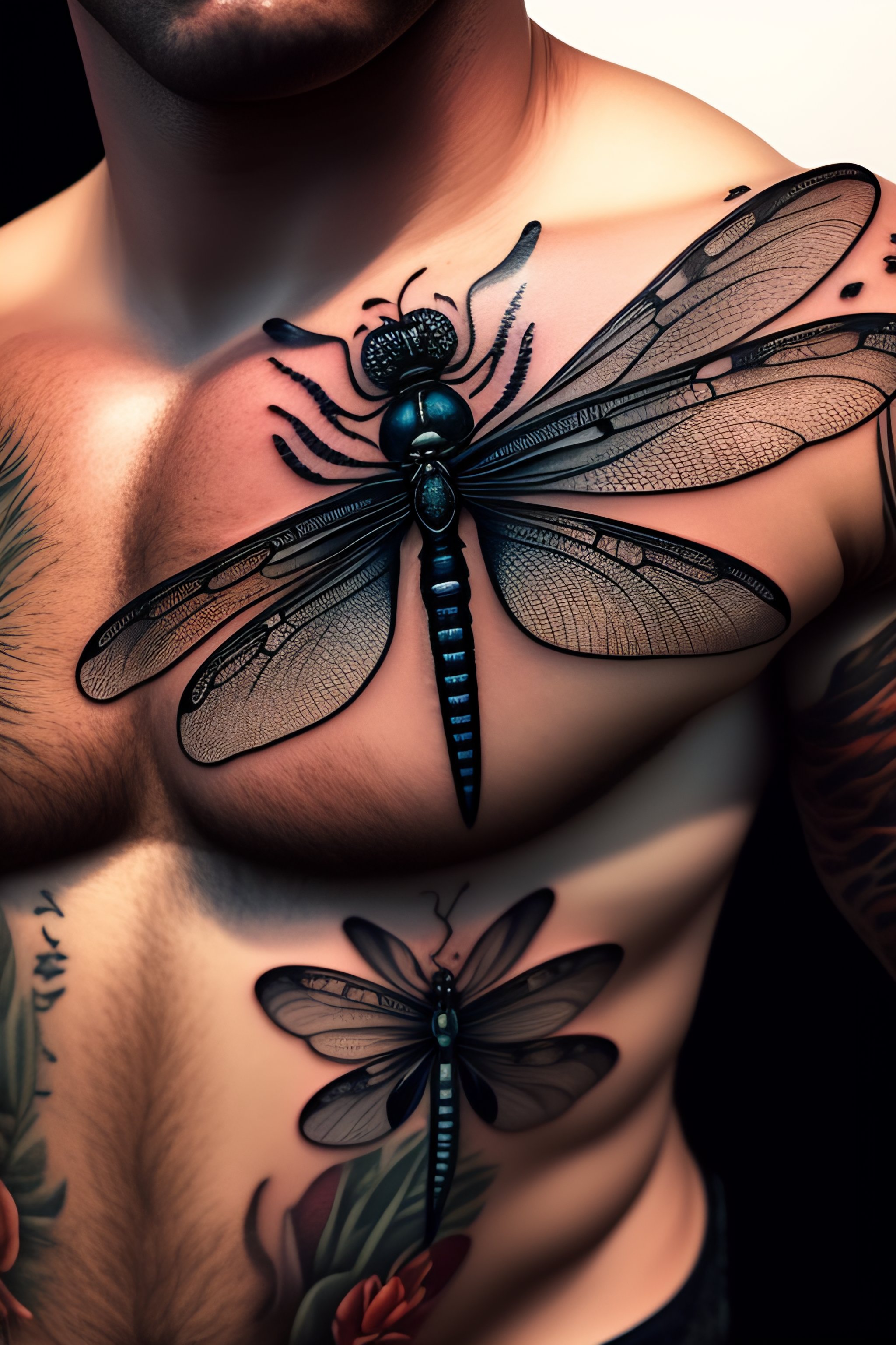 A detailed tattoo sketch of what looks like a dragonfly in the center of a man's chest, 4k, illustration, sharp focus