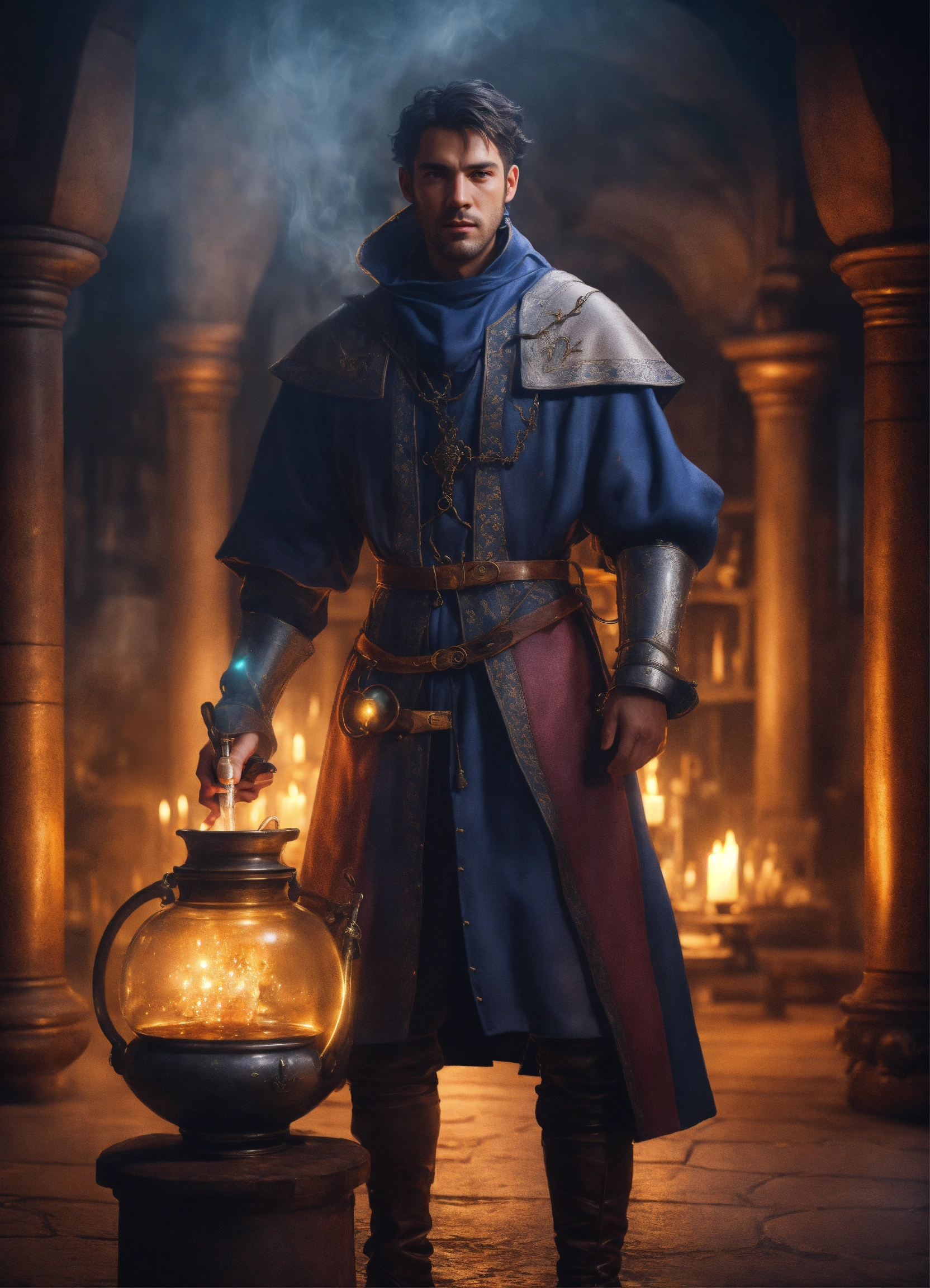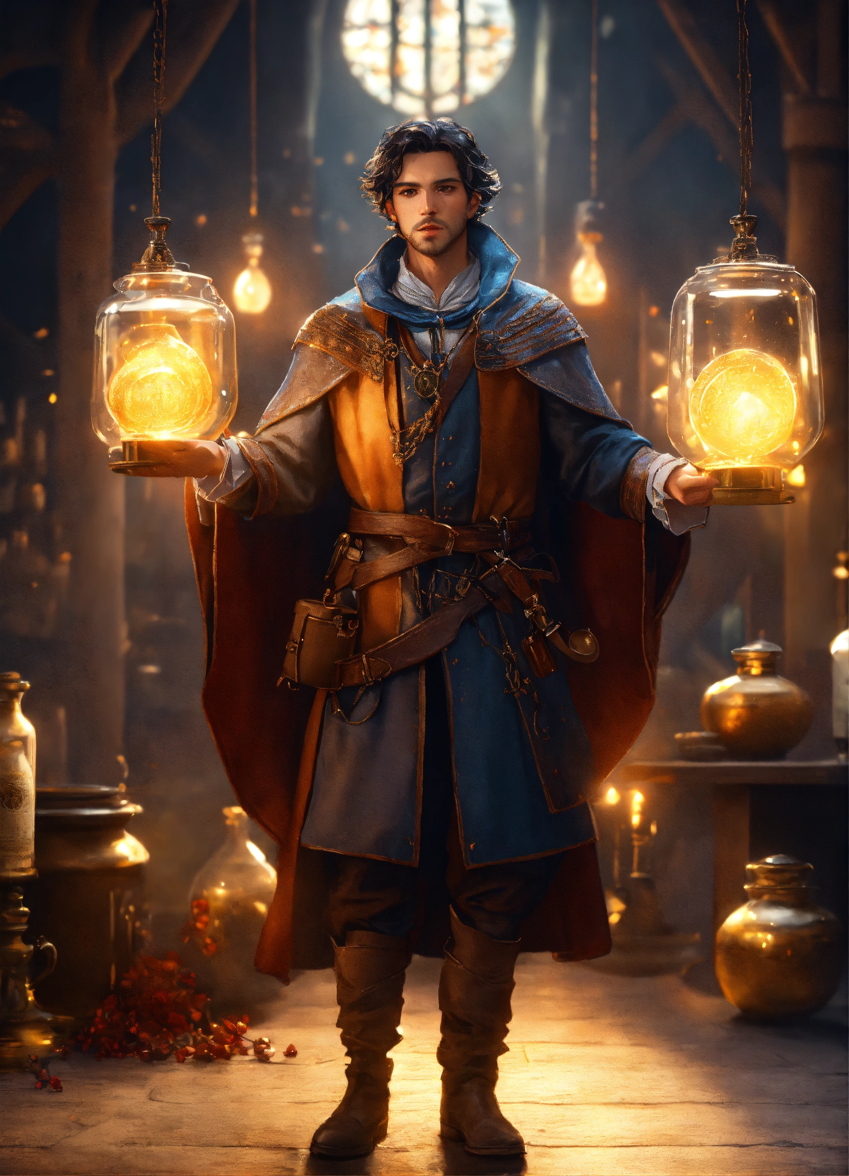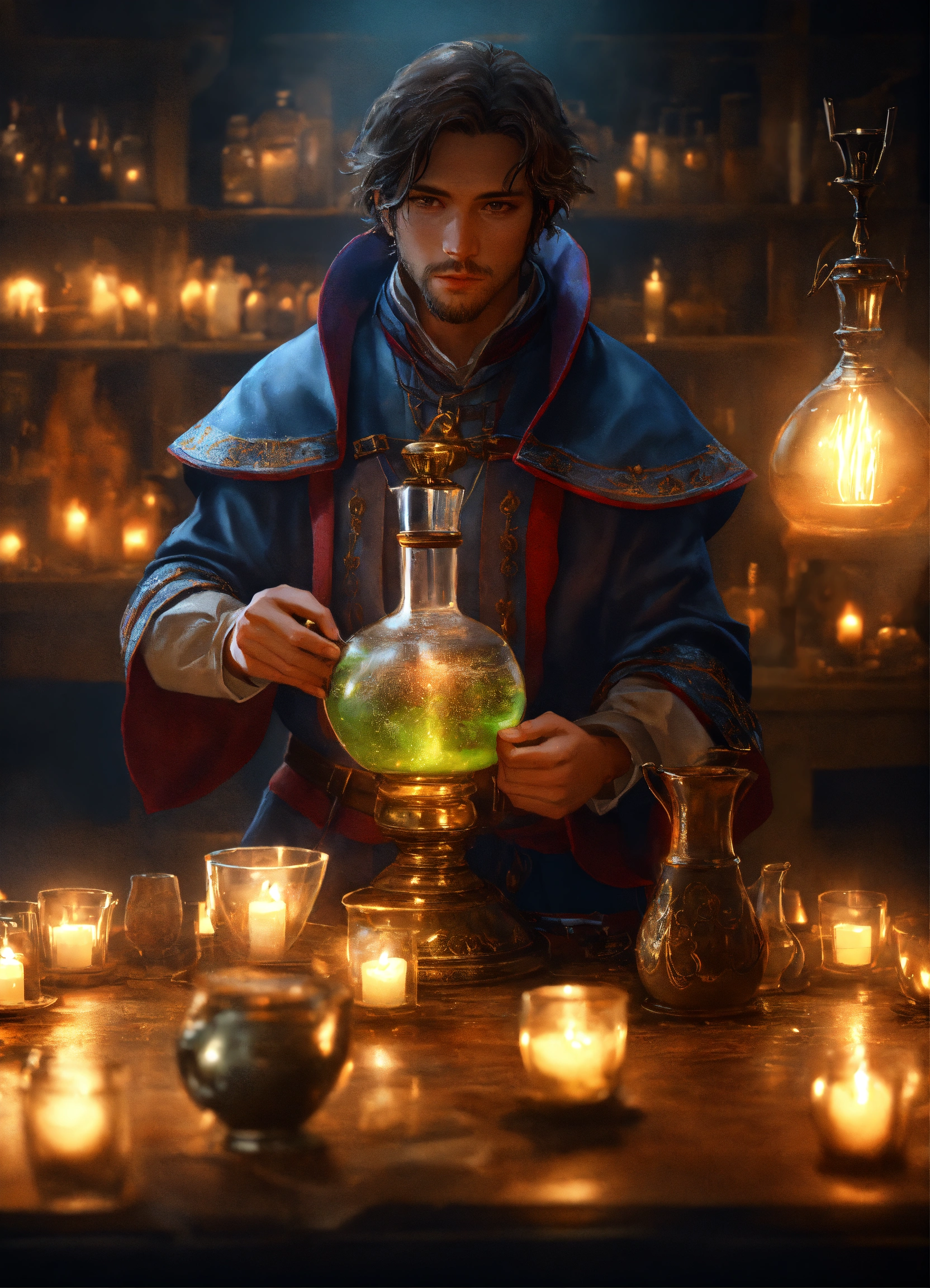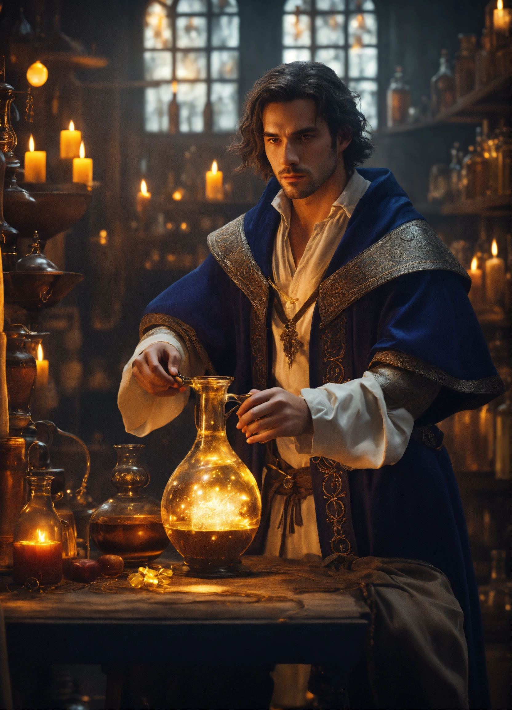 A realistic full body portrait of a medival male alchemist, magic potion, neutral background, moody, photorealistic, cinematic scene, super detailed, hyper realistic, bright lights, 8 k