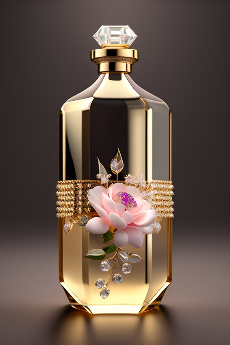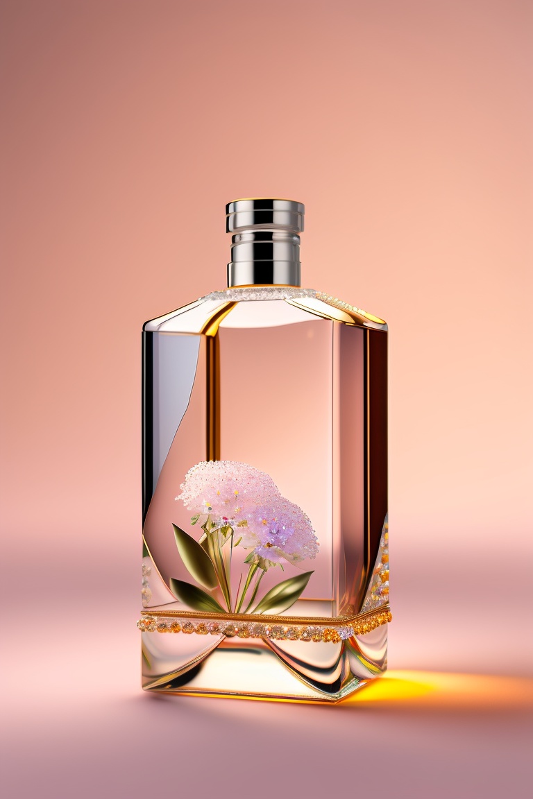 A magnificent transparent chiseled perfume bottle., topped with a clear glass jewel-like octagonal, adorned with small roses, small magnolias, and gypsophila. high definition. inspired by dior. studio lighting.