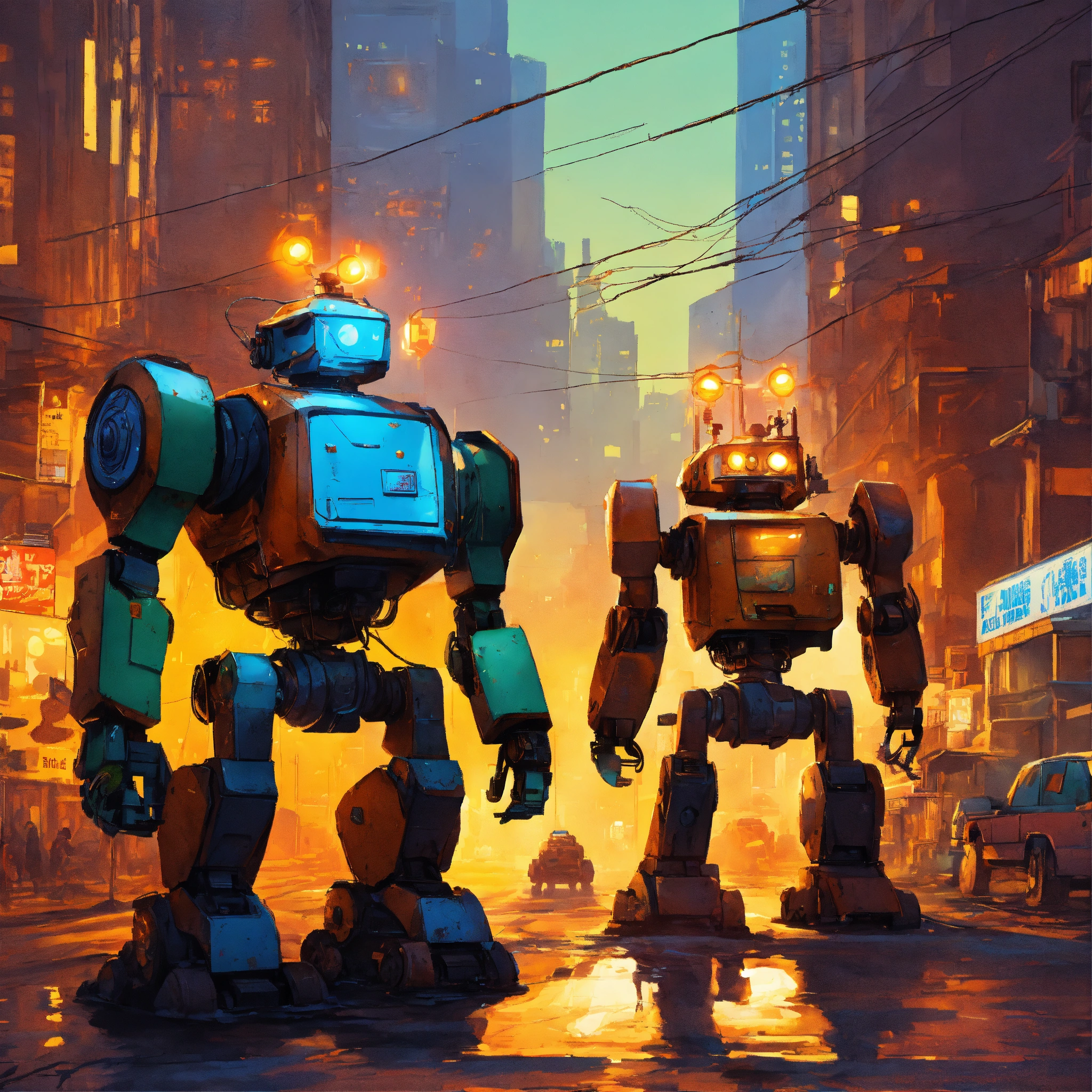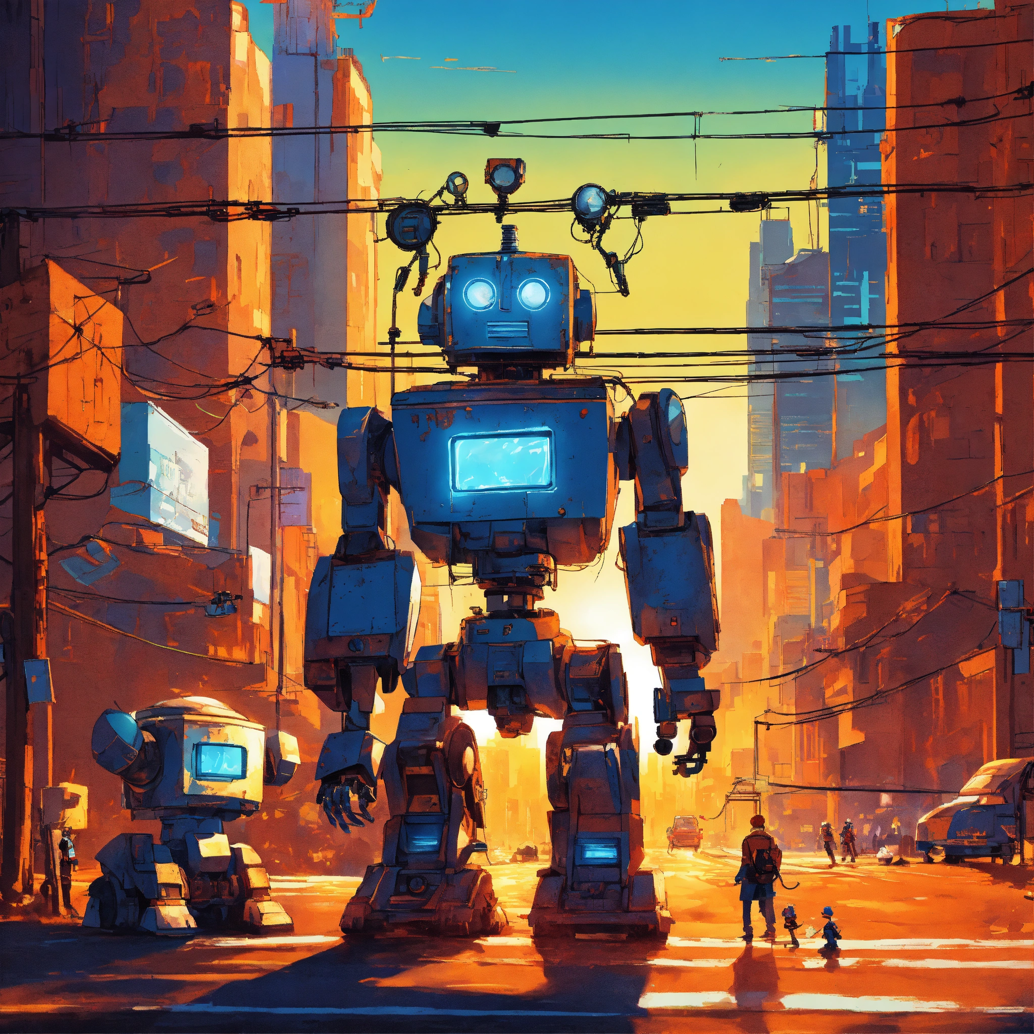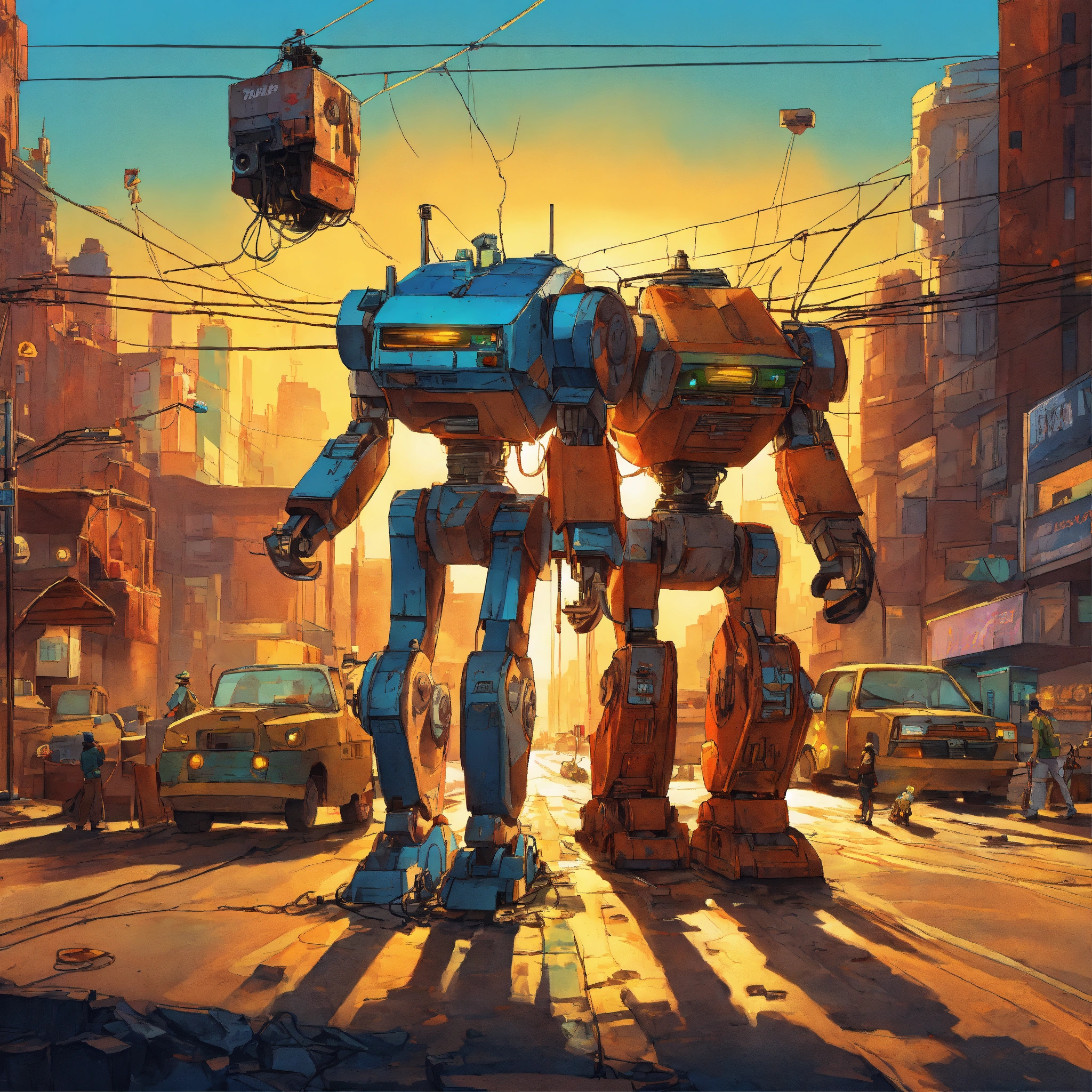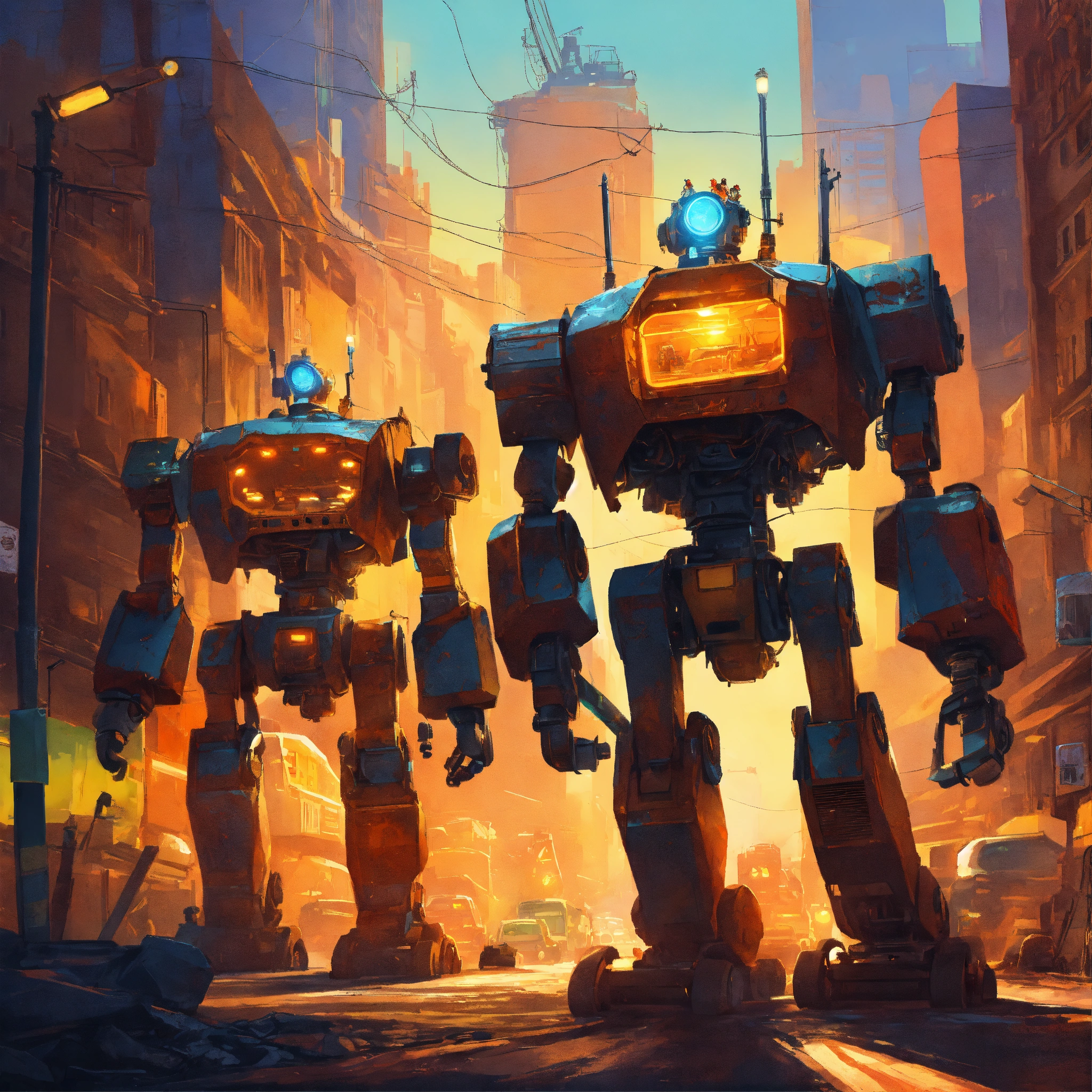 Generate a vibrant, cartoon-style poster showing two massive, rugged robots with light-capped miners' helmets repairing a road, juxtaposed with lively city traffic. their worn, rusted exteriors and exposed wiring are vividly lit by streaming sunlight, emphasizing their grandeur and the city's frenetic energy.