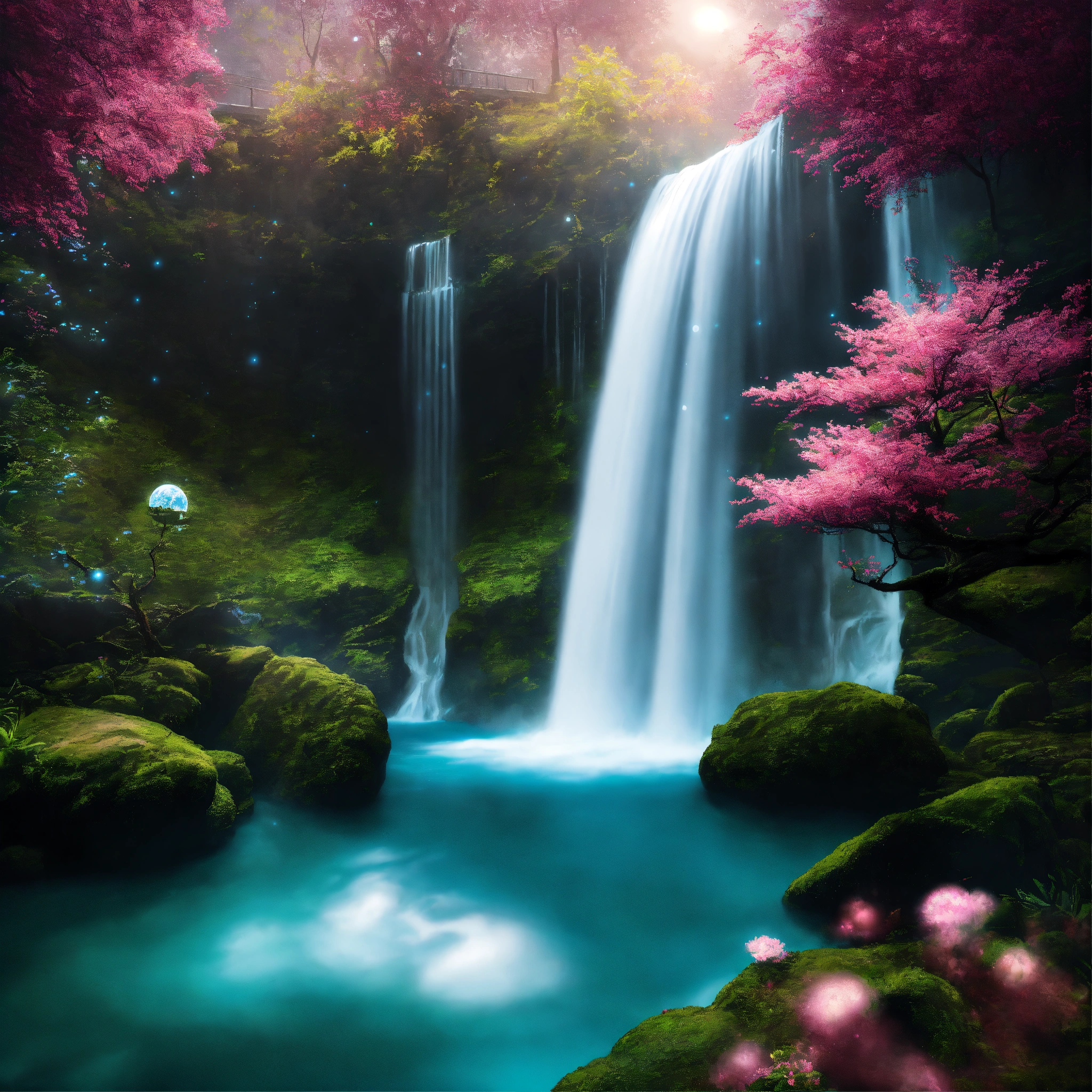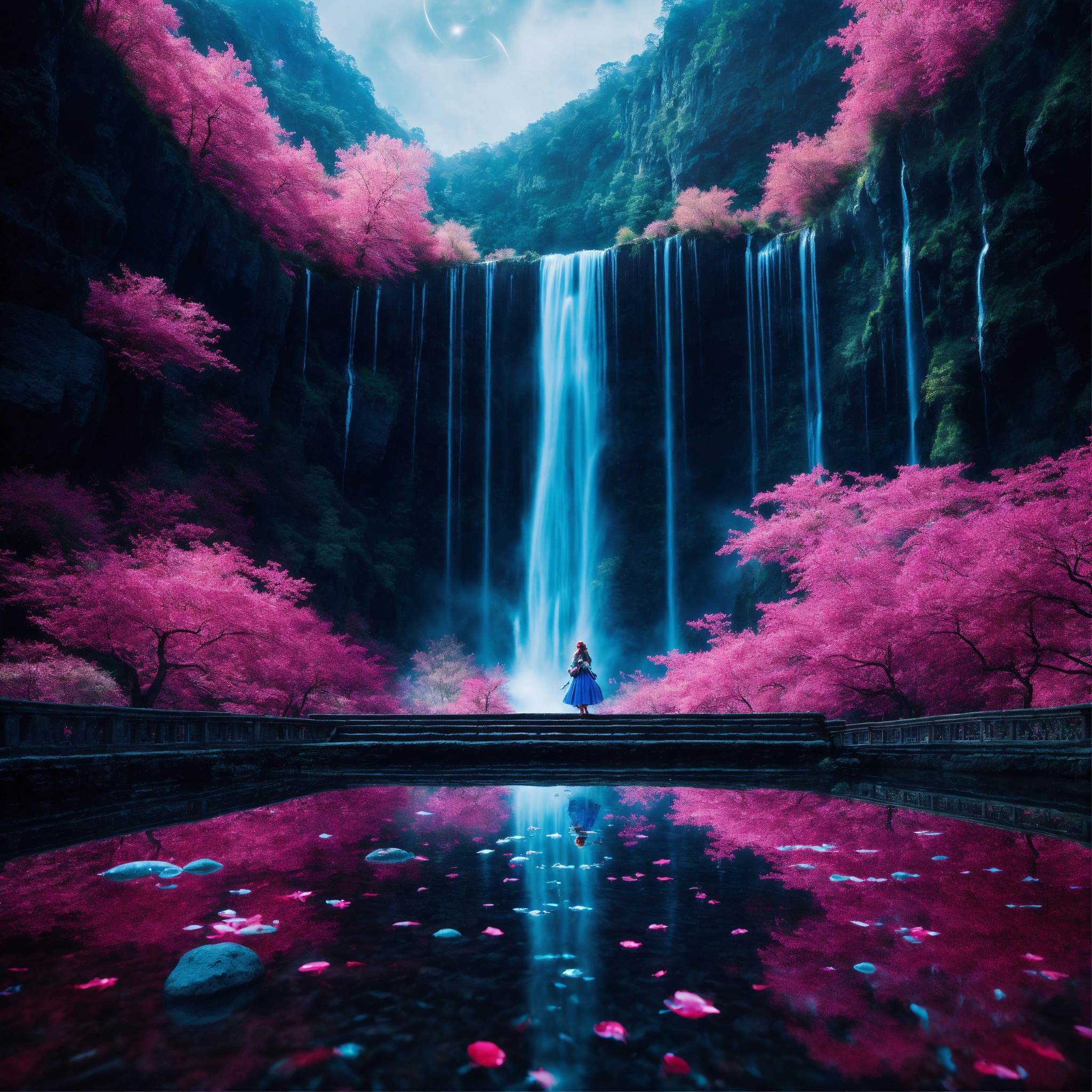 Underwater long exposure photography, a giant white waterfall with a bridge flying in the cosmos with orbs and portals, x-ray style, in the style of tim burton, lion king, the chronicles of narnia, beauty and the beast, and peter pan. with sacred geometric patterns on the body. enchanting aura. the chronicles of narnia, wizard of oz, and alice in wonderland background with snow mountains, and trees with pink leaves.