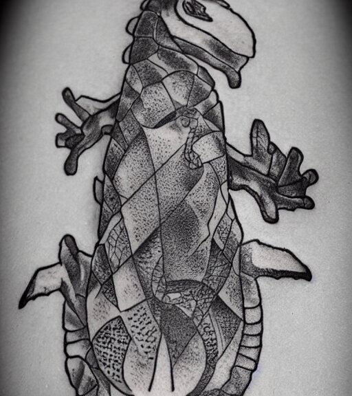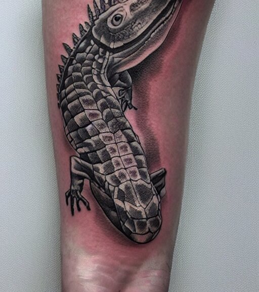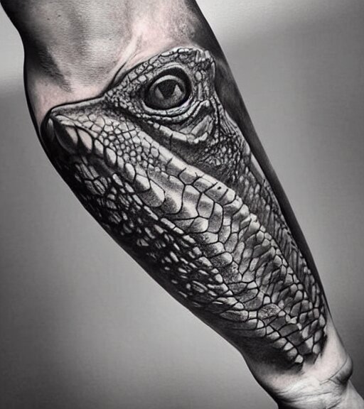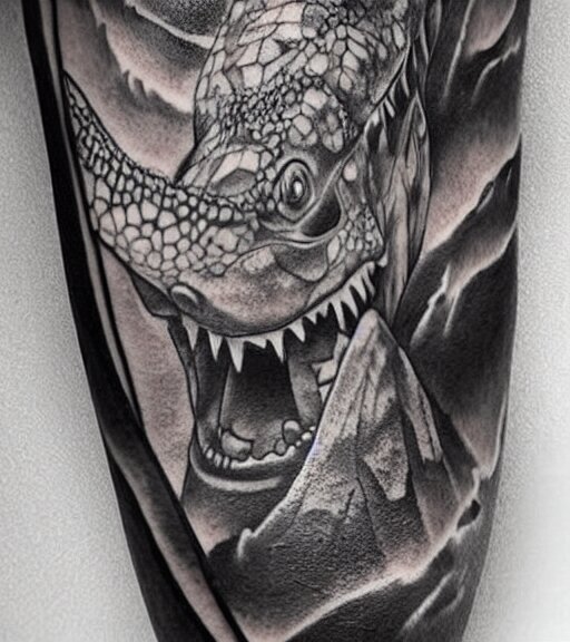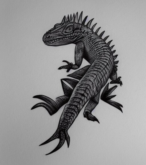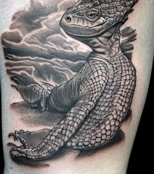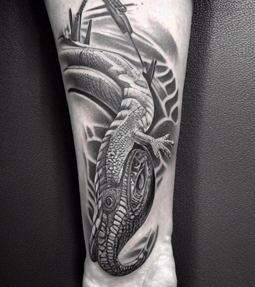 A realistic tattoo design of a giant lizard in the desert on white paper, realism tattoo design, highly detailed tattoo, shaded tattoo, hyper realistic tattoo