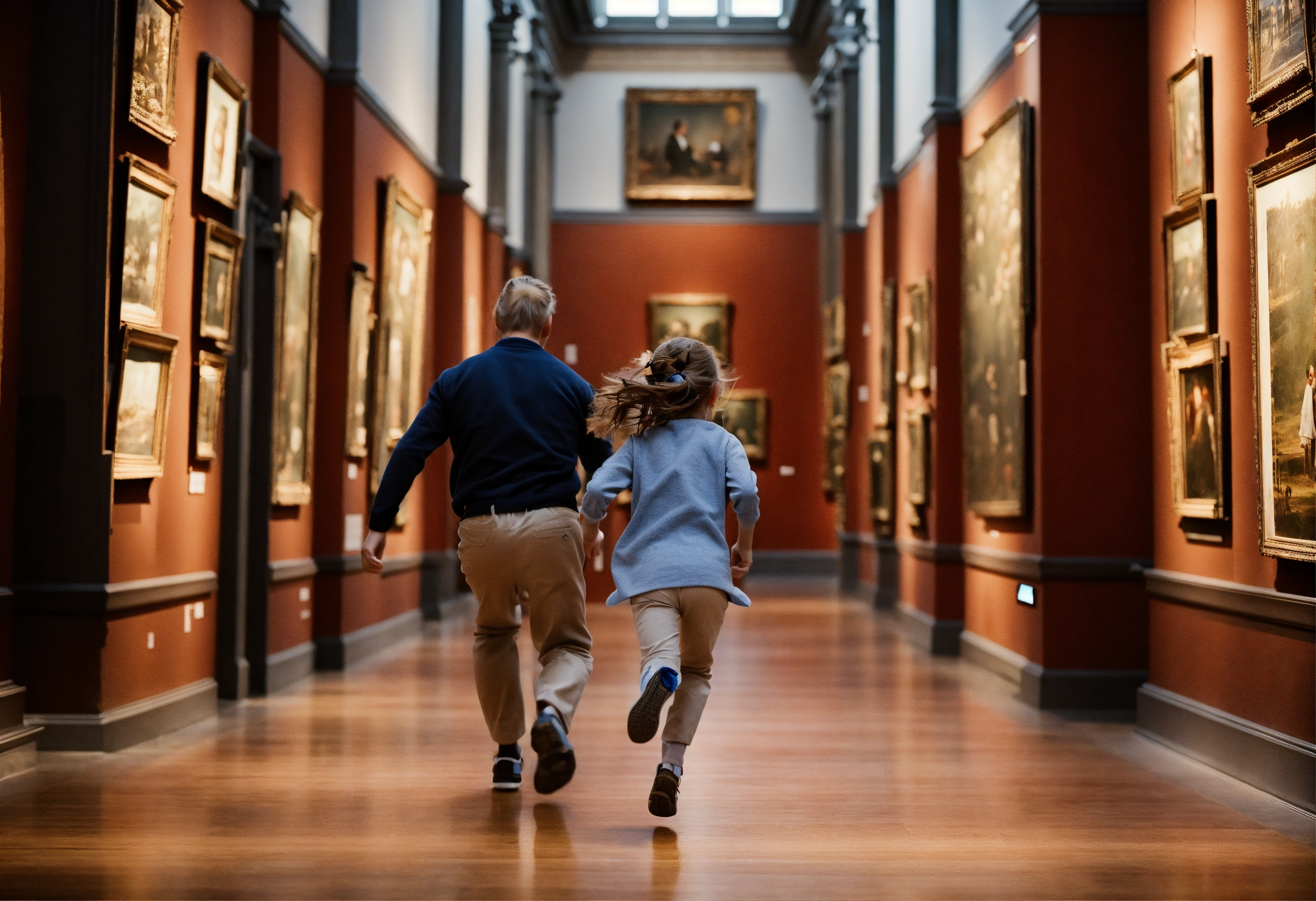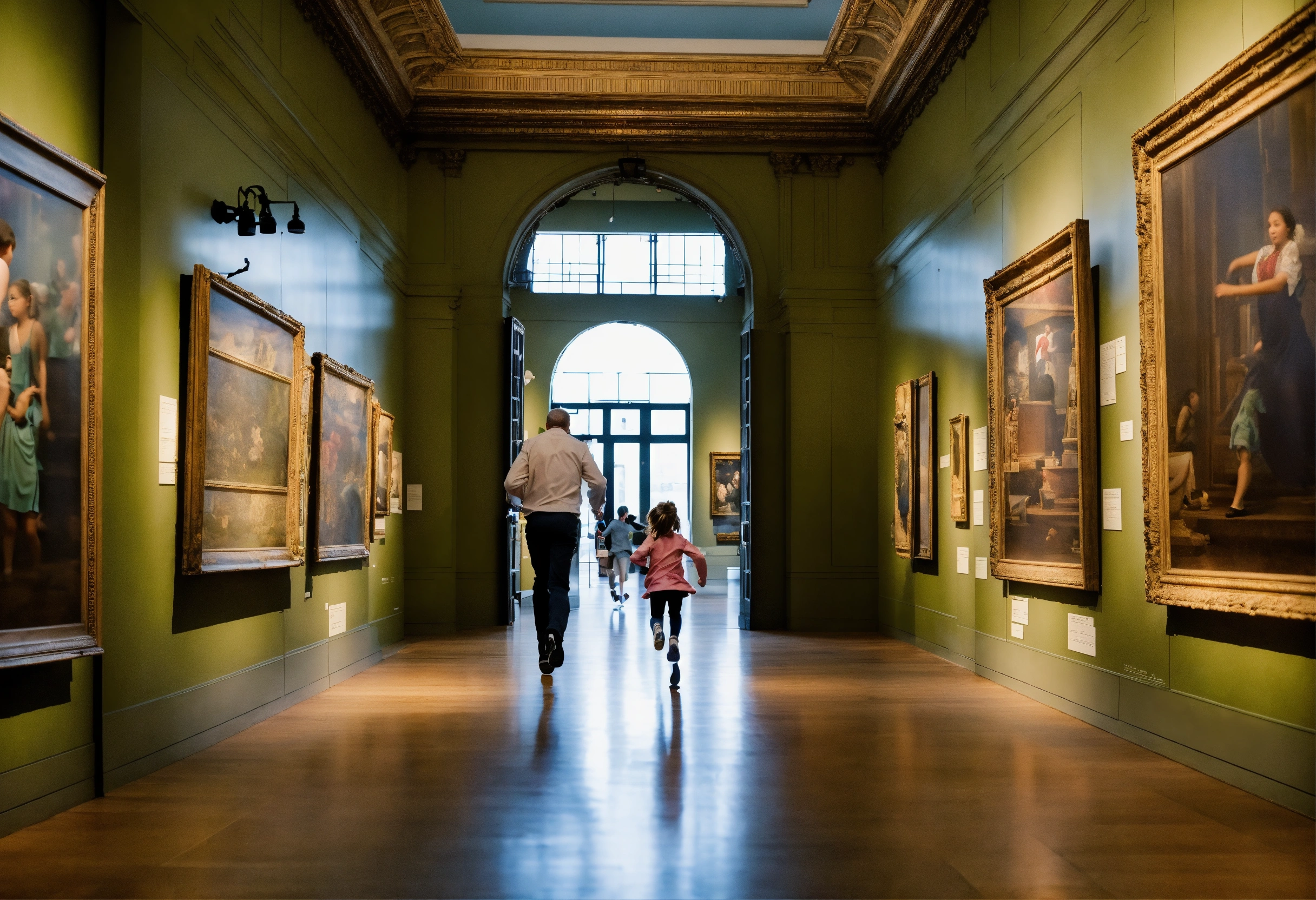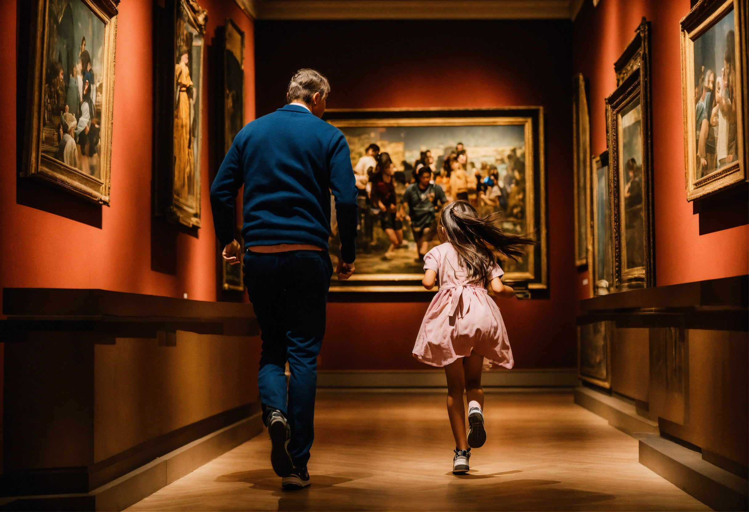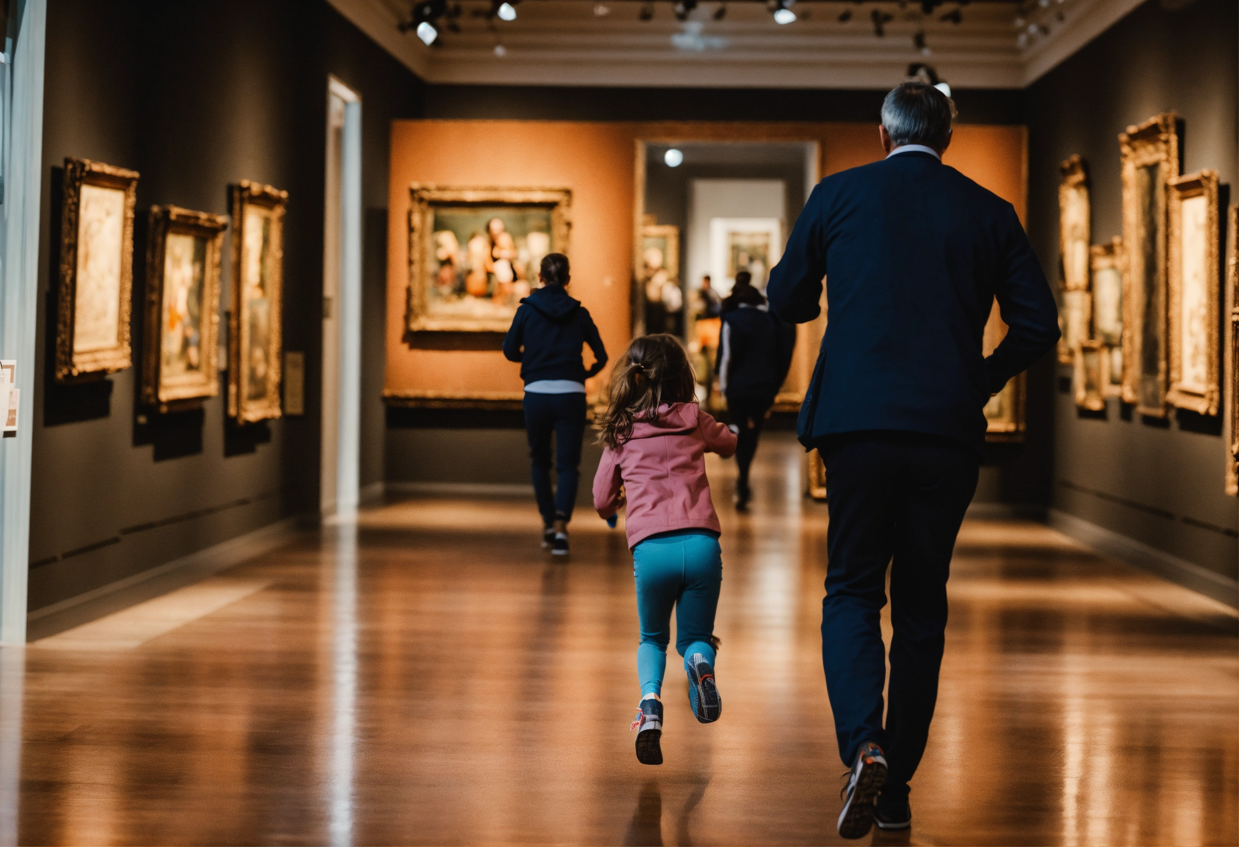 Young girl running to dad in museum
