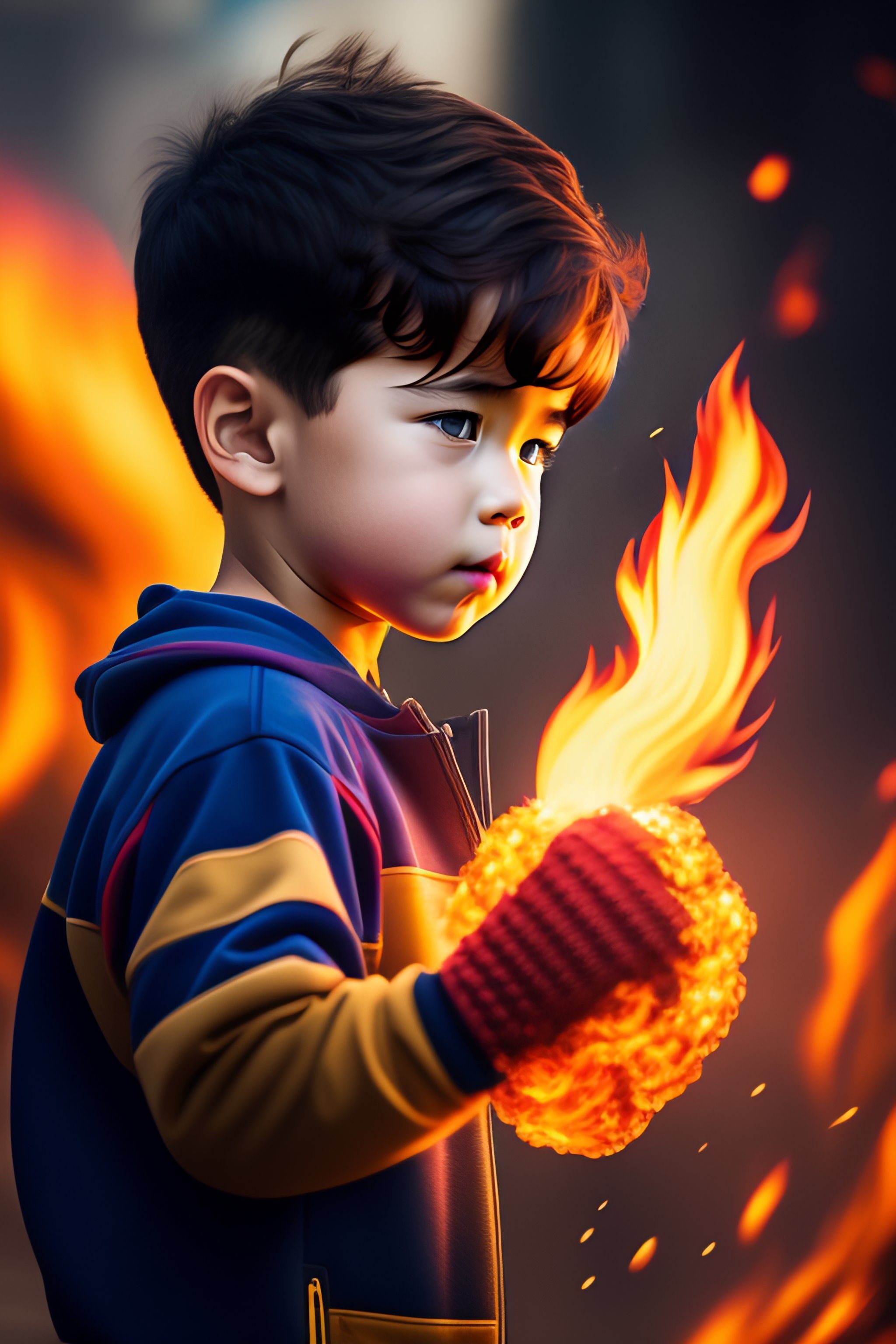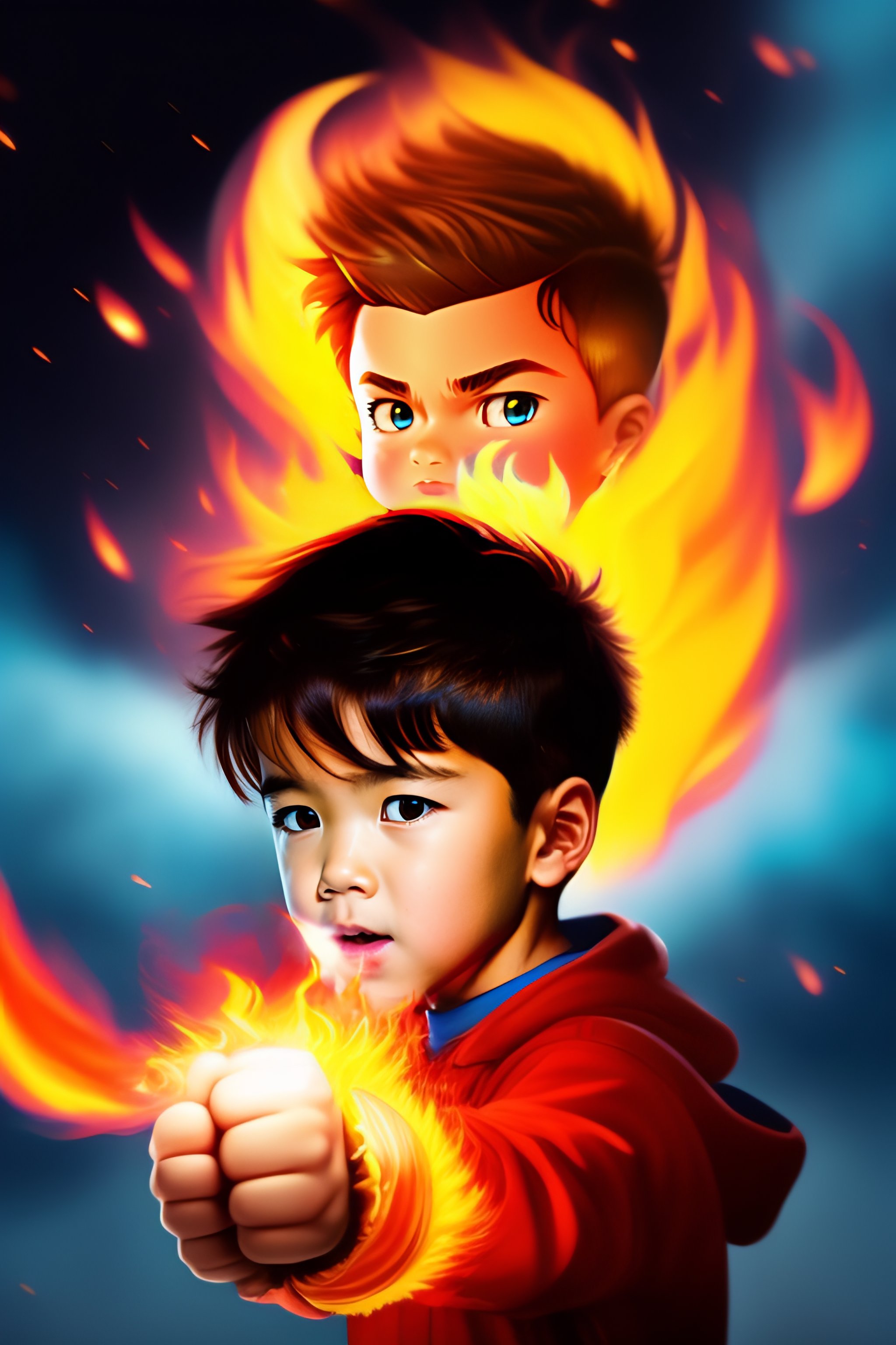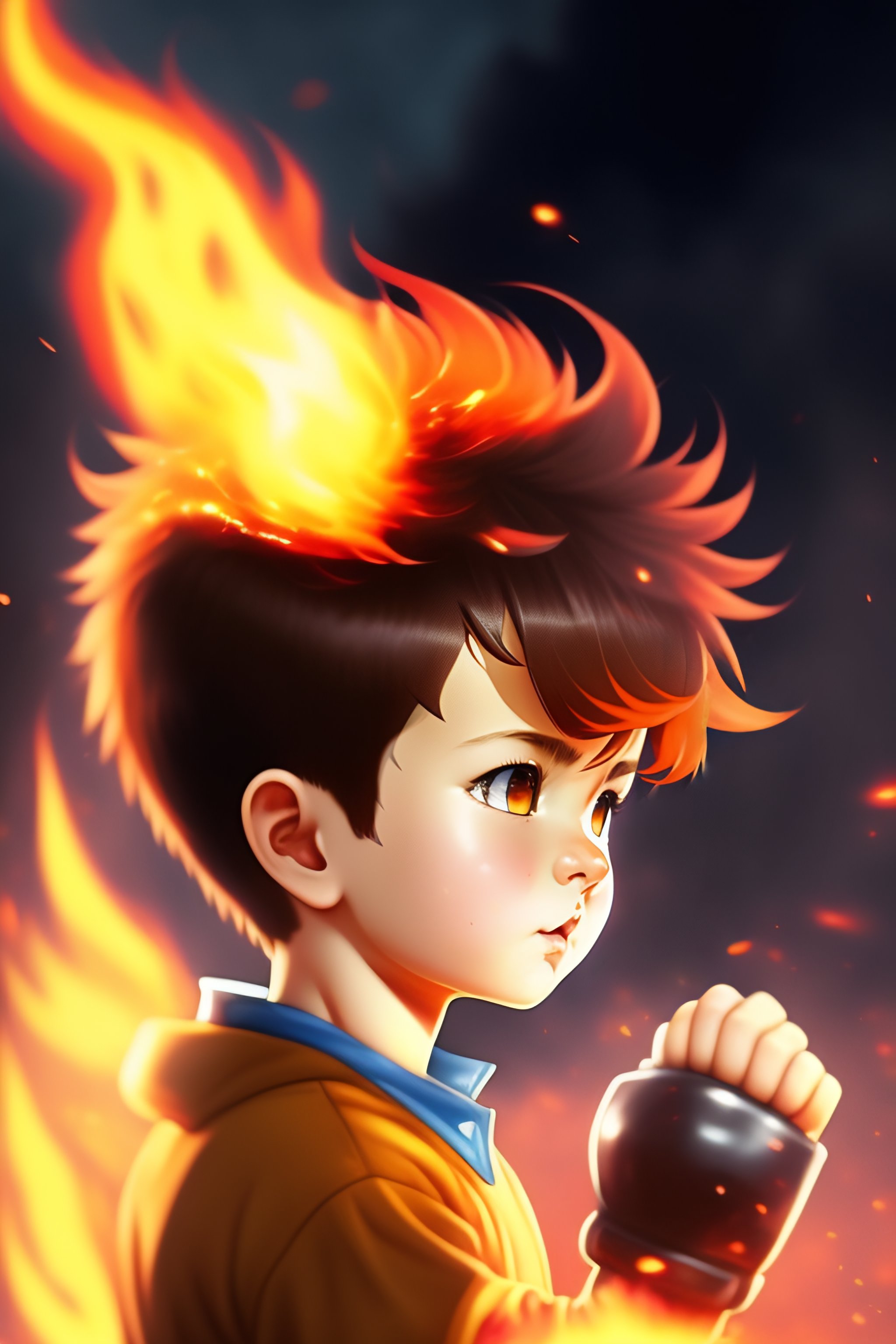 Young boy with short brown hair destroying a monster made out of fire with a single punch, one punch anime style, clear lines